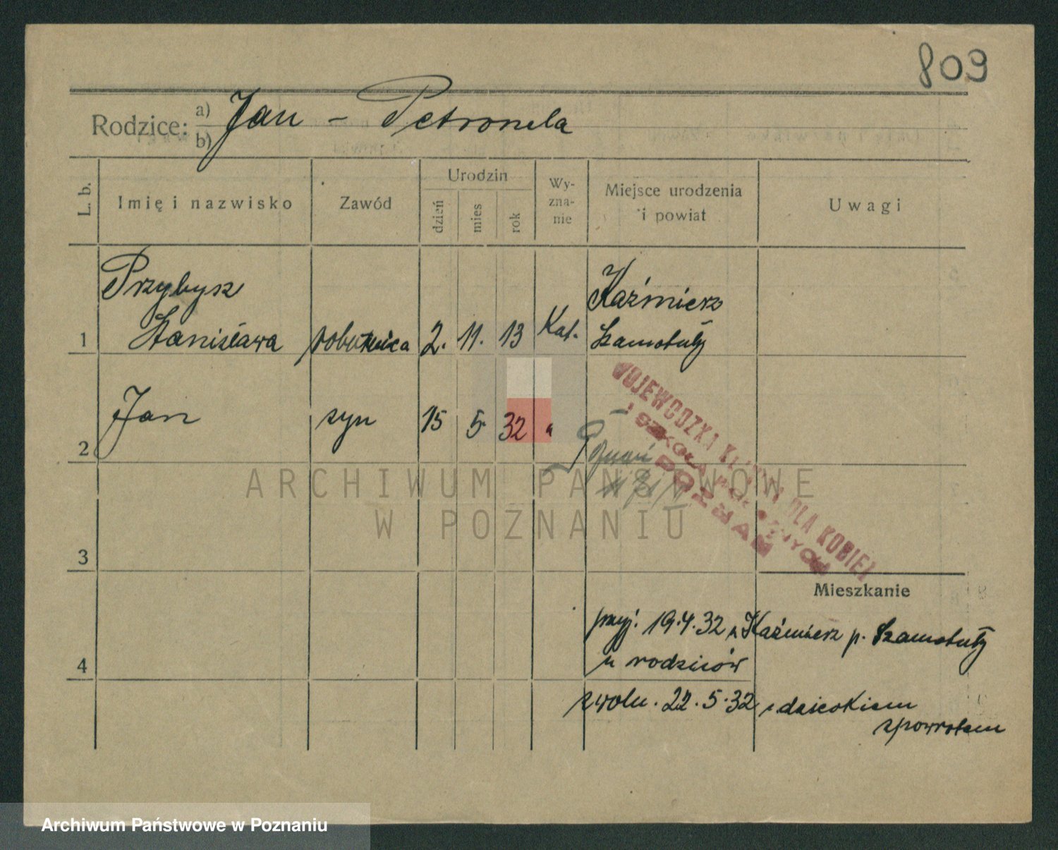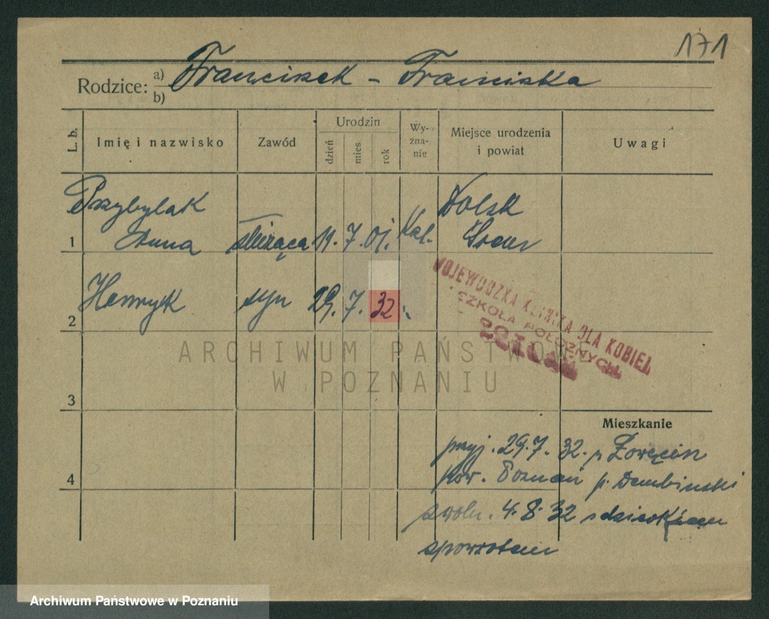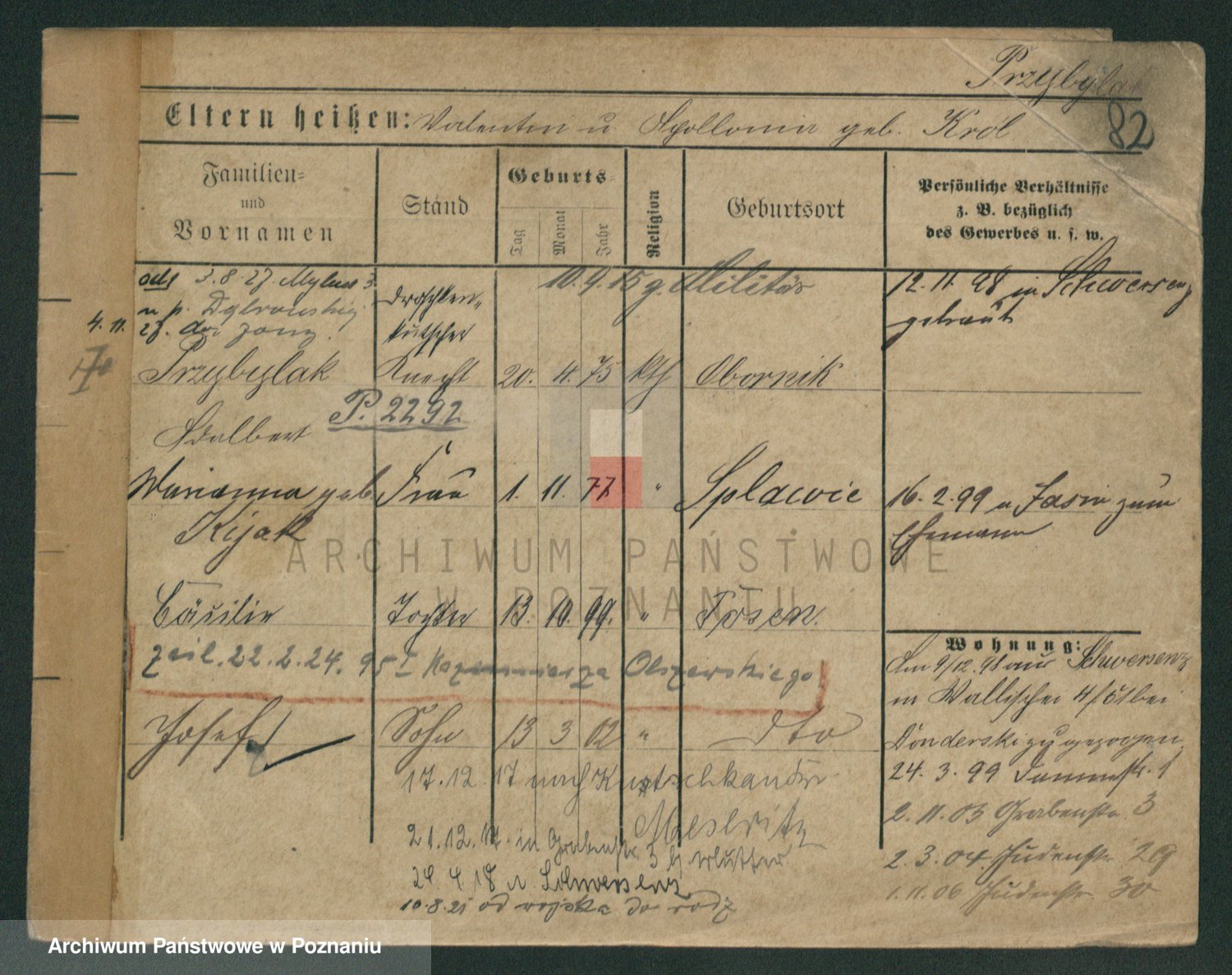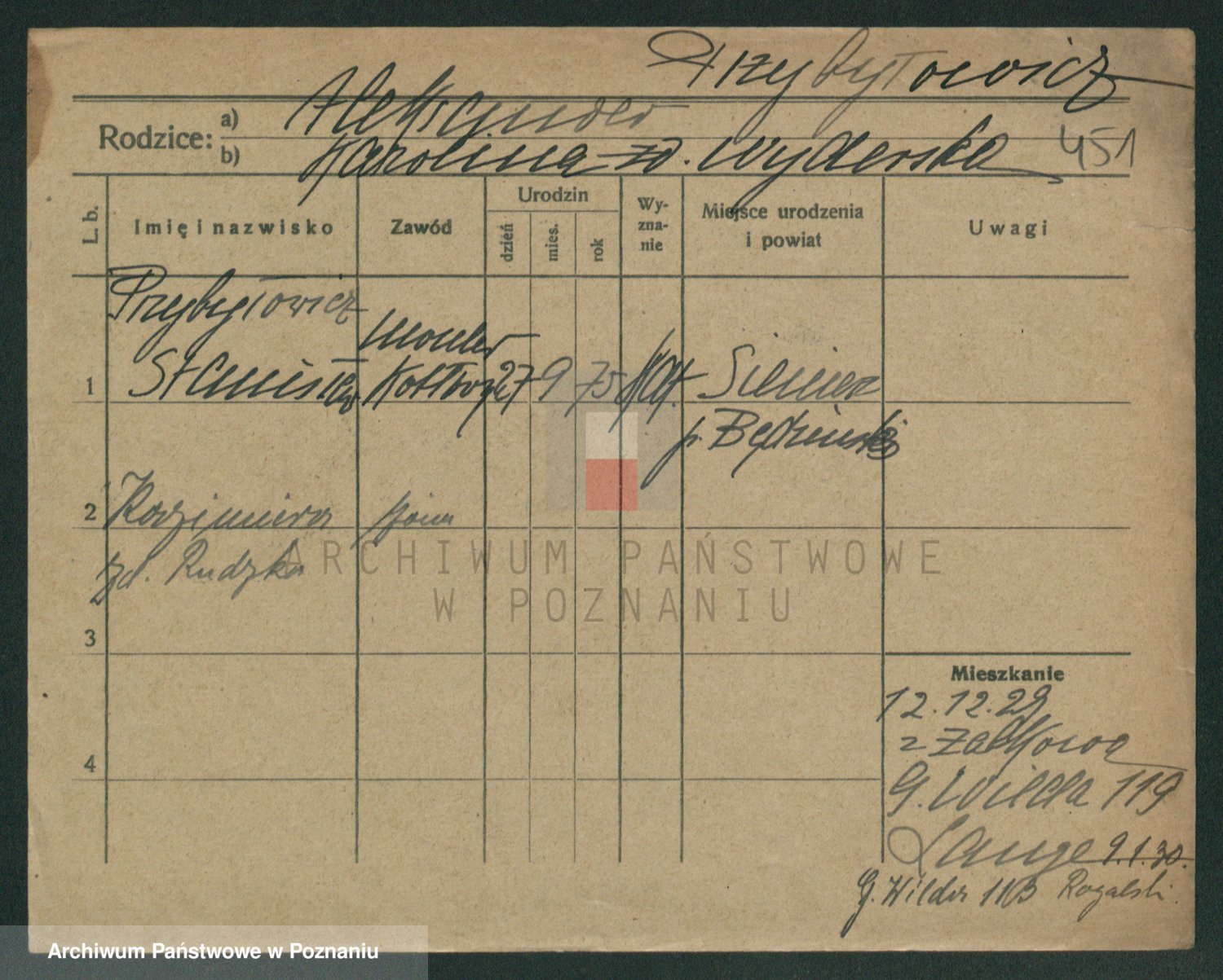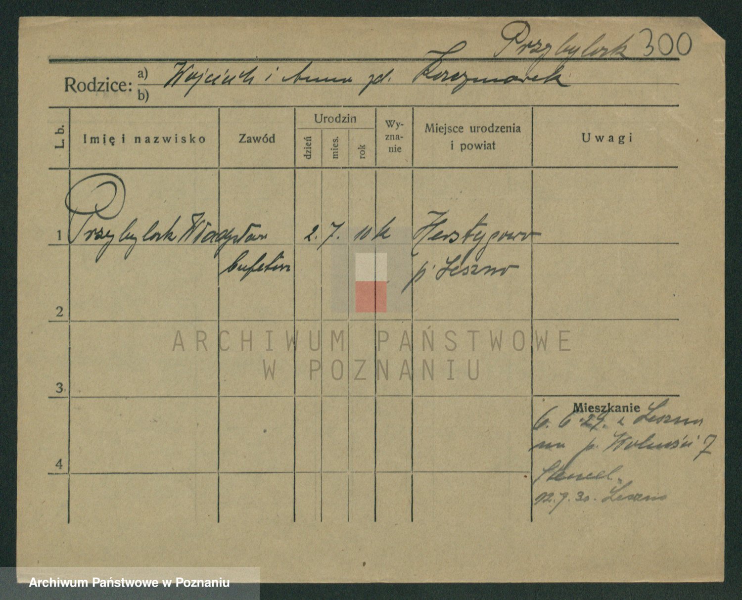 Podgląd karty osobowej dostępny jest po kliknięciu na nazwisko lub ikonkę karty. Można dokonywać powiększenia (ikony na górze) lub przechodzić między kolejnymi skanami (strzałki po bokach).