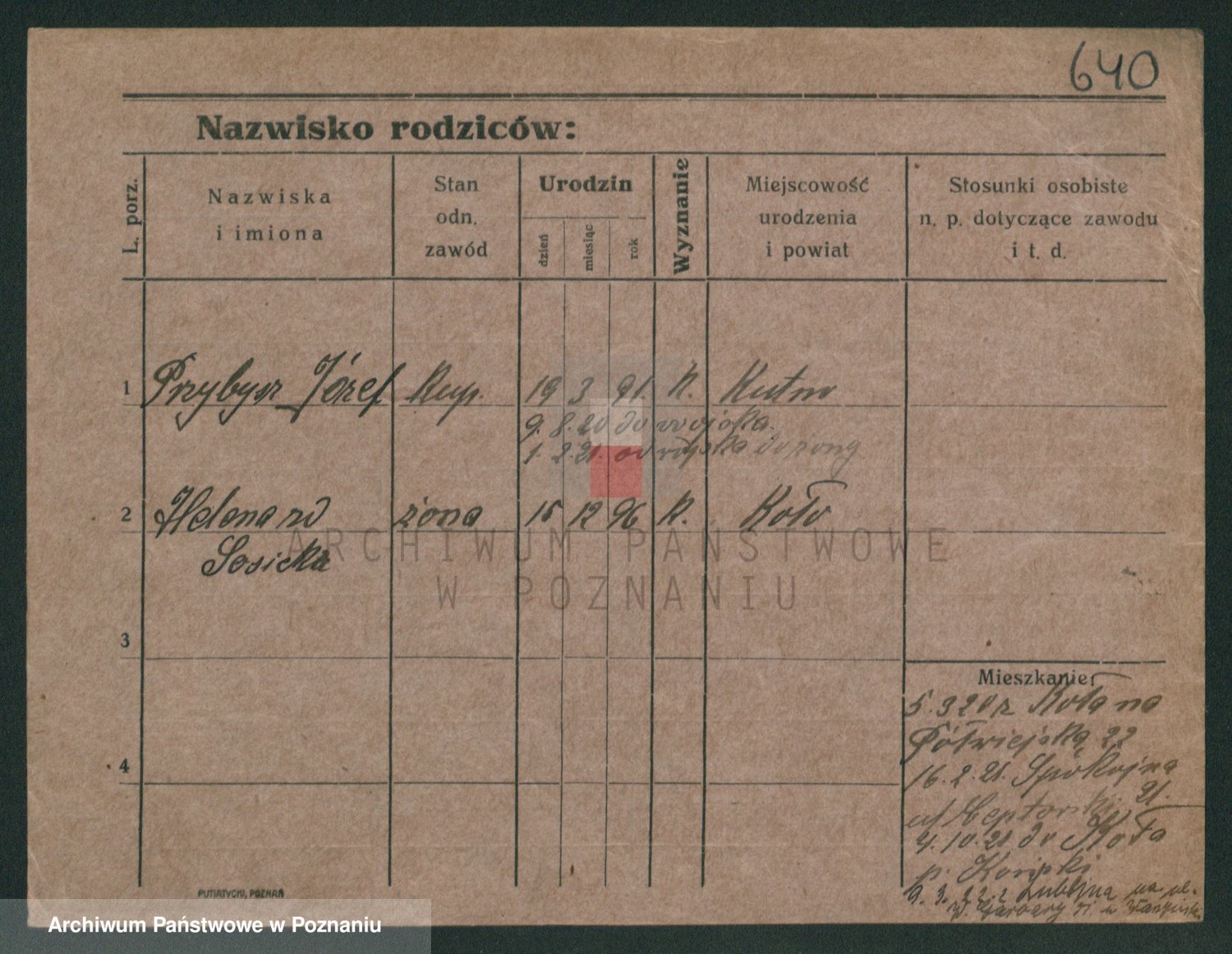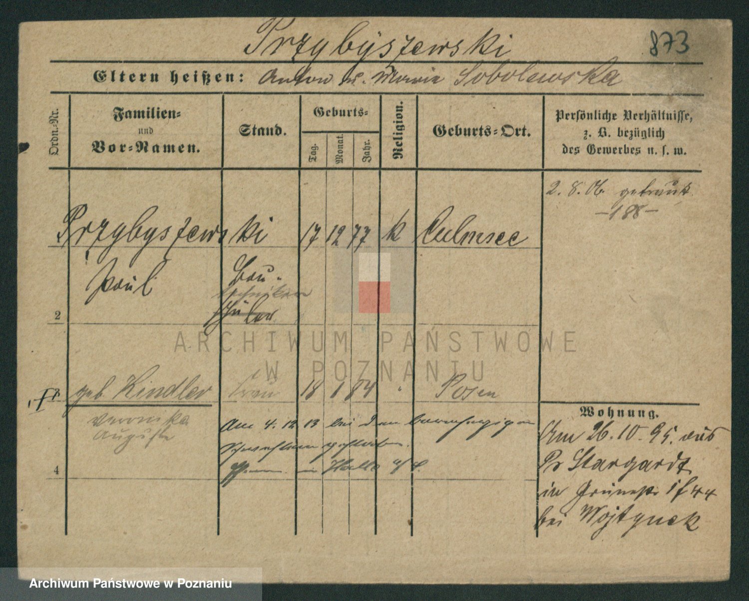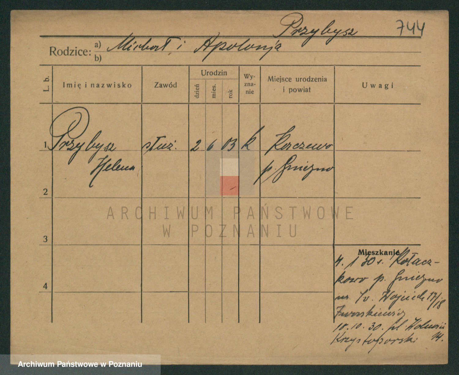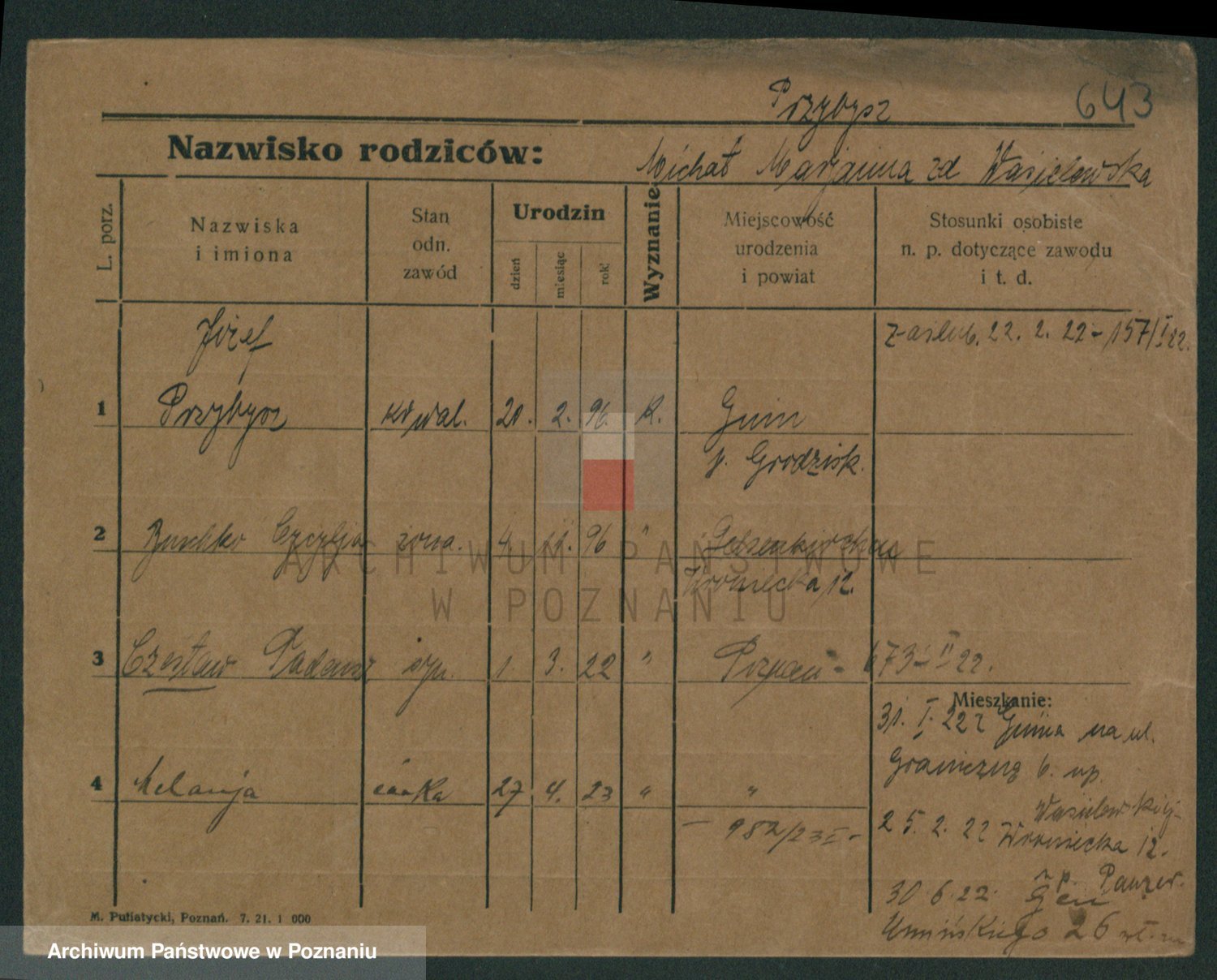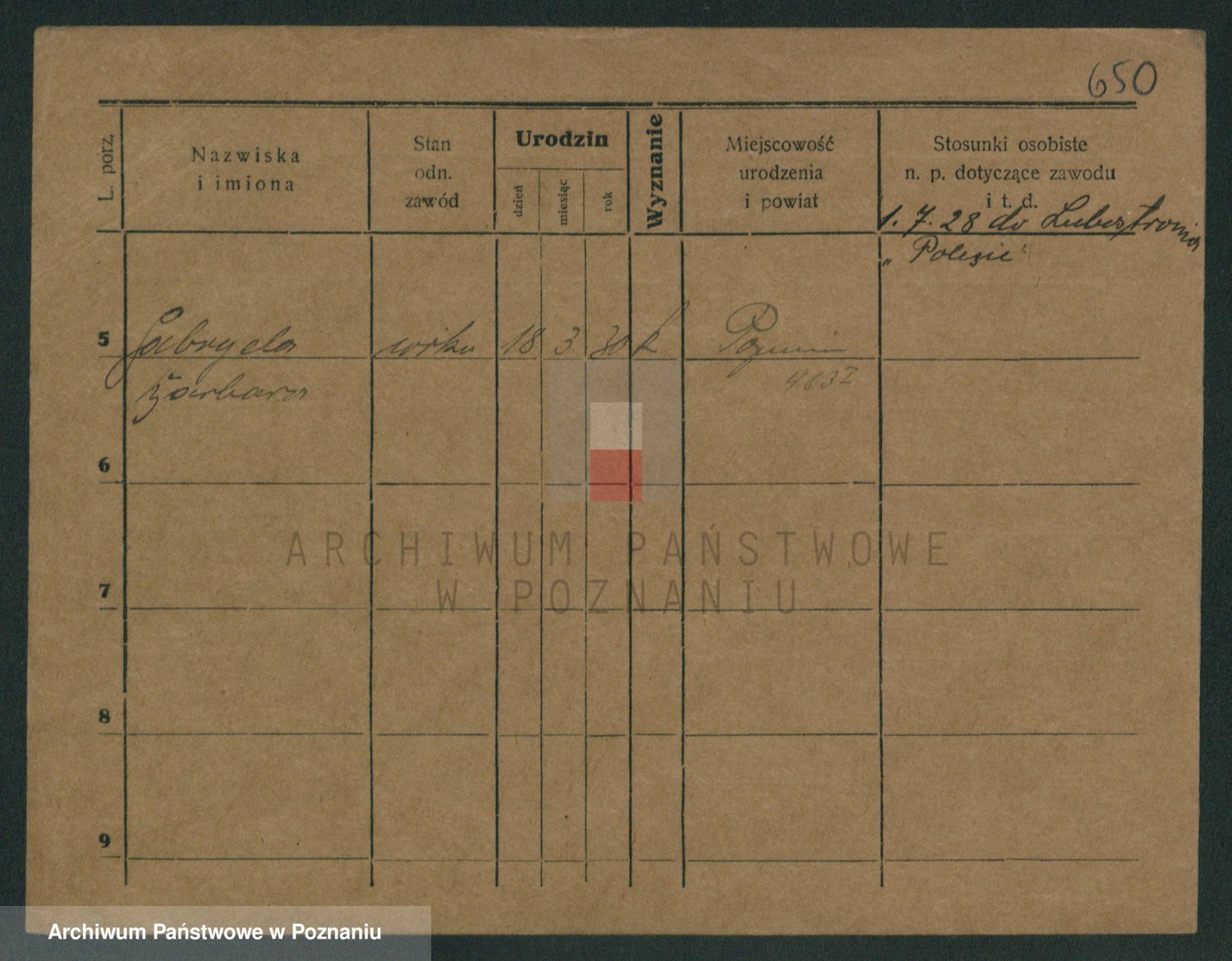 Podgląd karty osobowej dostępny jest po kliknięciu na nazwisko lub ikonkę karty. Można dokonywać powiększenia (ikony na górze) lub przechodzić między kolejnymi skanami (strzałki po bokach).