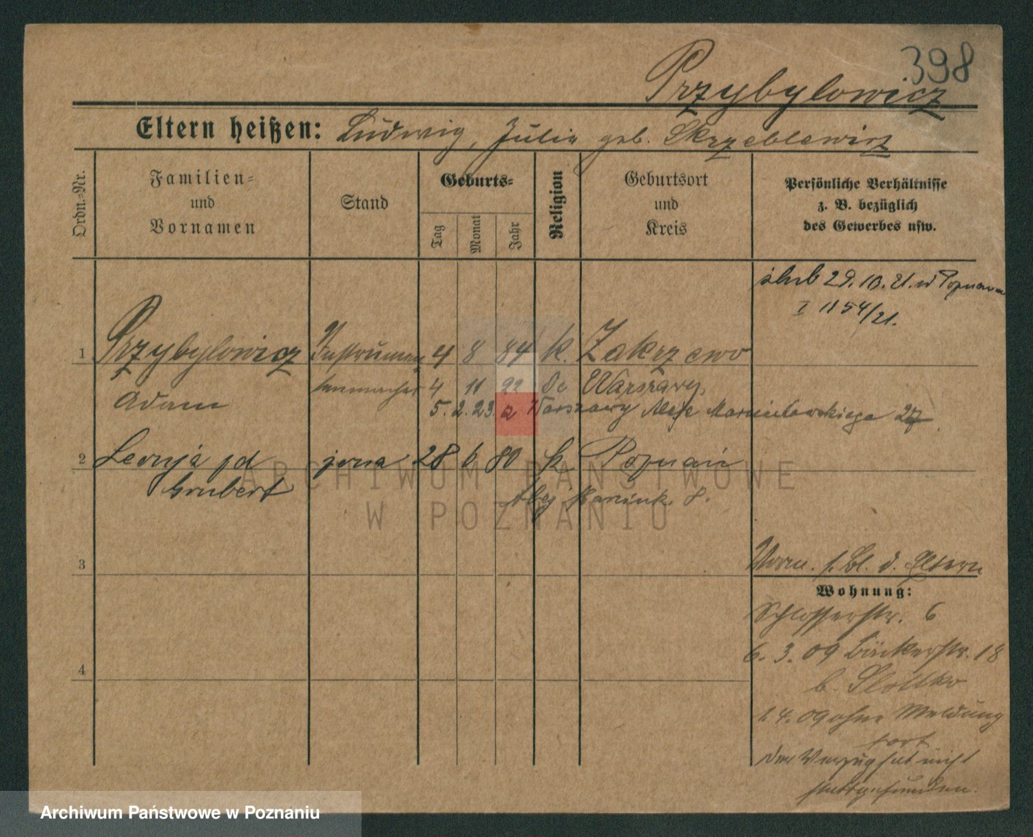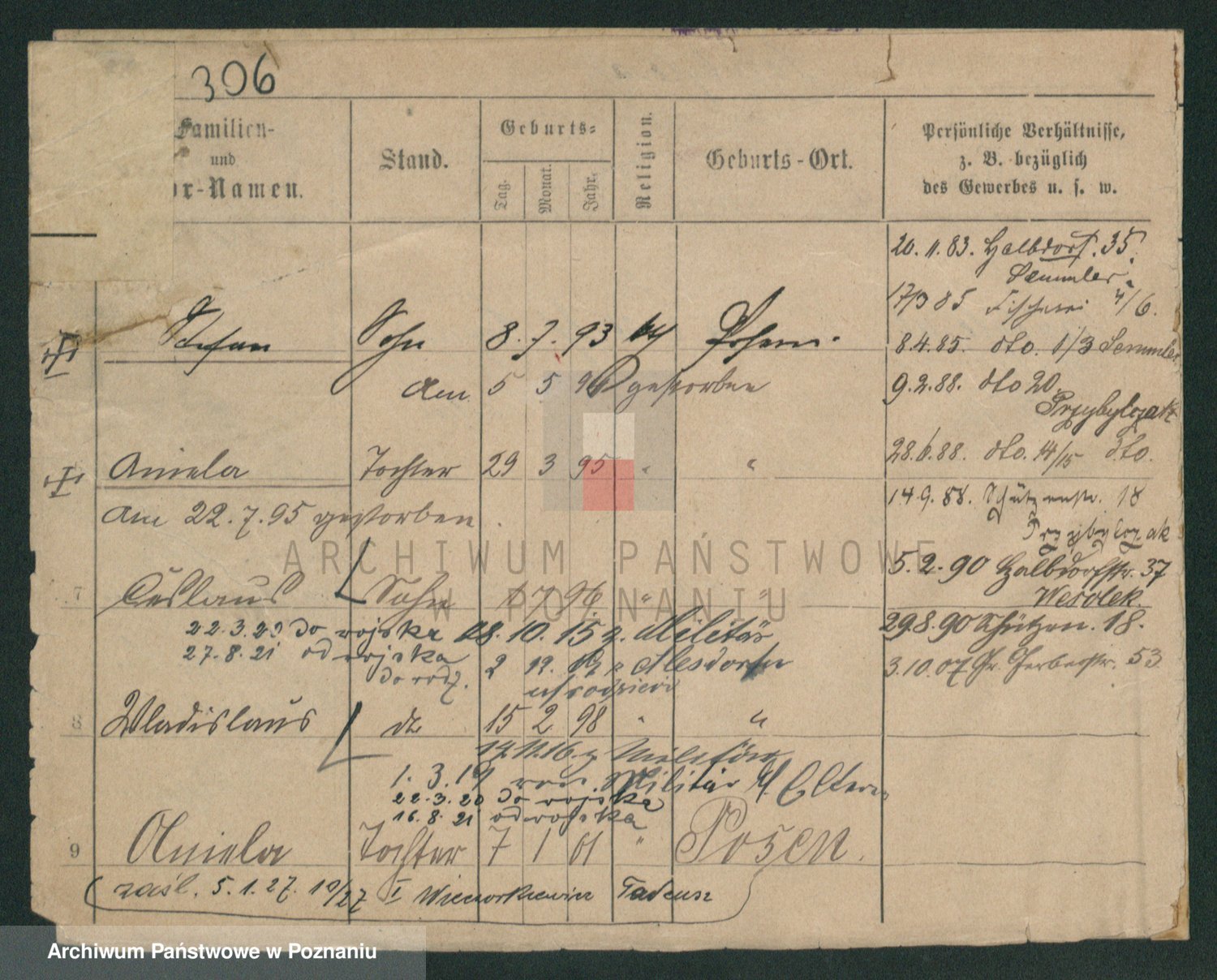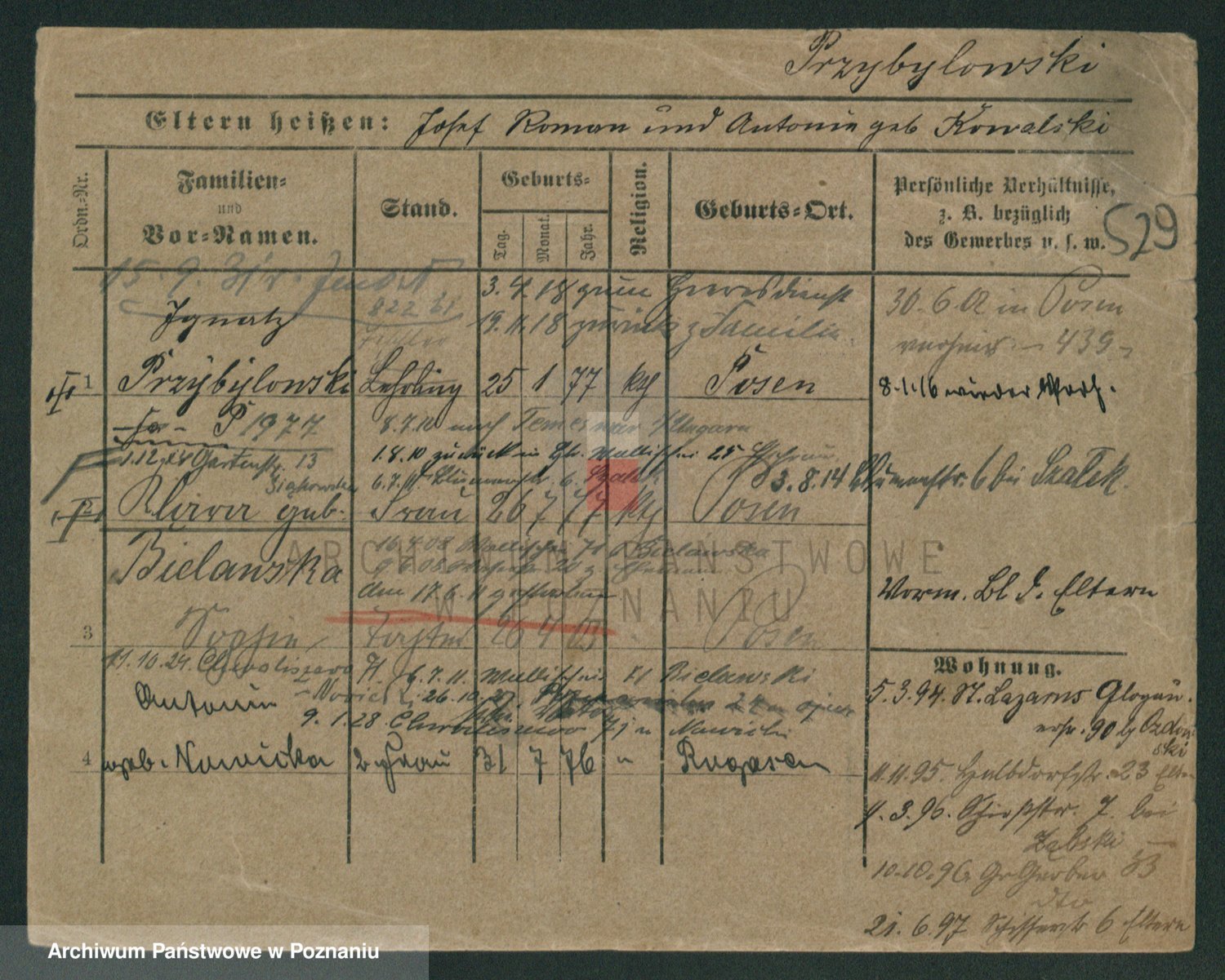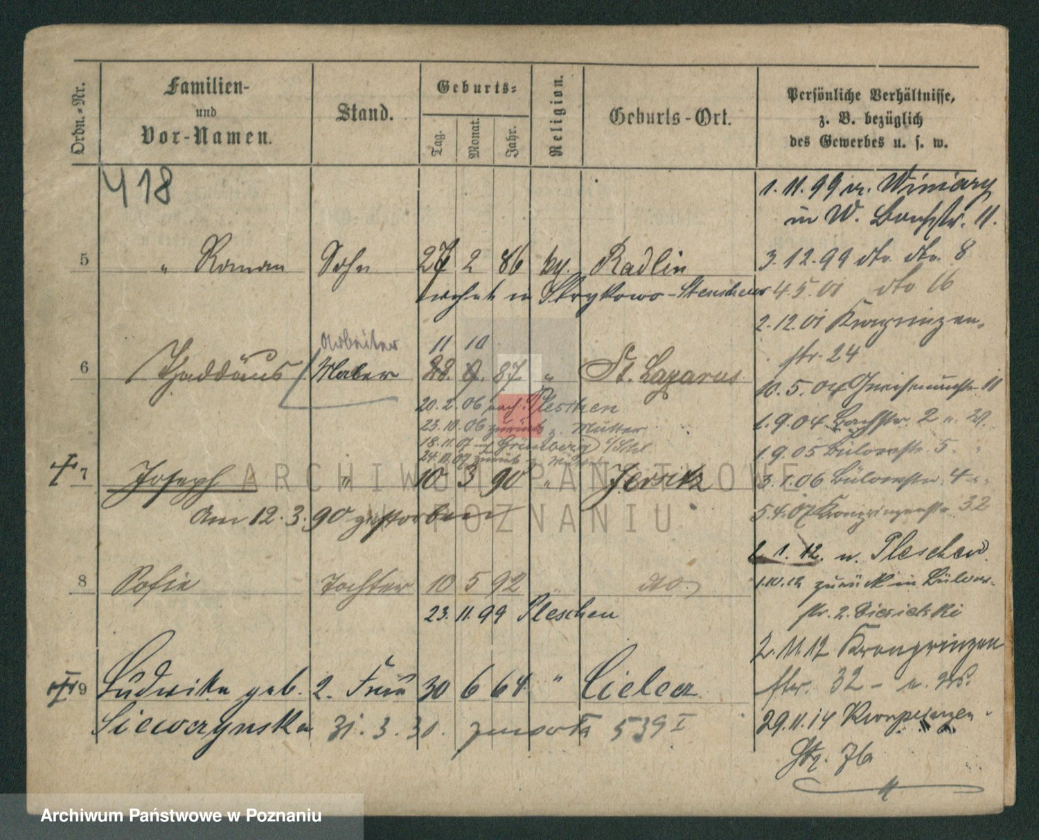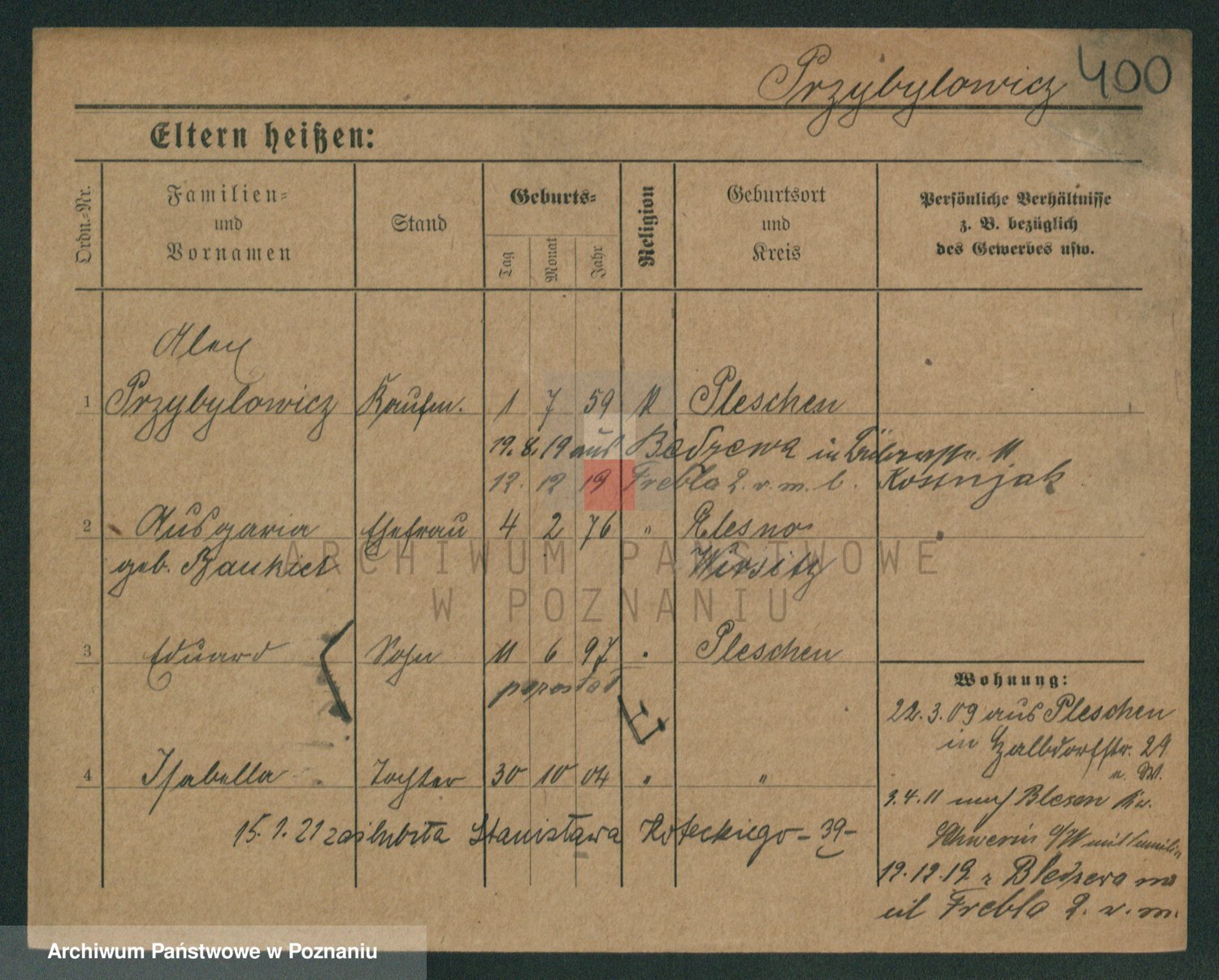 Podgląd karty osobowej dostępny jest po kliknięciu na nazwisko lub ikonkę karty. Można dokonywać powiększenia (ikony na górze) lub przechodzić między kolejnymi skanami (strzałki po bokach).