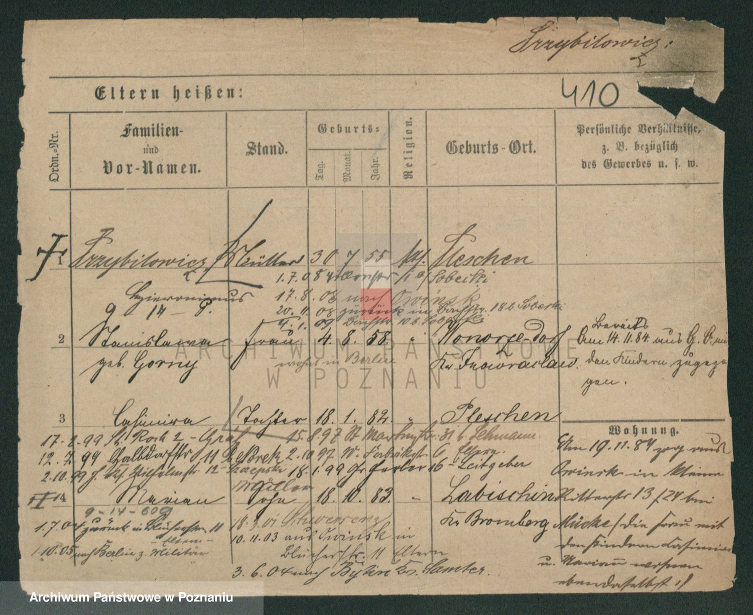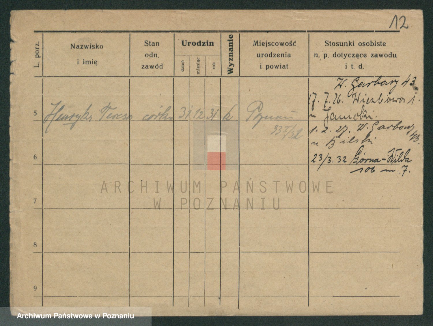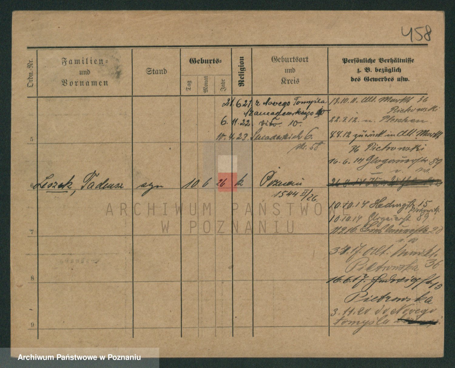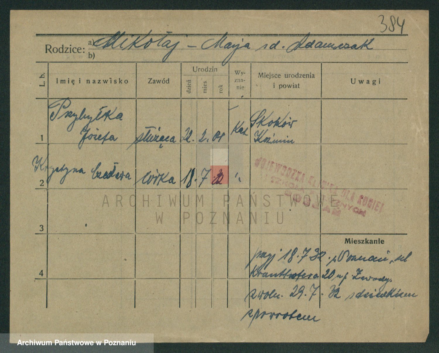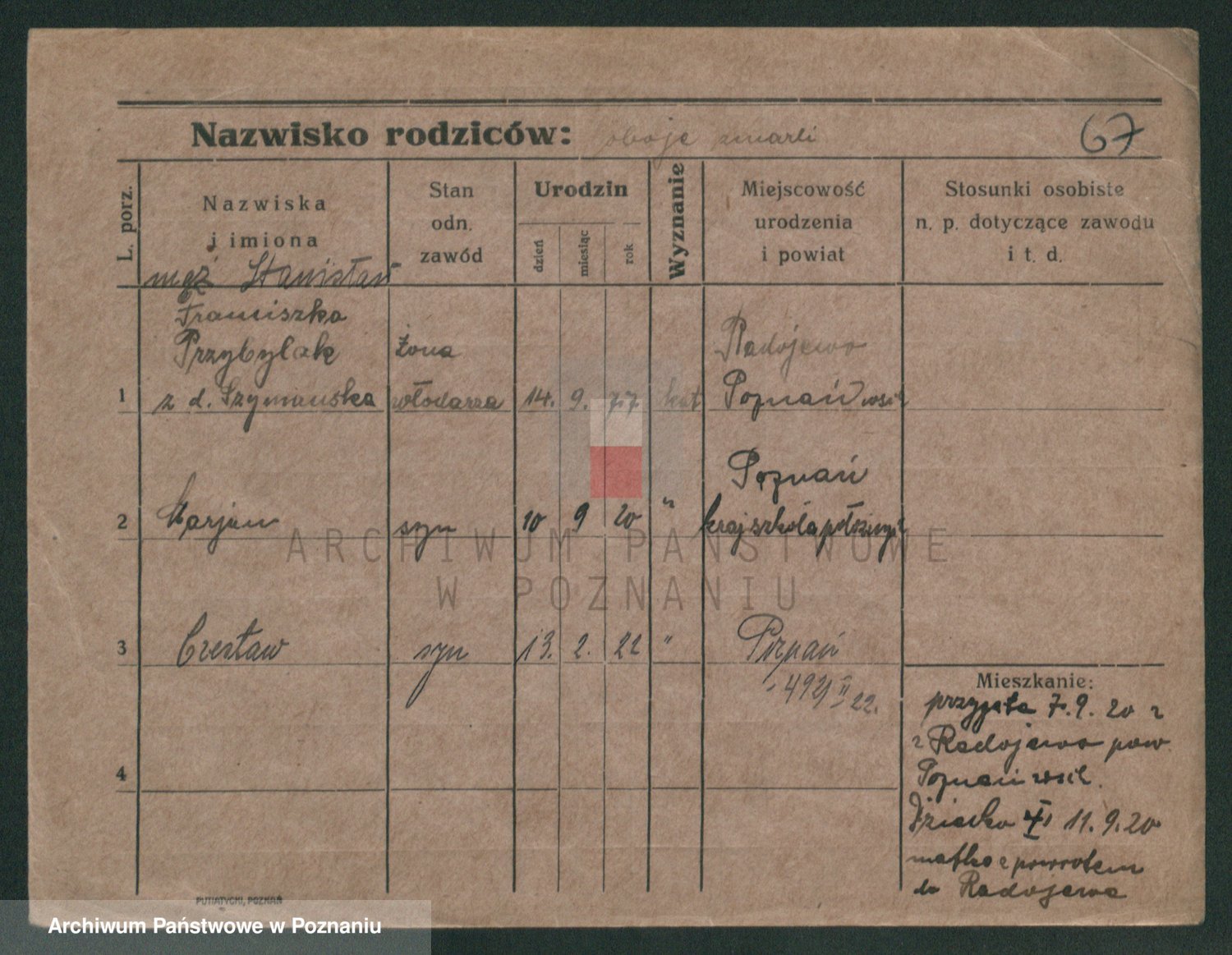 Podgląd karty osobowej dostępny jest po kliknięciu na nazwisko lub ikonkę karty. Można dokonywać powiększenia (ikony na górze) lub przechodzić między kolejnymi skanami (strzałki po bokach).