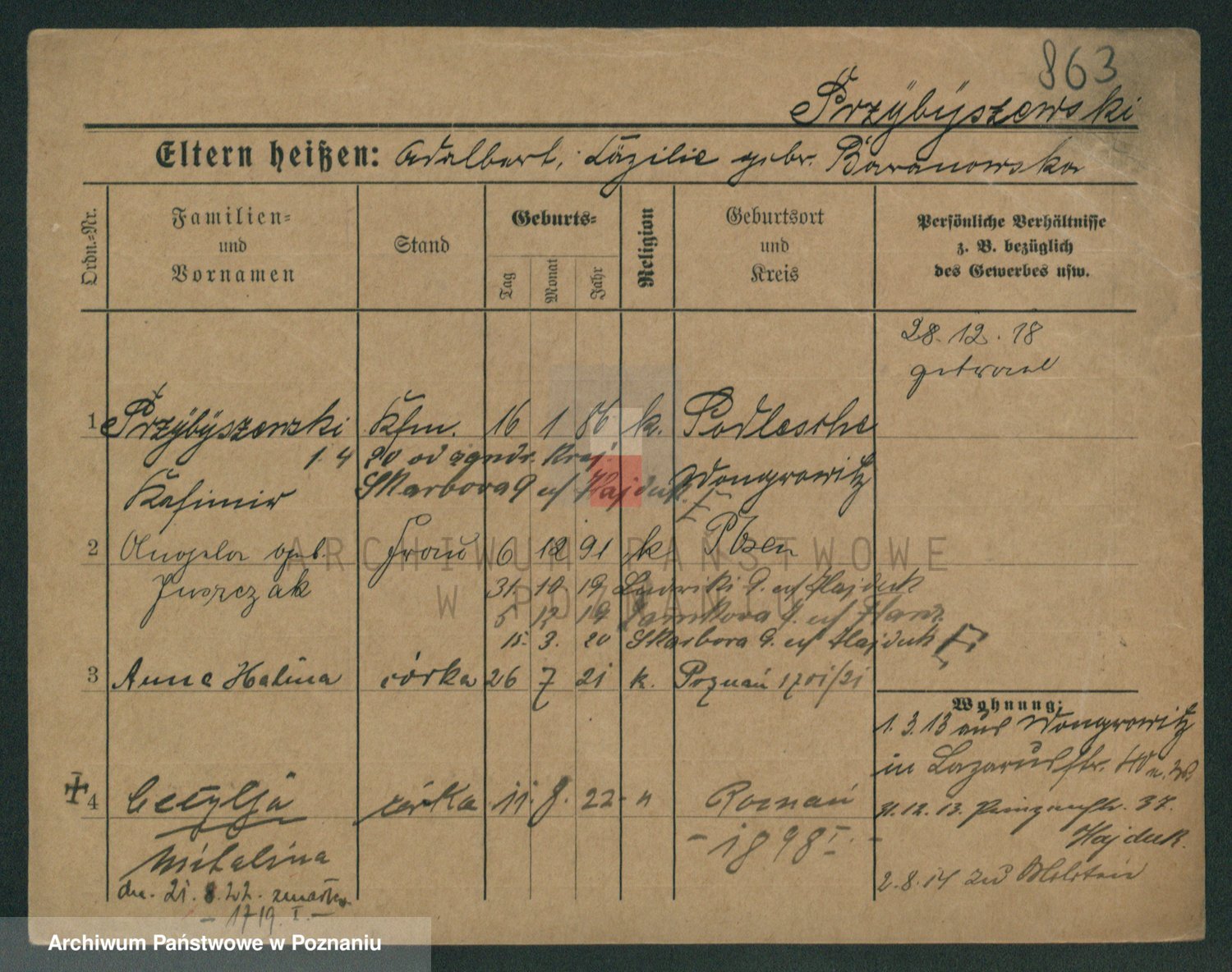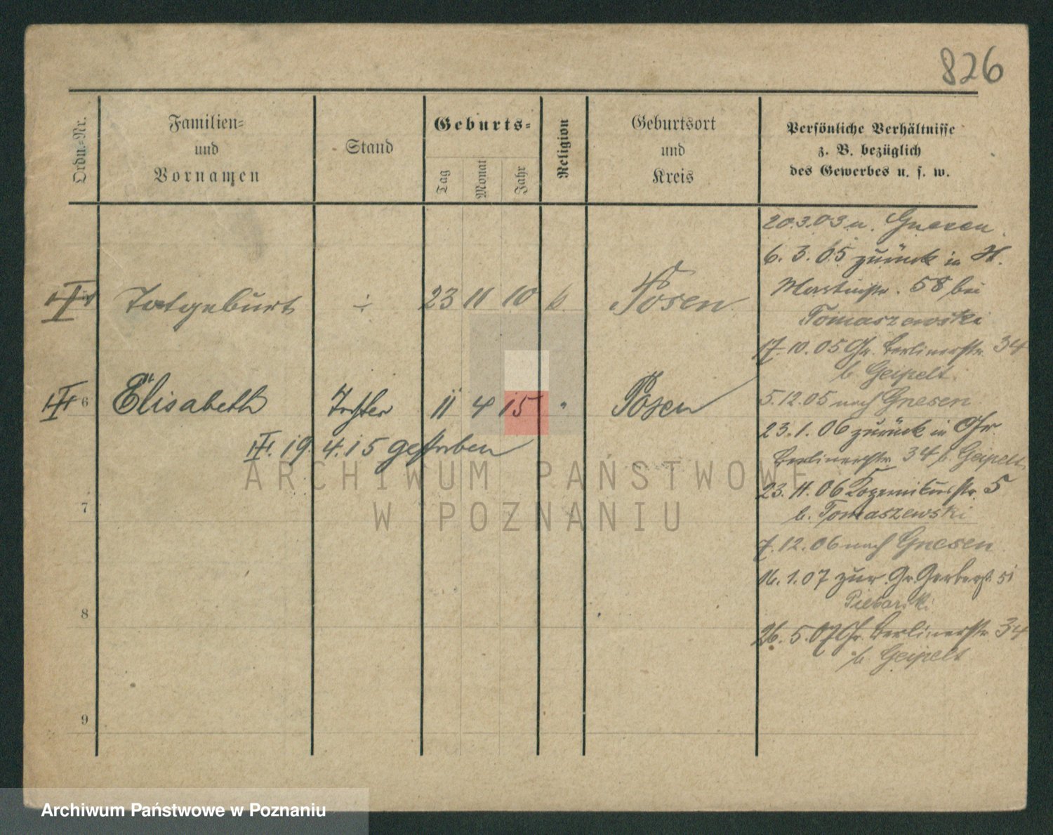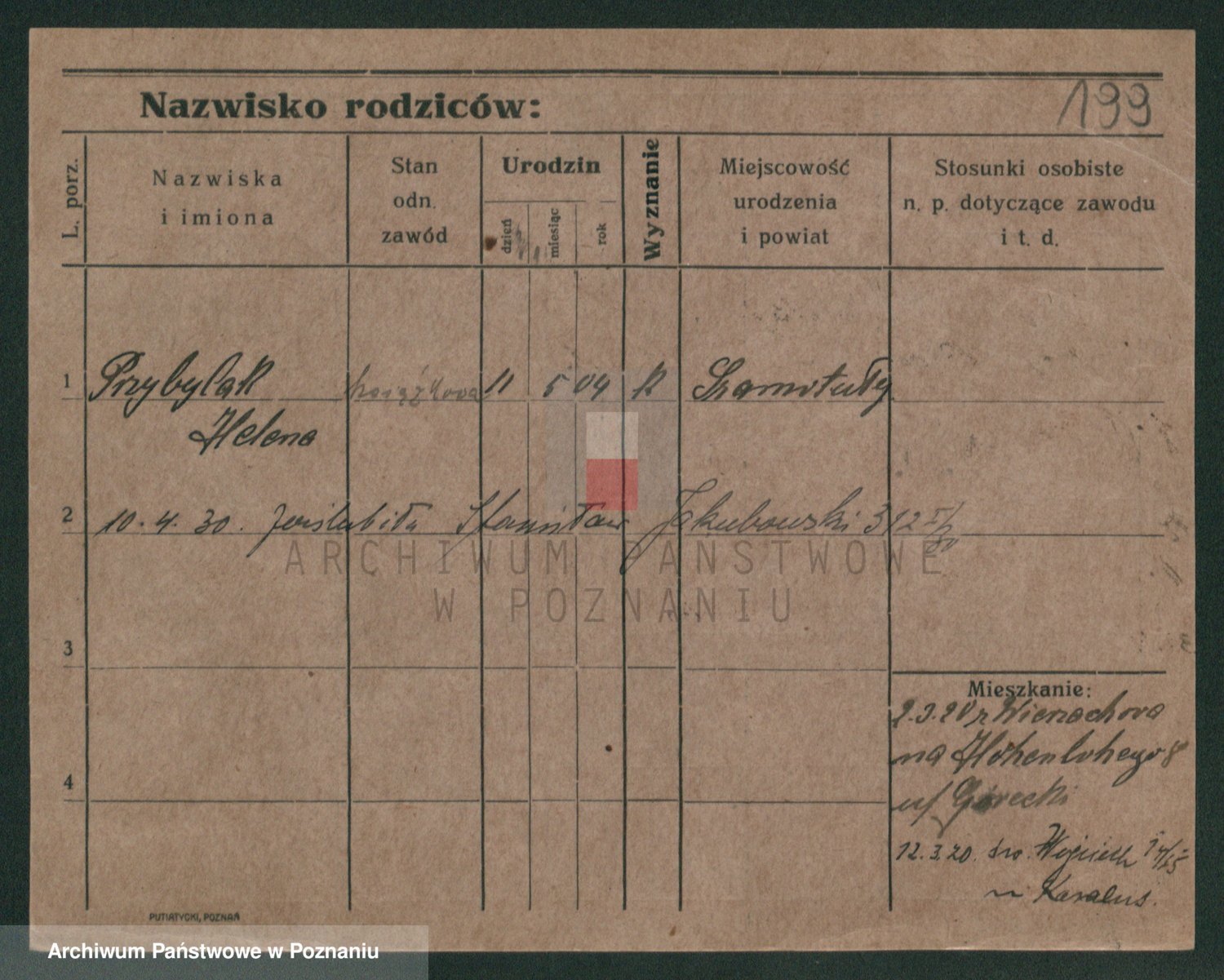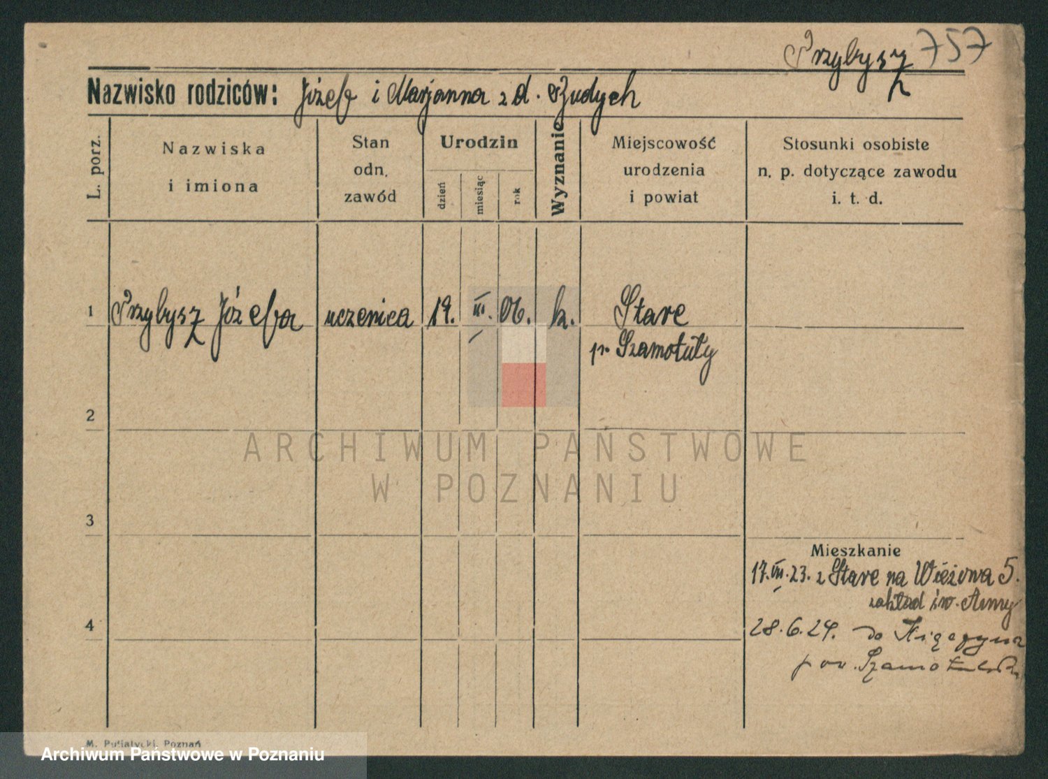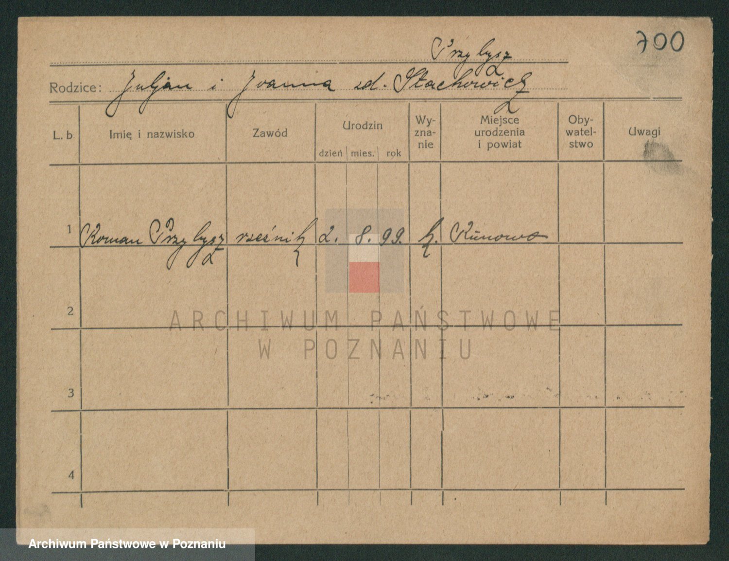 Podgląd karty osobowej dostępny jest po kliknięciu na nazwisko lub ikonkę karty. Można dokonywać powiększenia (ikony na górze) lub przechodzić między kolejnymi skanami (strzałki po bokach).