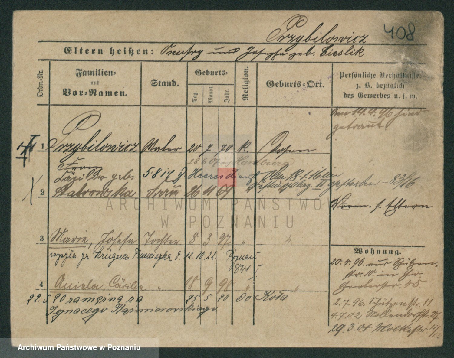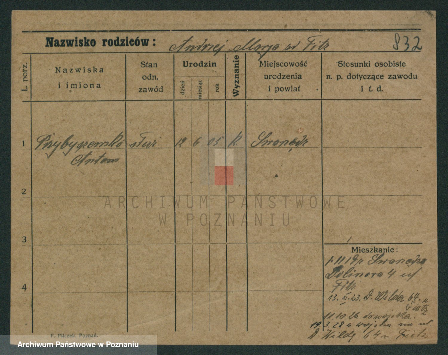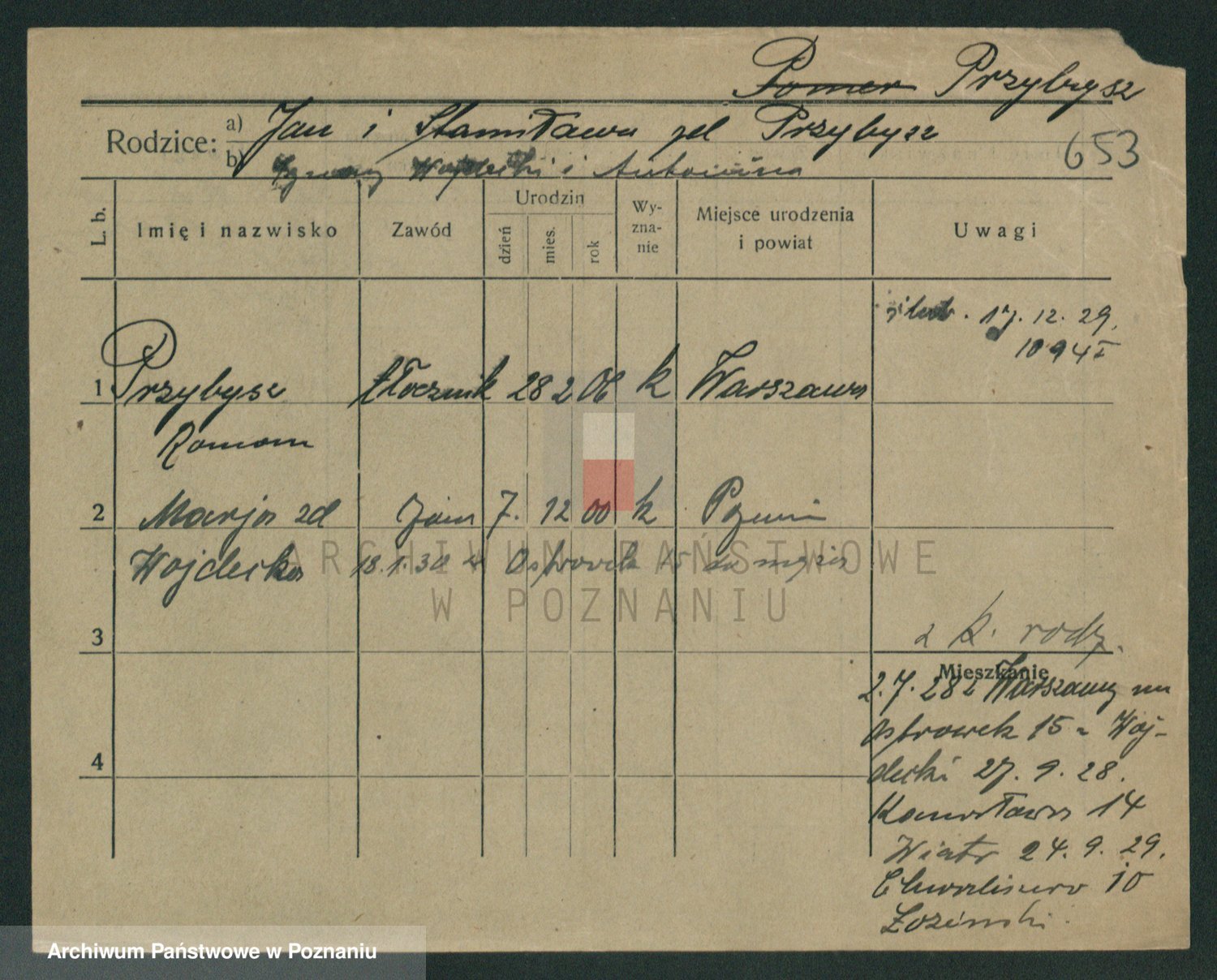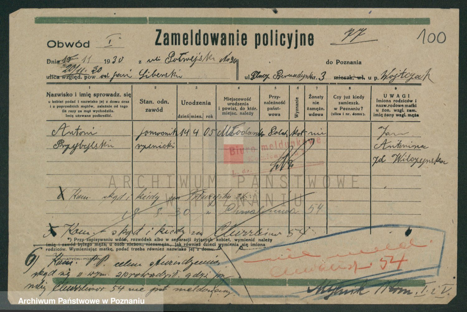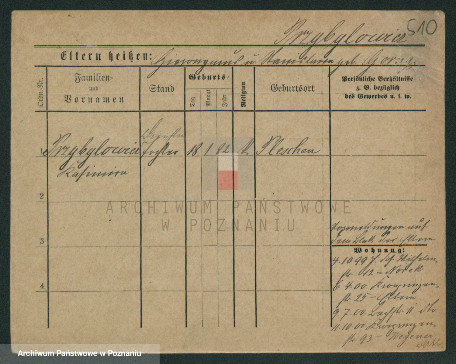Podgląd karty osobowej dostępny jest po kliknięciu na nazwisko lub ikonkę karty. Można dokonywać powiększenia (ikony na górze) lub przechodzić między kolejnymi skanami (strzałki po bokach).