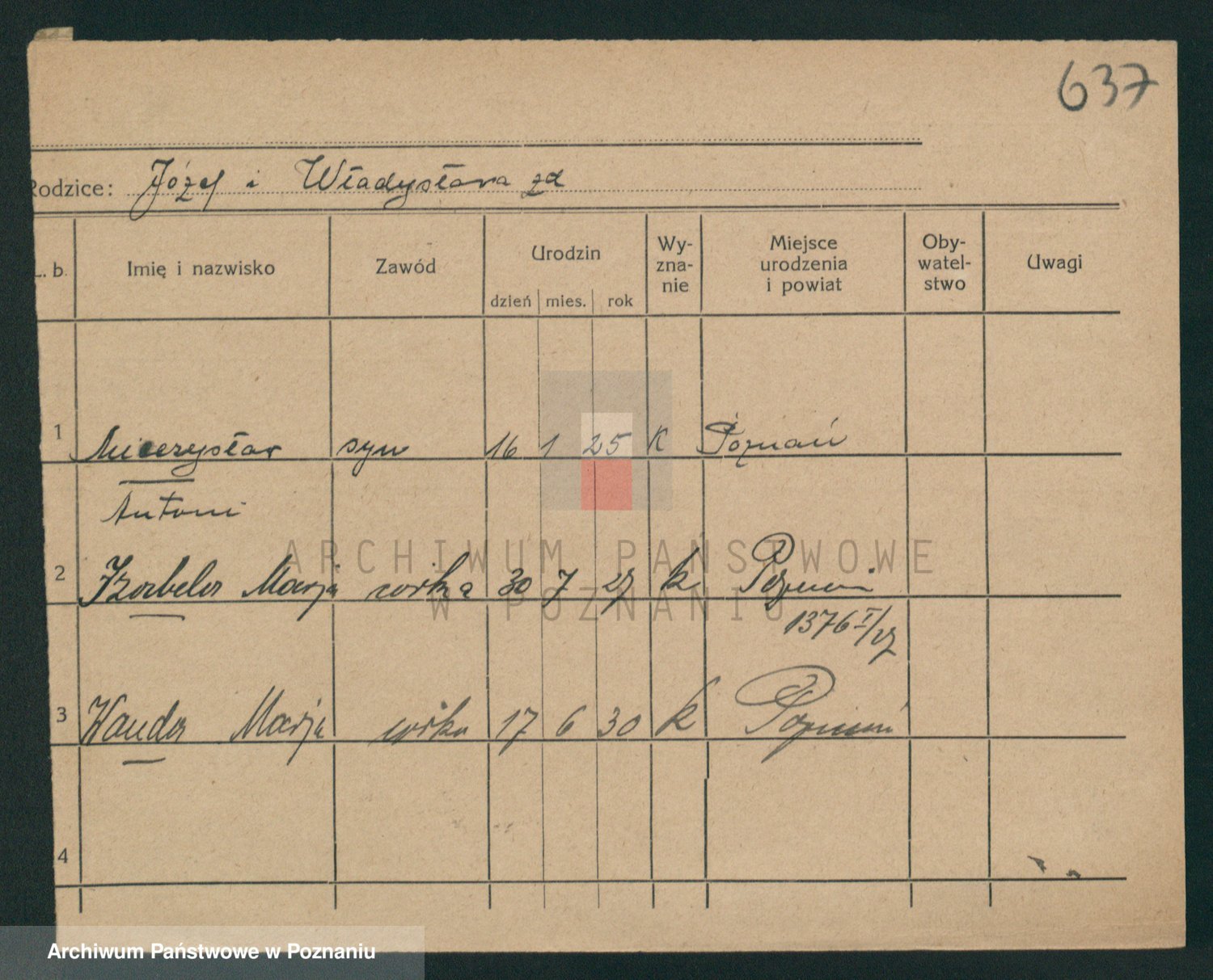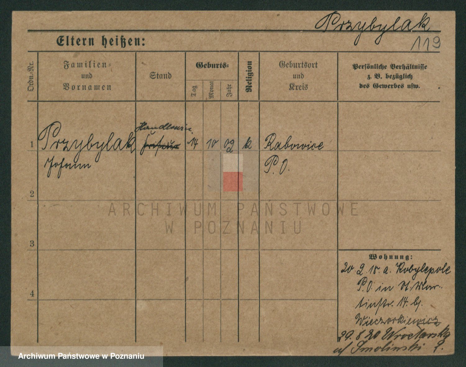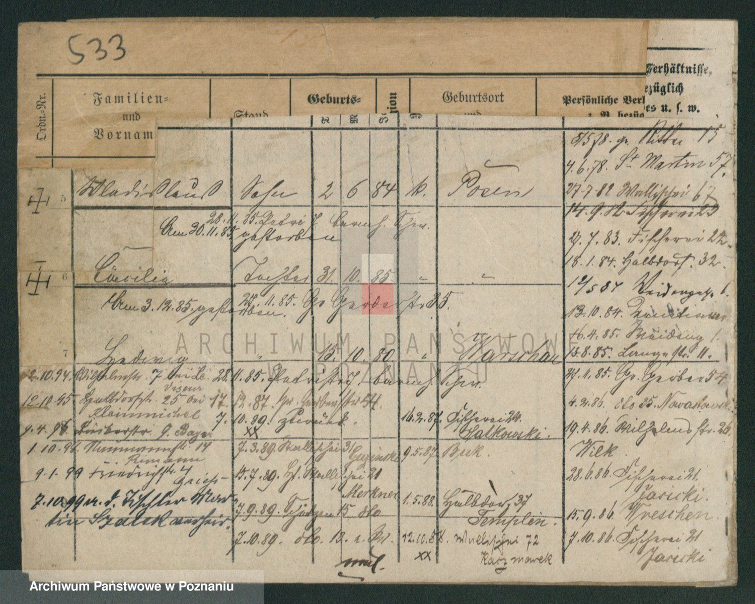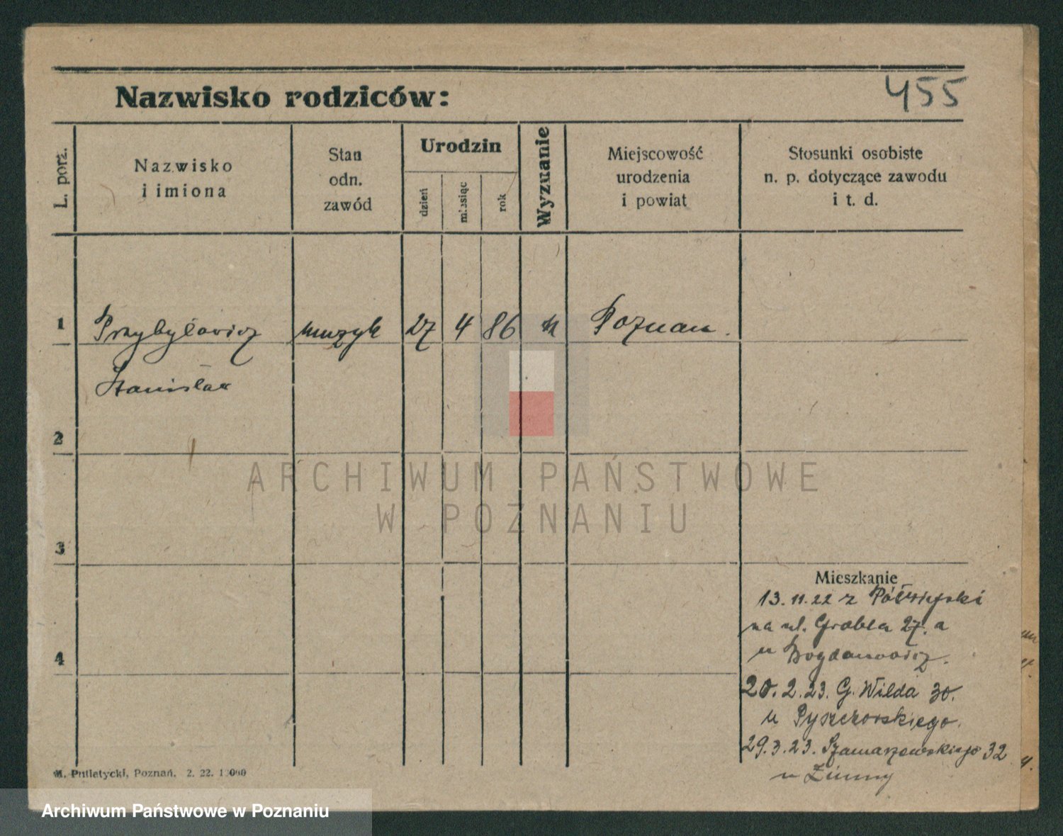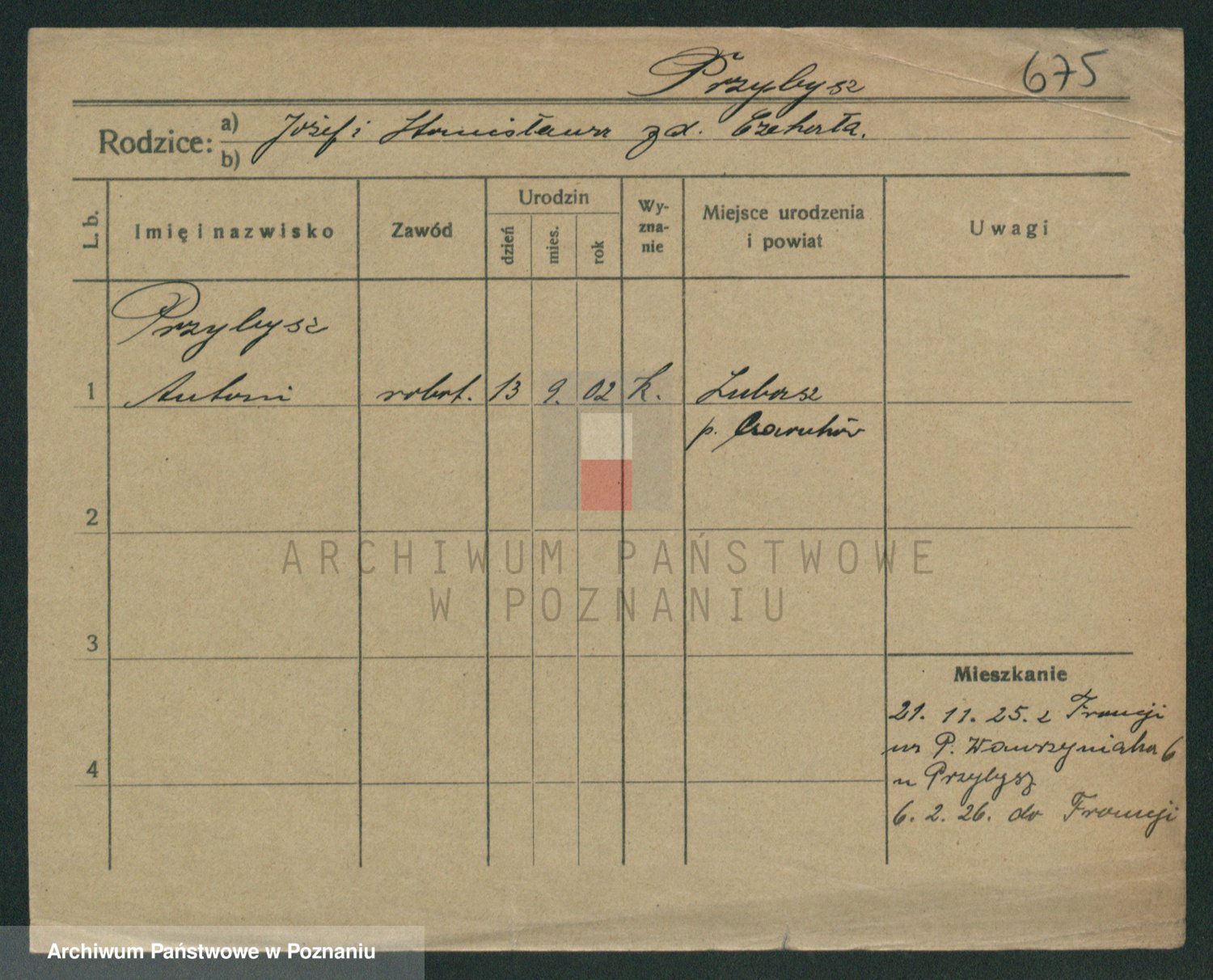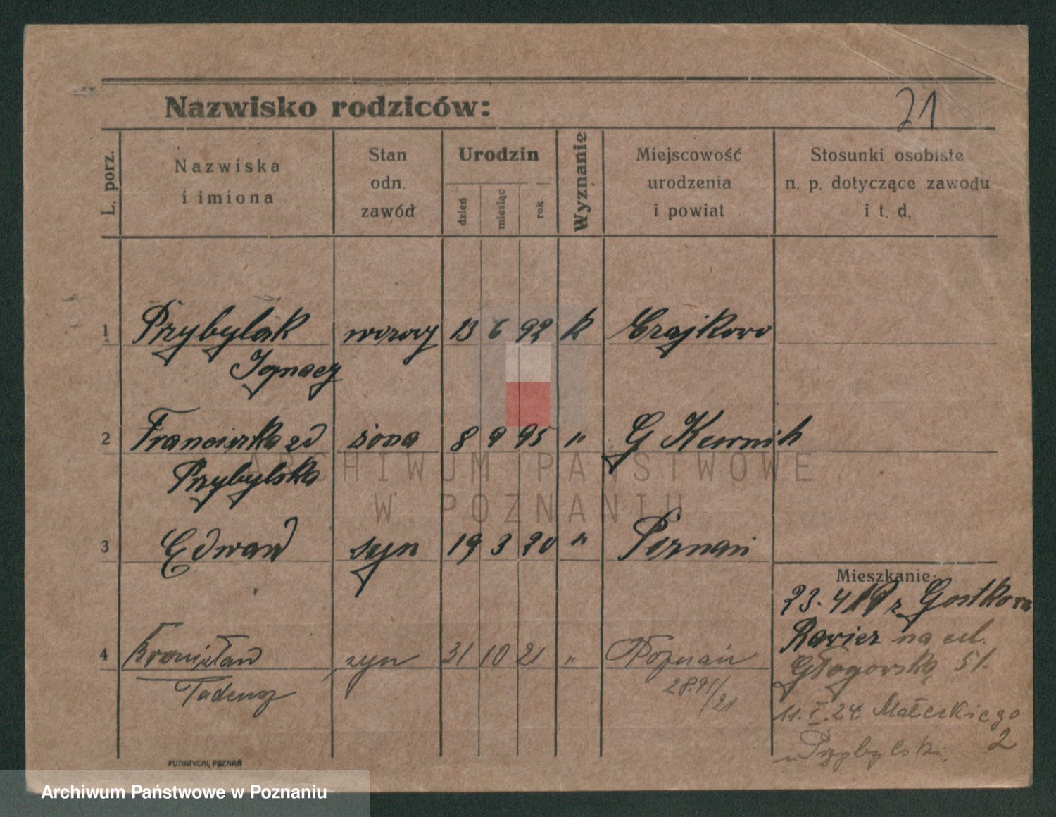 Podgląd karty osobowej dostępny jest po kliknięciu na nazwisko lub ikonkę karty. Można dokonywać powiększenia (ikony na górze) lub przechodzić między kolejnymi skanami (strzałki po bokach).