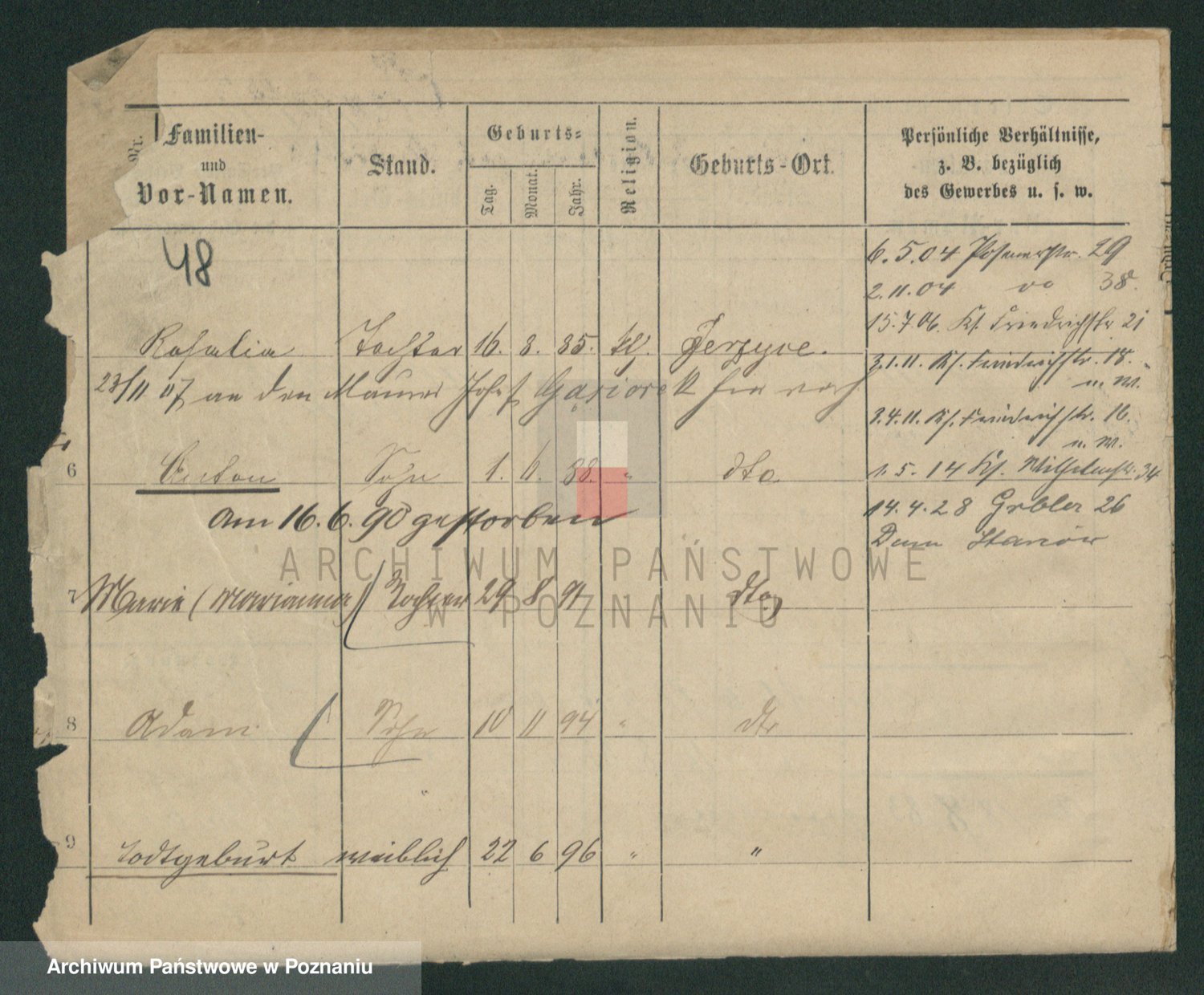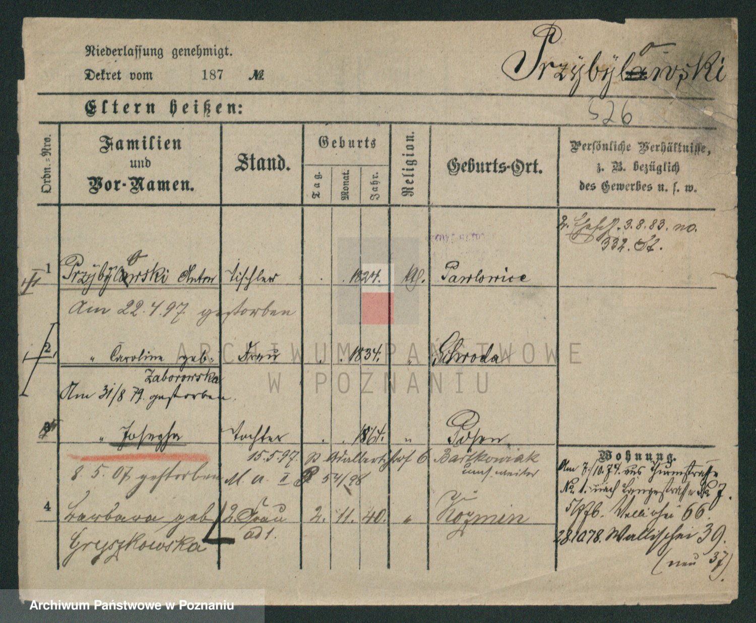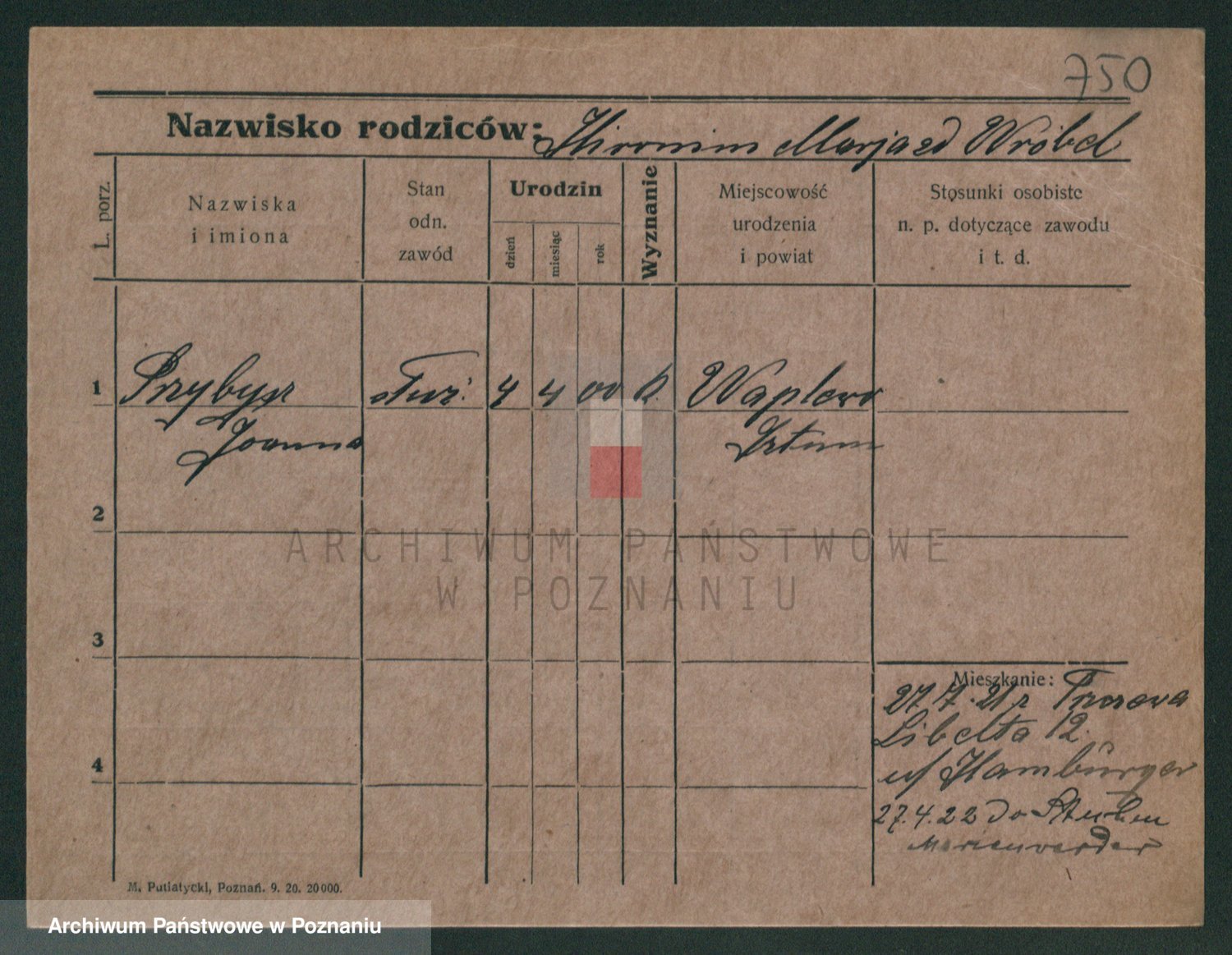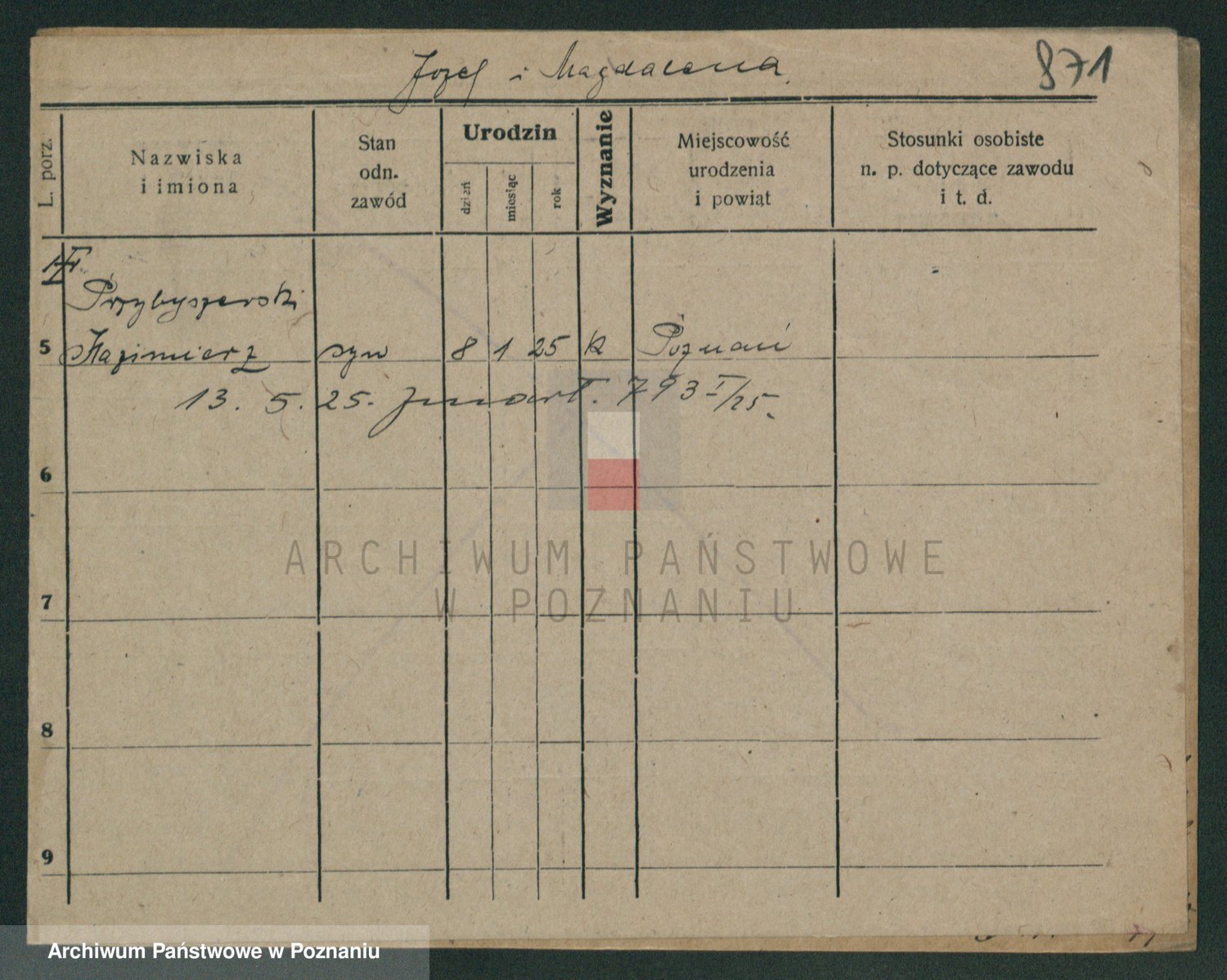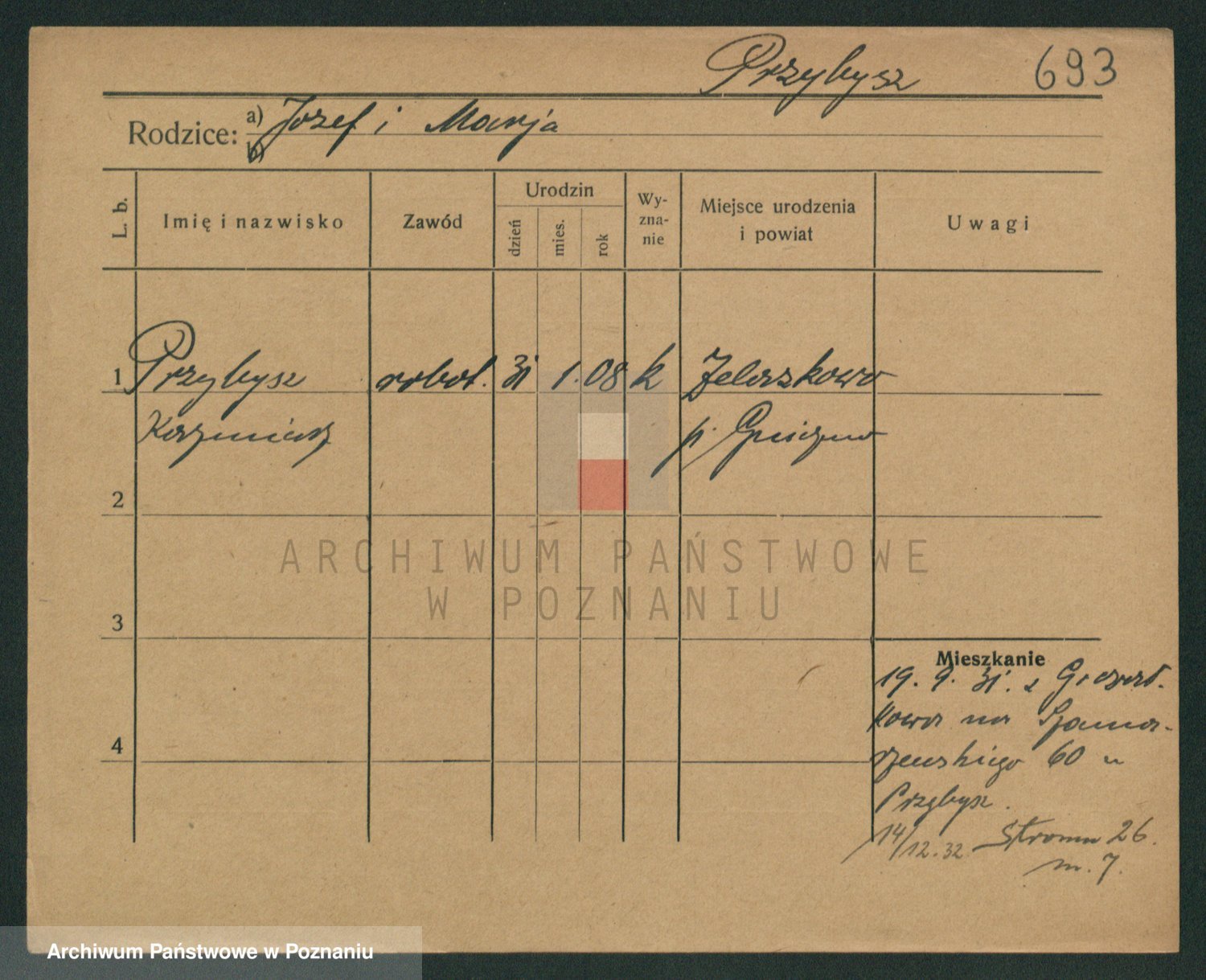 Podgląd karty osobowej dostępny jest po kliknięciu na nazwisko lub ikonkę karty. Można dokonywać powiększenia (ikony na górze) lub przechodzić między kolejnymi skanami (strzałki po bokach).