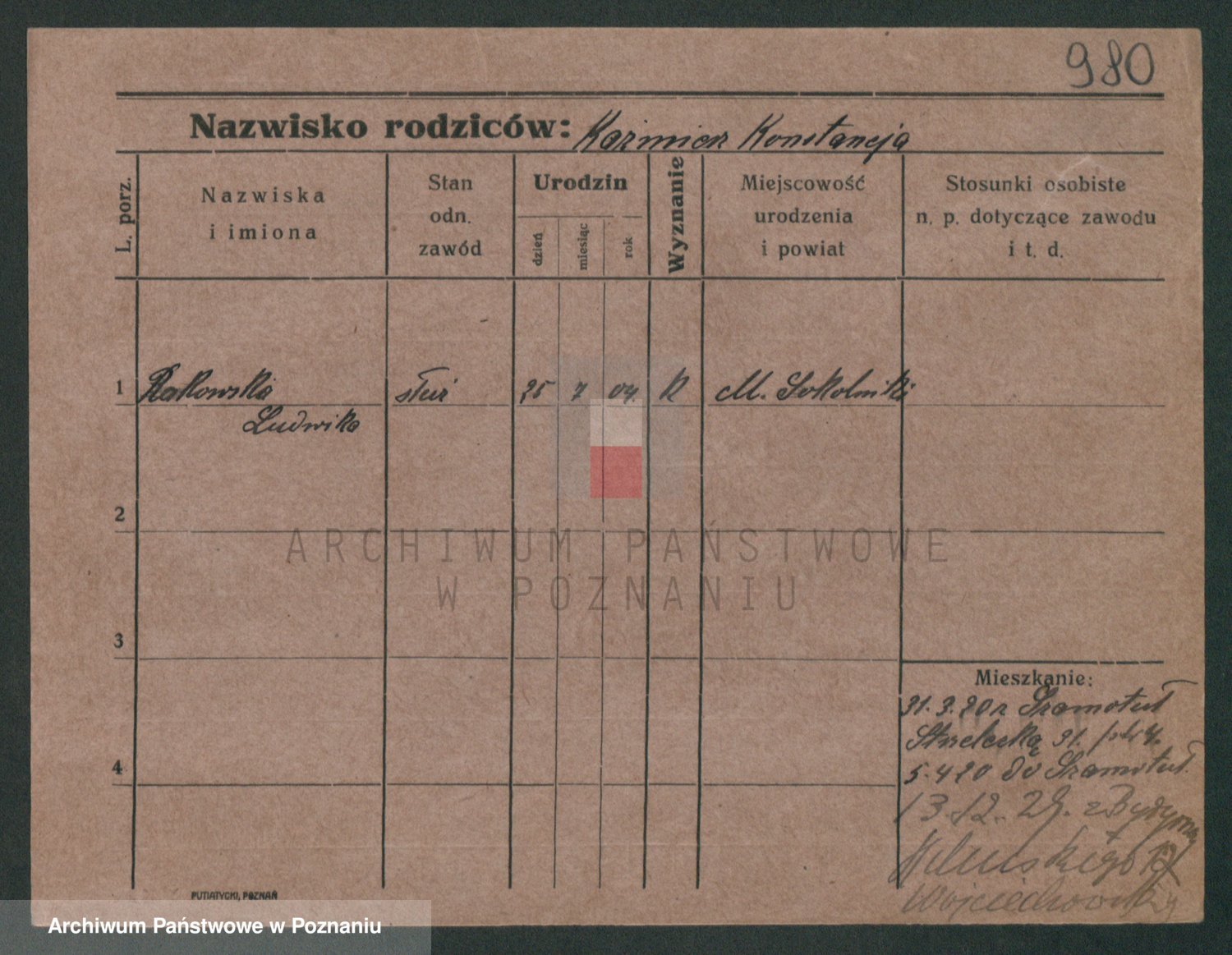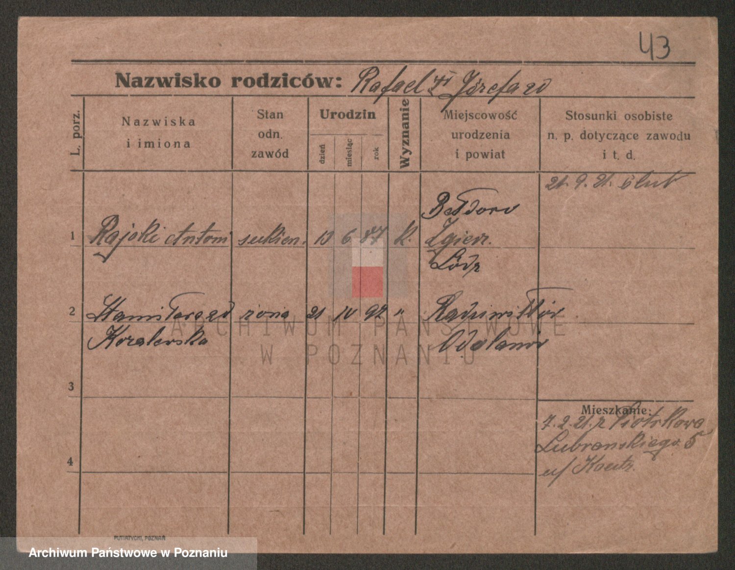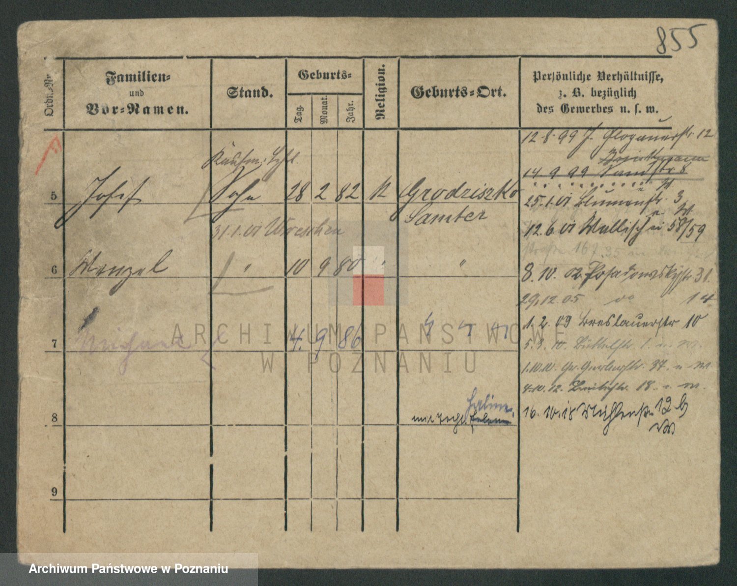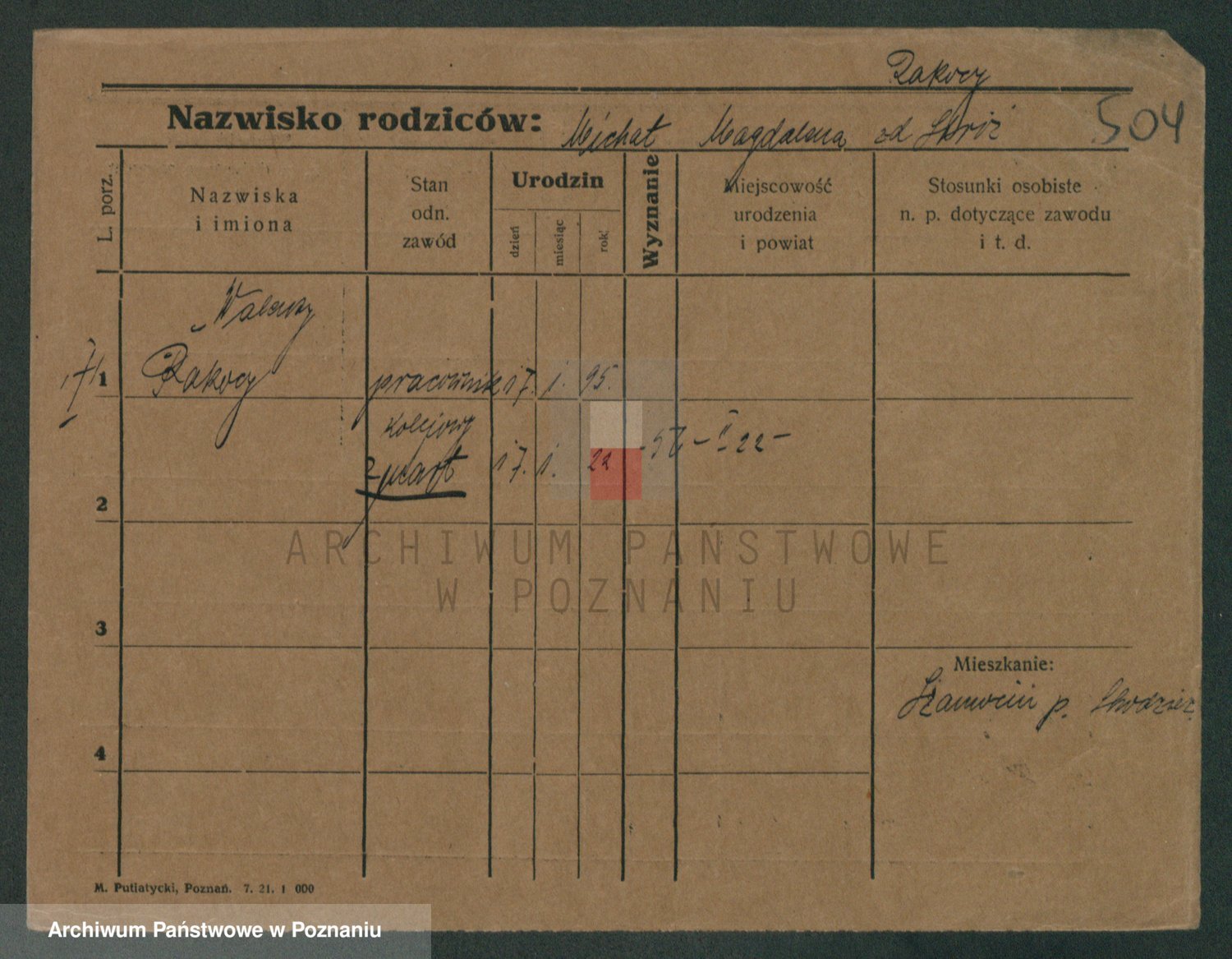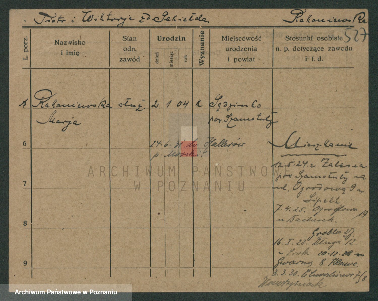 Podgląd karty osobowej dostępny jest po kliknięciu na nazwisko lub ikonkę karty. Można dokonywać powiększenia (ikony na górze) lub przechodzić między kolejnymi skanami (strzałki po bokach).