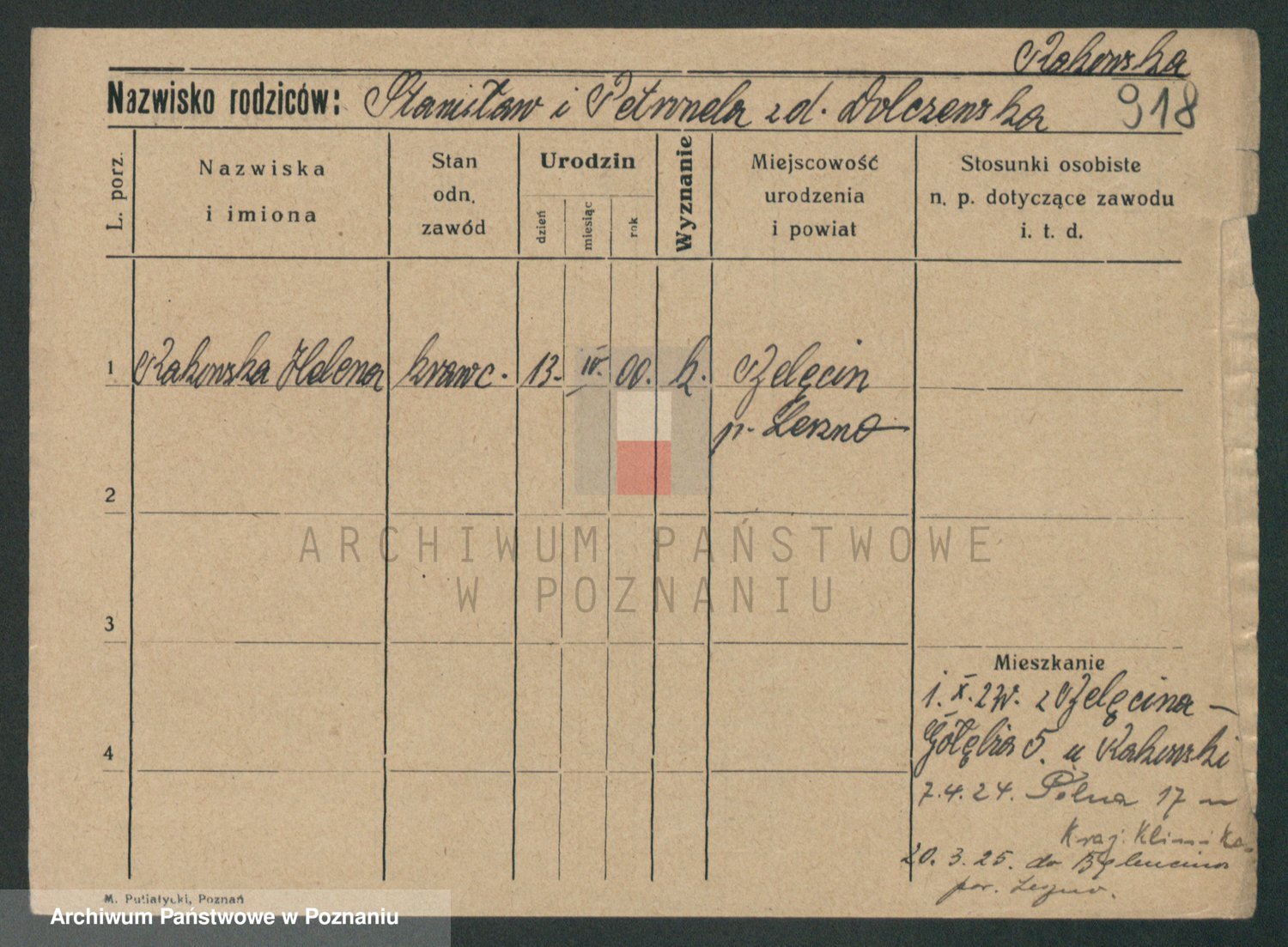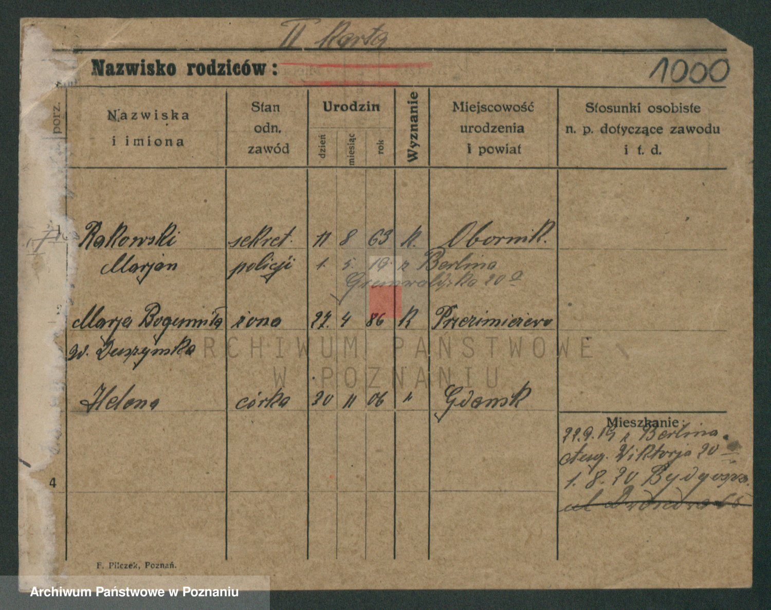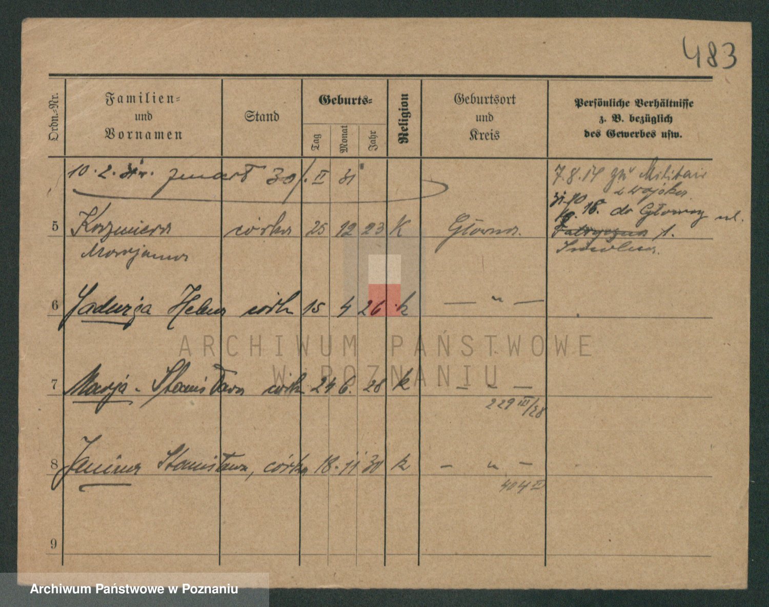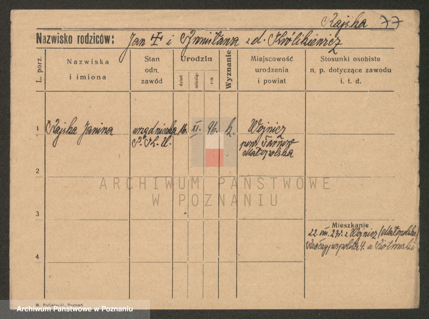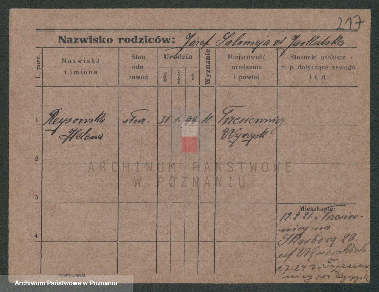 Podgląd karty osobowej dostępny jest po kliknięciu na nazwisko lub ikonkę karty. Można dokonywać powiększenia (ikony na górze) lub przechodzić między kolejnymi skanami (strzałki po bokach).