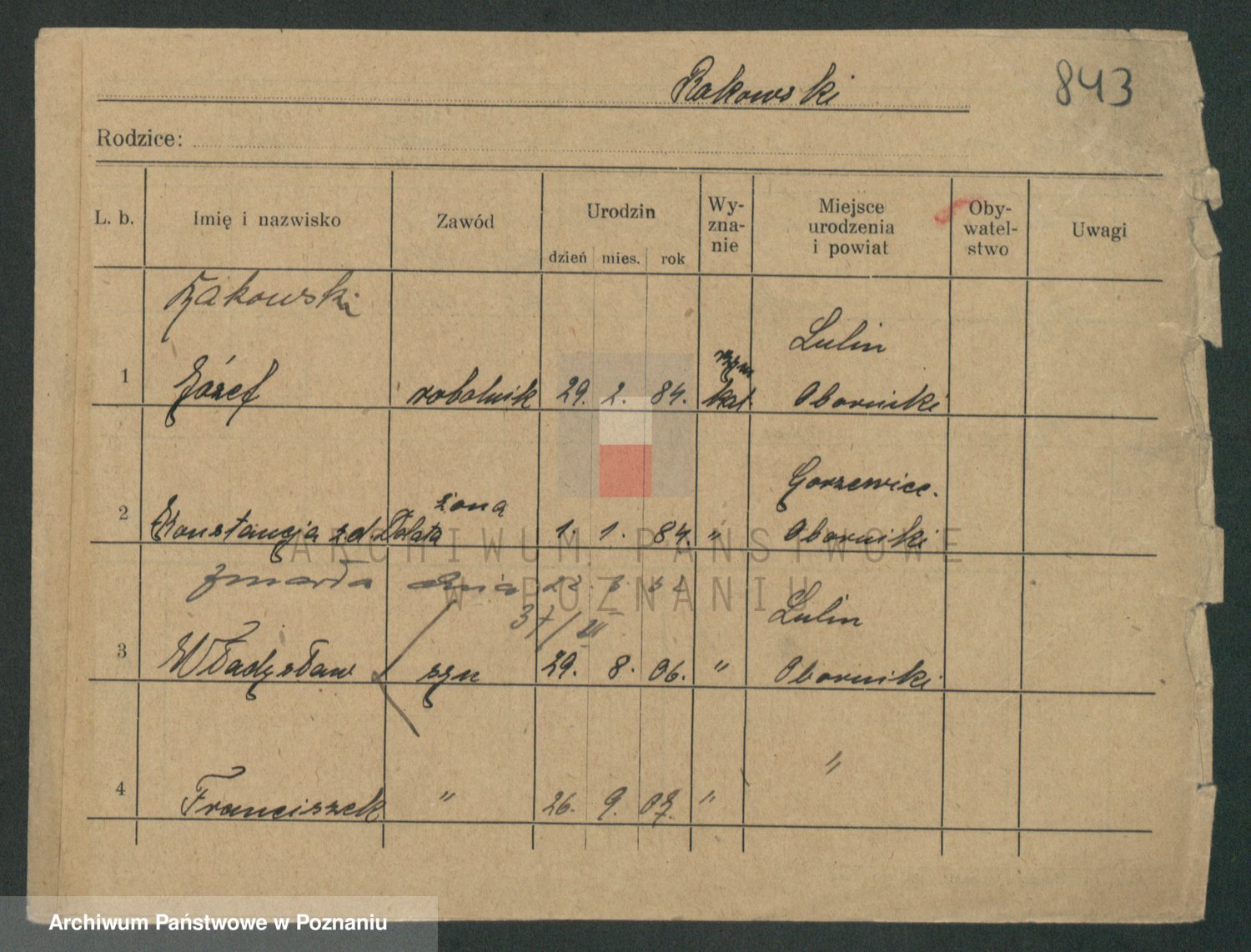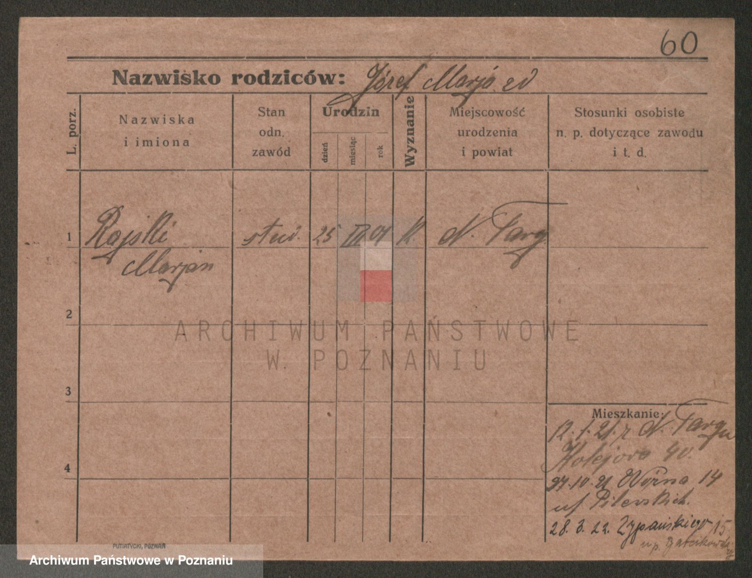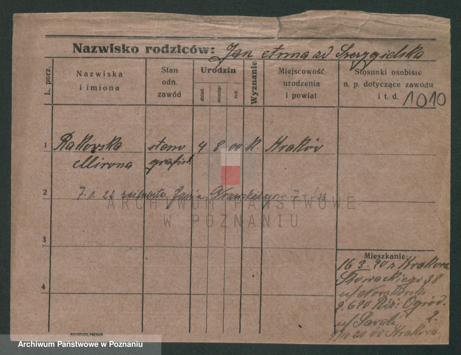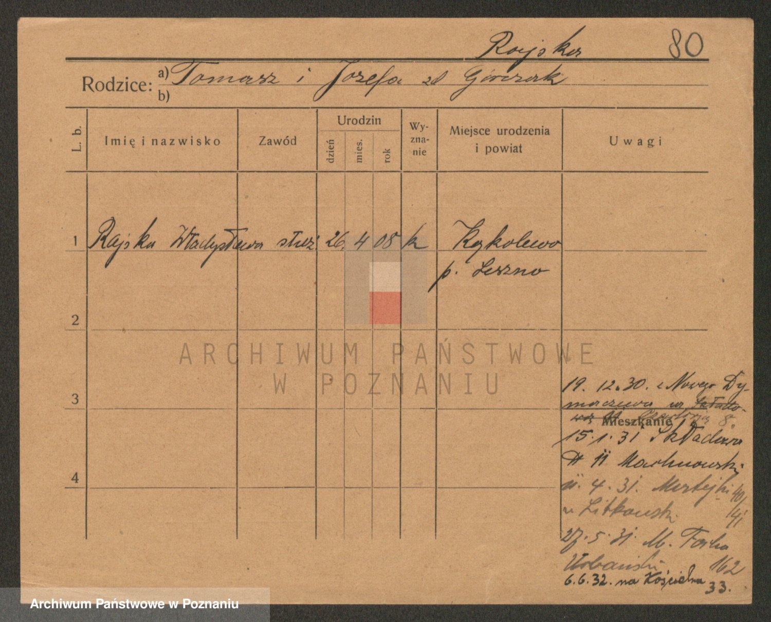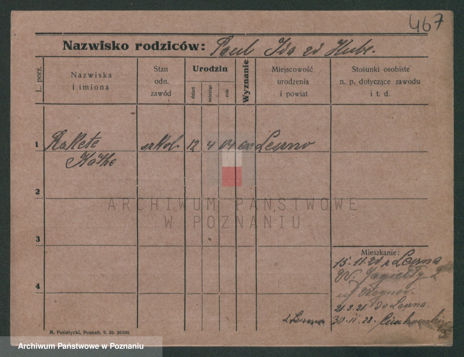 Podgląd karty osobowej dostępny jest po kliknięciu na nazwisko lub ikonkę karty. Można dokonywać powiększenia (ikony na górze) lub przechodzić między kolejnymi skanami (strzałki po bokach).