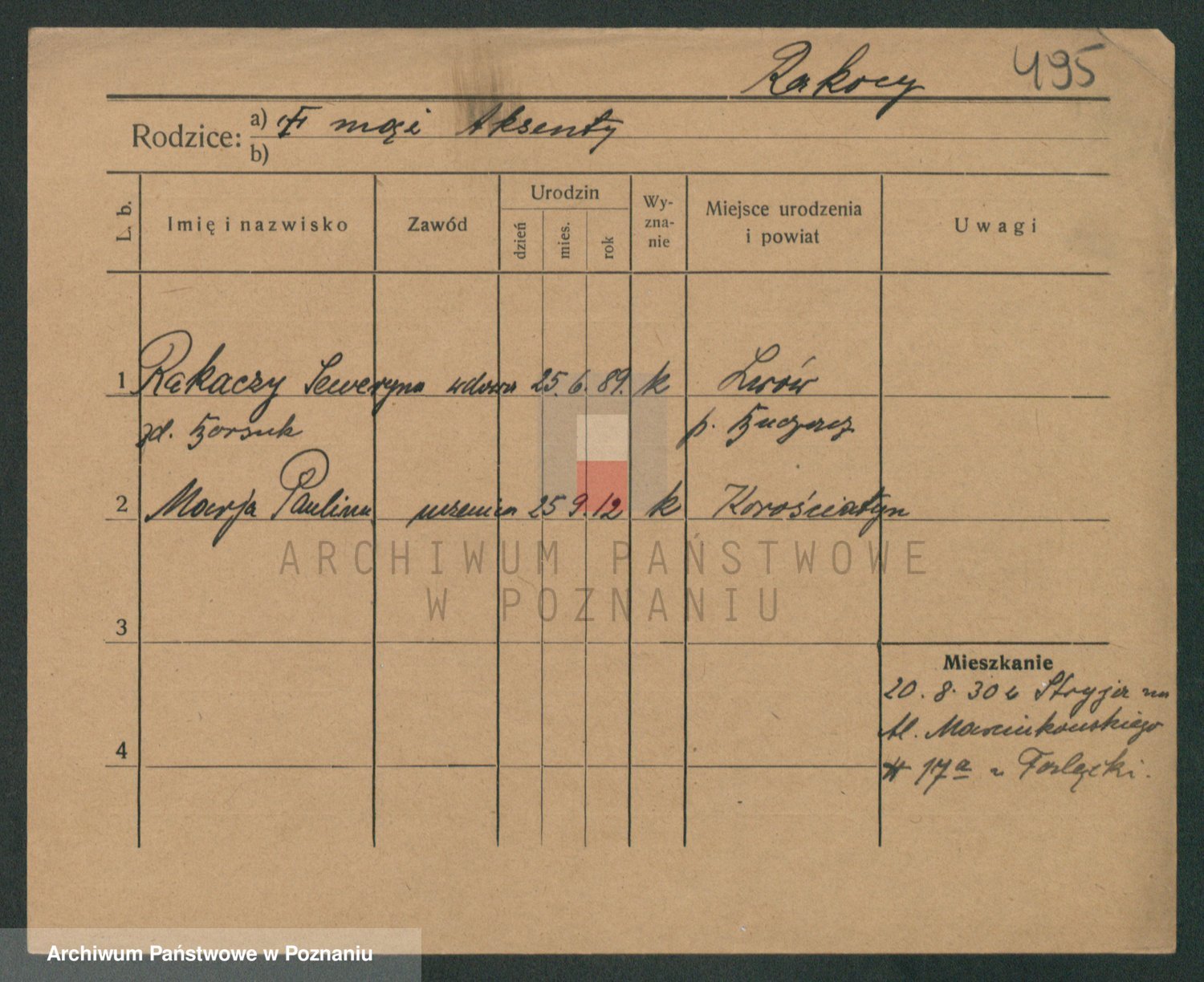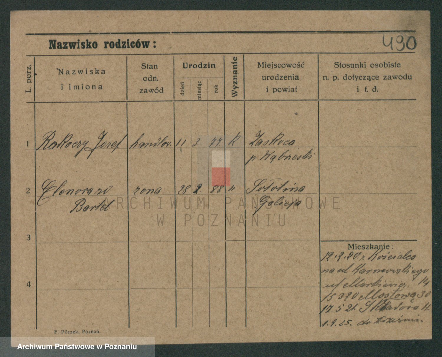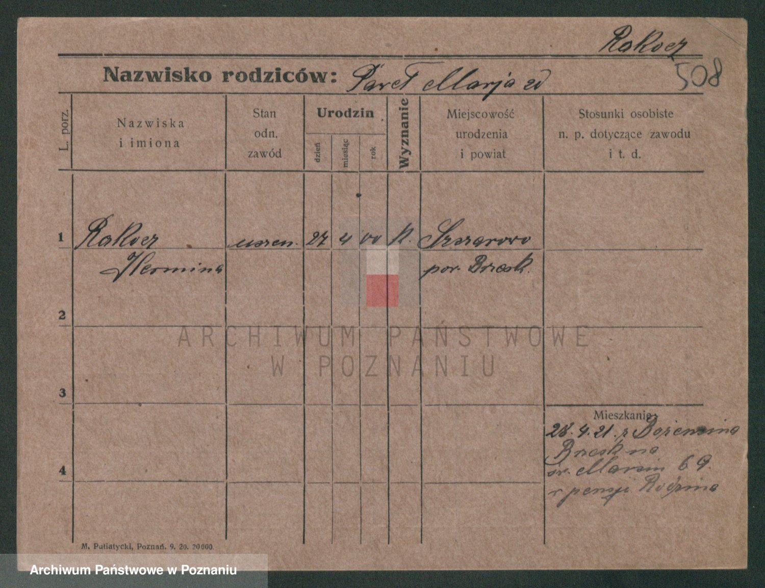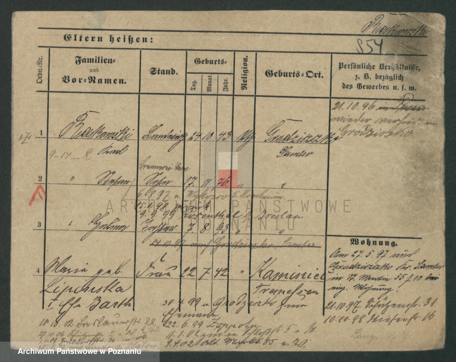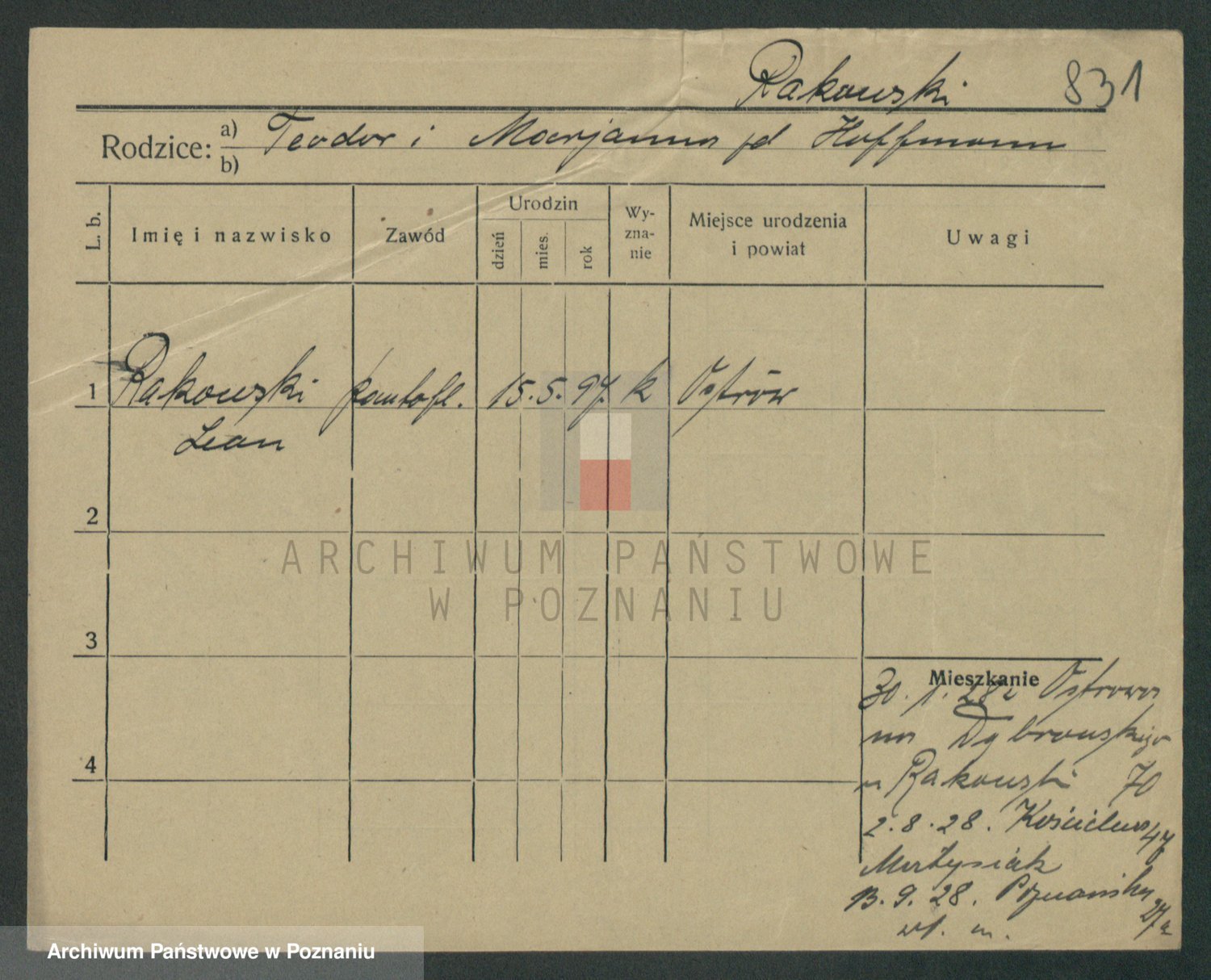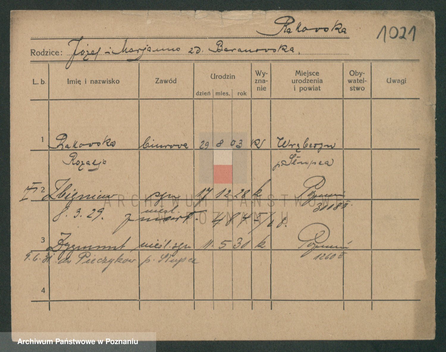Podgląd karty osobowej dostępny jest po kliknięciu na nazwisko lub ikonkę karty. Można dokonywać powiększenia (ikony na górze) lub przechodzić między kolejnymi skanami (strzałki po bokach).