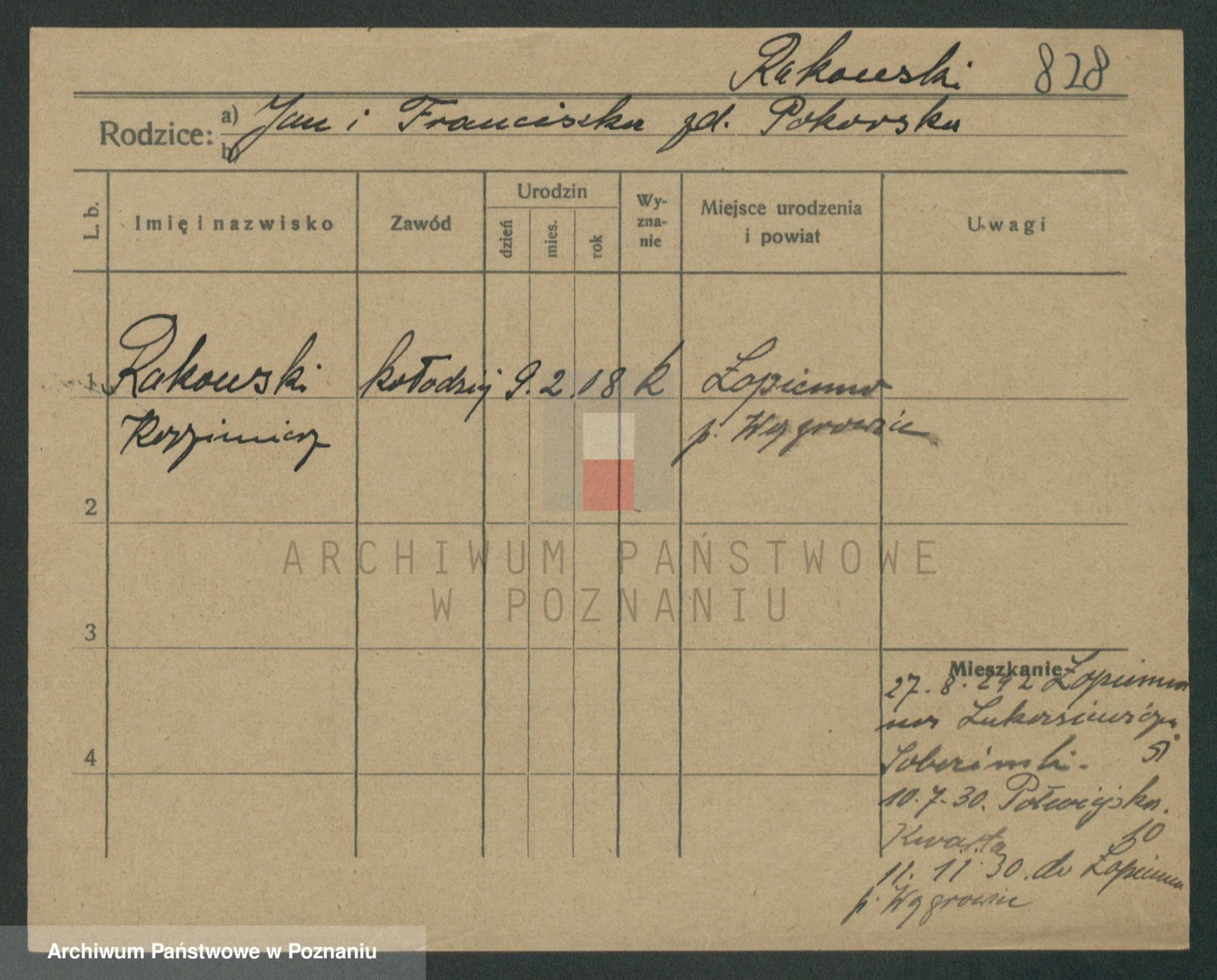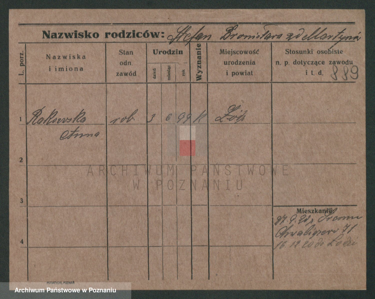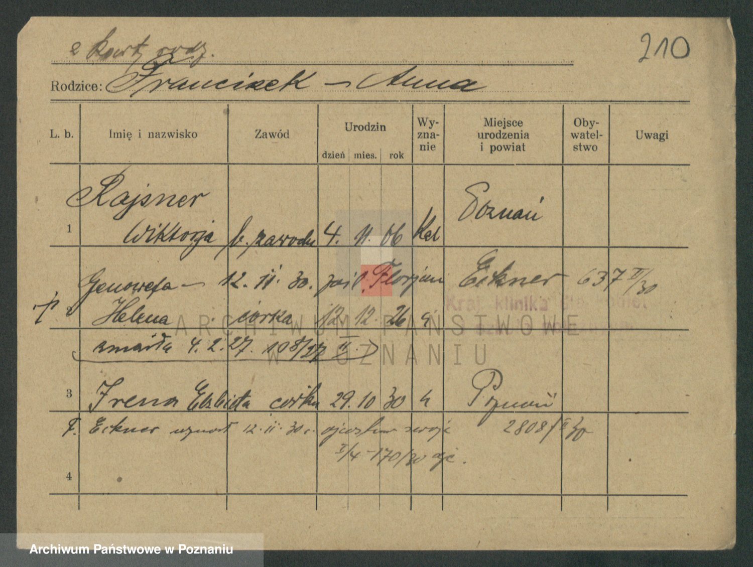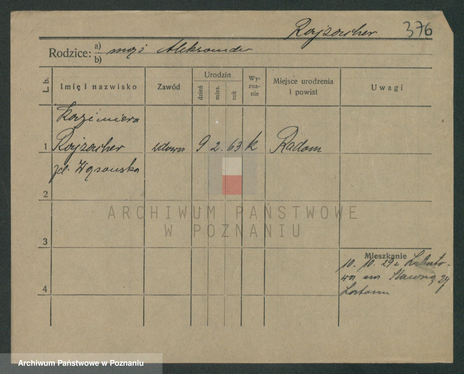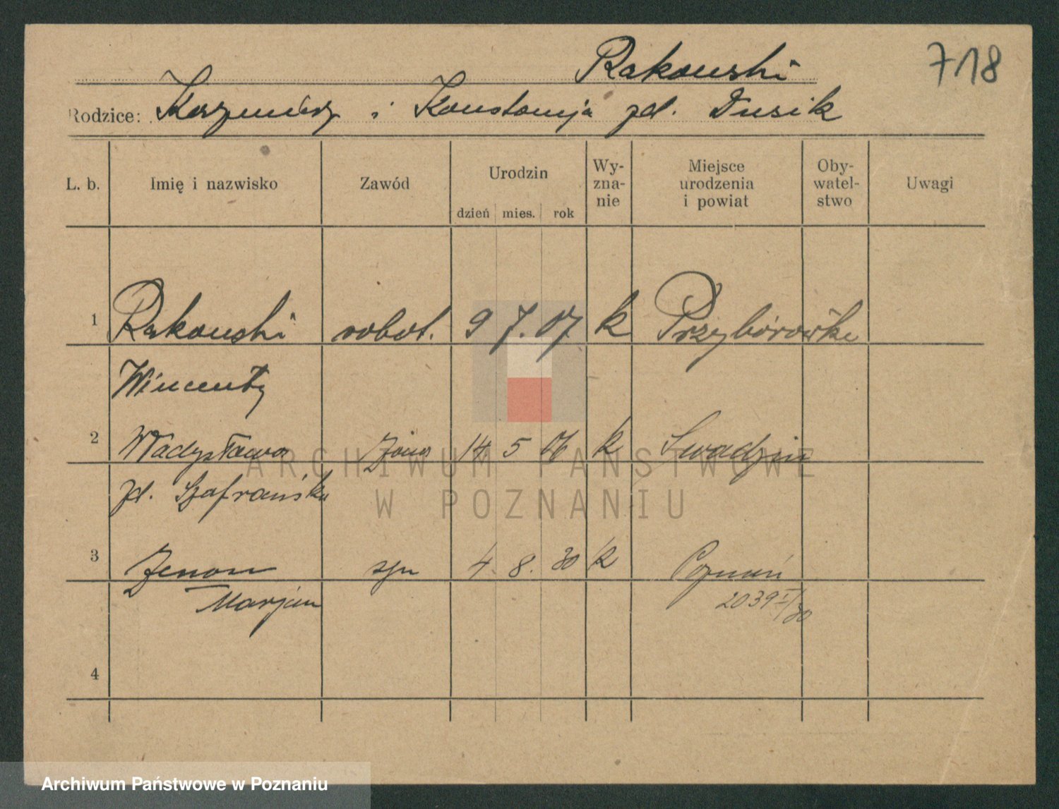 Podgląd karty osobowej dostępny jest po kliknięciu na nazwisko lub ikonkę karty. Można dokonywać powiększenia (ikony na górze) lub przechodzić między kolejnymi skanami (strzałki po bokach).