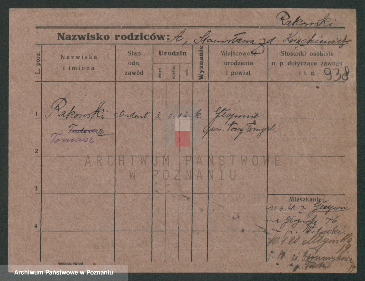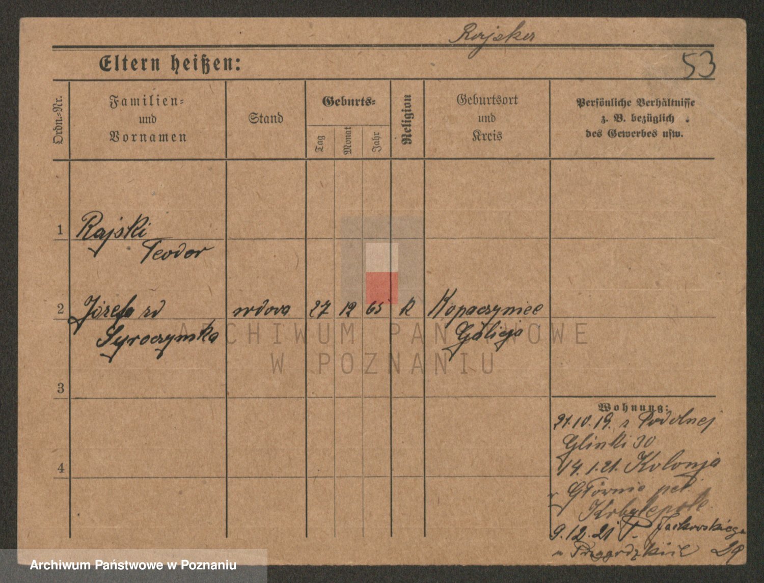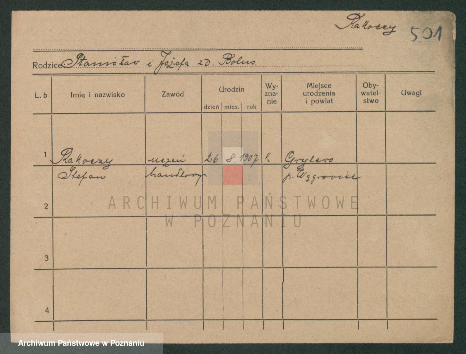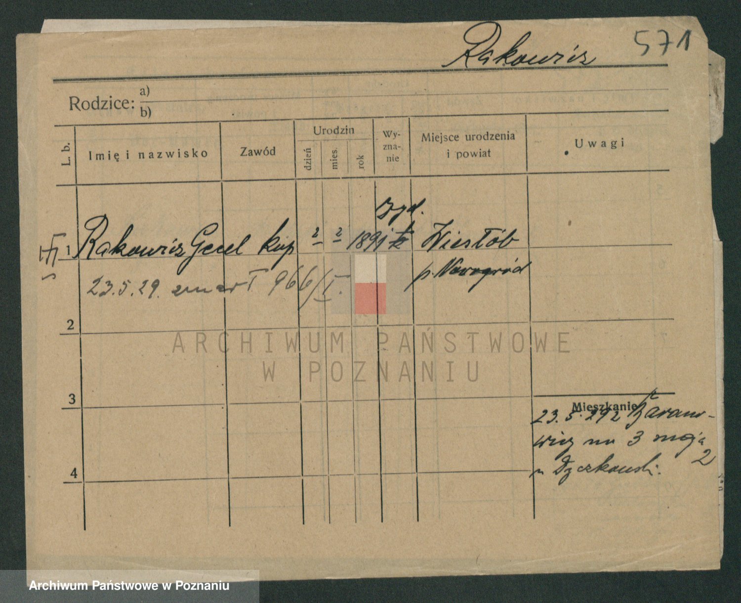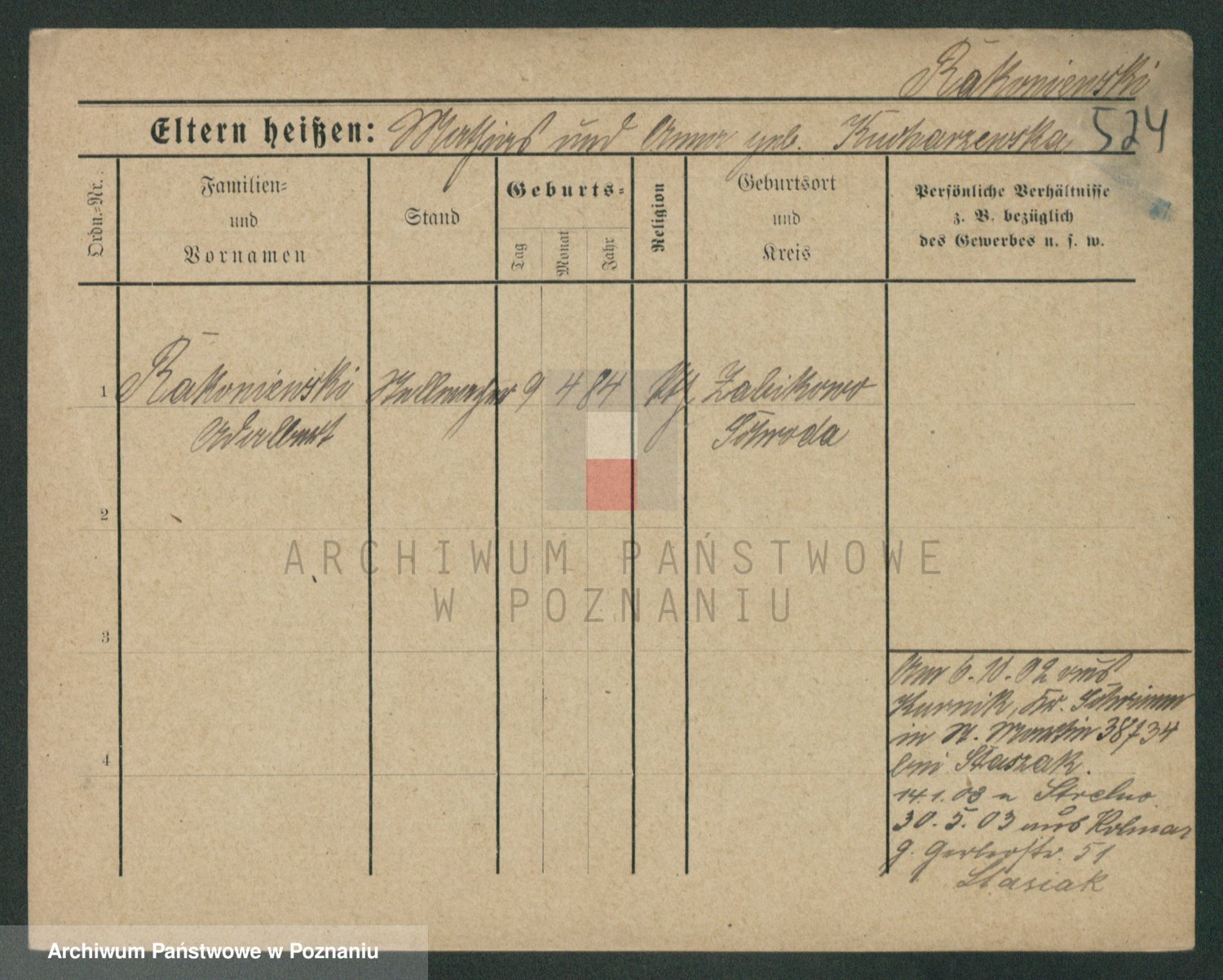 Podgląd karty osobowej dostępny jest po kliknięciu na nazwisko lub ikonkę karty. Można dokonywać powiększenia (ikony na górze) lub przechodzić między kolejnymi skanami (strzałki po bokach).