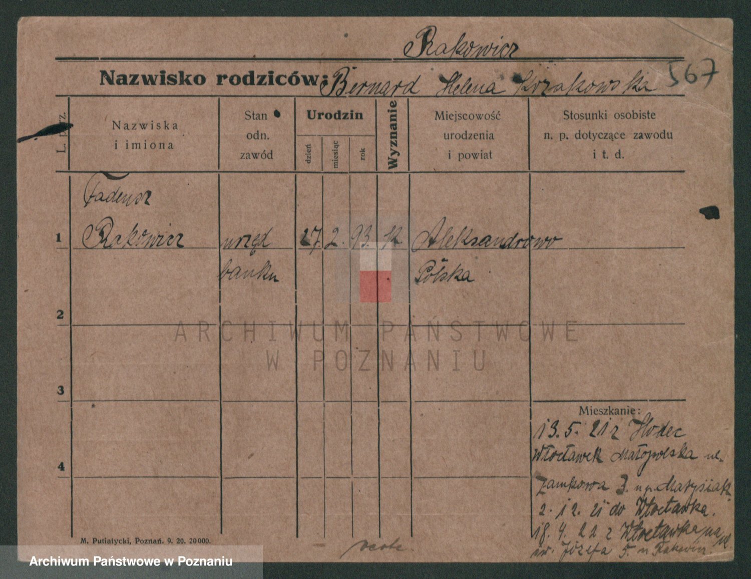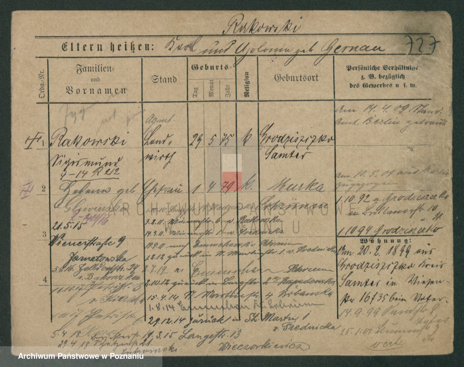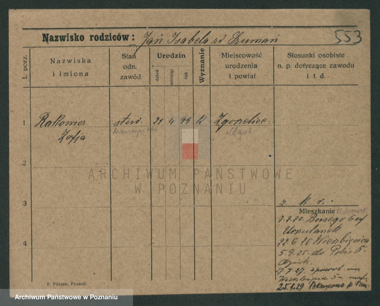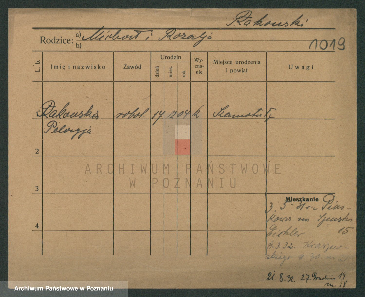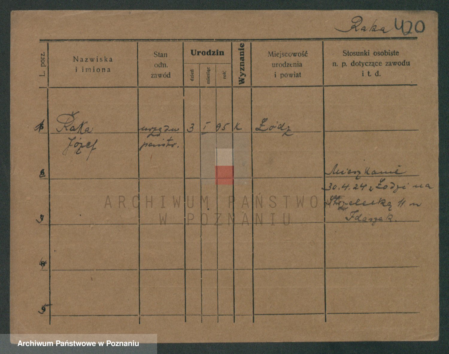 Podgląd karty osobowej dostępny jest po kliknięciu na nazwisko lub ikonkę karty. Można dokonywać powiększenia (ikony na górze) lub przechodzić między kolejnymi skanami (strzałki po bokach).