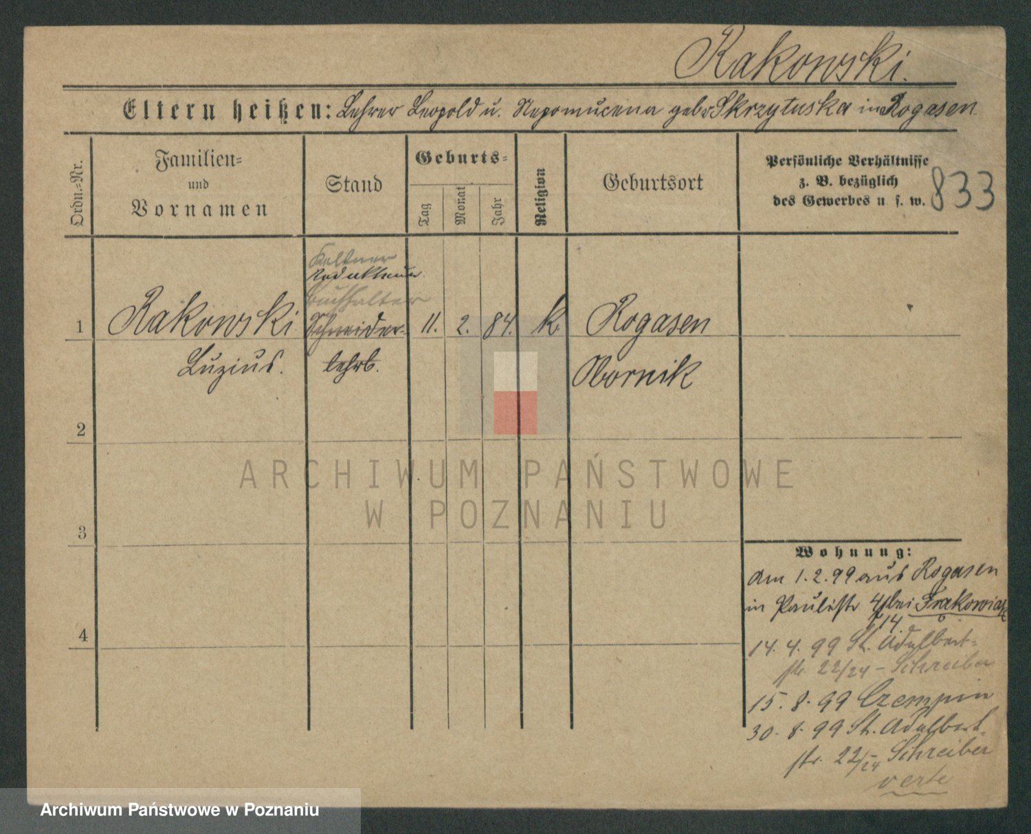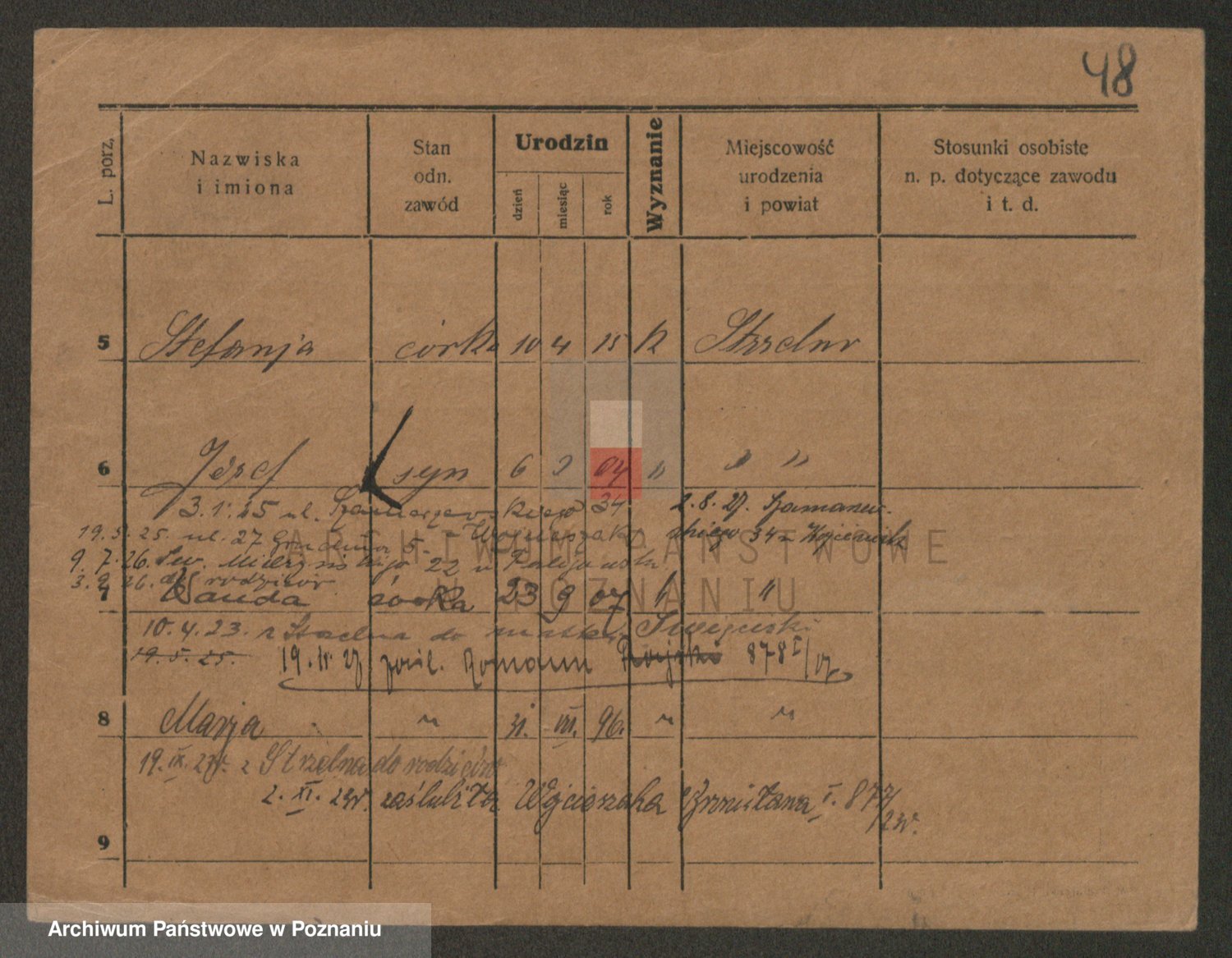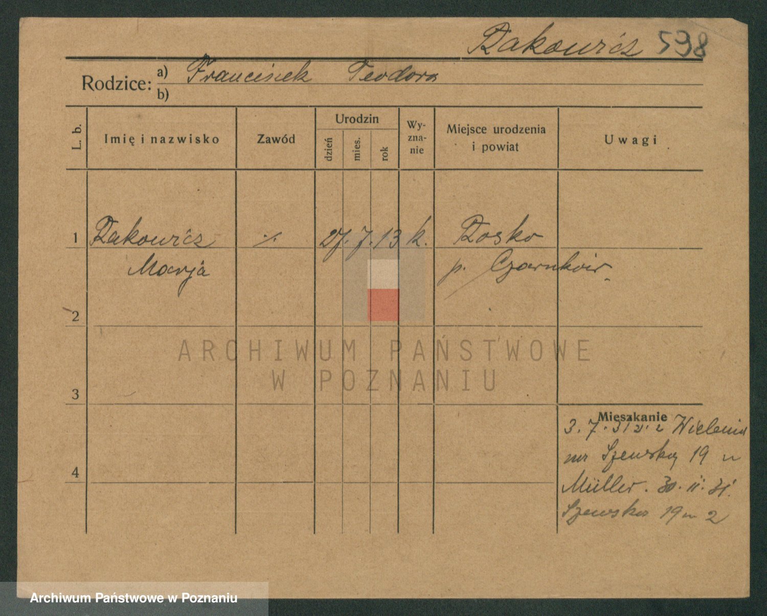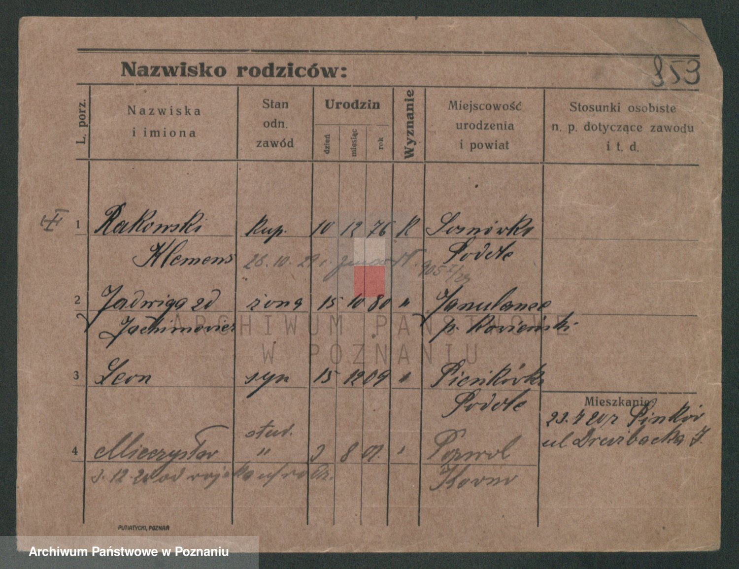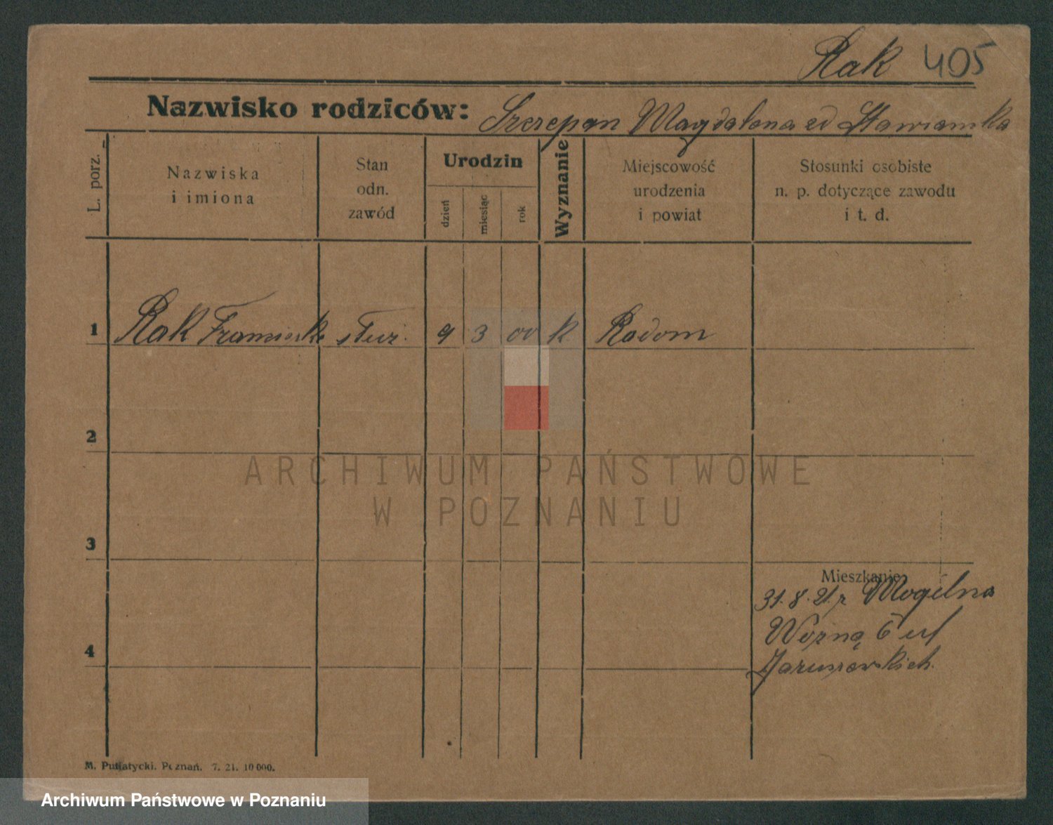 Podgląd karty osobowej dostępny jest po kliknięciu na nazwisko lub ikonkę karty. Można dokonywać powiększenia (ikony na górze) lub przechodzić między kolejnymi skanami (strzałki po bokach).