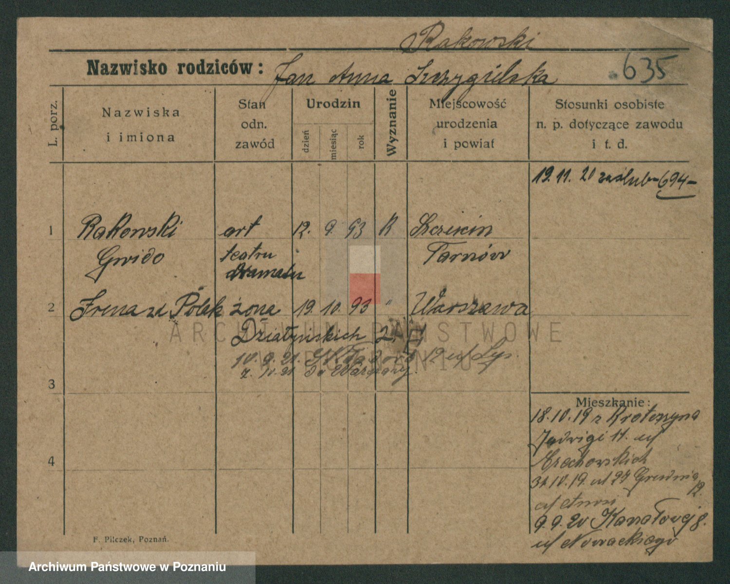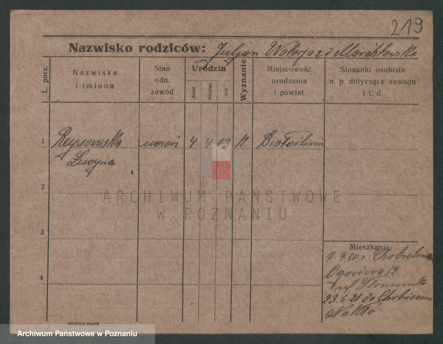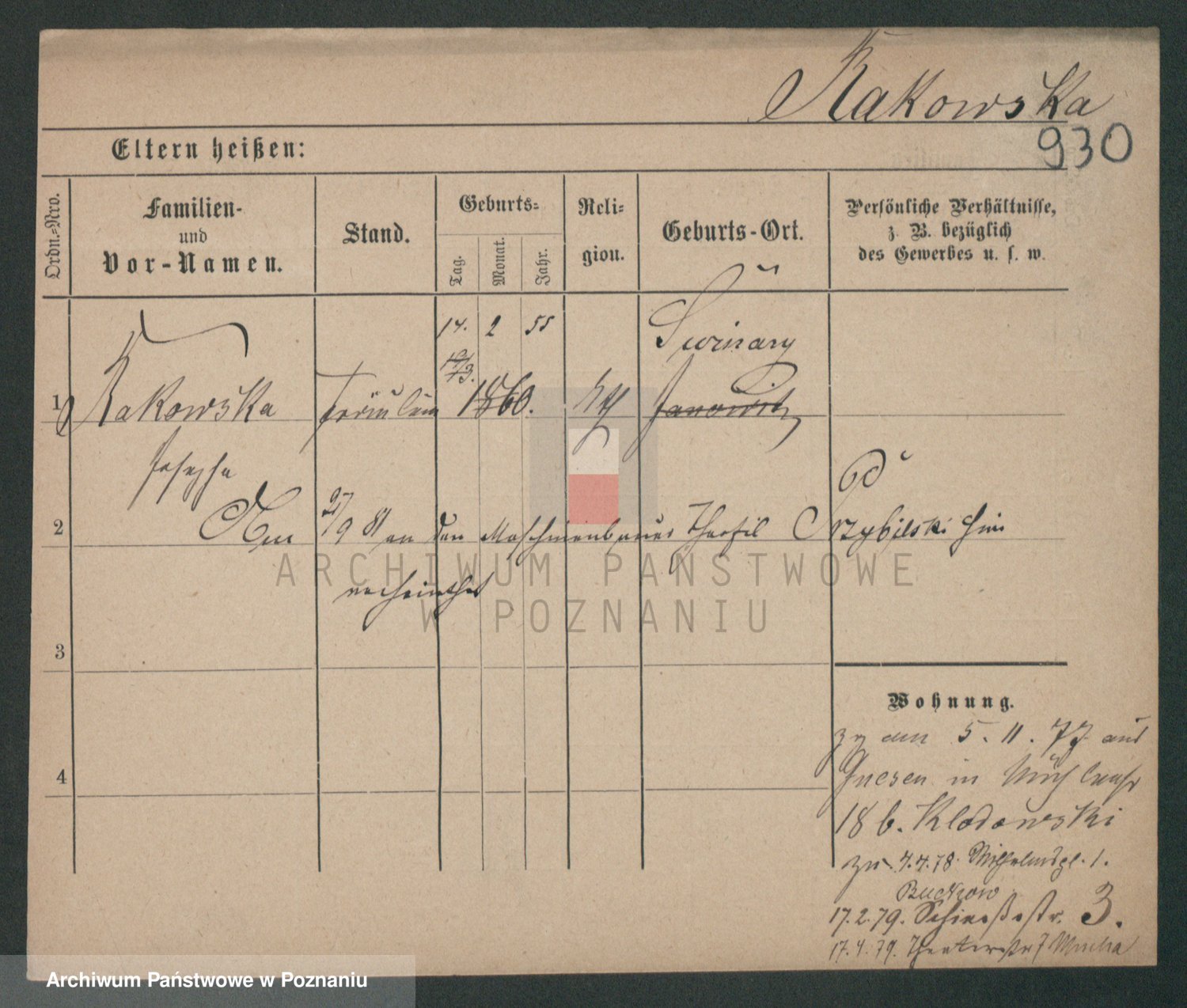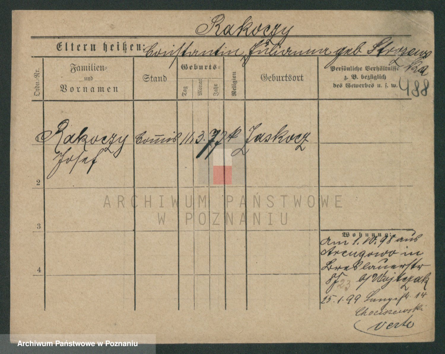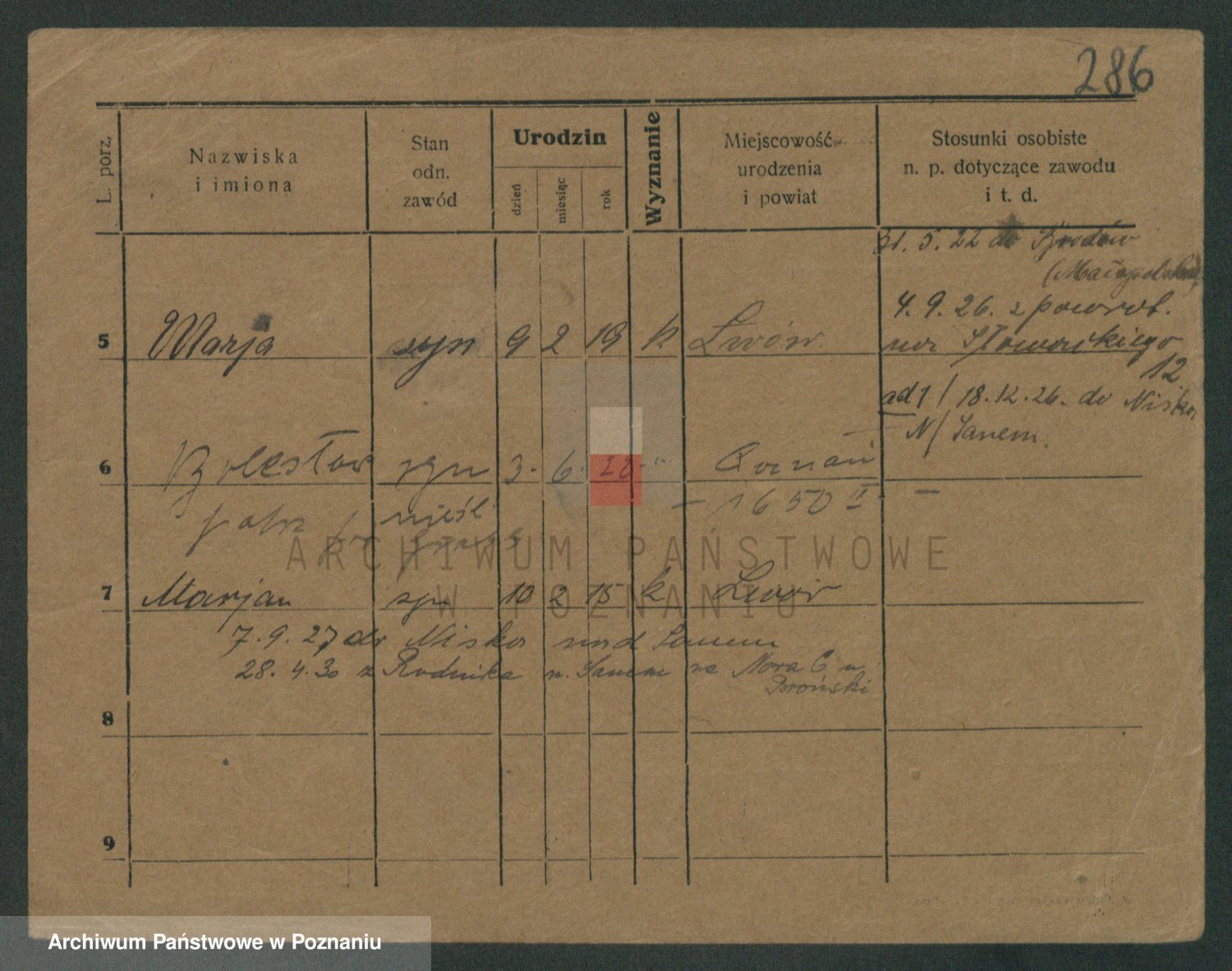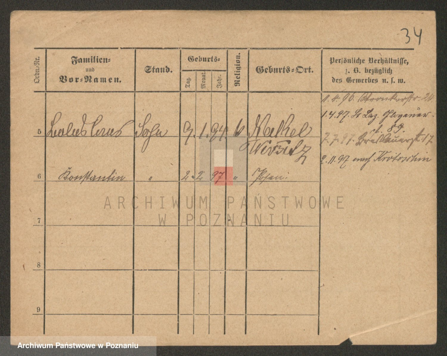 Podgląd karty osobowej dostępny jest po kliknięciu na nazwisko lub ikonkę karty. Można dokonywać powiększenia (ikony na górze) lub przechodzić między kolejnymi skanami (strzałki po bokach).