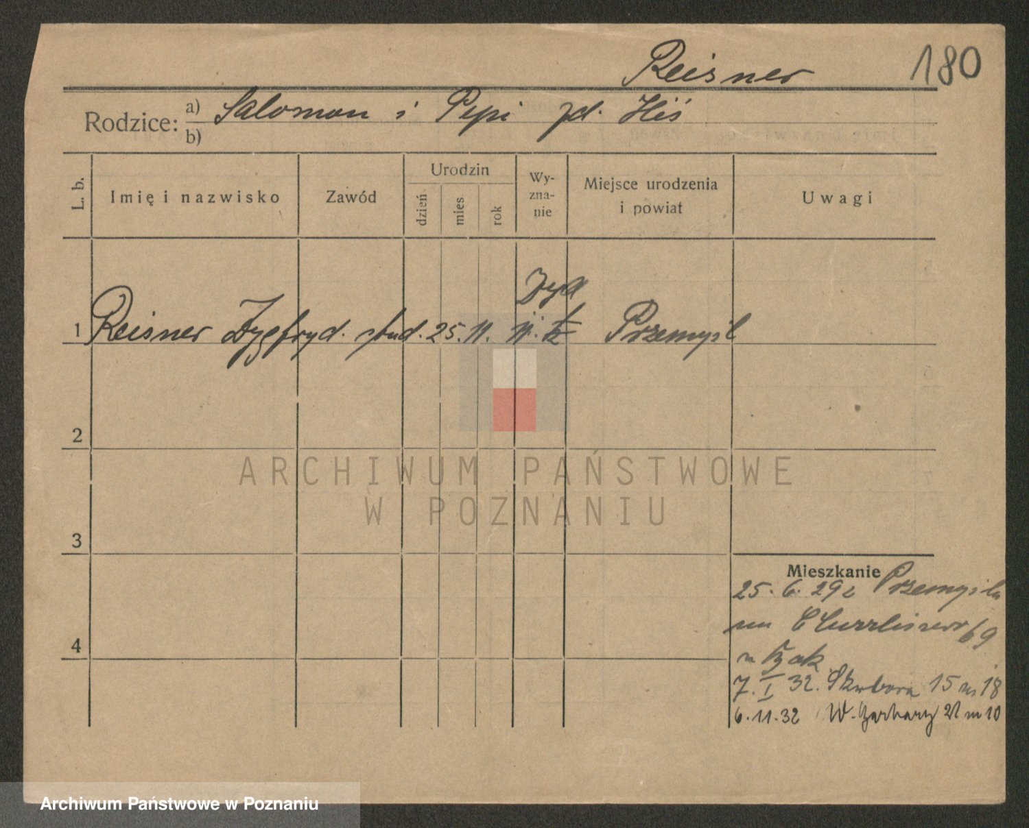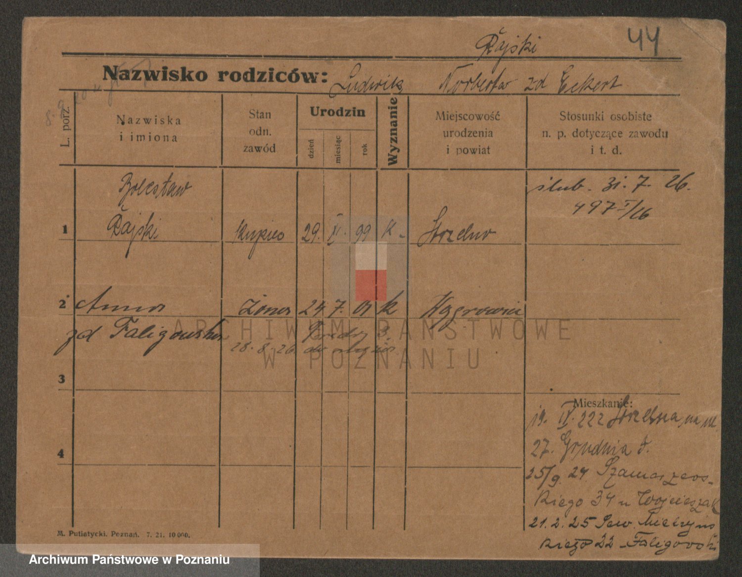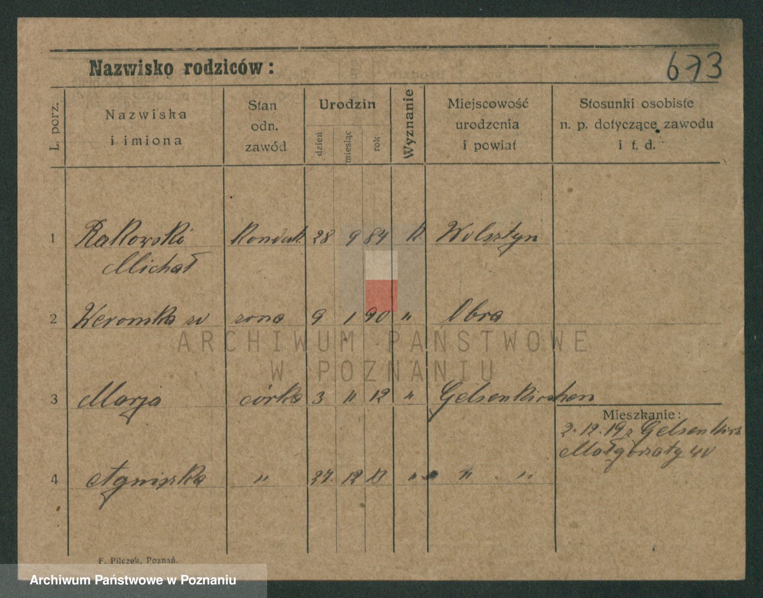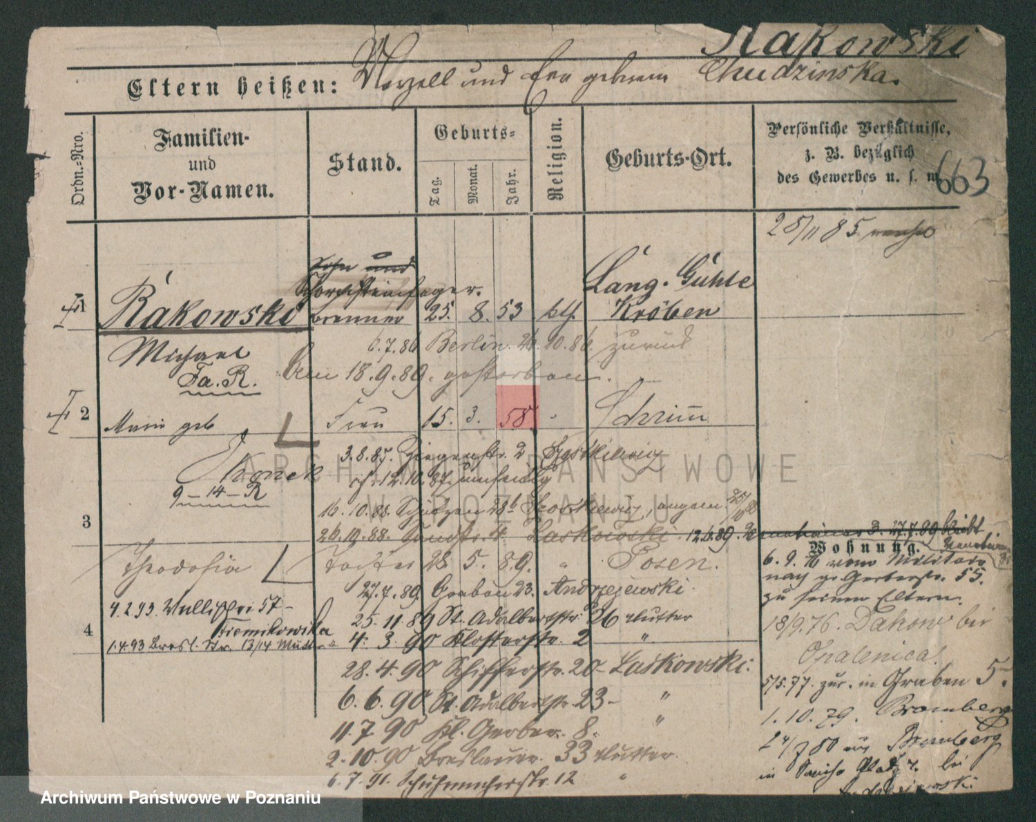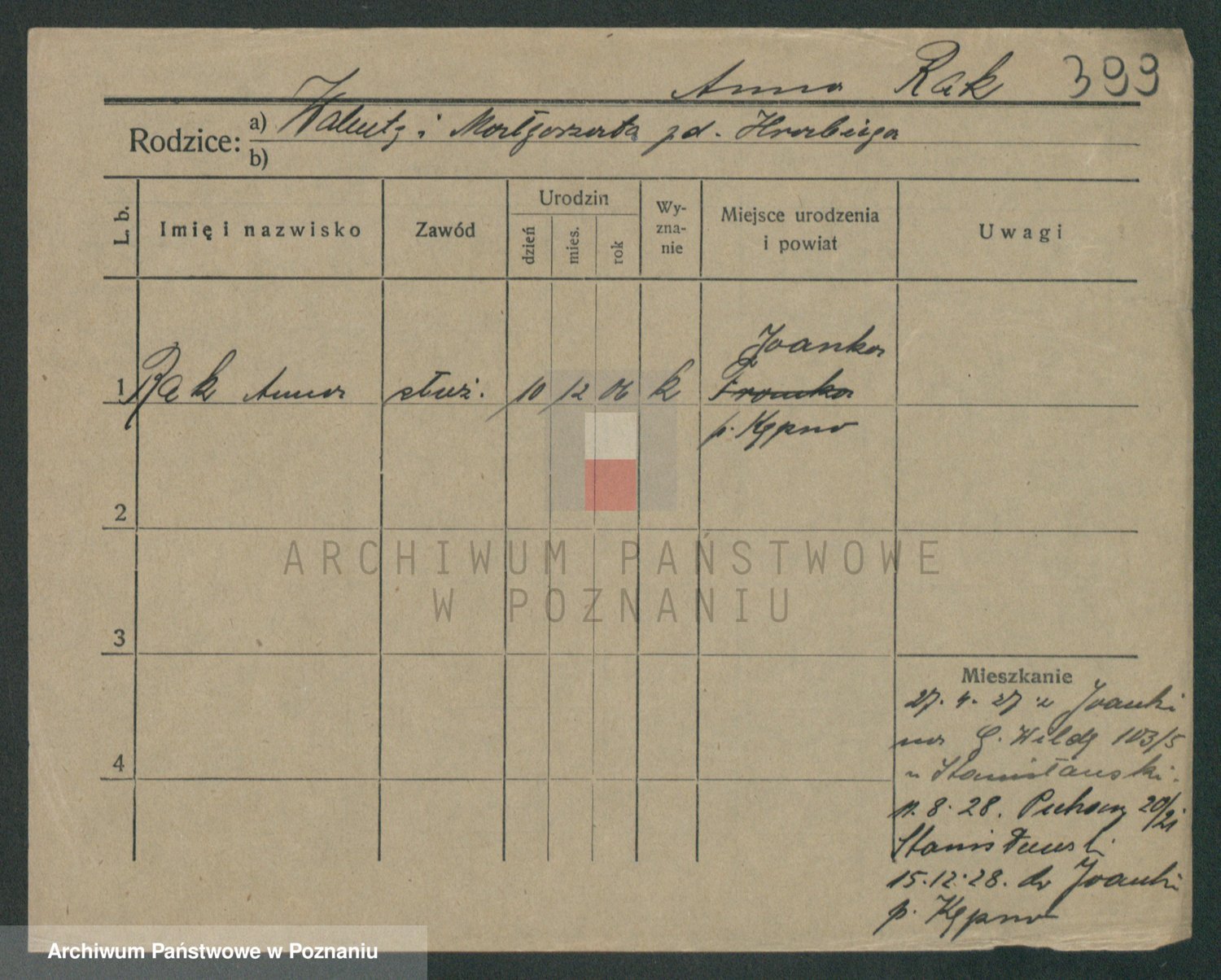Podgląd karty osobowej dostępny jest po kliknięciu na nazwisko lub ikonkę karty. Można dokonywać powiększenia (ikony na górze) lub przechodzić między kolejnymi skanami (strzałki po bokach).