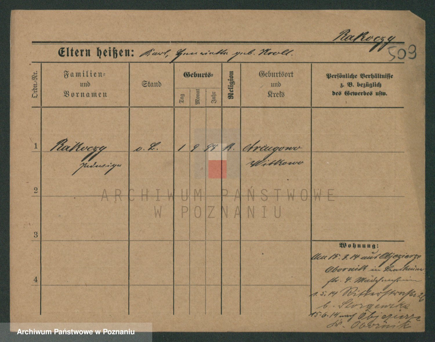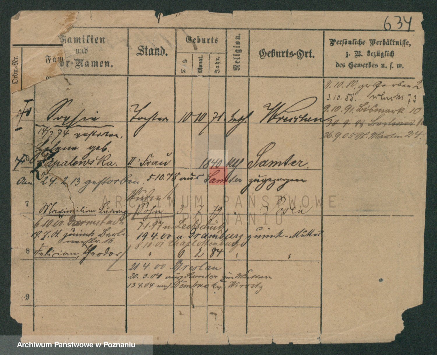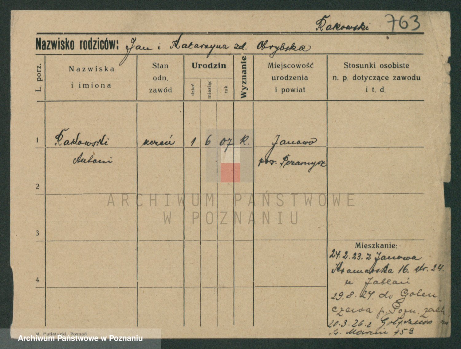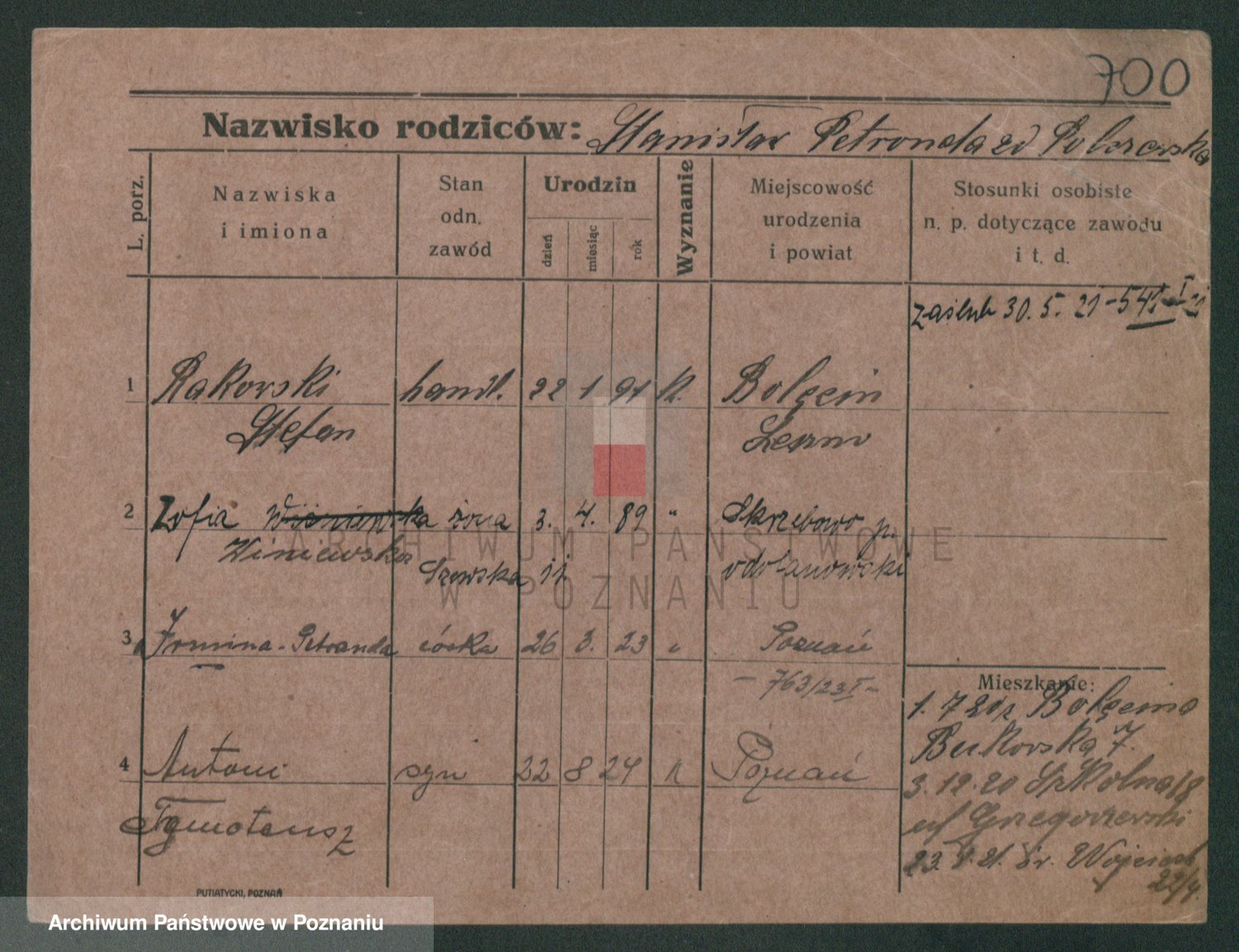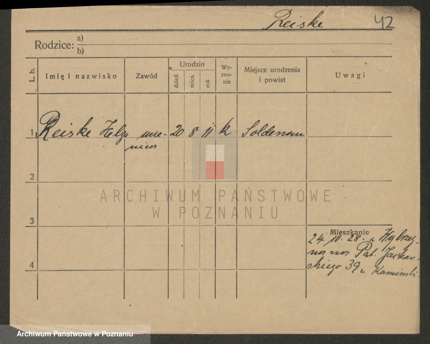 Podgląd karty osobowej dostępny jest po kliknięciu na nazwisko lub ikonkę karty. Można dokonywać powiększenia (ikony na górze) lub przechodzić między kolejnymi skanami (strzałki po bokach).