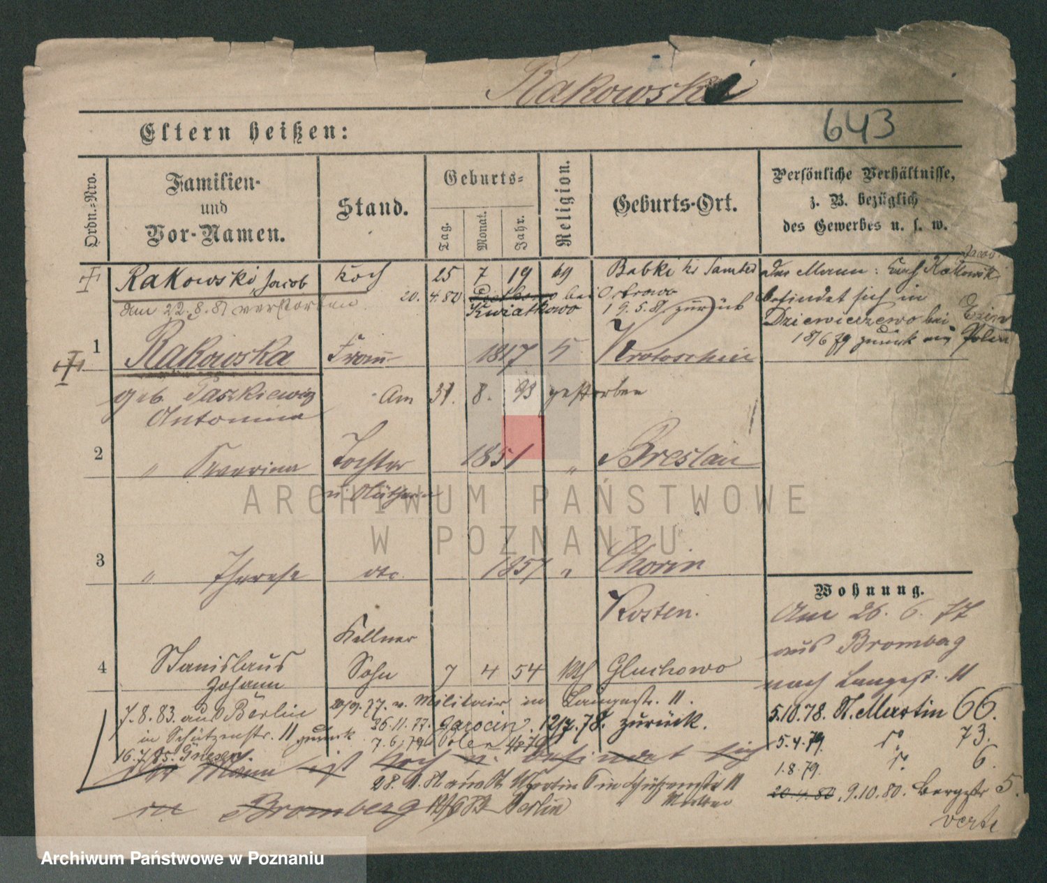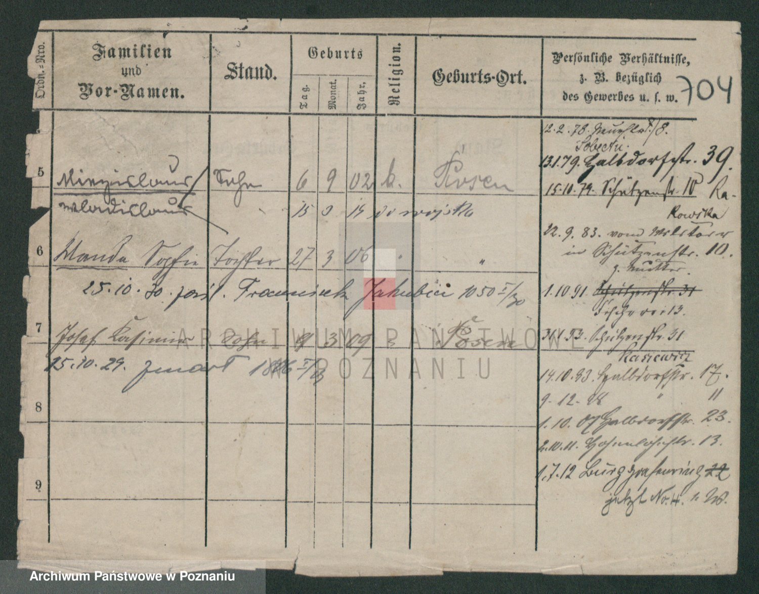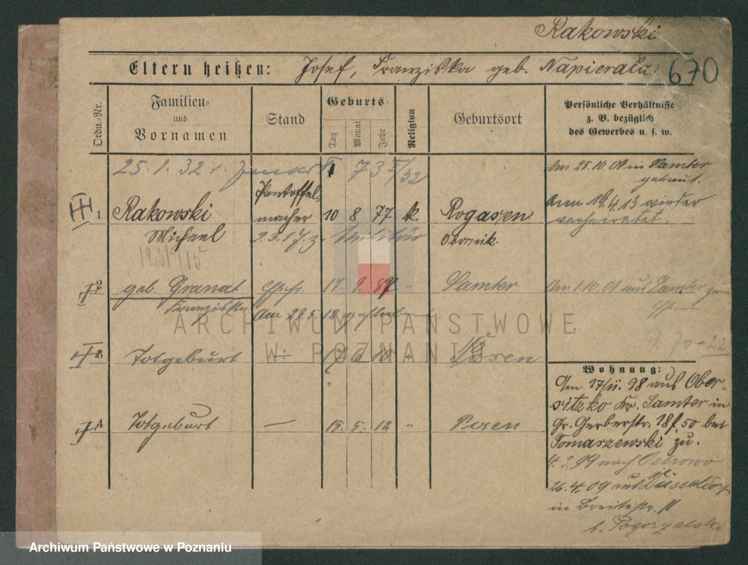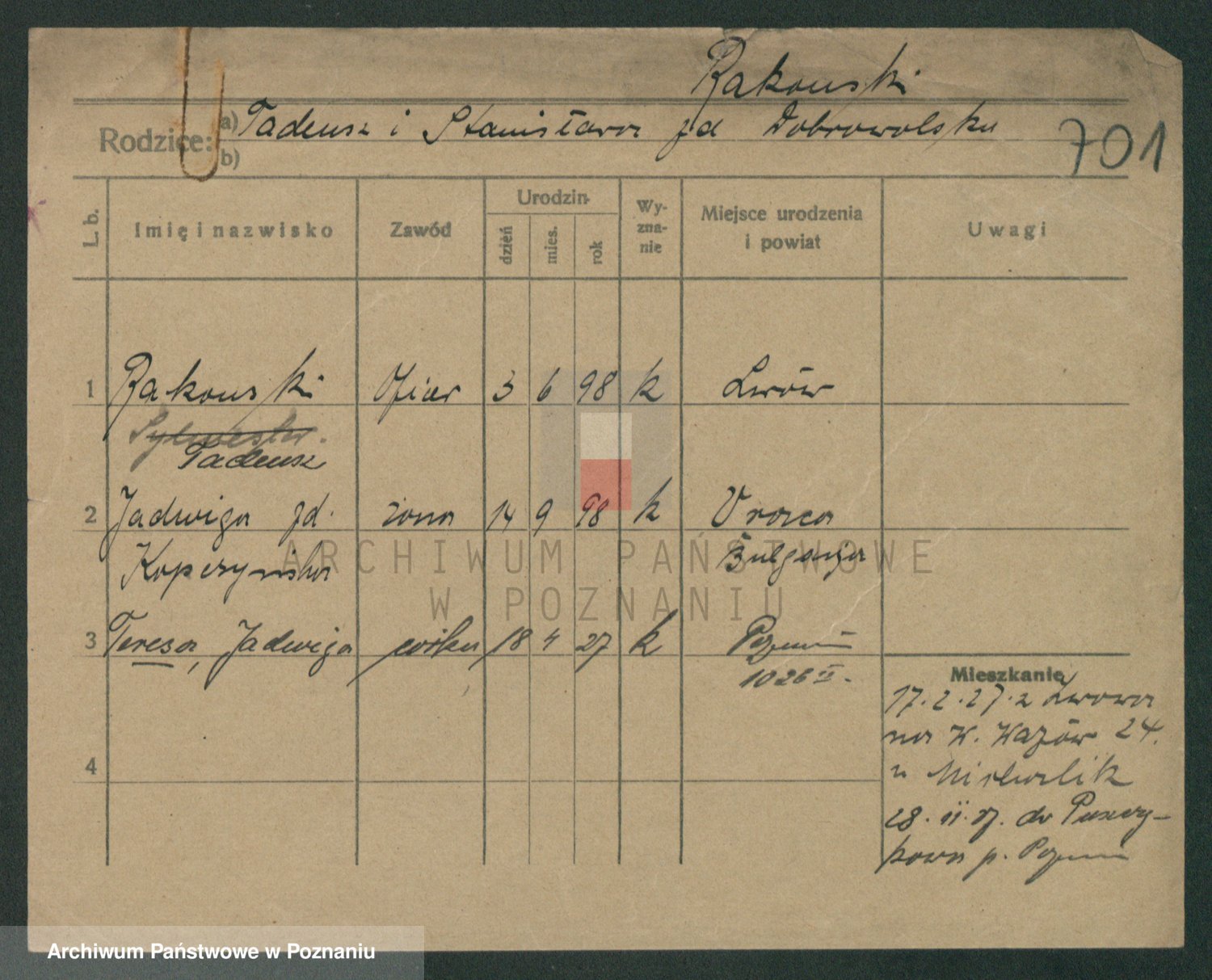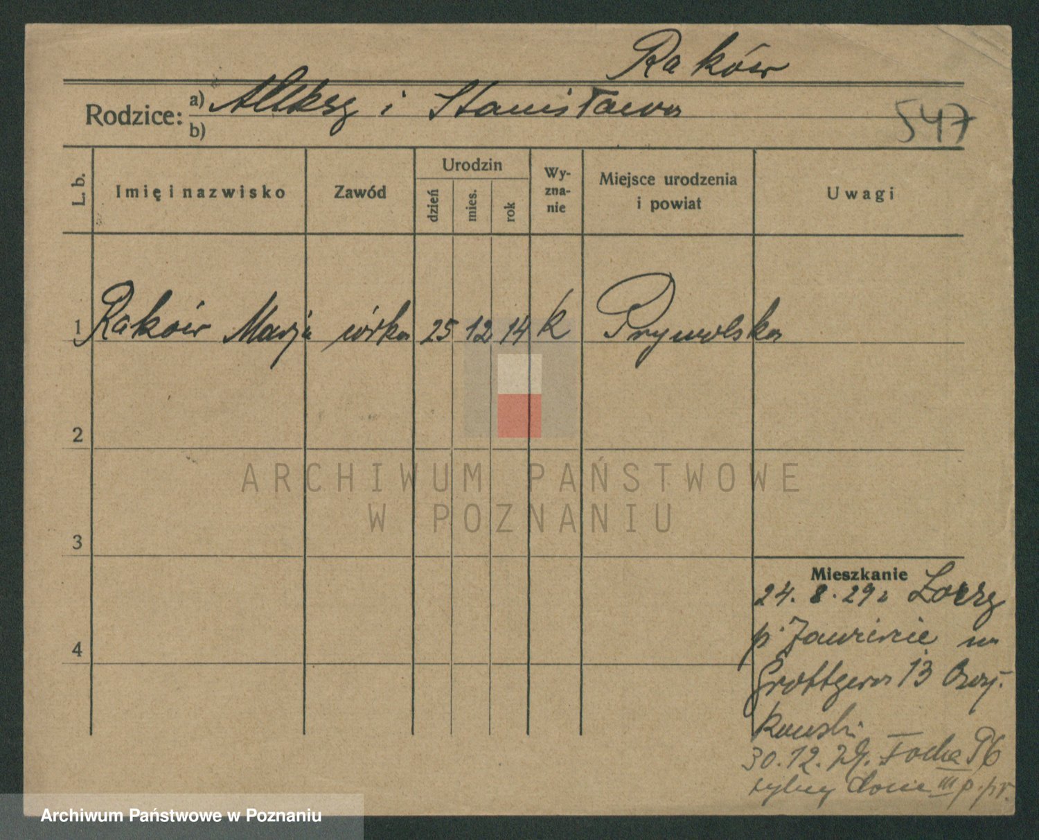 Podgląd karty osobowej dostępny jest po kliknięciu na nazwisko lub ikonkę karty. Można dokonywać powiększenia (ikony na górze) lub przechodzić między kolejnymi skanami (strzałki po bokach).