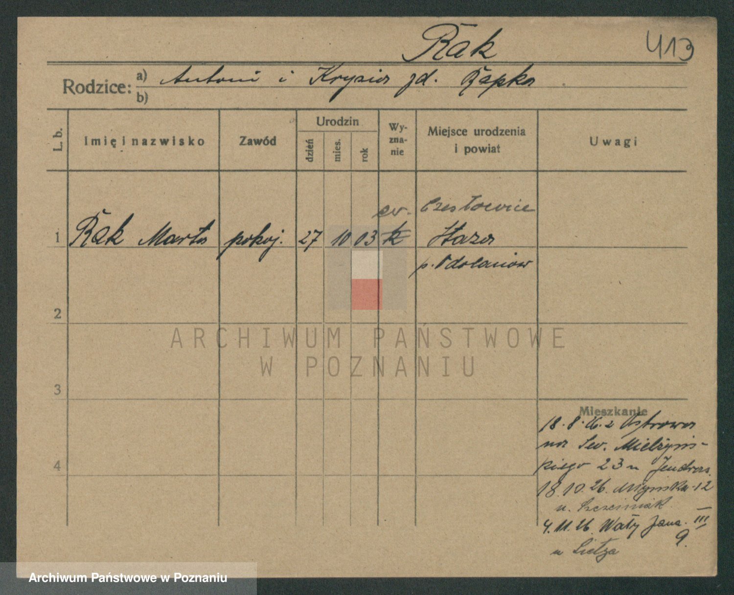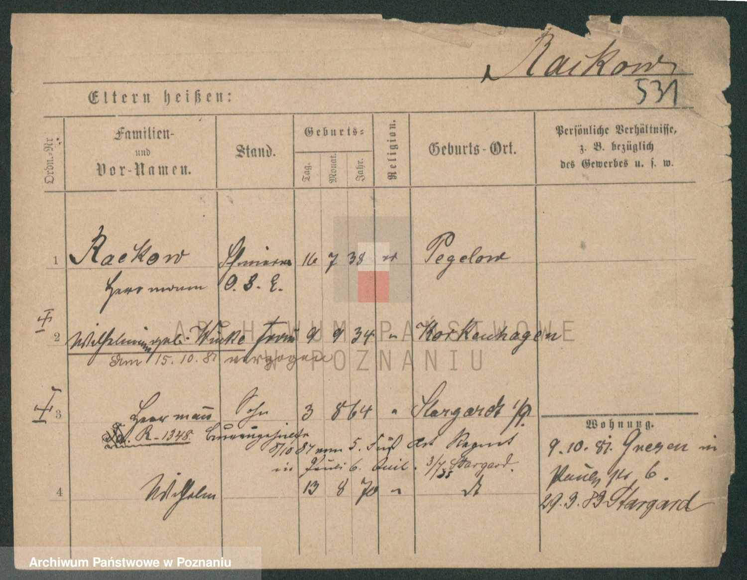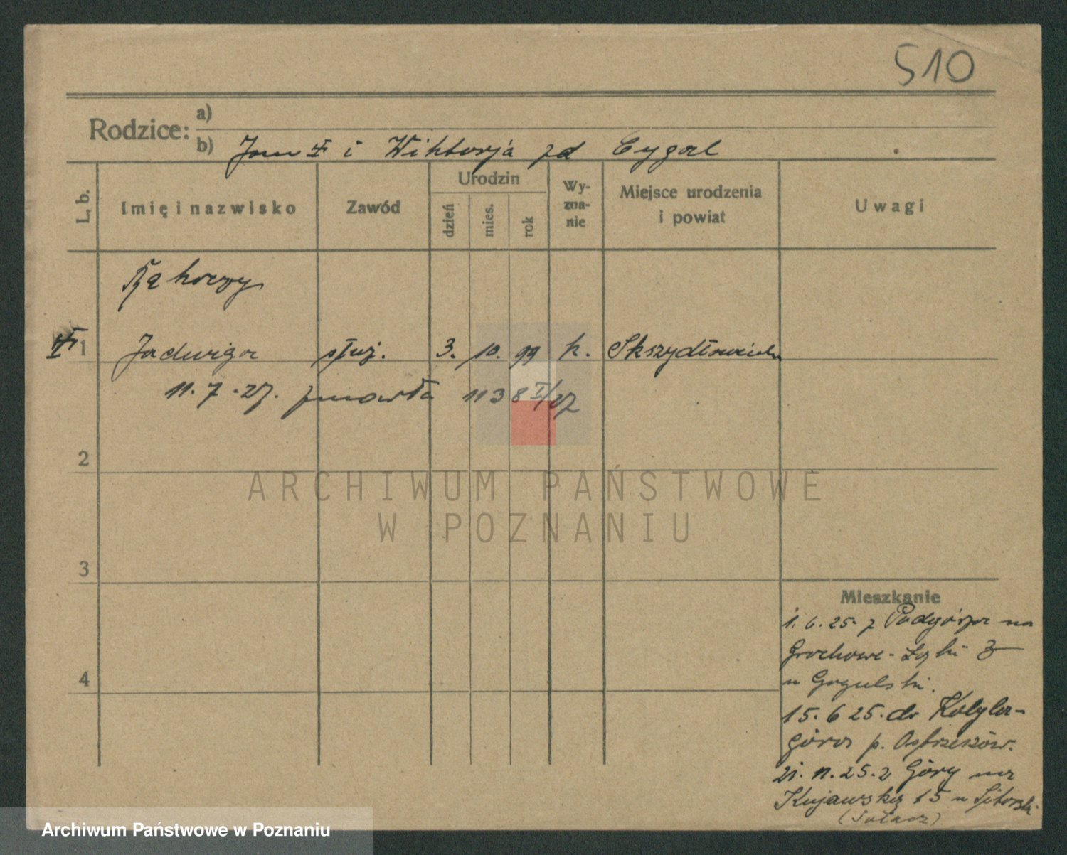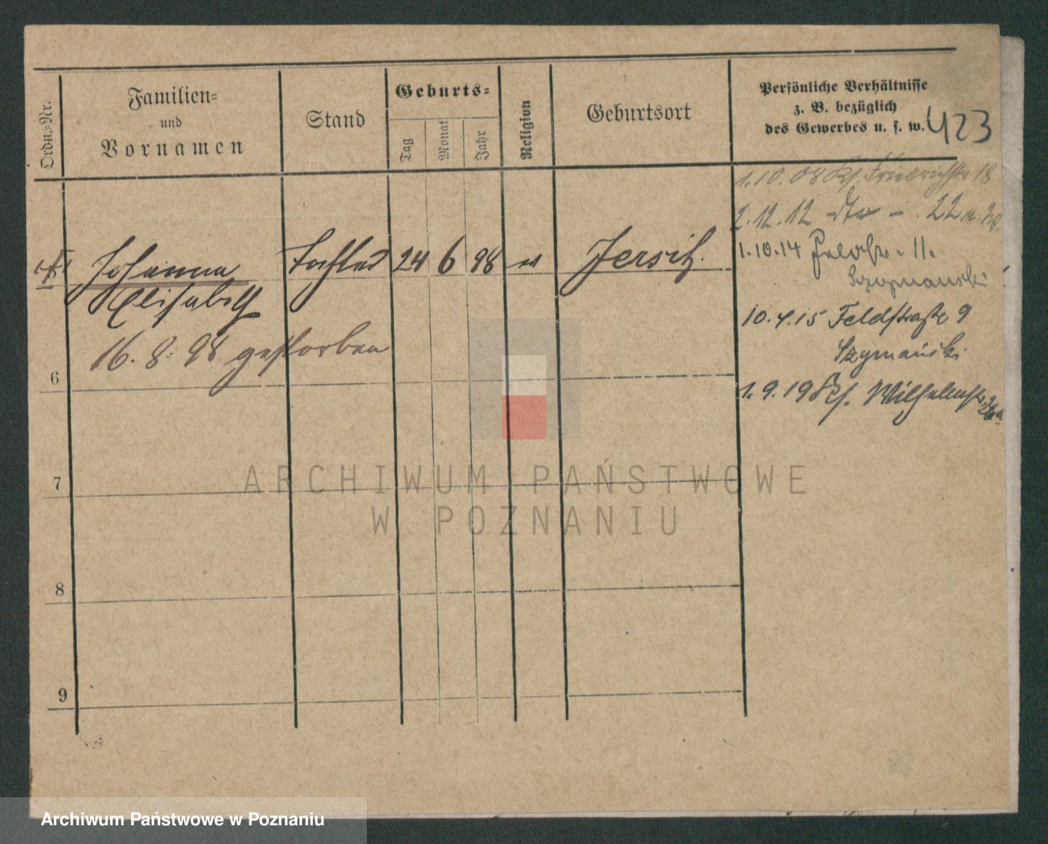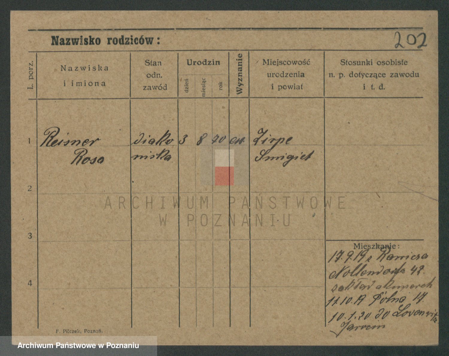 Podgląd karty osobowej dostępny jest po kliknięciu na nazwisko lub ikonkę karty. Można dokonywać powiększenia (ikony na górze) lub przechodzić między kolejnymi skanami (strzałki po bokach).