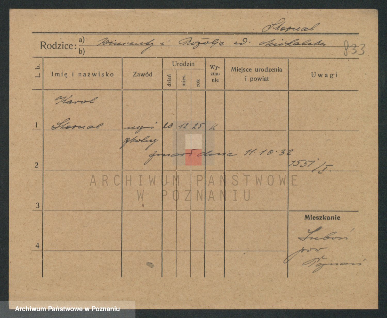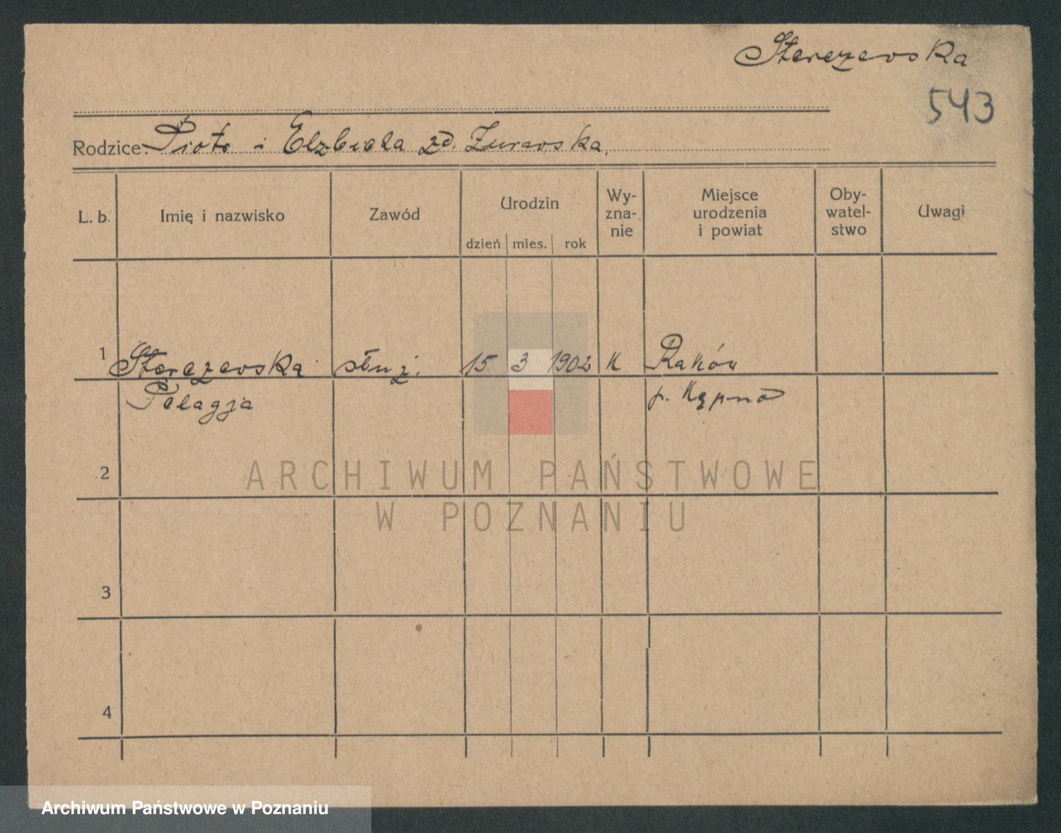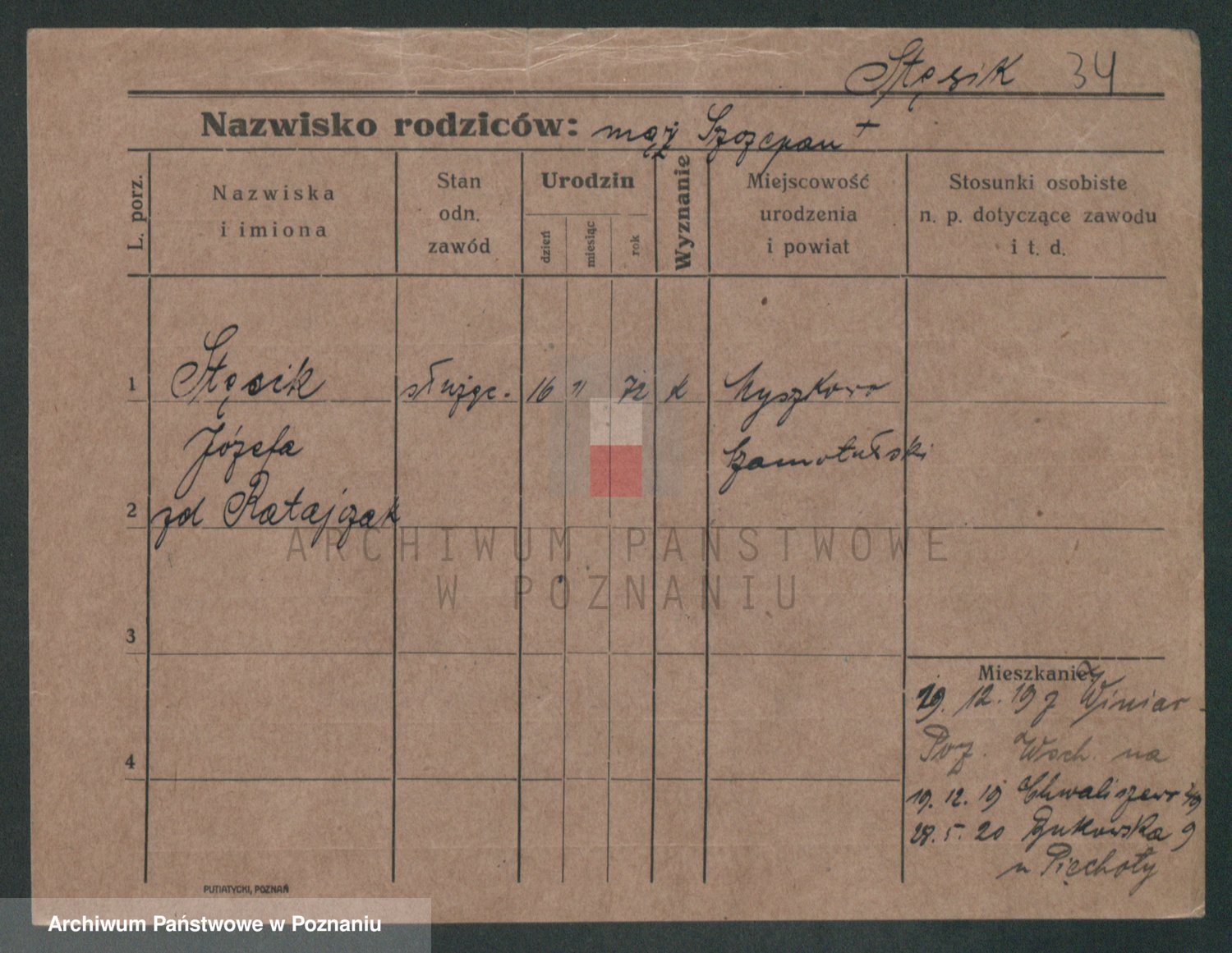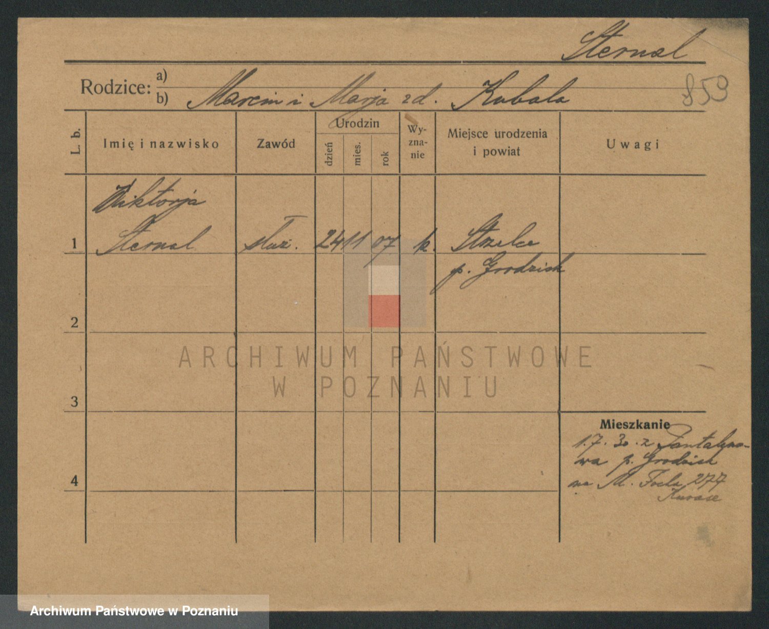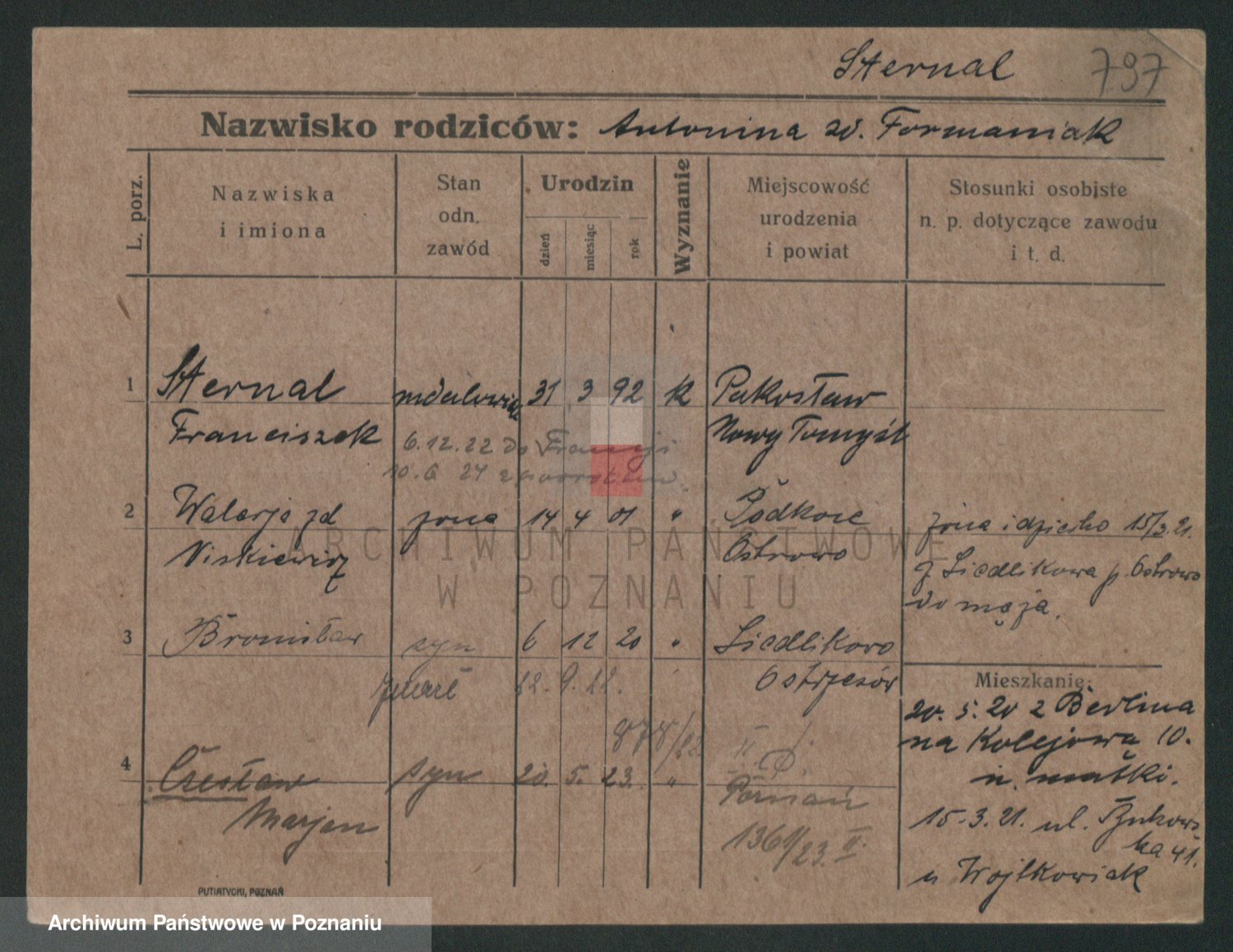 Podgląd karty osobowej dostępny jest po kliknięciu na nazwisko lub ikonkę karty. Można dokonywać powiększenia (ikony na górze) lub przechodzić między kolejnymi skanami (strzałki po bokach).