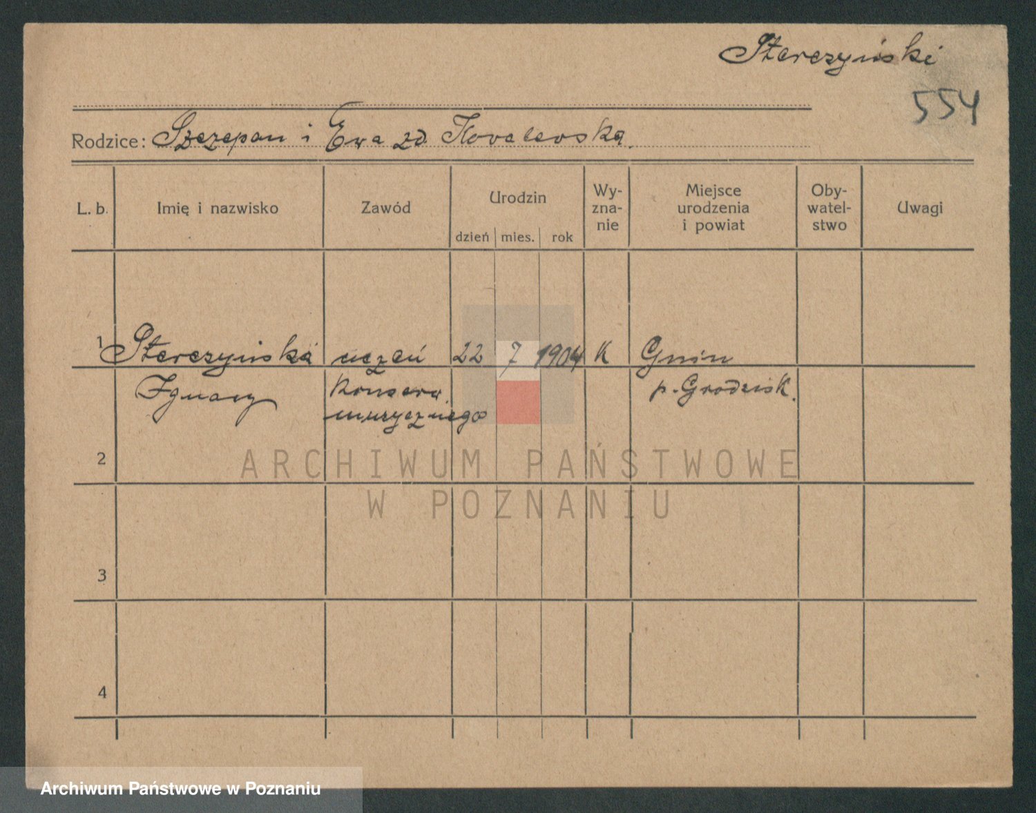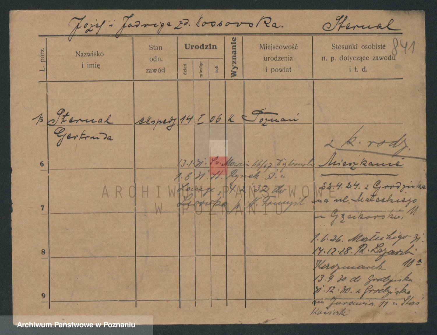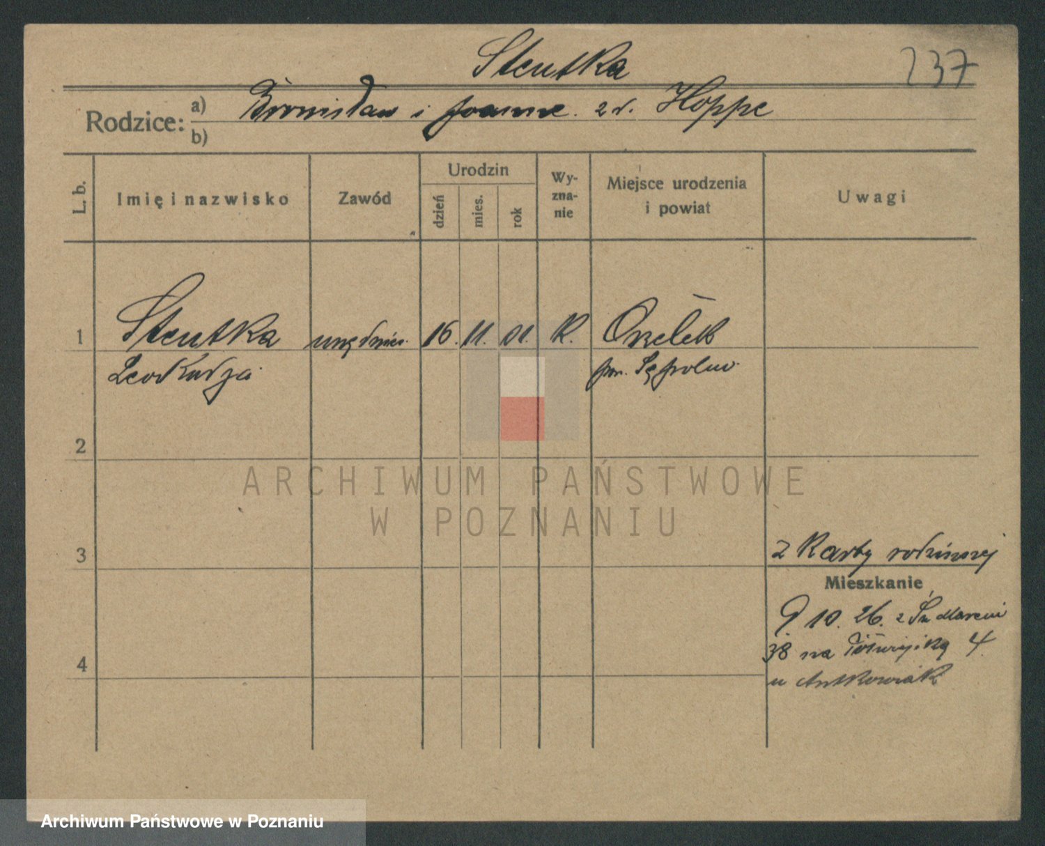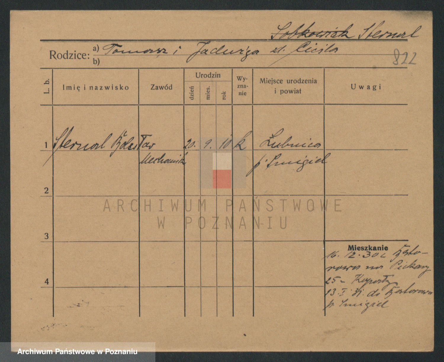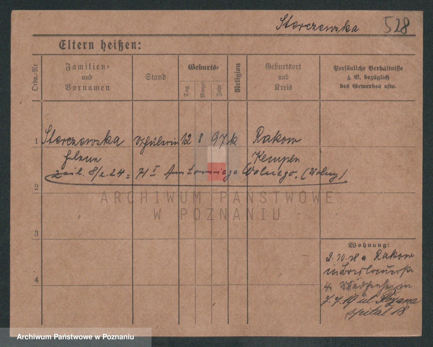 Podgląd karty osobowej dostępny jest po kliknięciu na nazwisko lub ikonkę karty. Można dokonywać powiększenia (ikony na górze) lub przechodzić między kolejnymi skanami (strzałki po bokach).