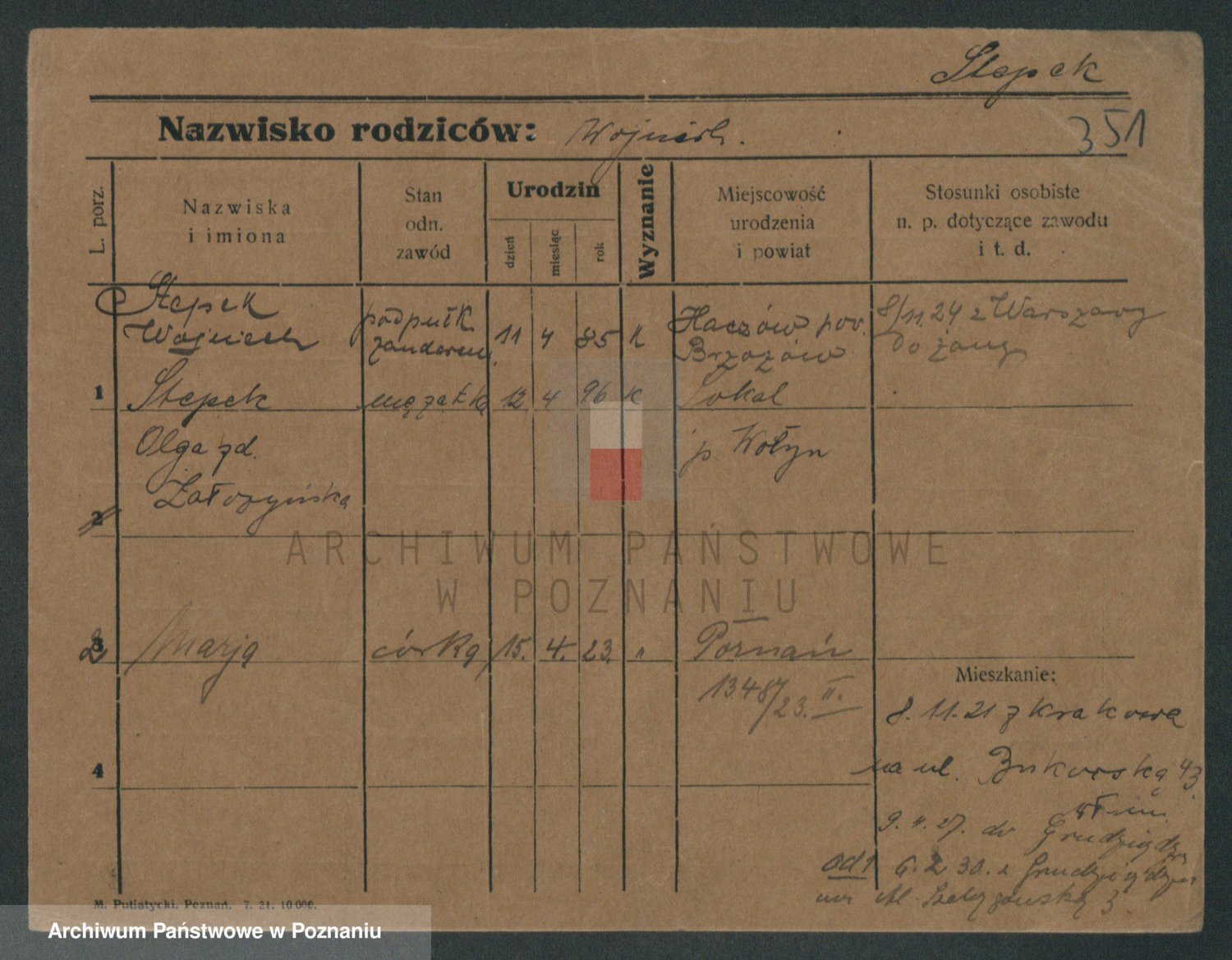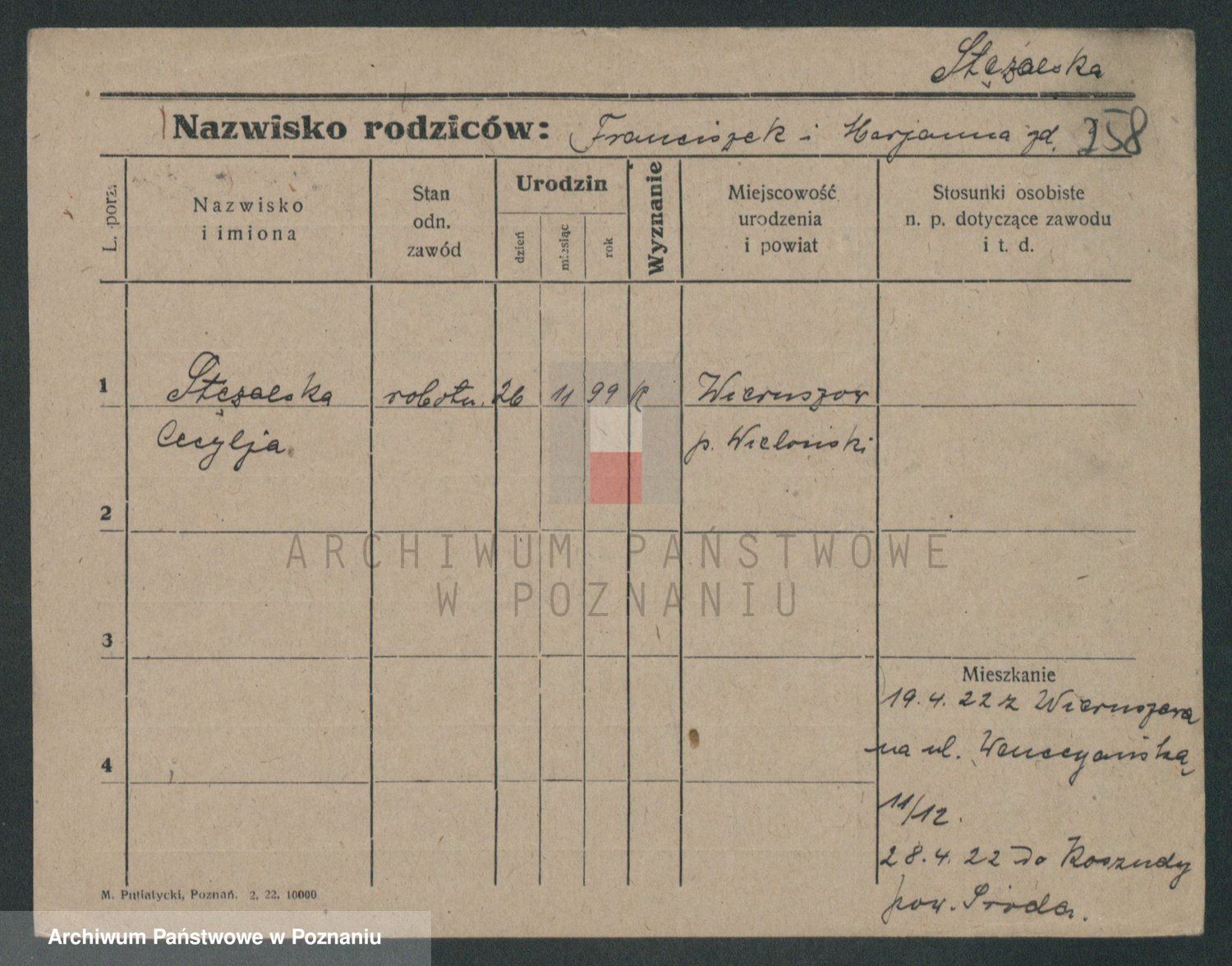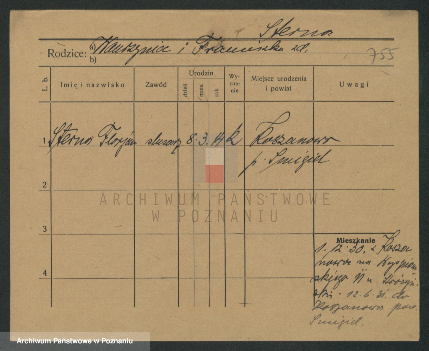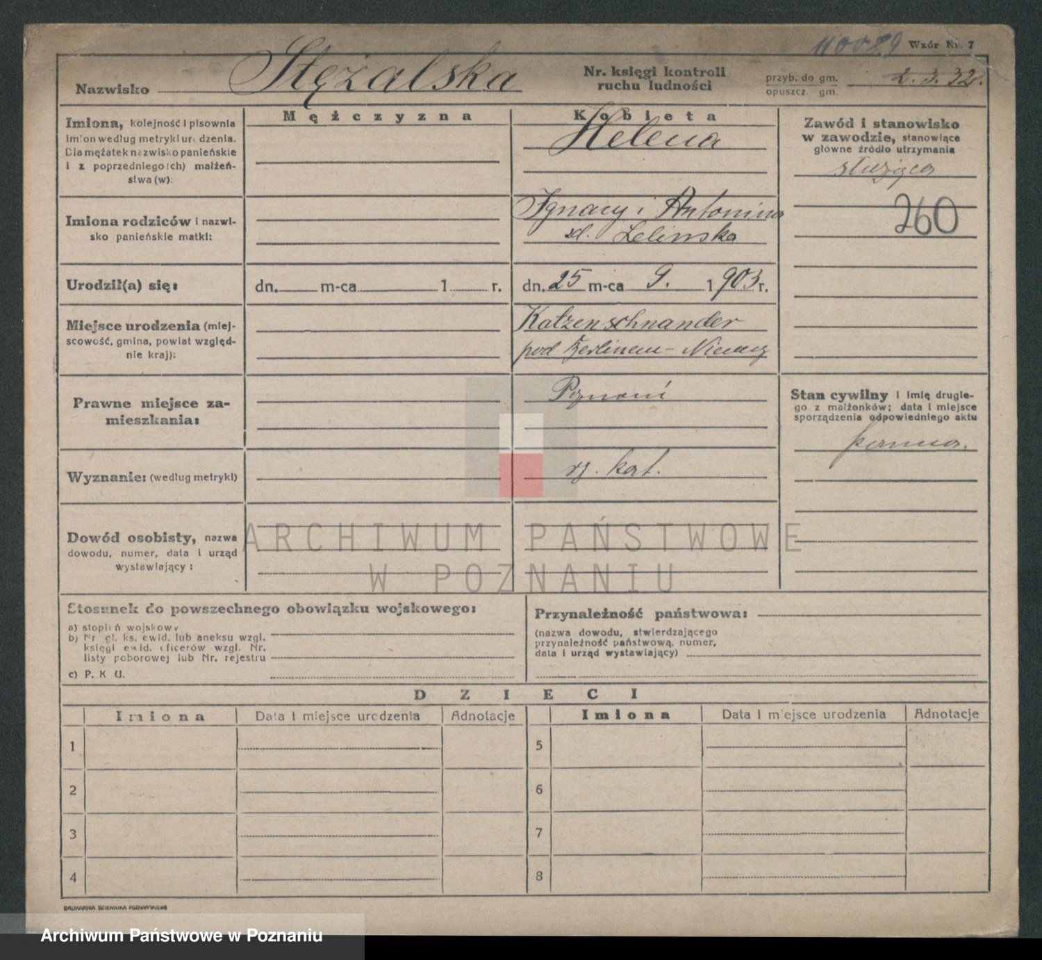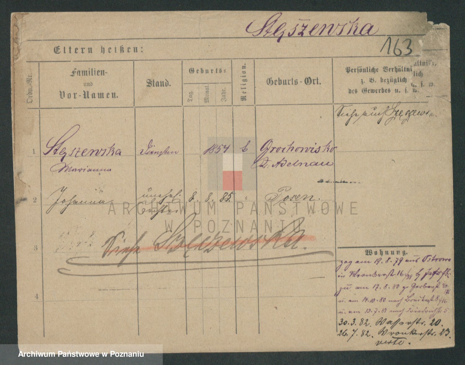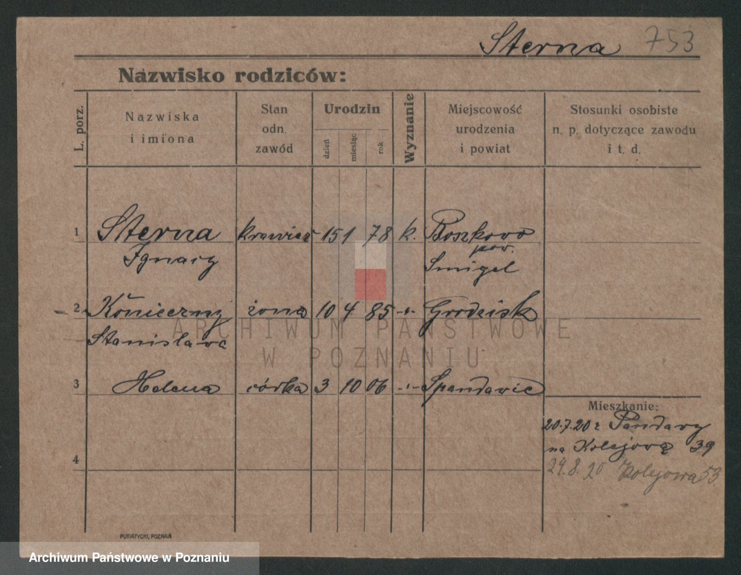 Podgląd karty osobowej dostępny jest po kliknięciu na nazwisko lub ikonkę karty. Można dokonywać powiększenia (ikony na górze) lub przechodzić między kolejnymi skanami (strzałki po bokach).