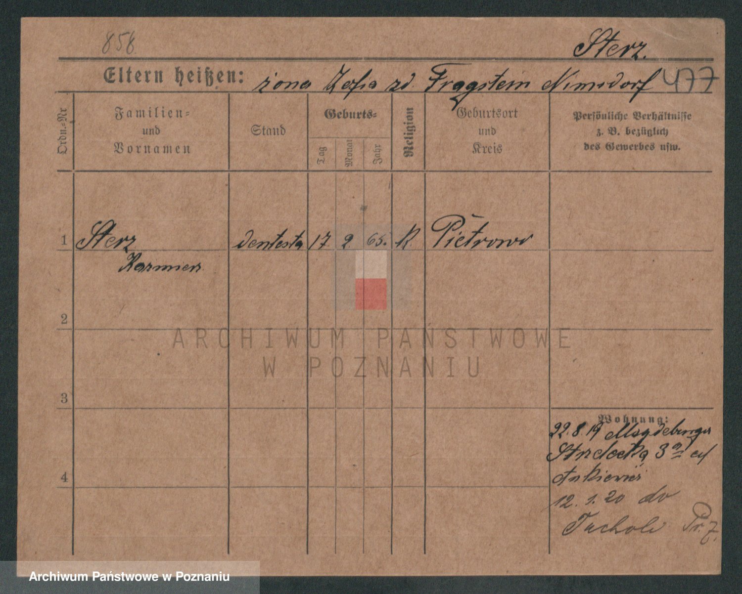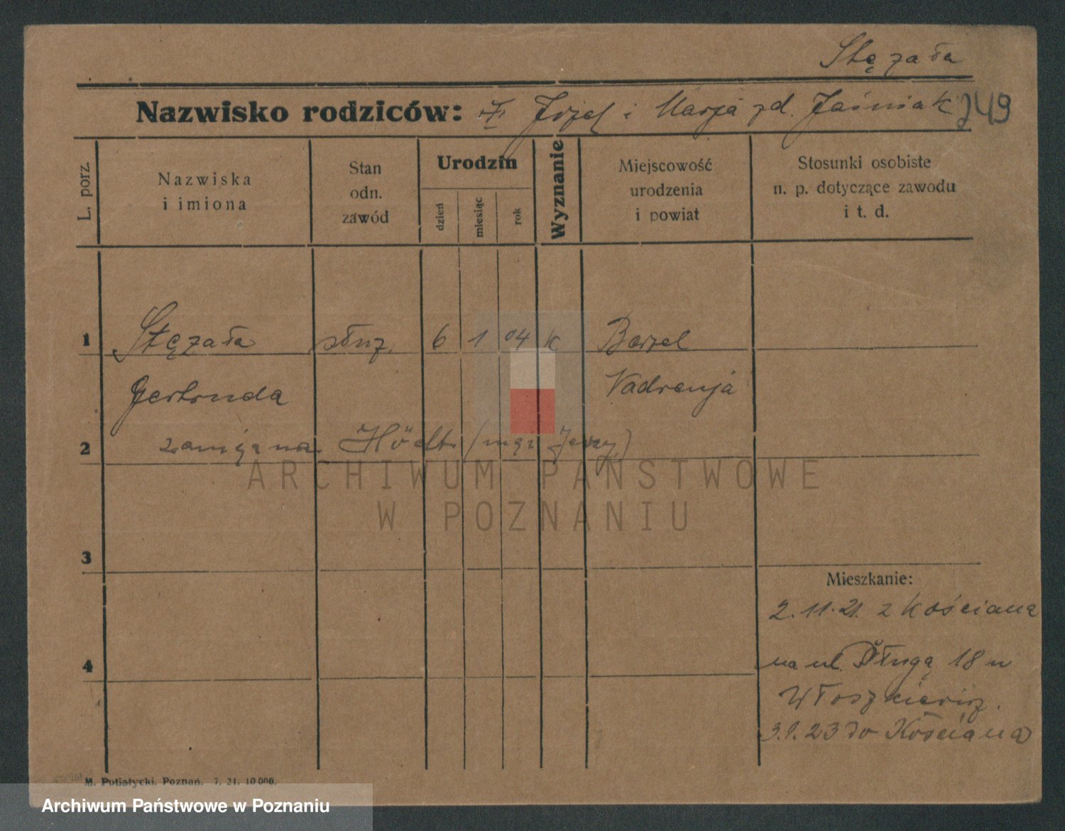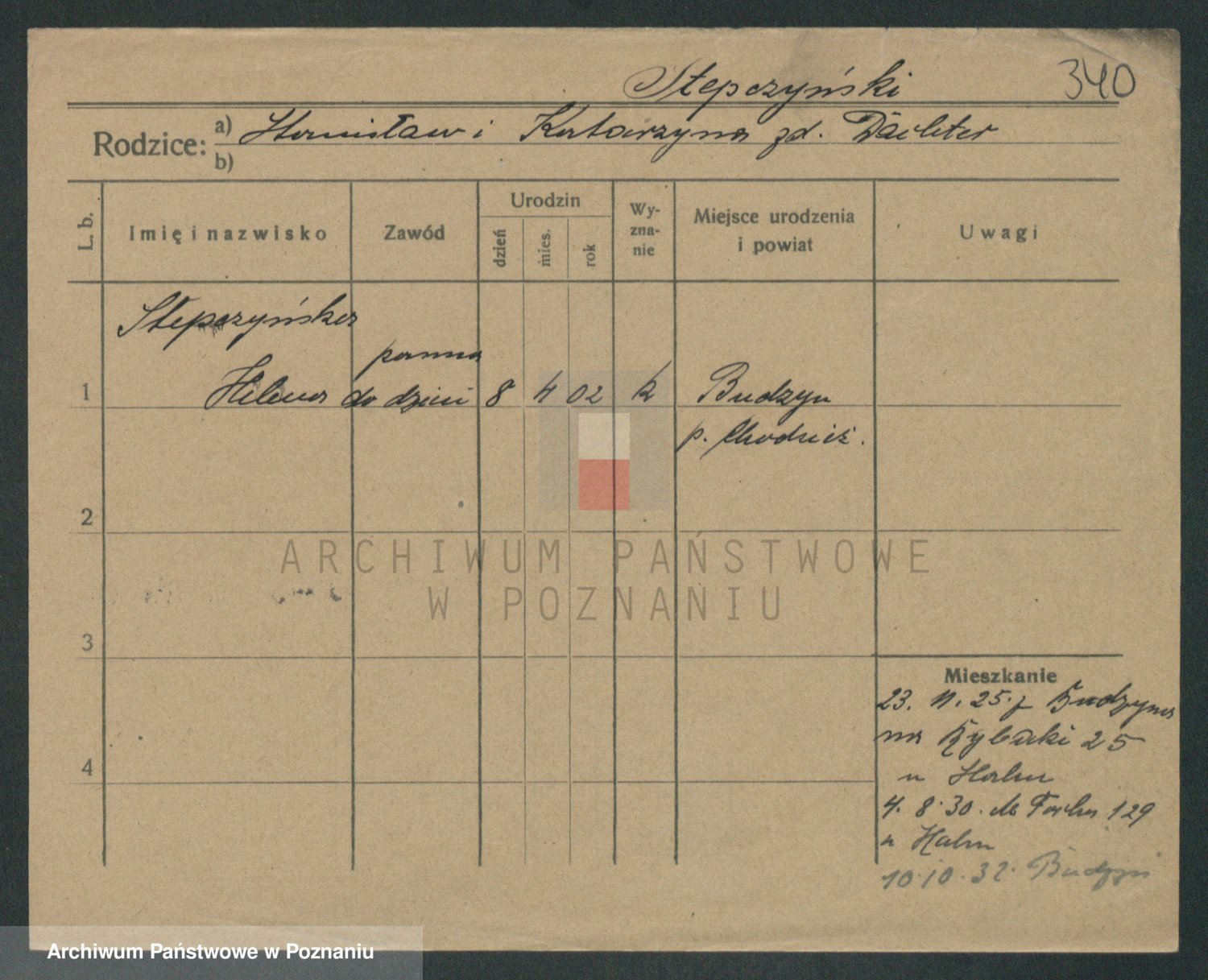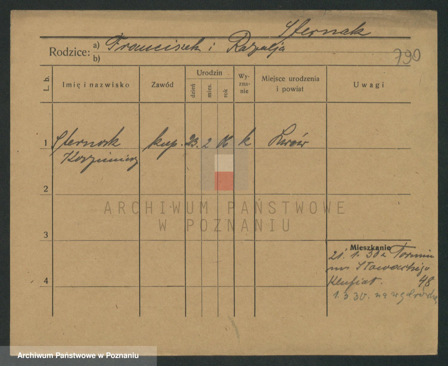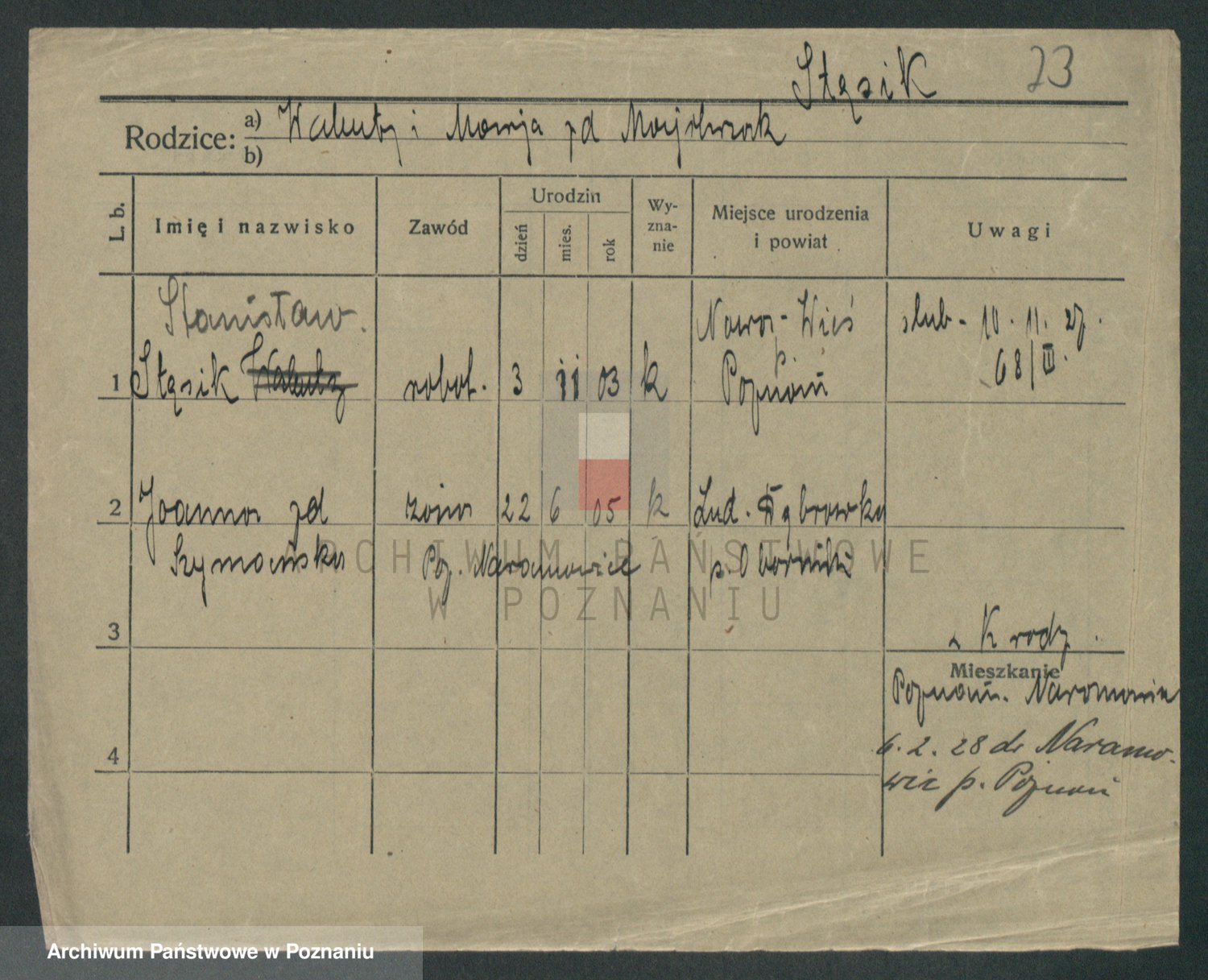 Podgląd karty osobowej dostępny jest po kliknięciu na nazwisko lub ikonkę karty. Można dokonywać powiększenia (ikony na górze) lub przechodzić między kolejnymi skanami (strzałki po bokach).