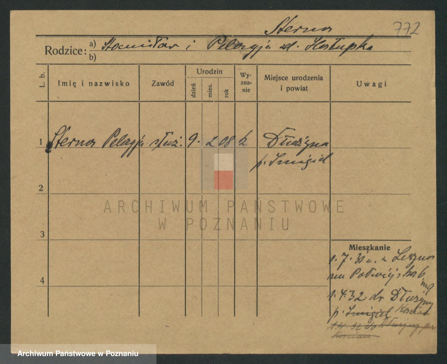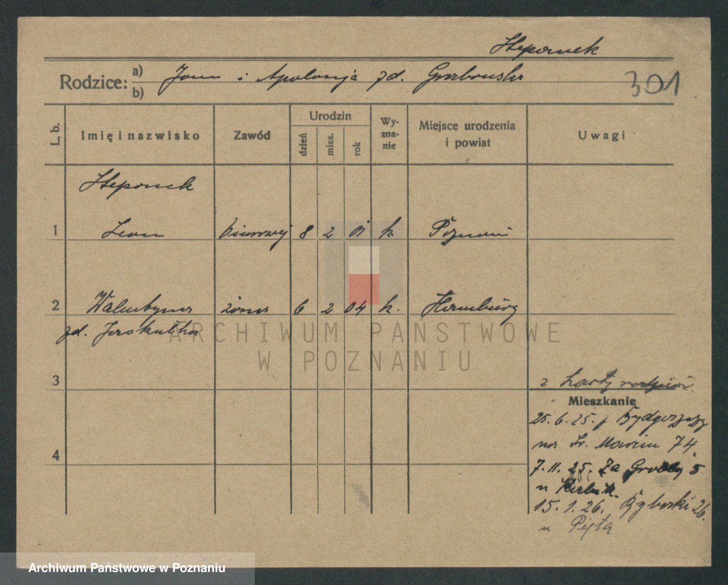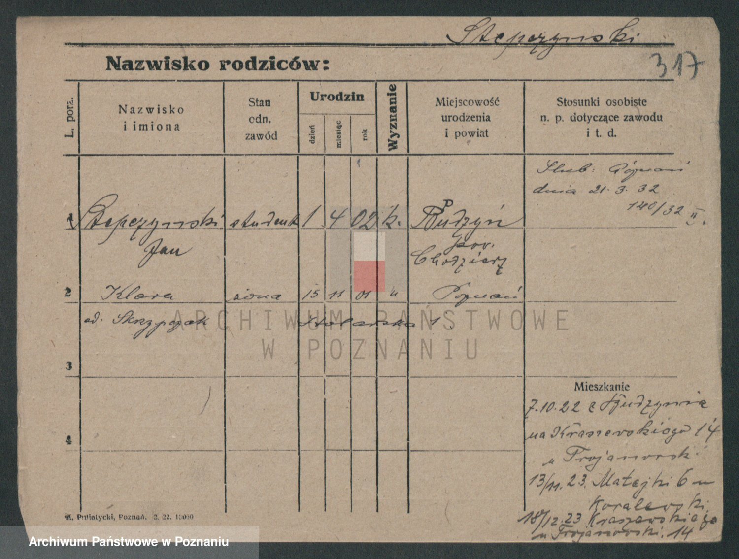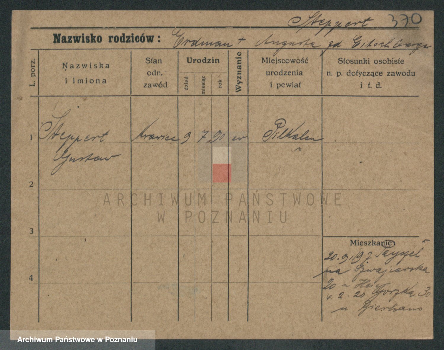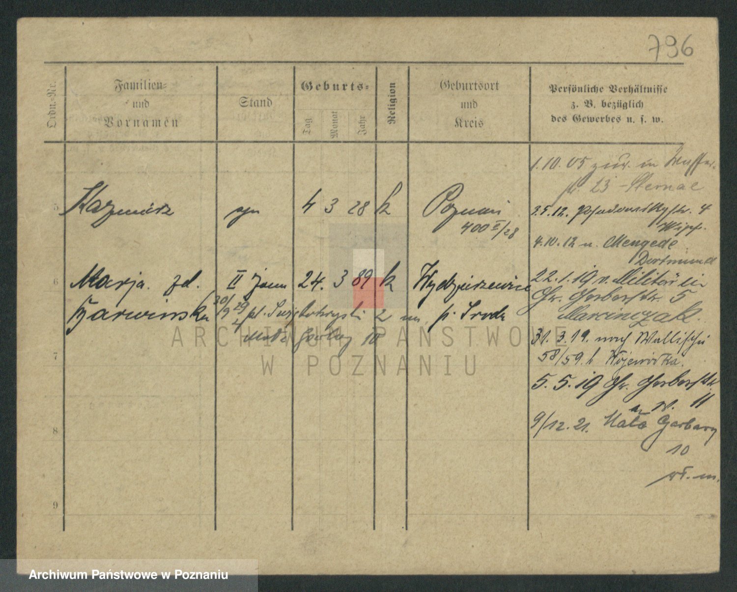 Podgląd karty osobowej dostępny jest po kliknięciu na nazwisko lub ikonkę karty. Można dokonywać powiększenia (ikony na górze) lub przechodzić między kolejnymi skanami (strzałki po bokach).