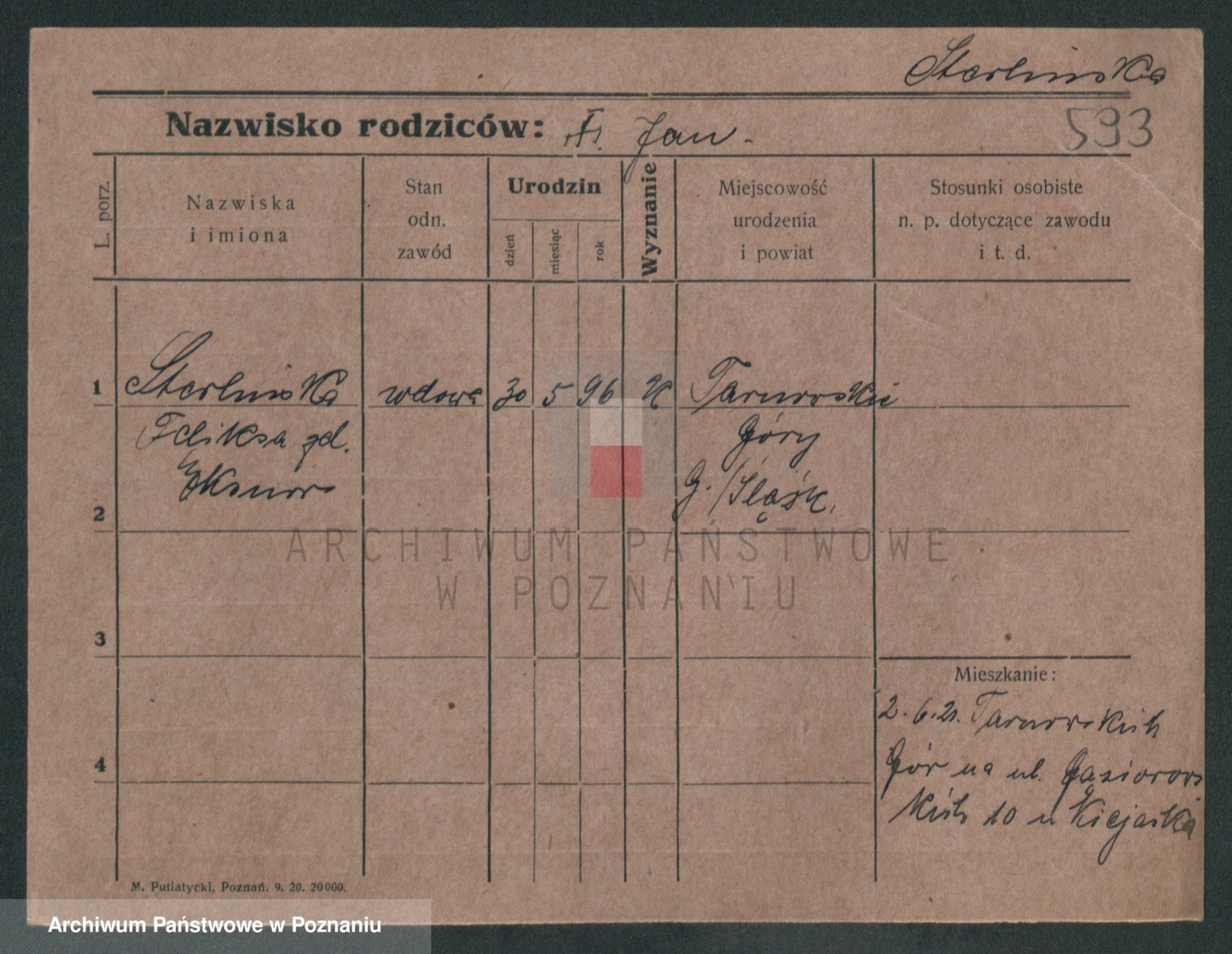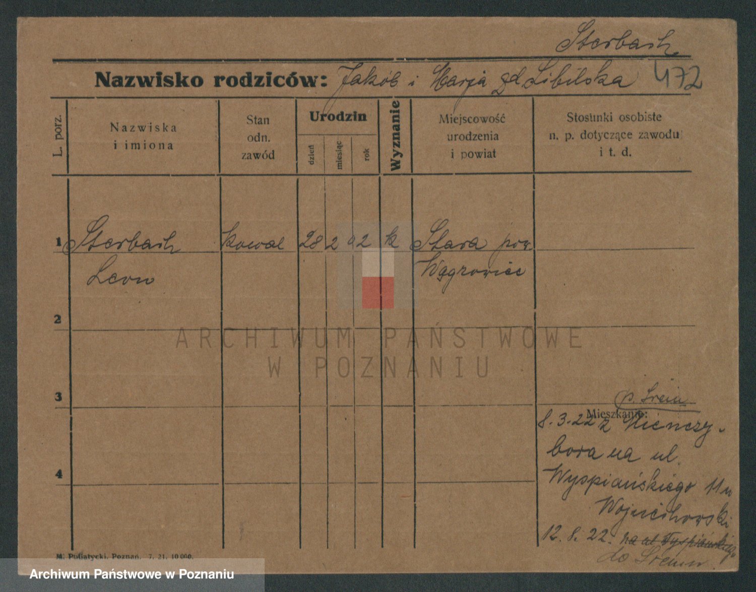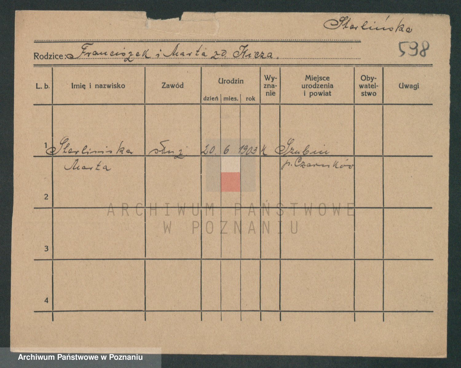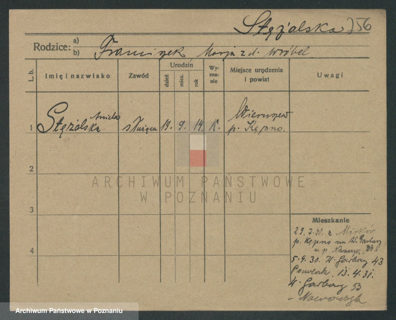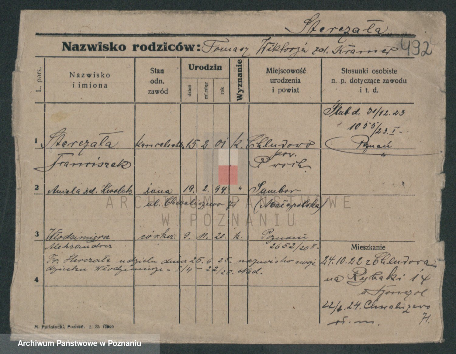 Podgląd karty osobowej dostępny jest po kliknięciu na nazwisko lub ikonkę karty. Można dokonywać powiększenia (ikony na górze) lub przechodzić między kolejnymi skanami (strzałki po bokach).