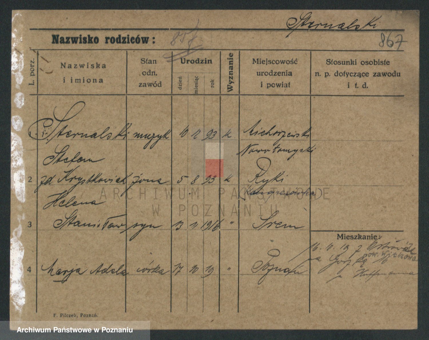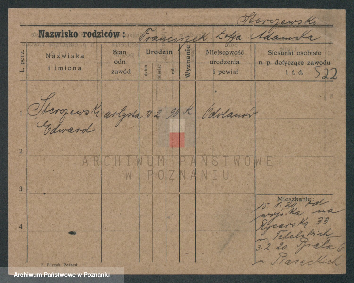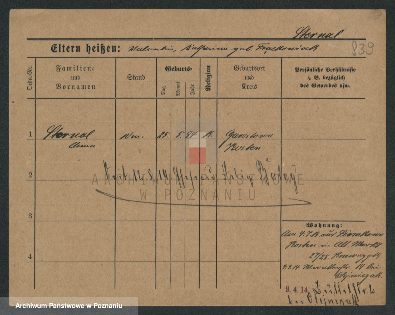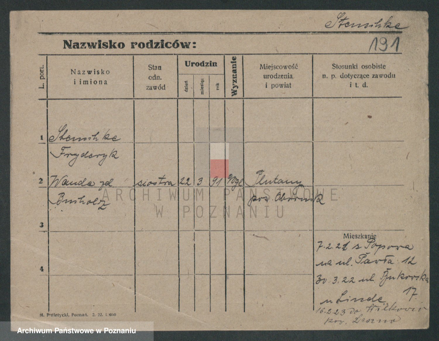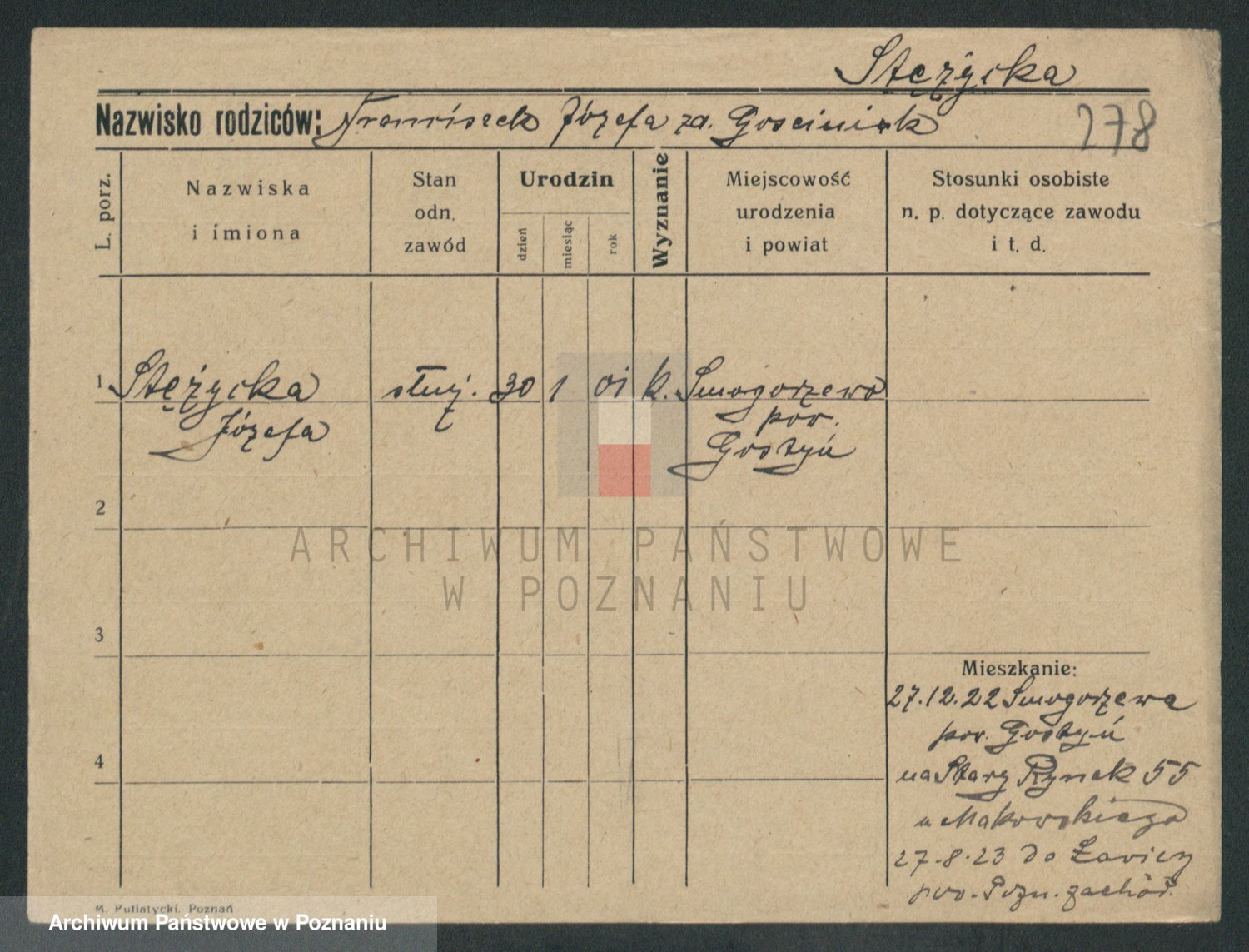 Podgląd karty osobowej dostępny jest po kliknięciu na nazwisko lub ikonkę karty. Można dokonywać powiększenia (ikony na górze) lub przechodzić między kolejnymi skanami (strzałki po bokach).