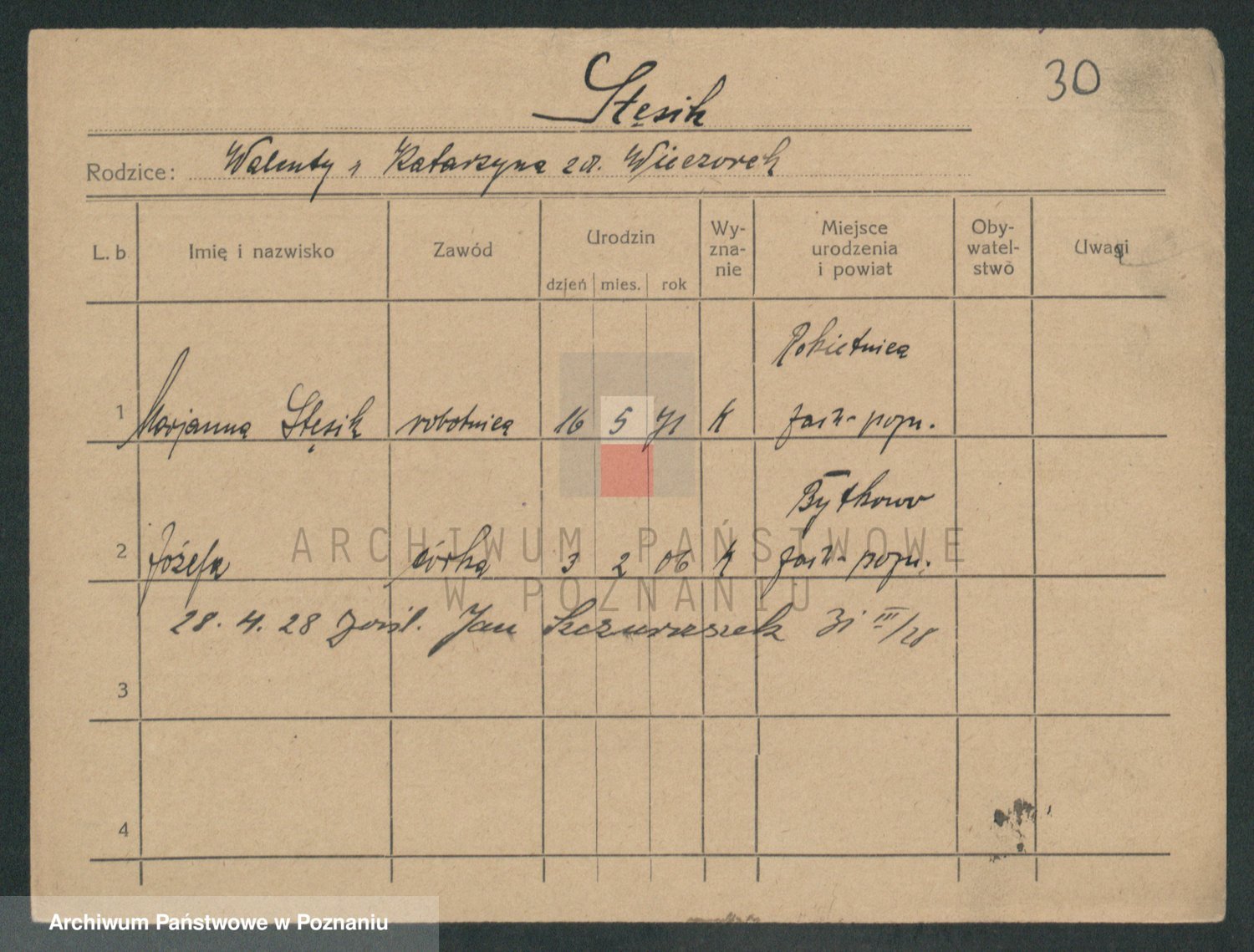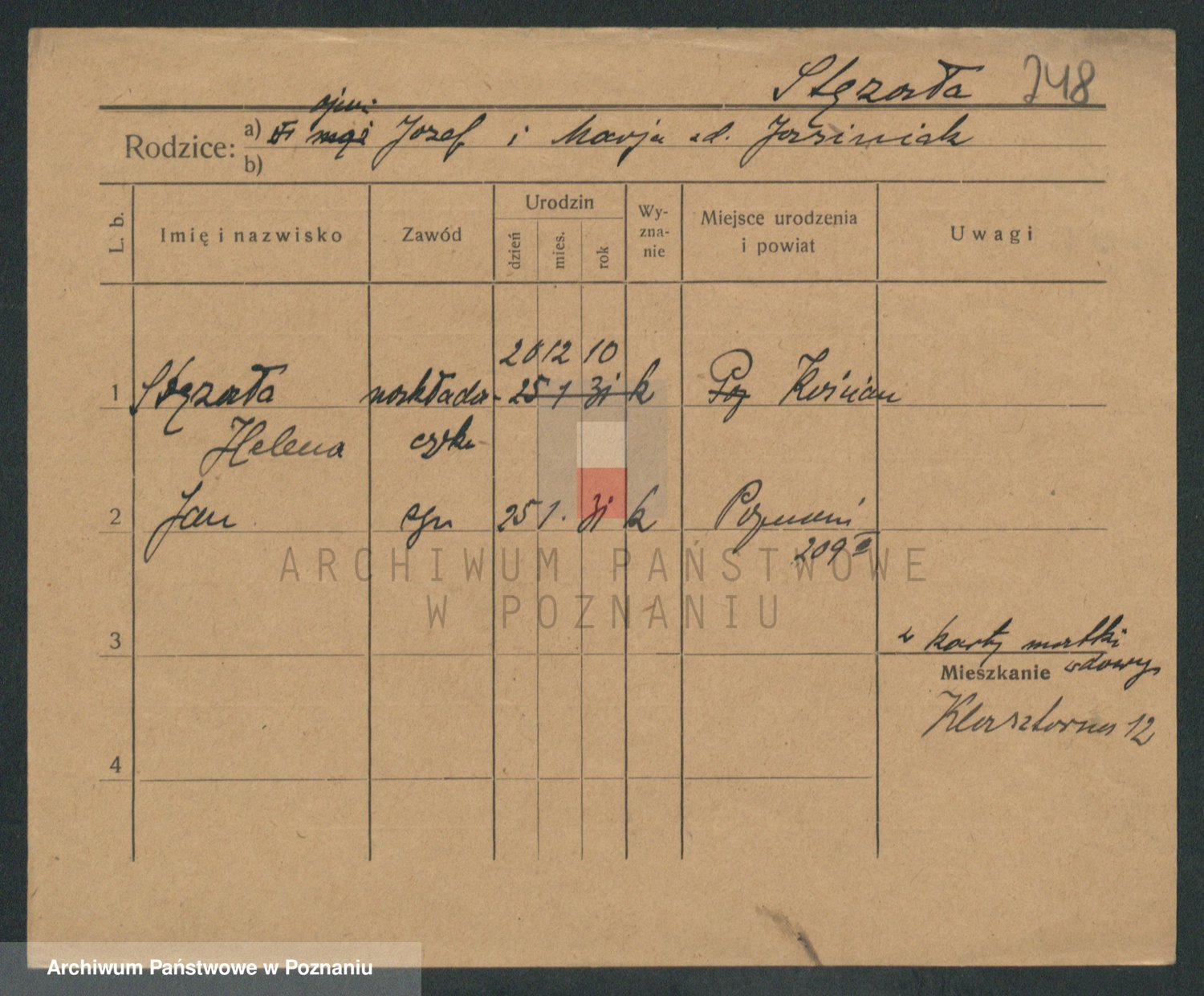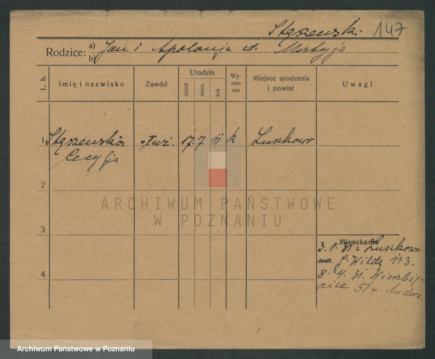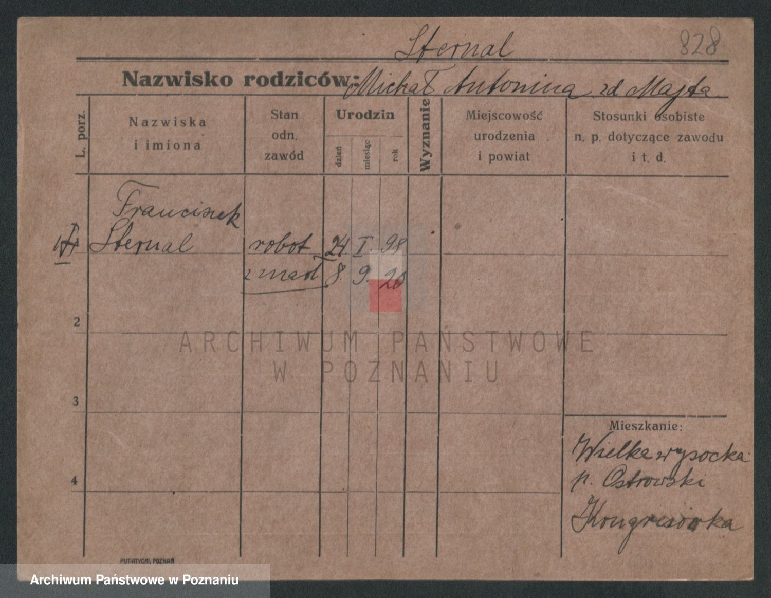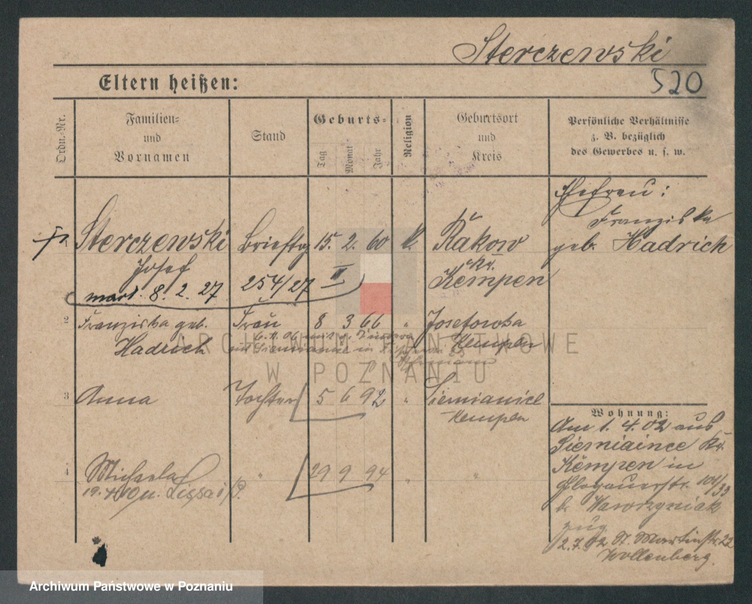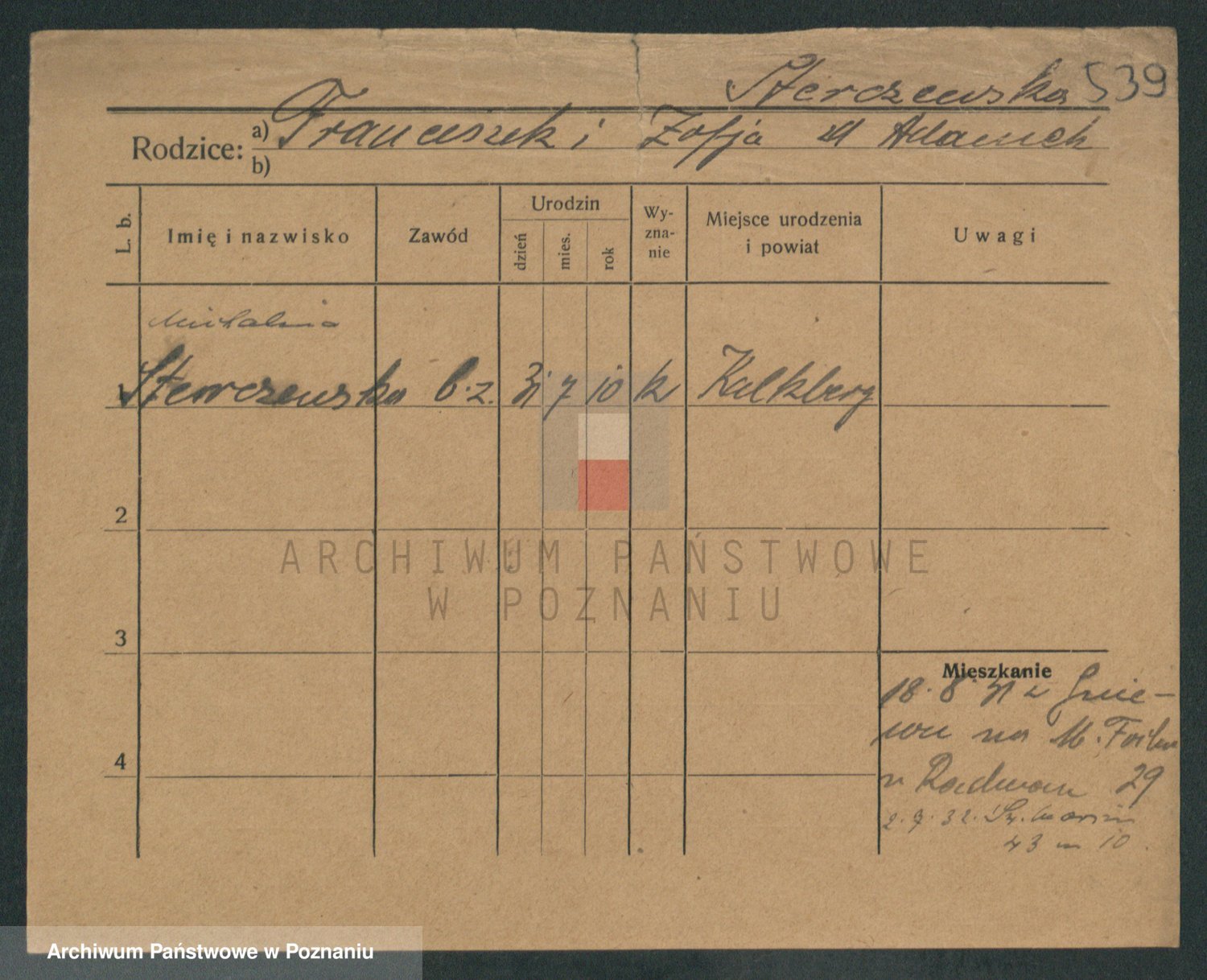 Podgląd karty osobowej dostępny jest po kliknięciu na nazwisko lub ikonkę karty. Można dokonywać powiększenia (ikony na górze) lub przechodzić między kolejnymi skanami (strzałki po bokach).