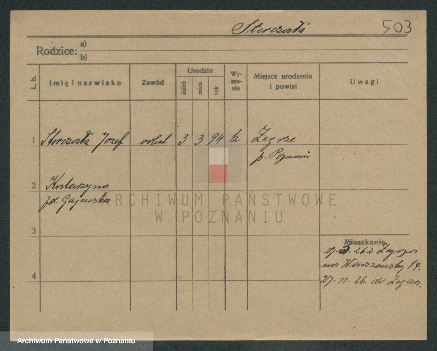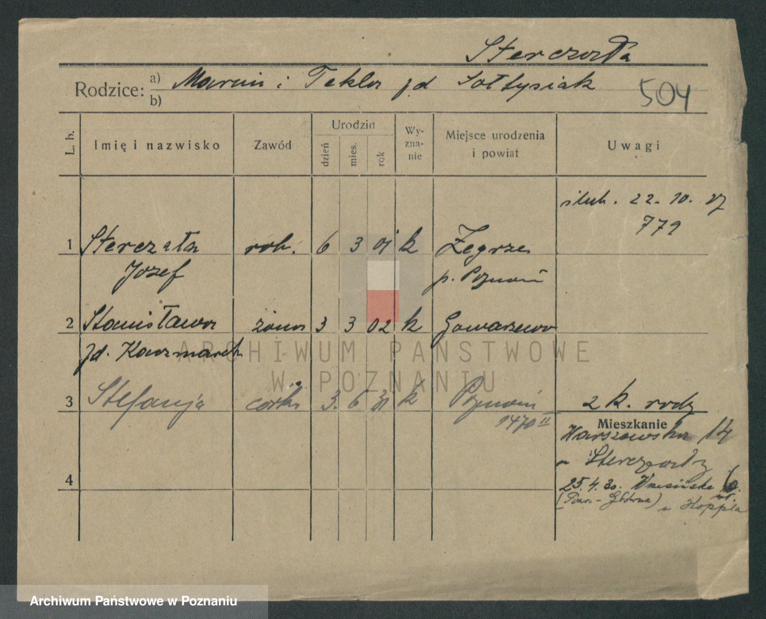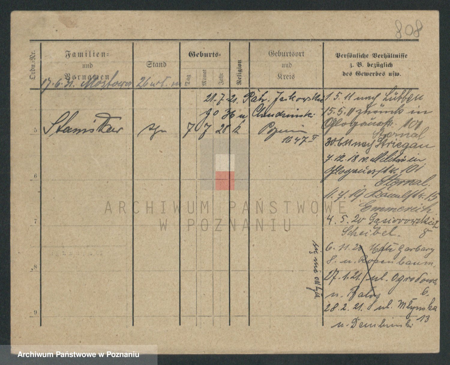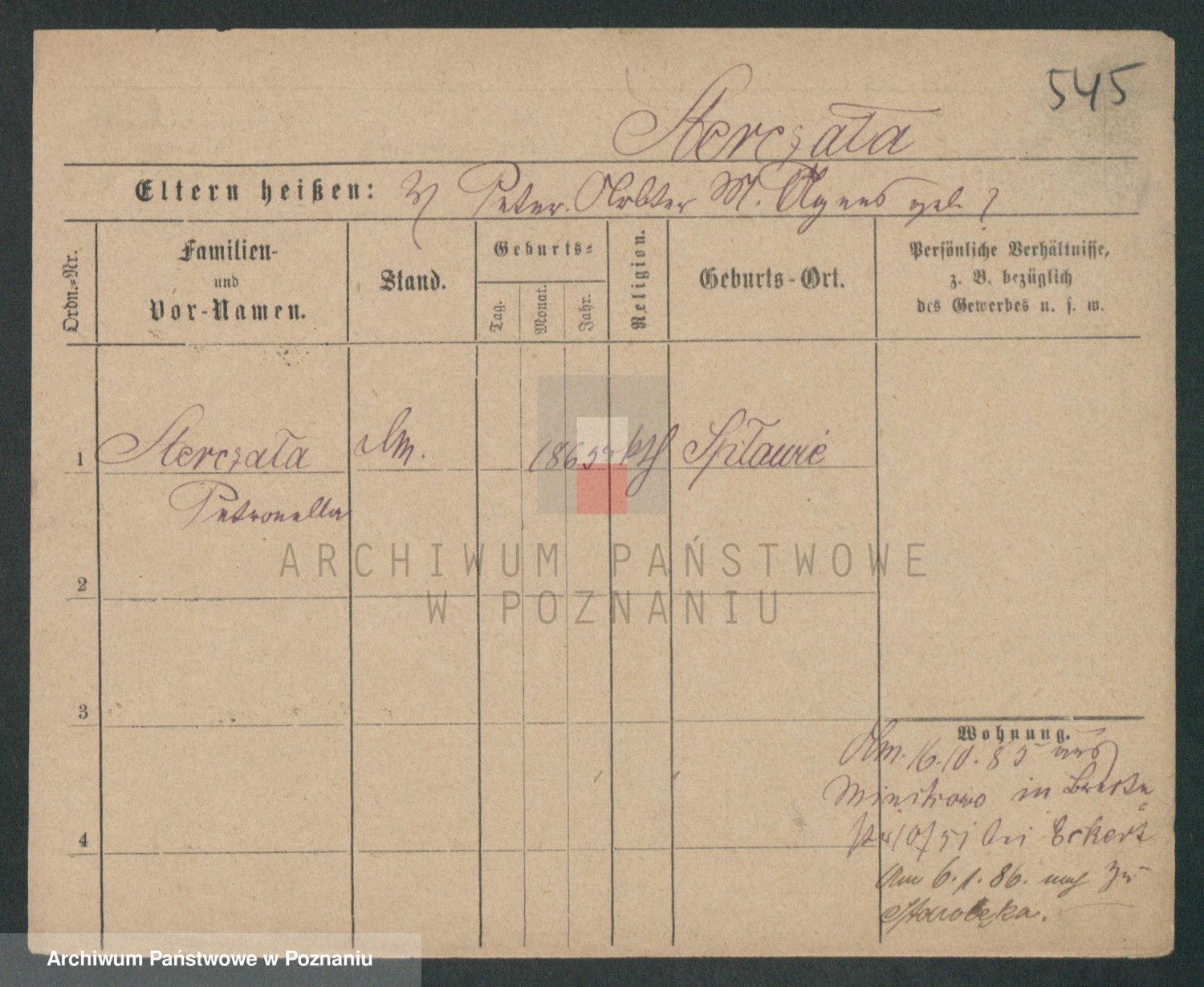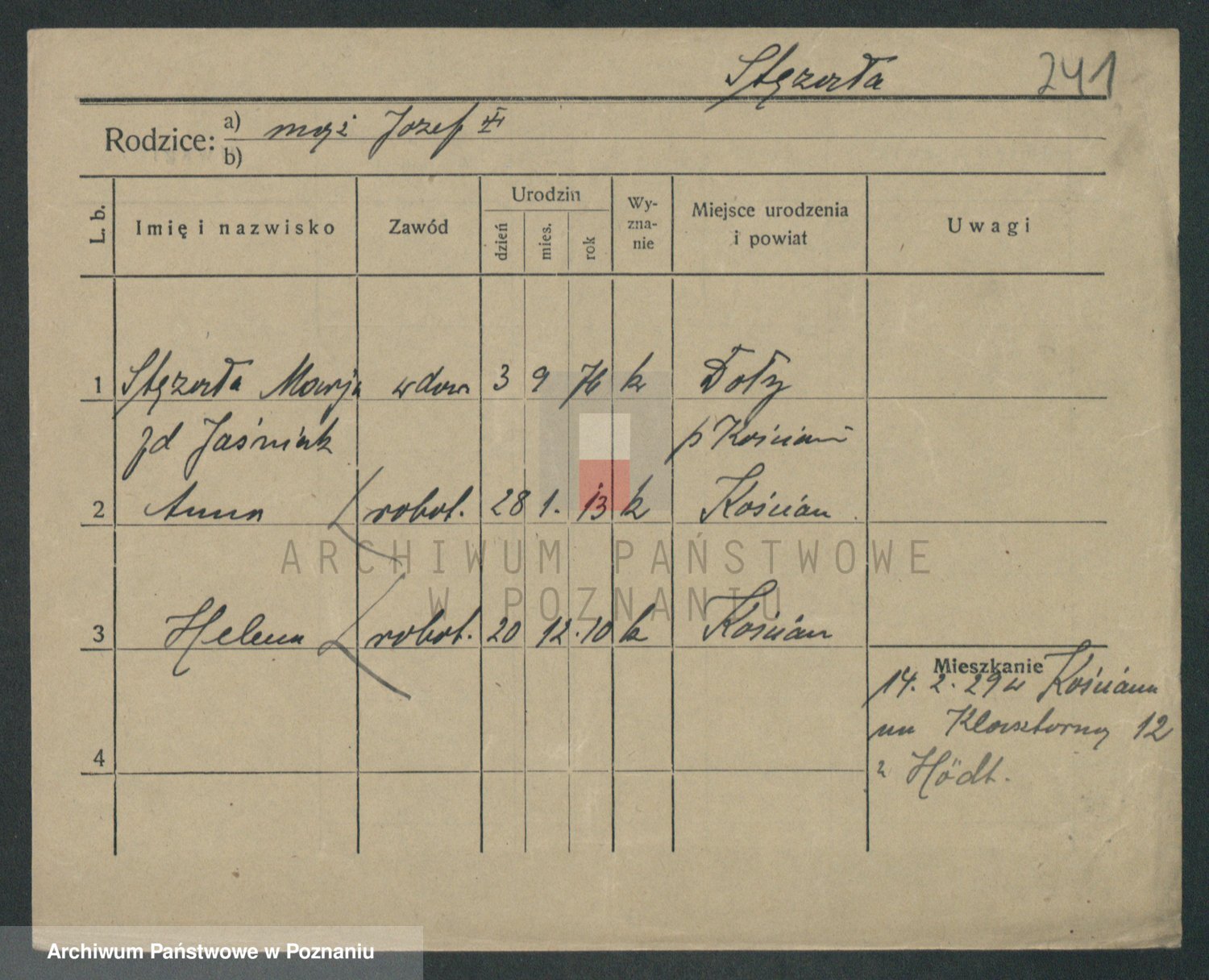 Podgląd karty osobowej dostępny jest po kliknięciu na nazwisko lub ikonkę karty. Można dokonywać powiększenia (ikony na górze) lub przechodzić między kolejnymi skanami (strzałki po bokach).