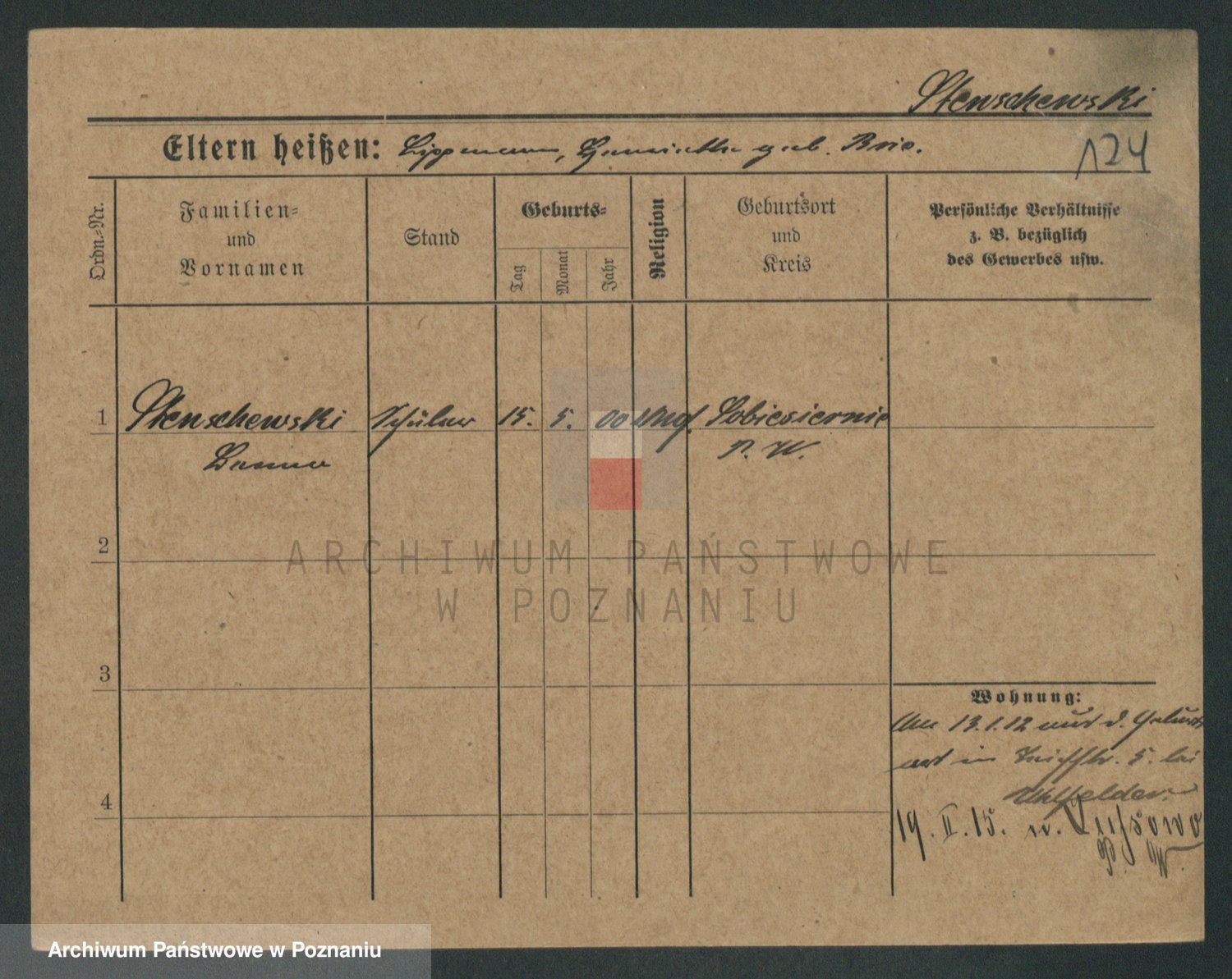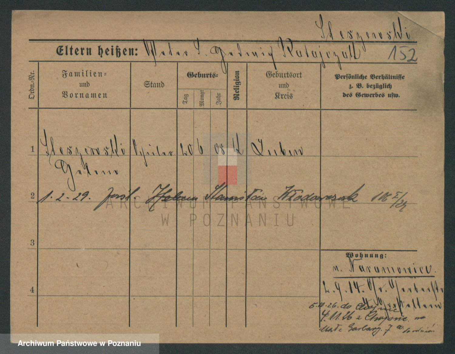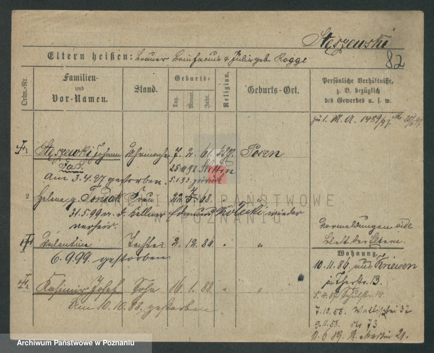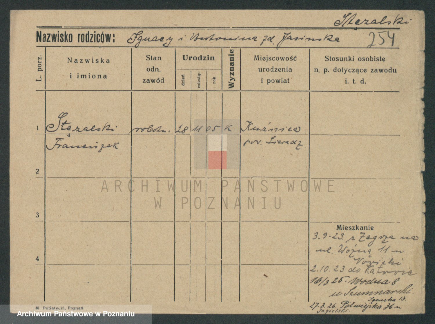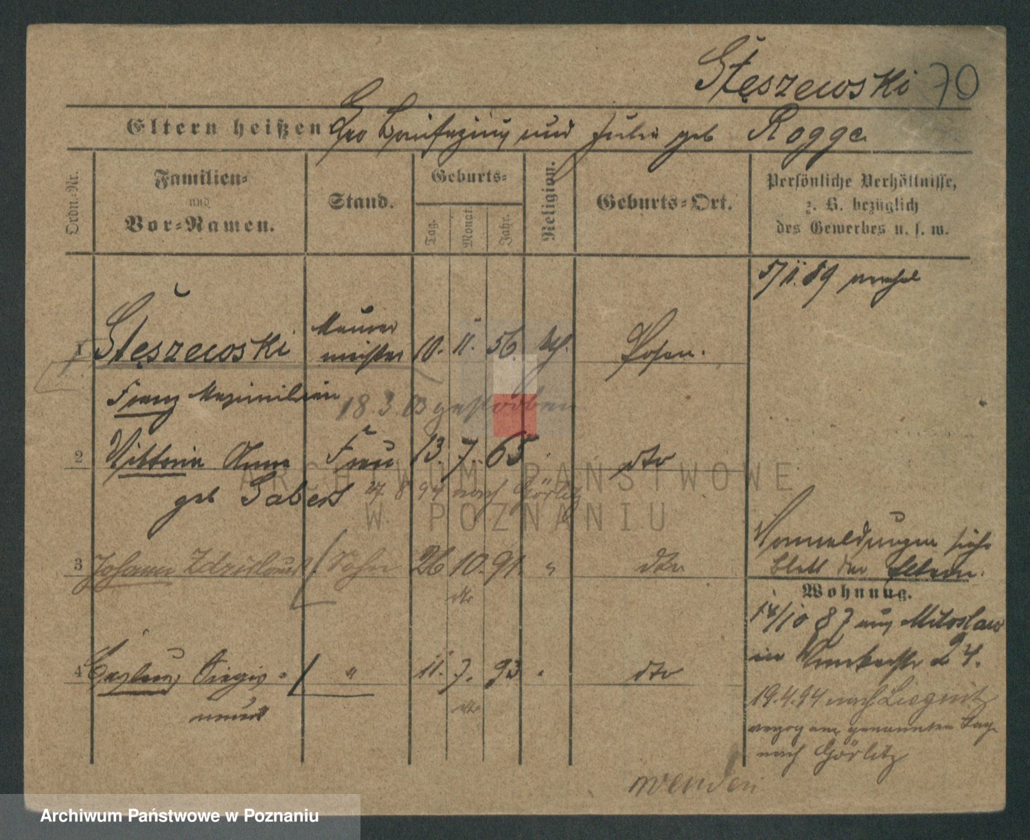 Podgląd karty osobowej dostępny jest po kliknięciu na nazwisko lub ikonkę karty. Można dokonywać powiększenia (ikony na górze) lub przechodzić między kolejnymi skanami (strzałki po bokach).