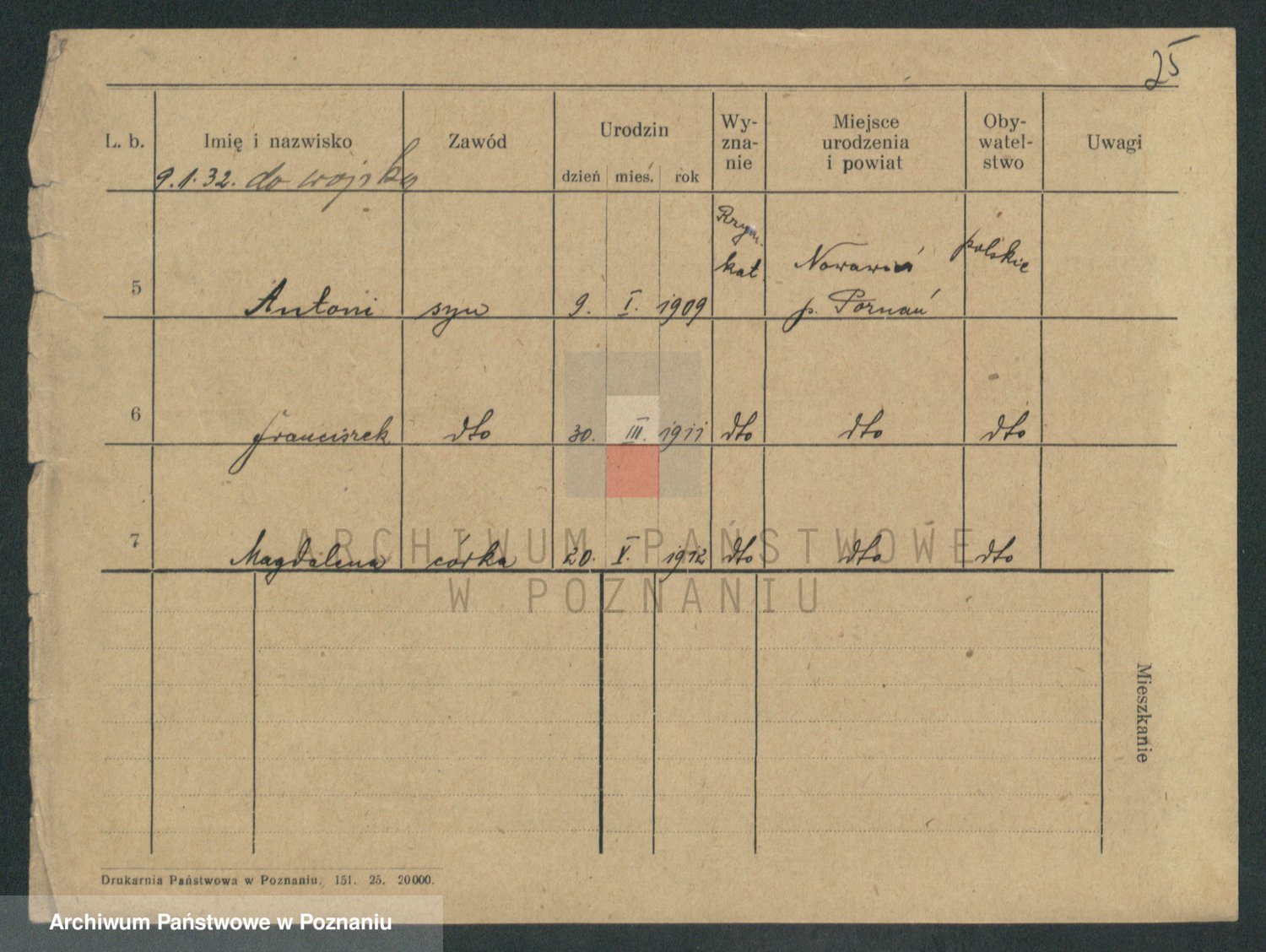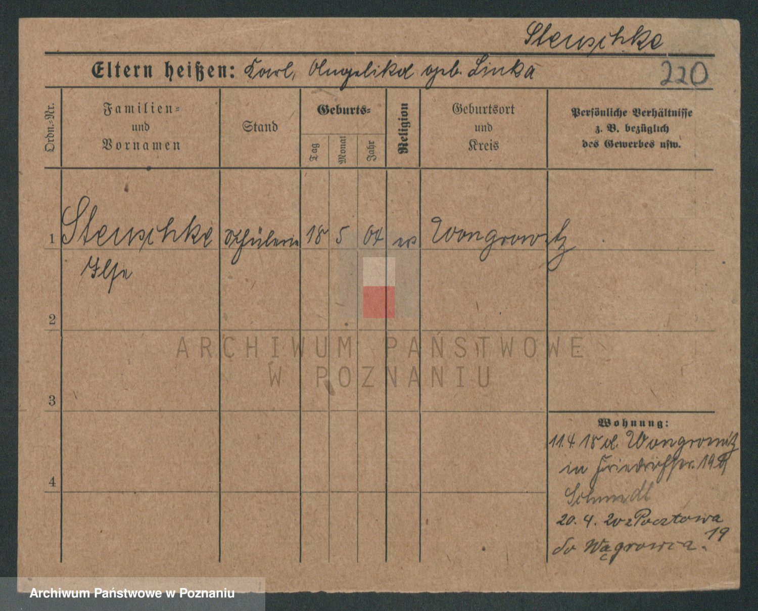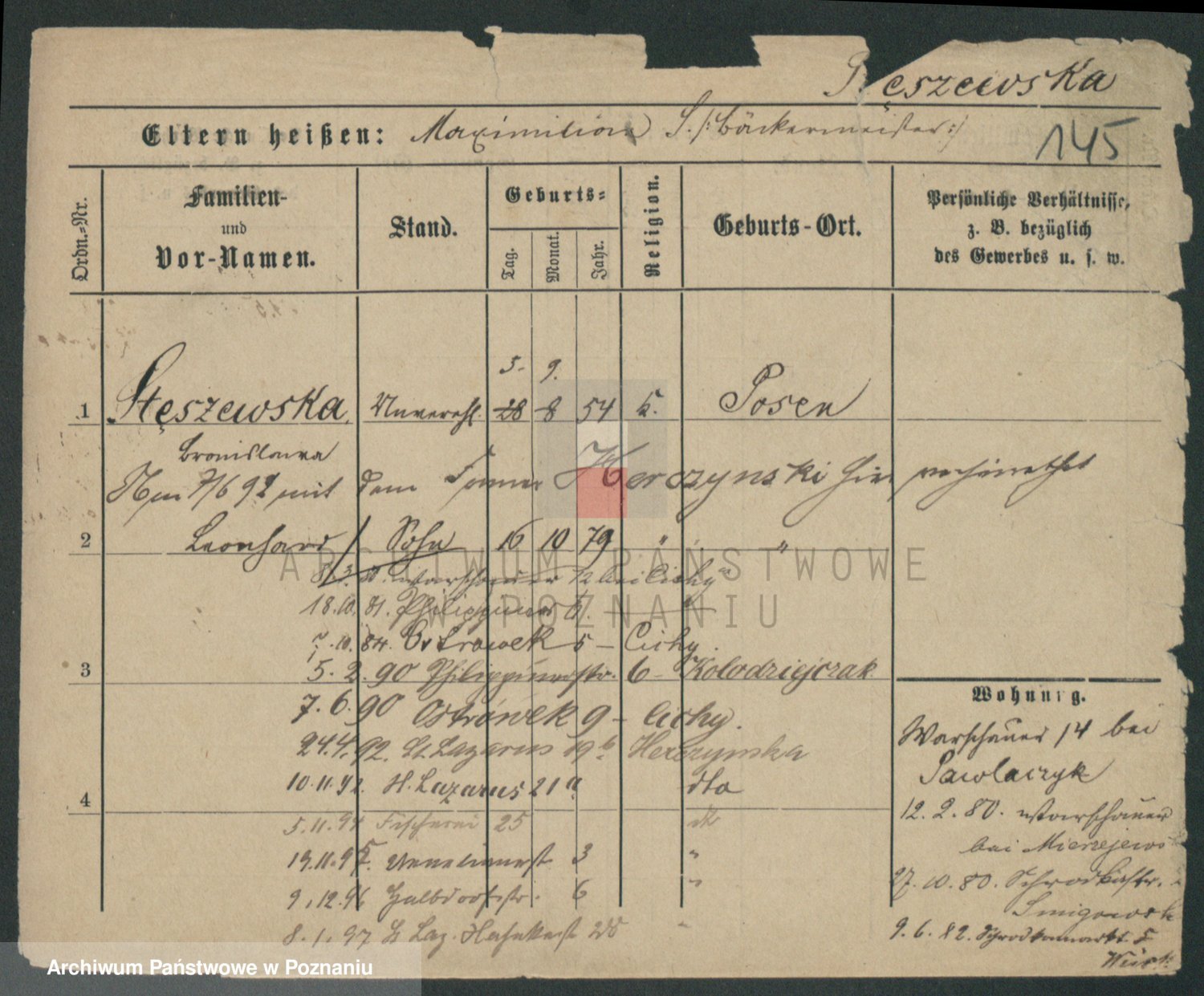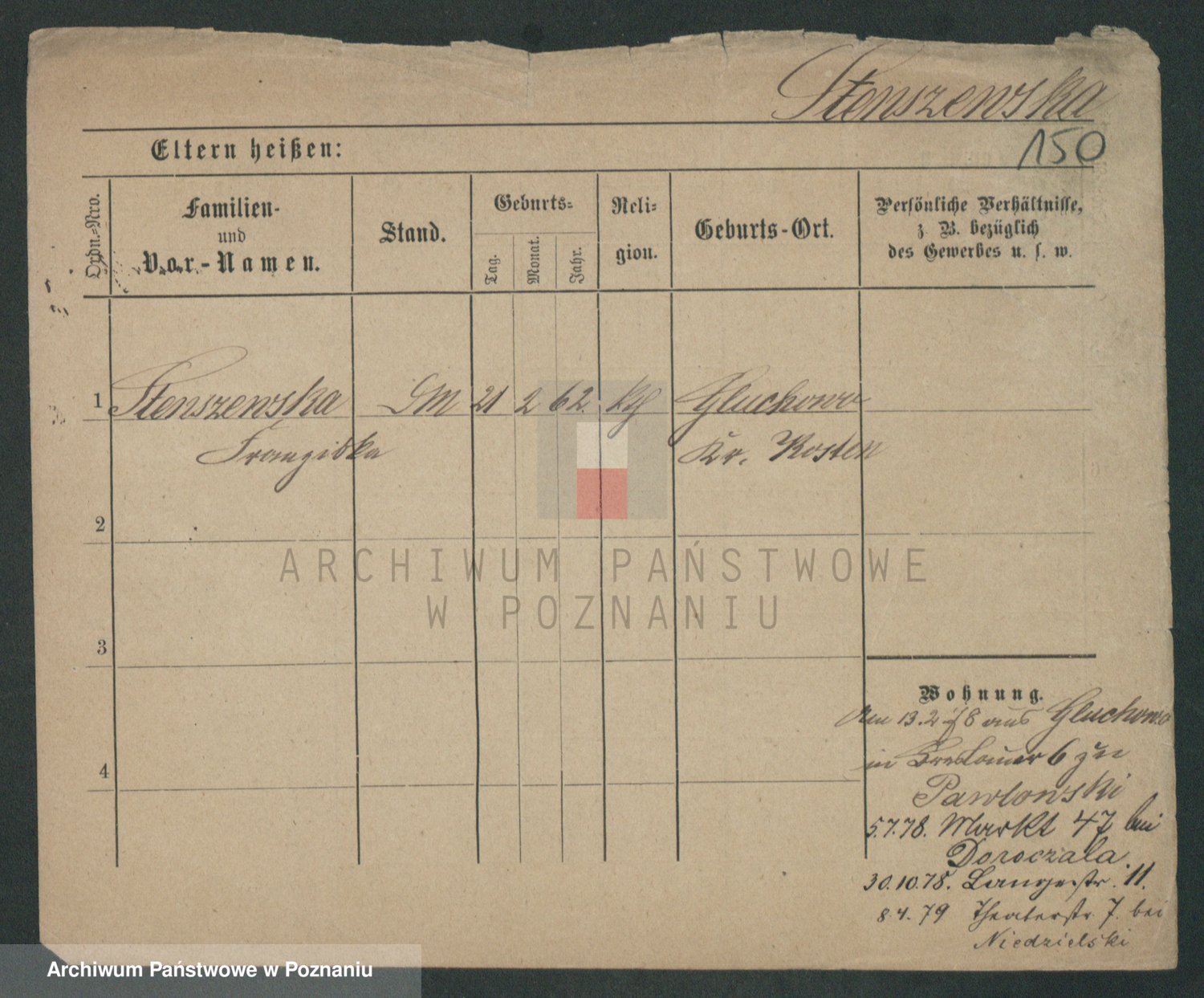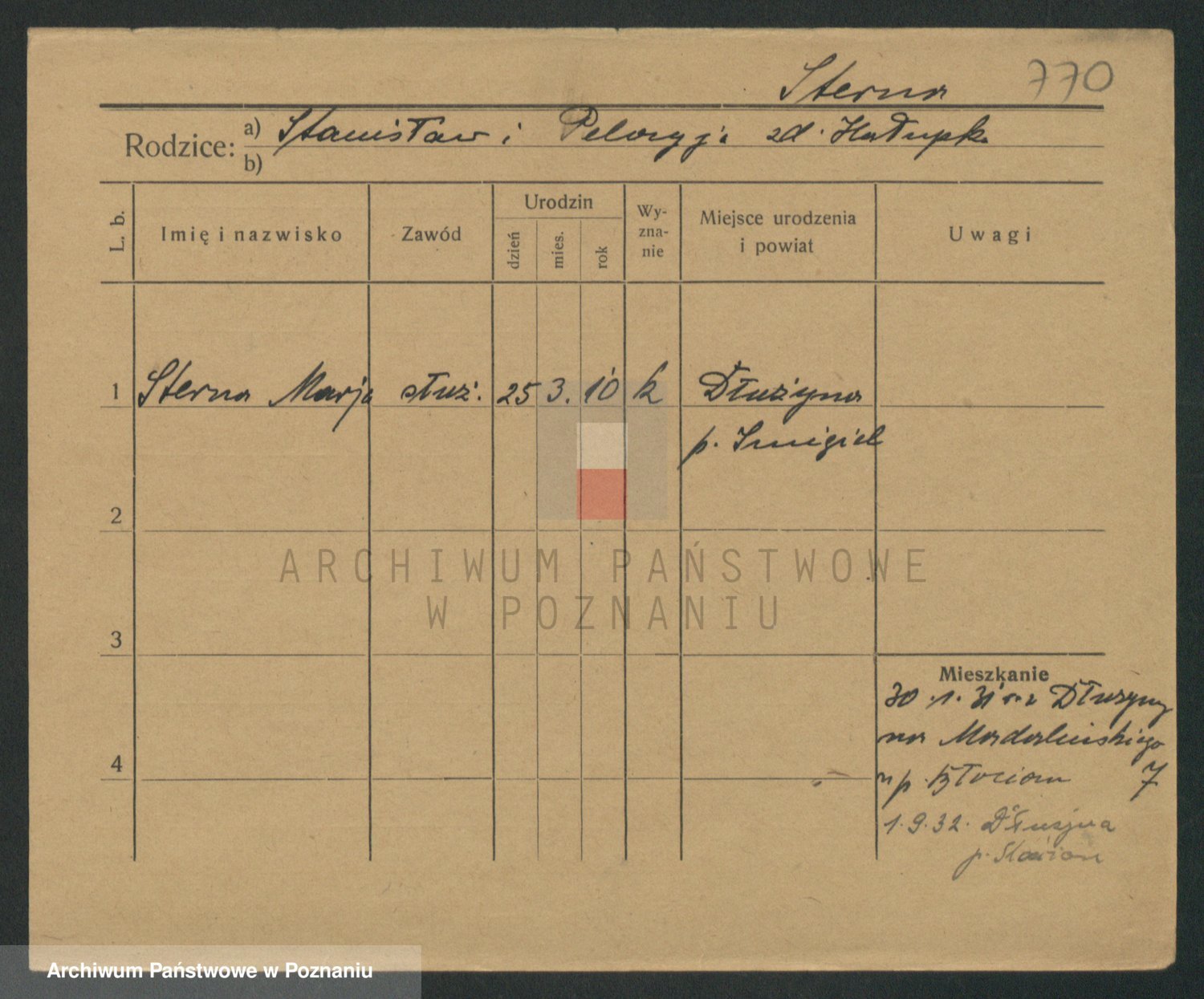 Podgląd karty osobowej dostępny jest po kliknięciu na nazwisko lub ikonkę karty. Można dokonywać powiększenia (ikony na górze) lub przechodzić między kolejnymi skanami (strzałki po bokach).