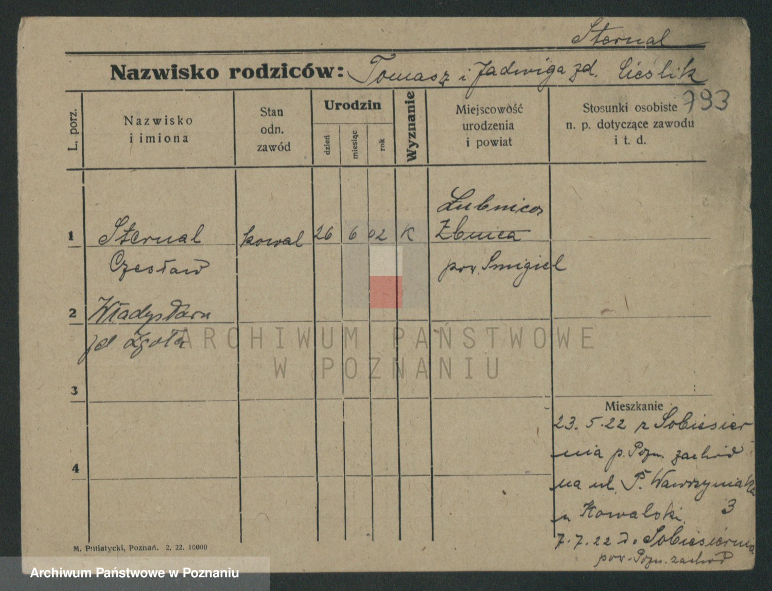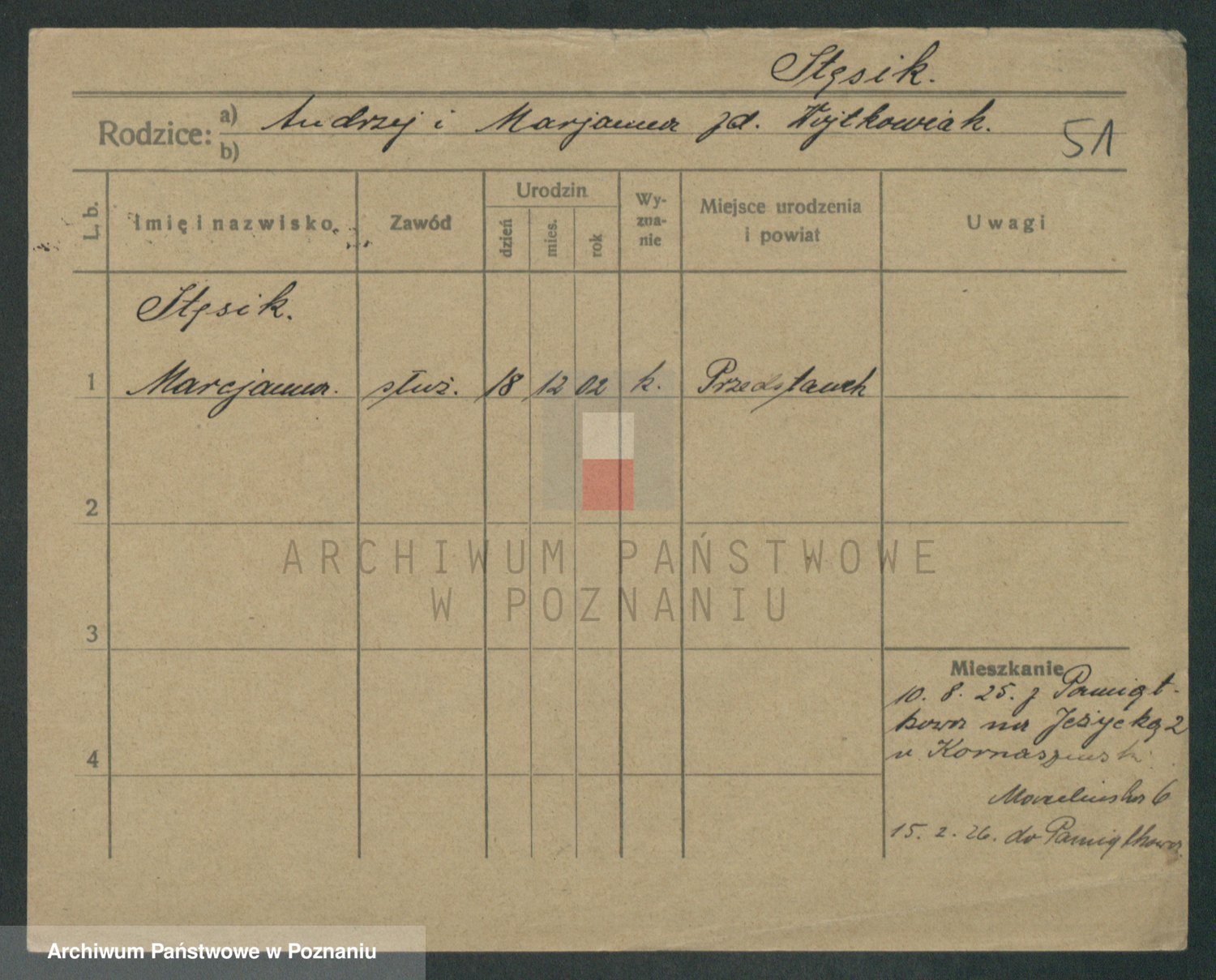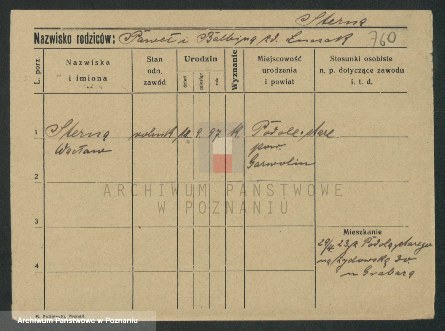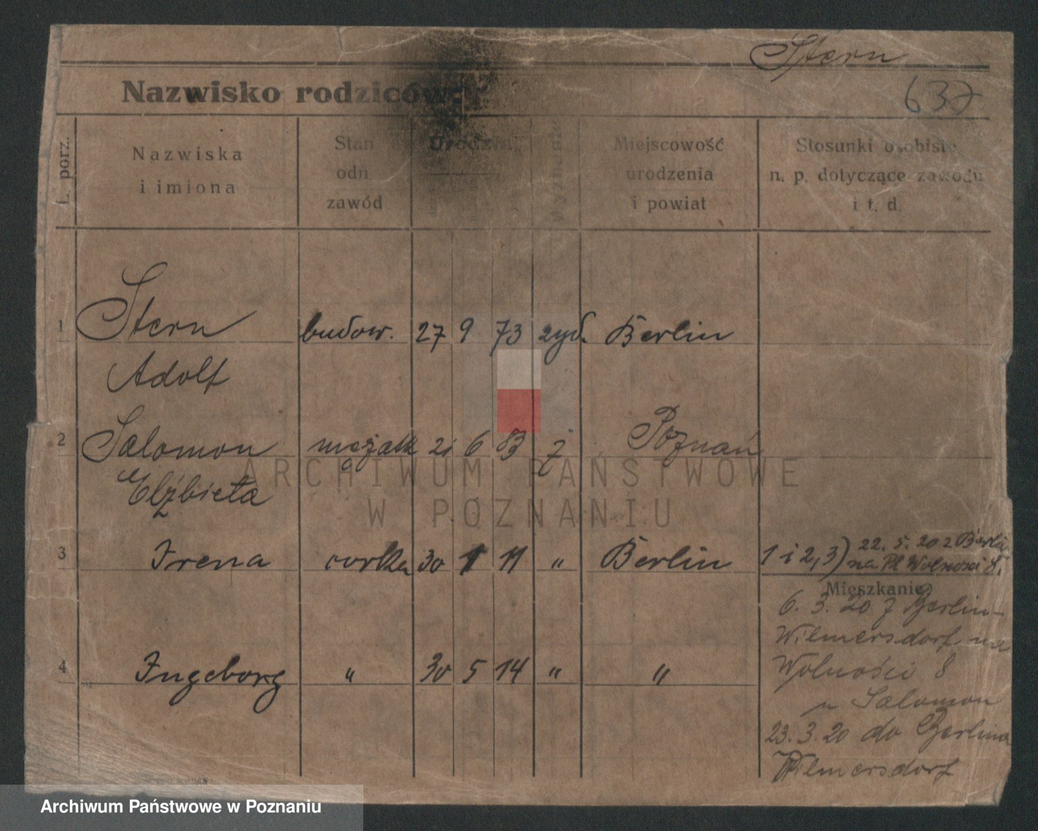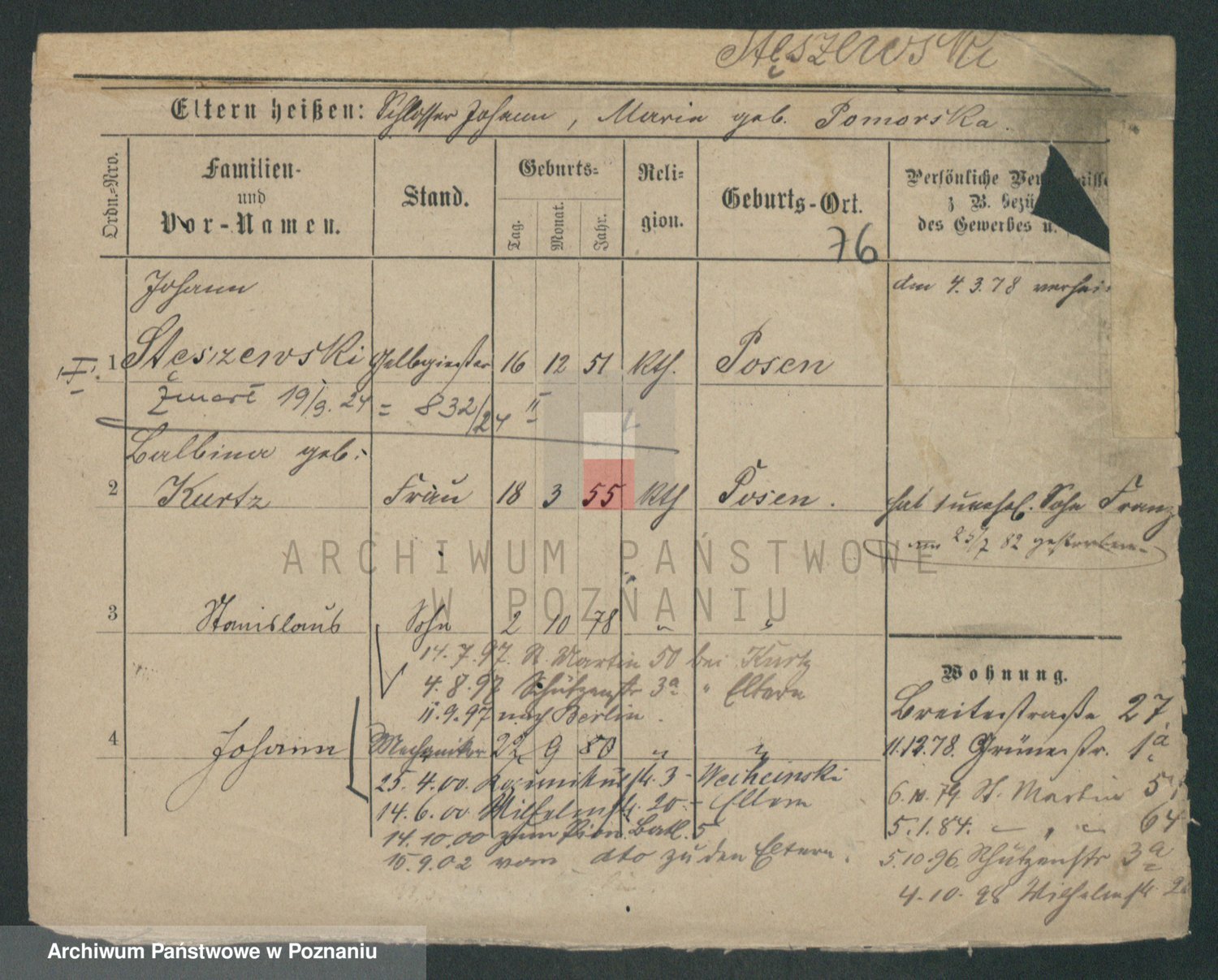 Podgląd karty osobowej dostępny jest po kliknięciu na nazwisko lub ikonkę karty. Można dokonywać powiększenia (ikony na górze) lub przechodzić między kolejnymi skanami (strzałki po bokach).