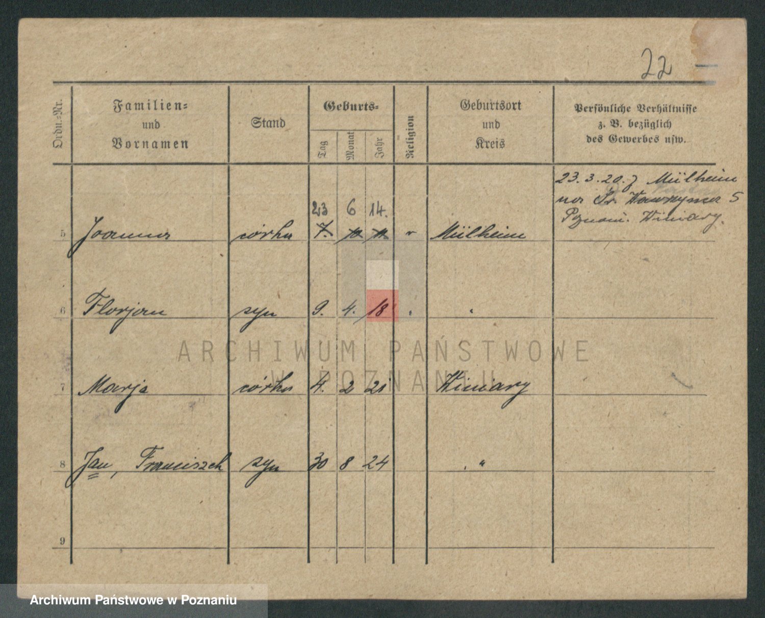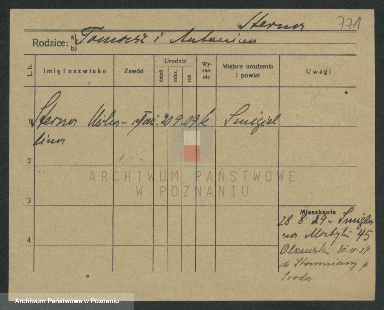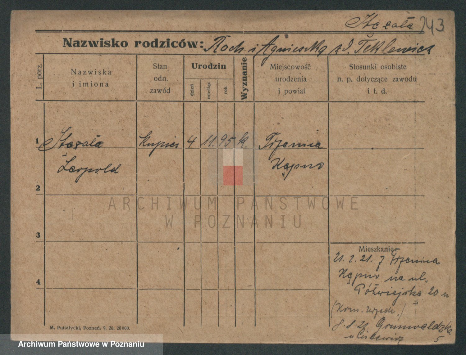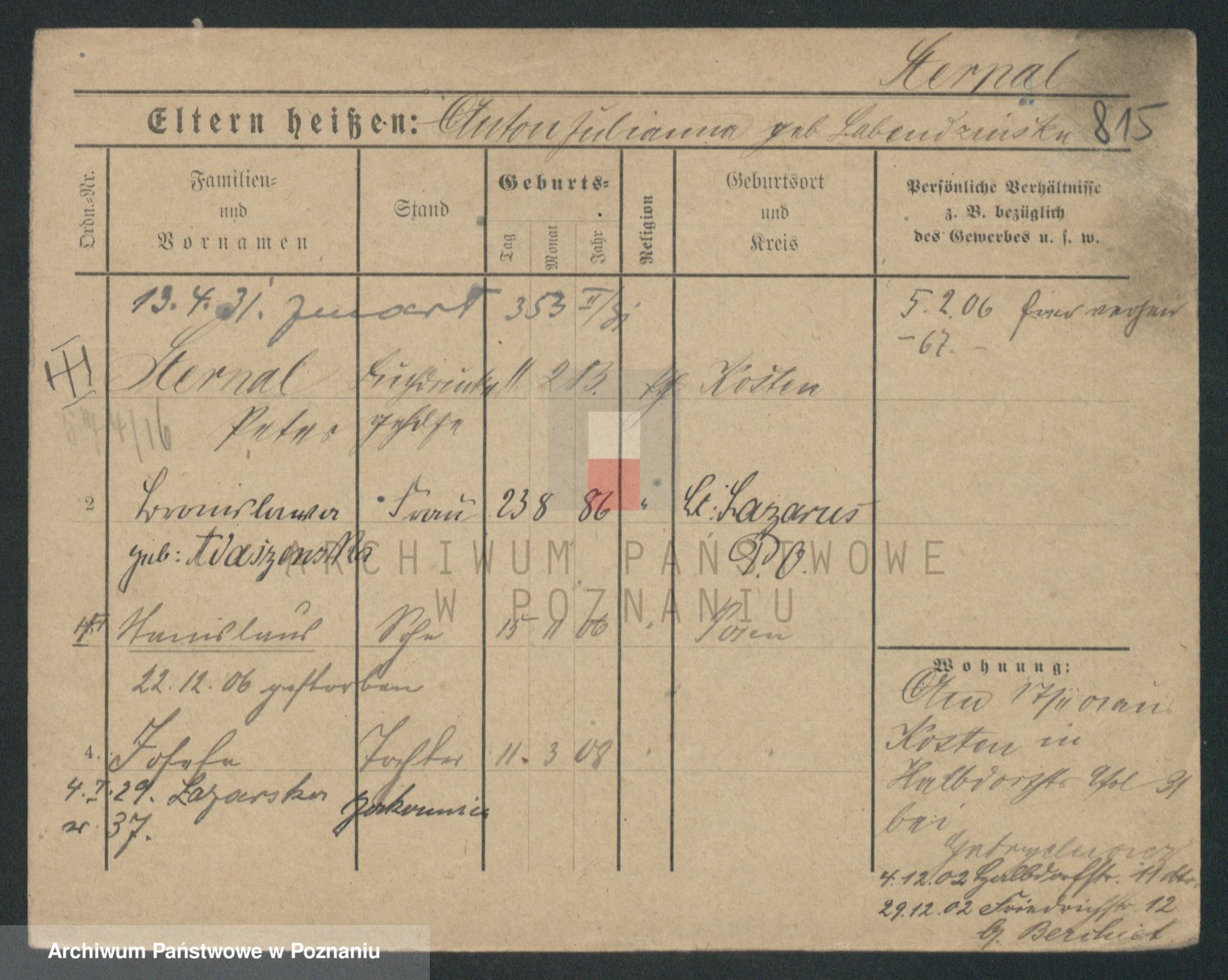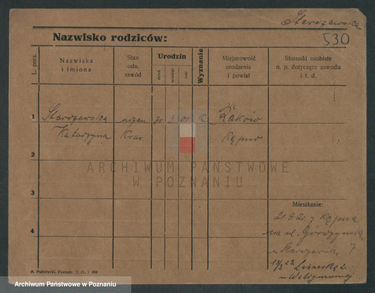 Podgląd karty osobowej dostępny jest po kliknięciu na nazwisko lub ikonkę karty. Można dokonywać powiększenia (ikony na górze) lub przechodzić między kolejnymi skanami (strzałki po bokach).