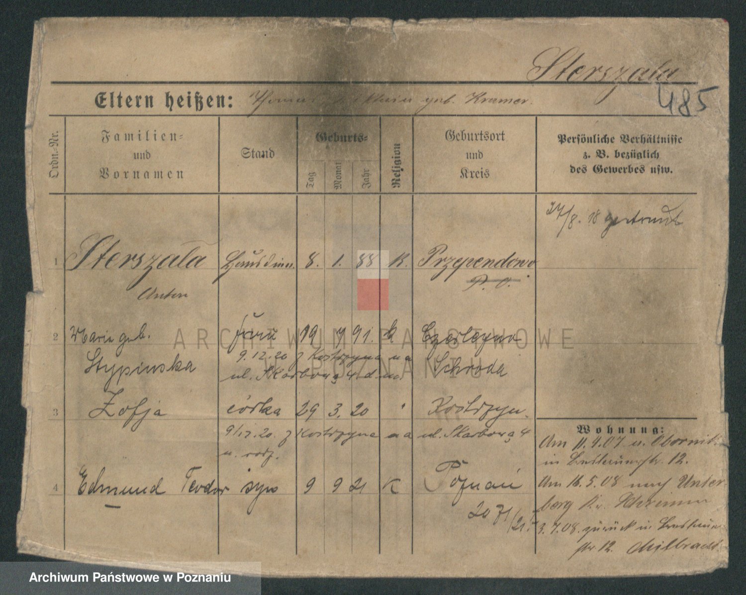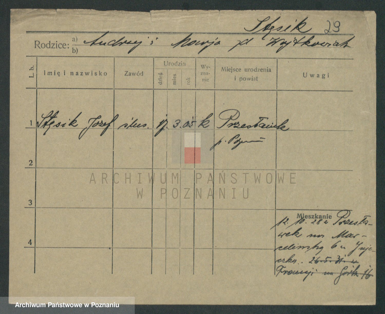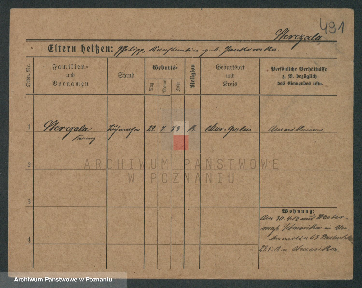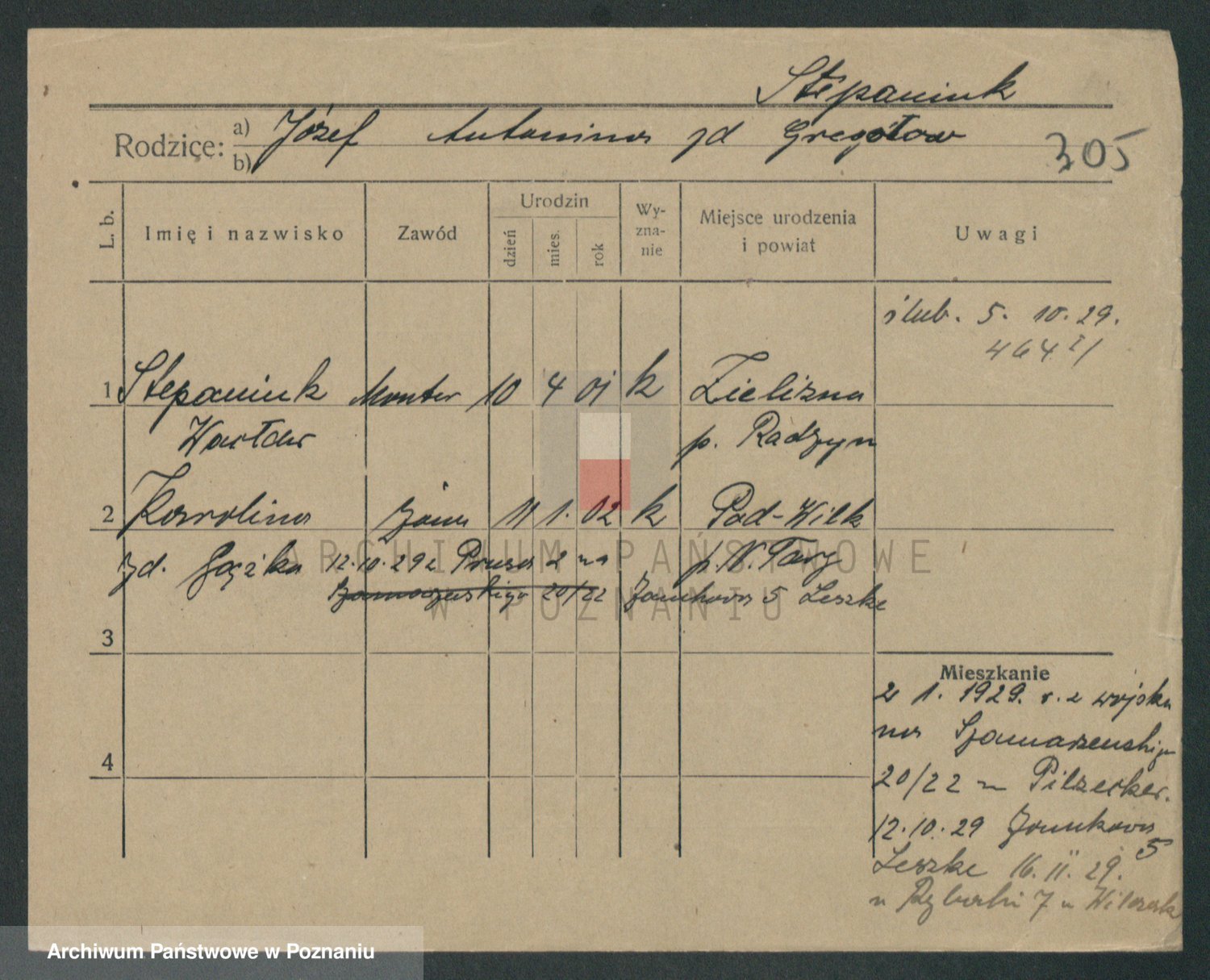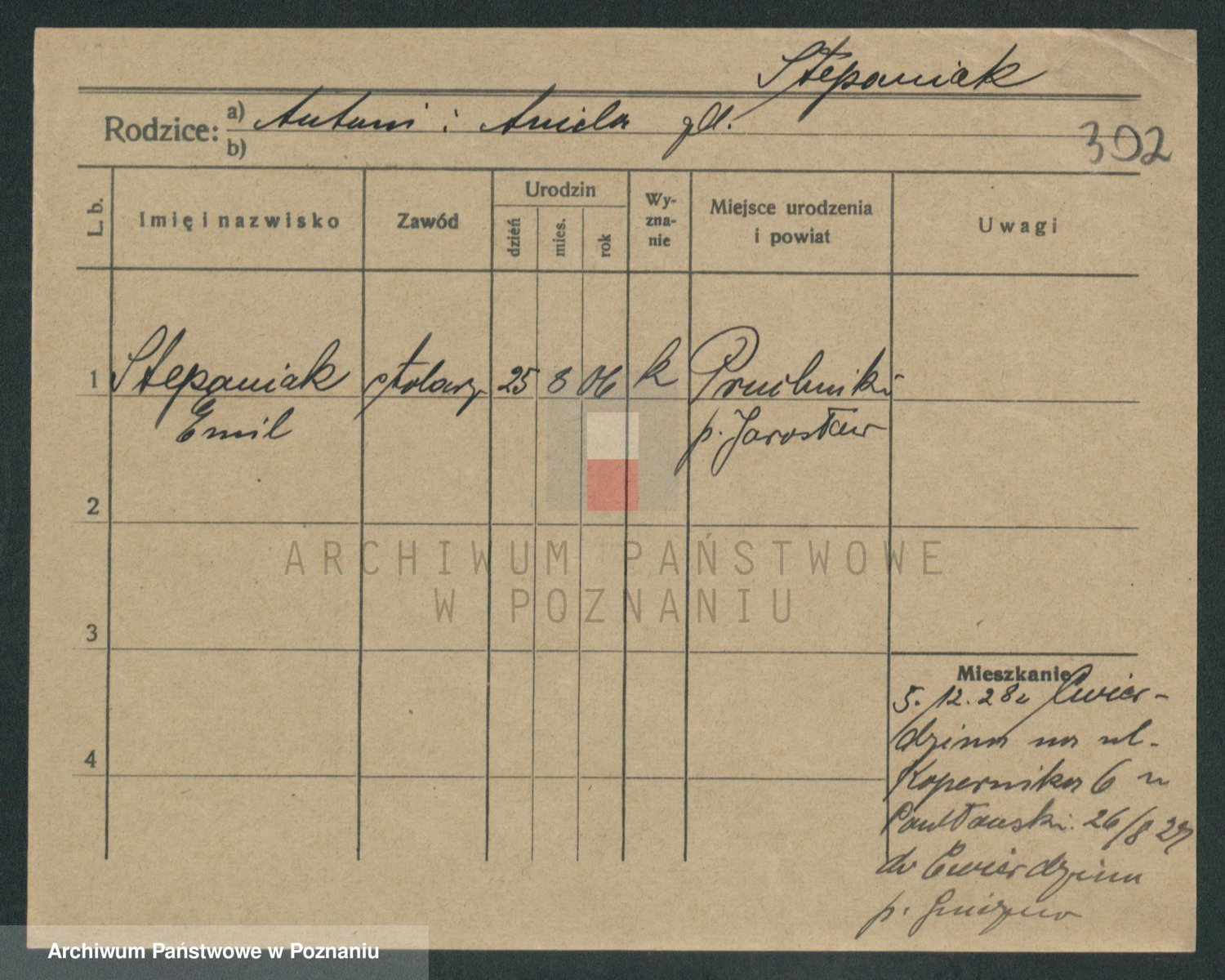 Podgląd karty osobowej dostępny jest po kliknięciu na nazwisko lub ikonkę karty. Można dokonywać powiększenia (ikony na górze) lub przechodzić między kolejnymi skanami (strzałki po bokach).