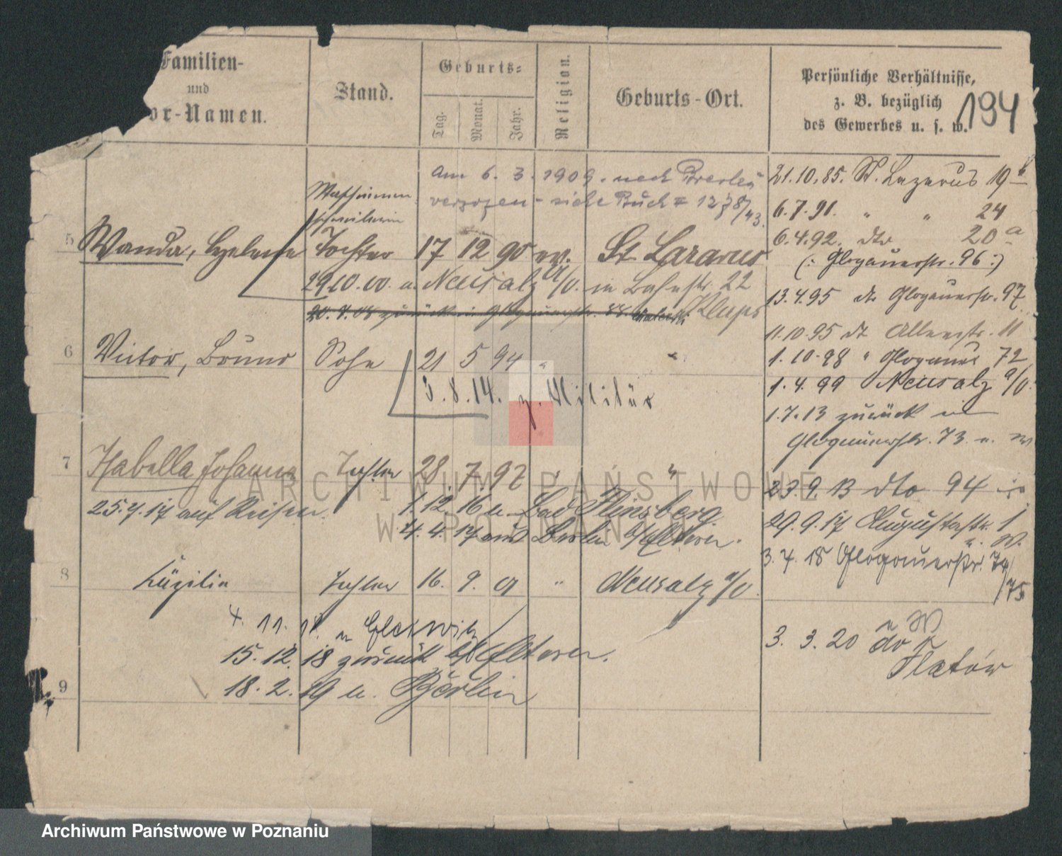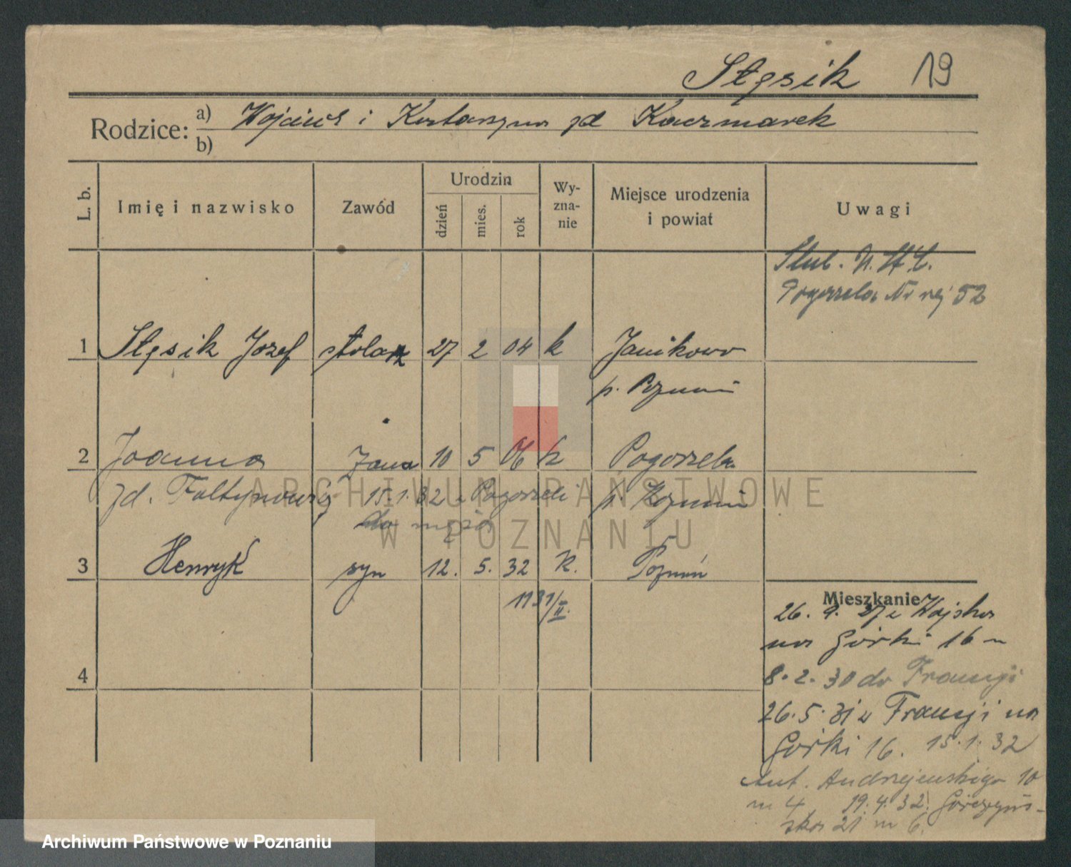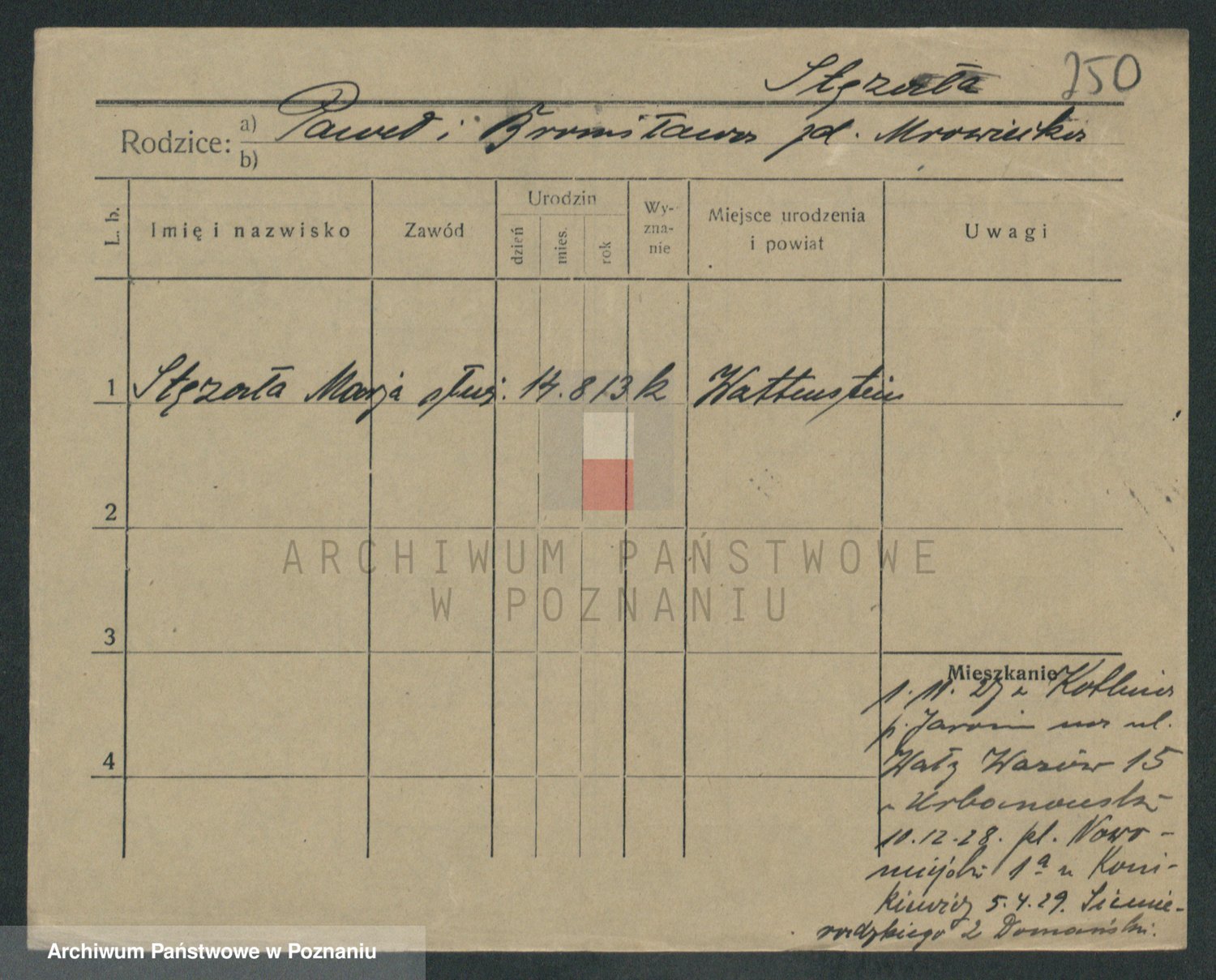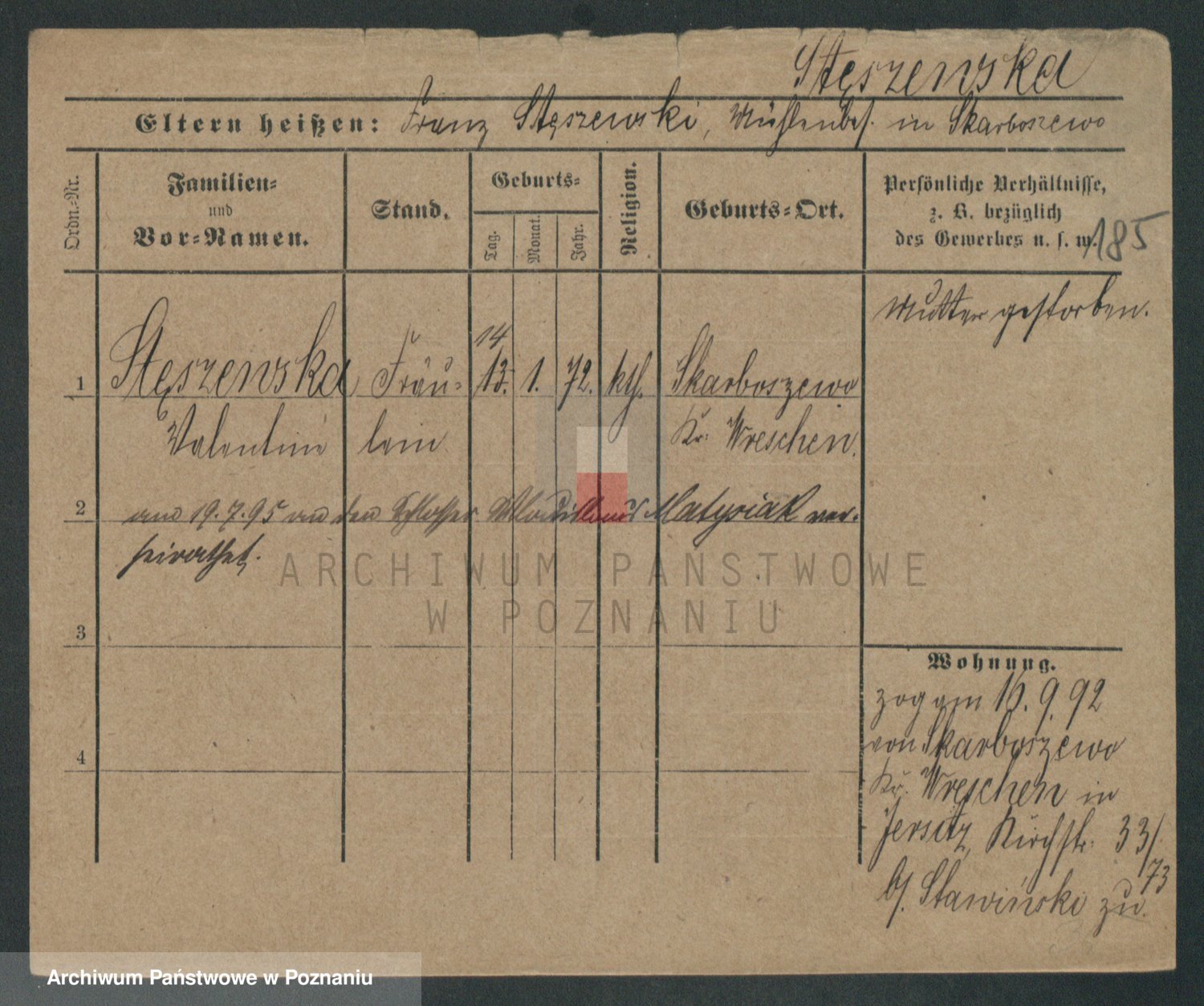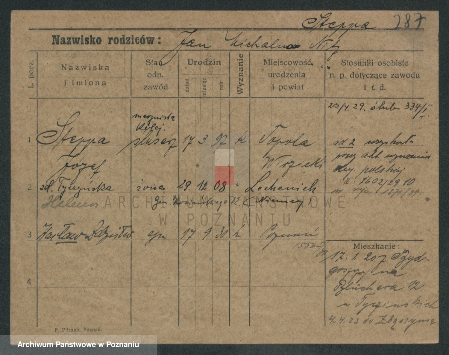 Podgląd karty osobowej dostępny jest po kliknięciu na nazwisko lub ikonkę karty. Można dokonywać powiększenia (ikony na górze) lub przechodzić między kolejnymi skanami (strzałki po bokach).