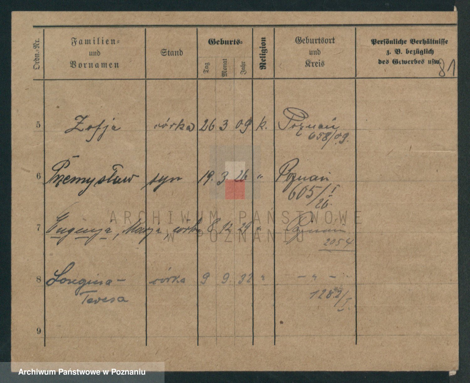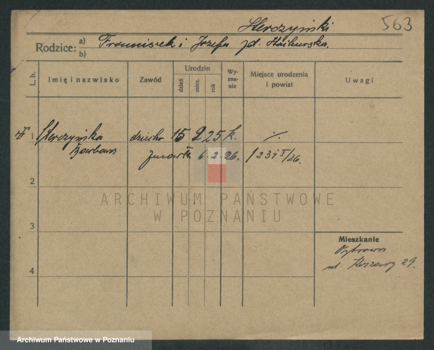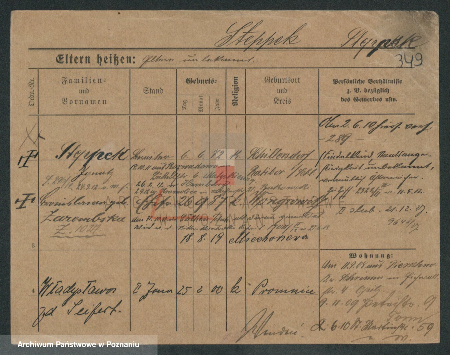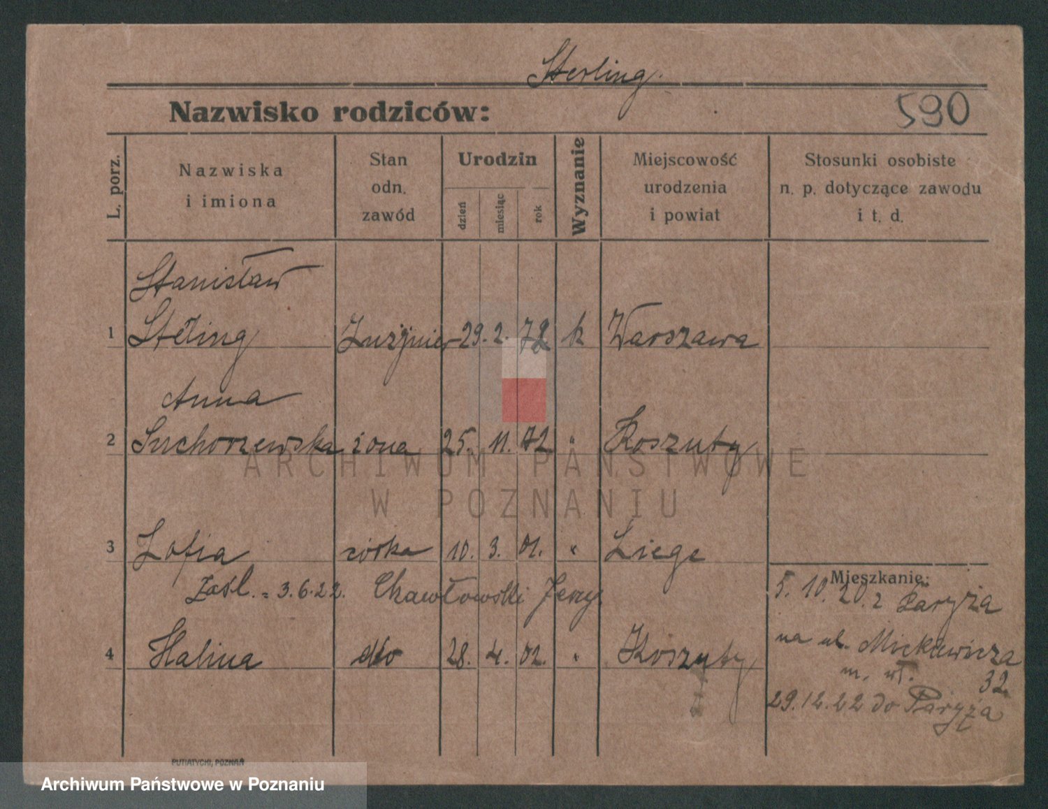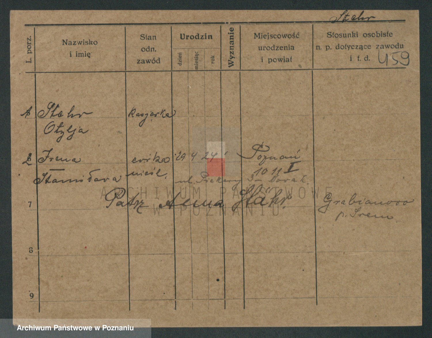 Podgląd karty osobowej dostępny jest po kliknięciu na nazwisko lub ikonkę karty. Można dokonywać powiększenia (ikony na górze) lub przechodzić między kolejnymi skanami (strzałki po bokach).