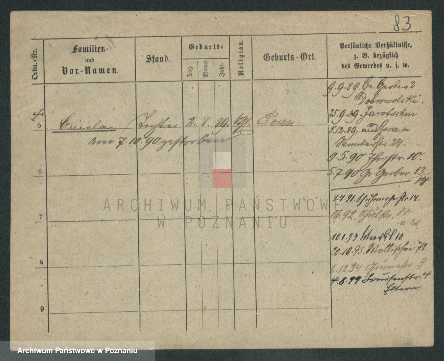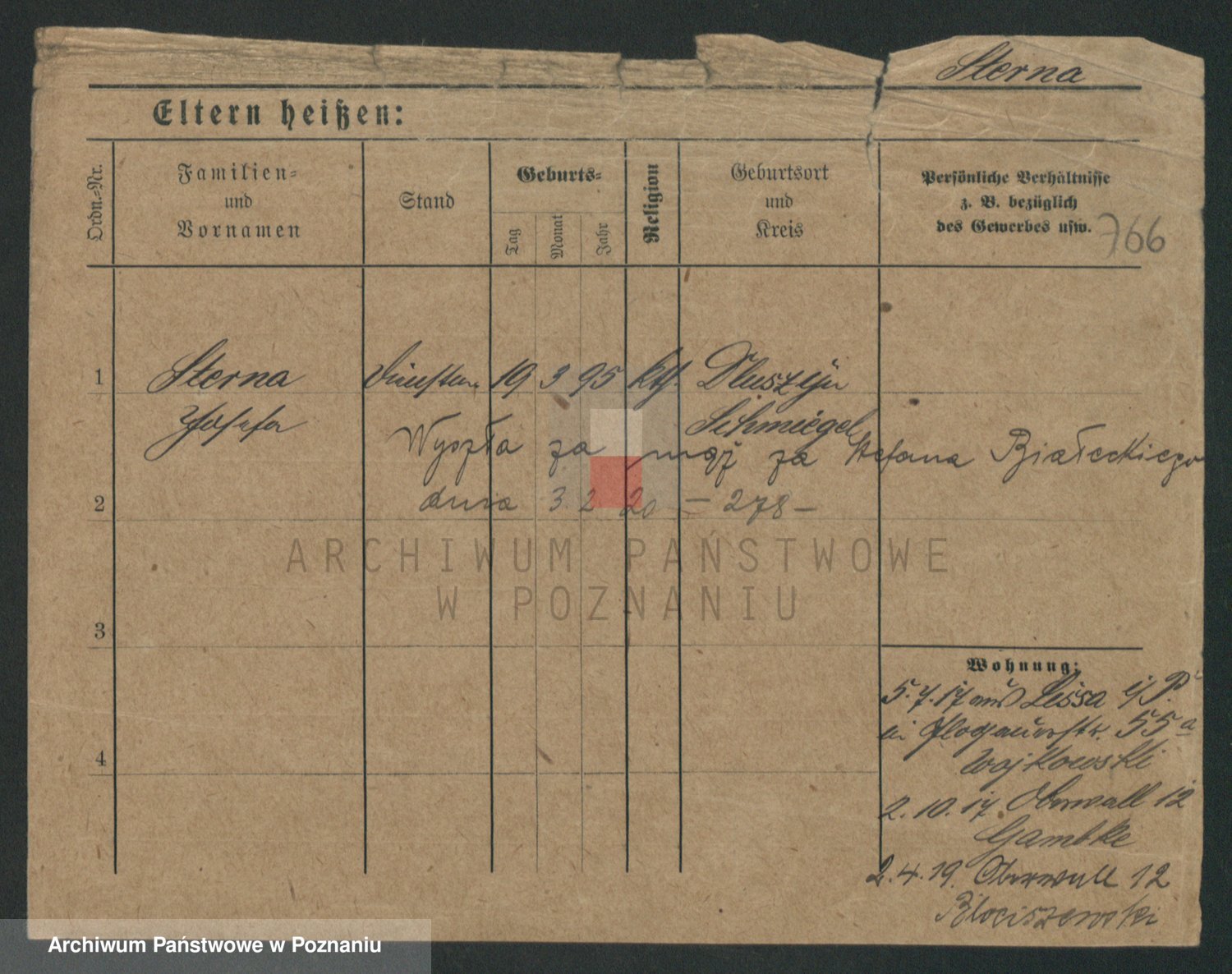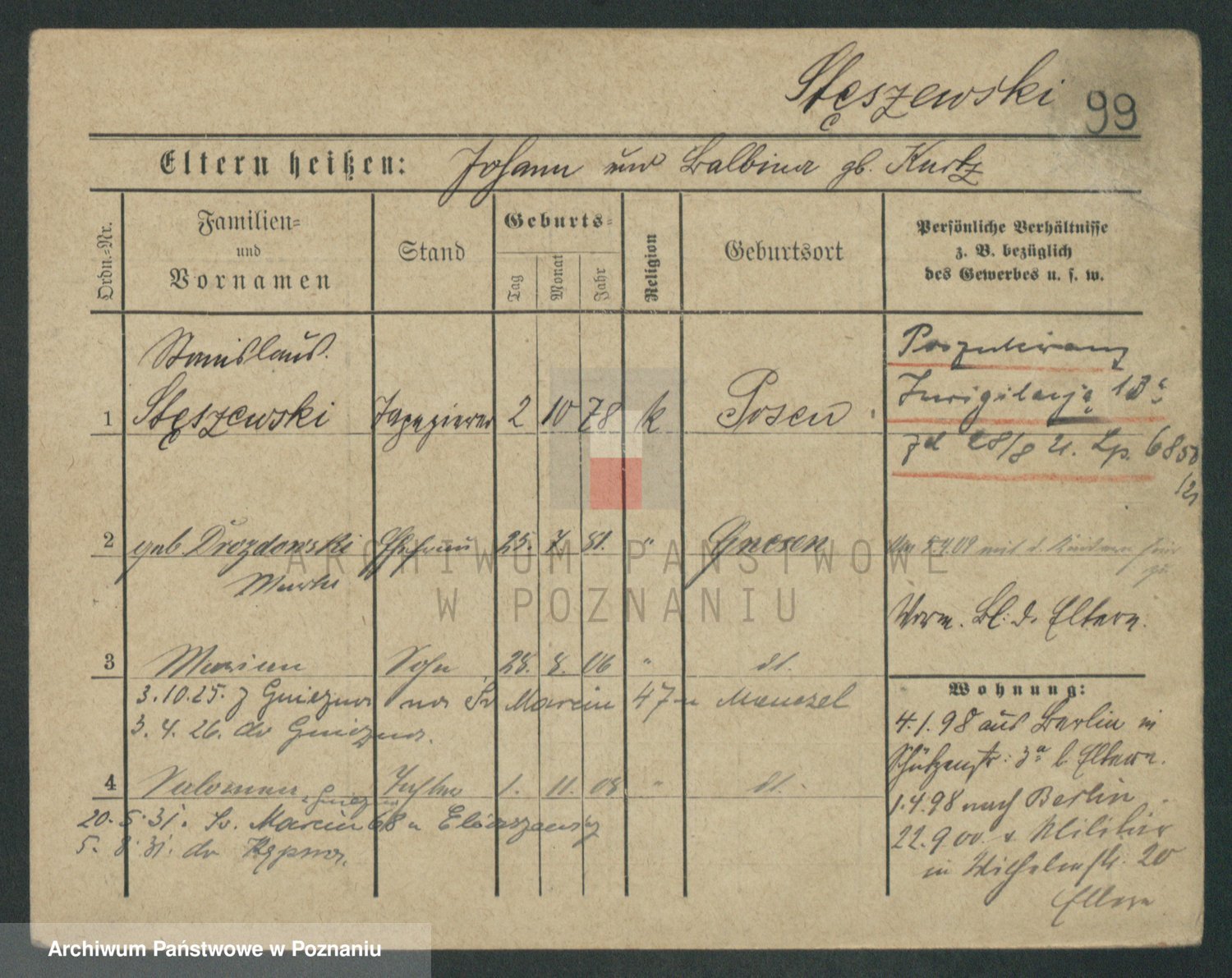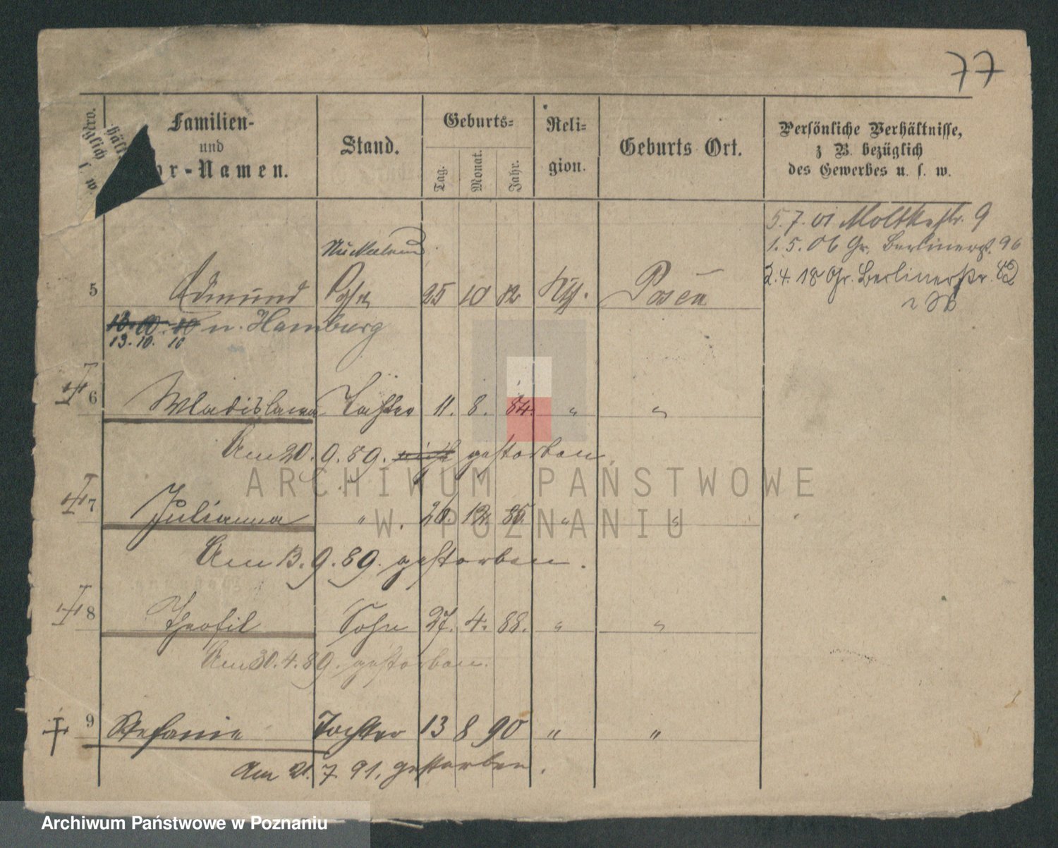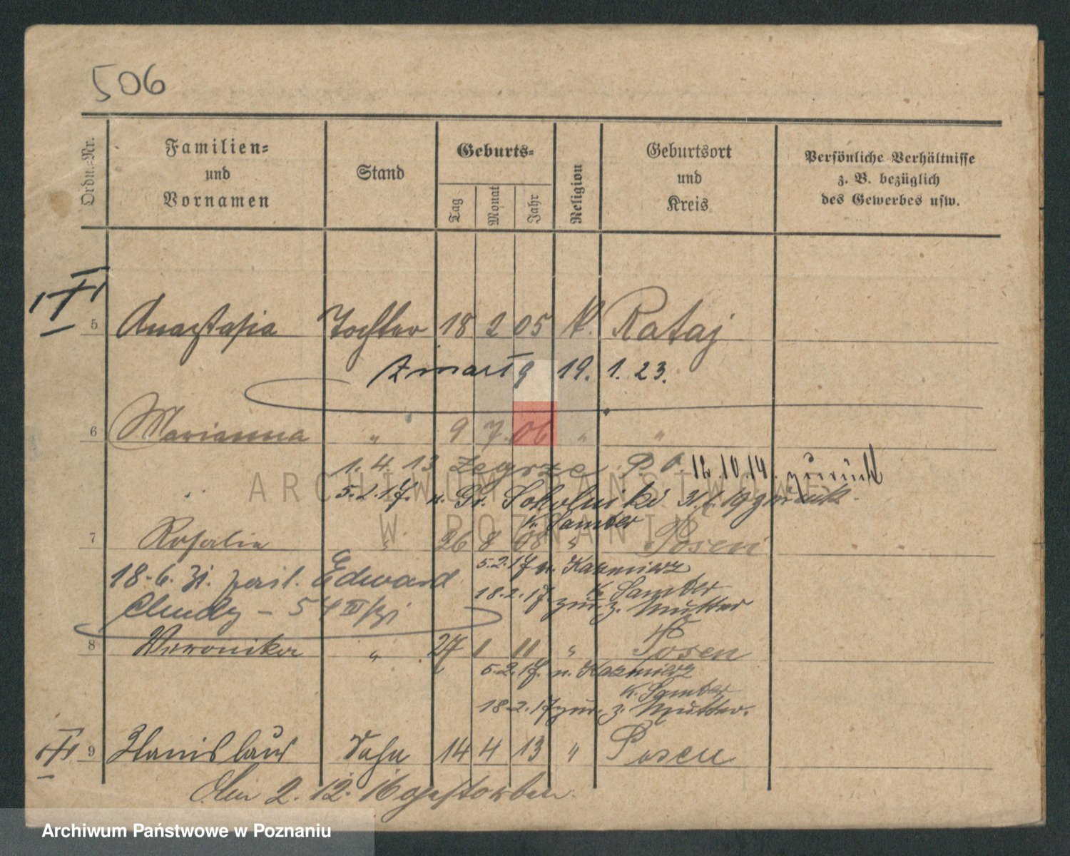 Podgląd karty osobowej dostępny jest po kliknięciu na nazwisko lub ikonkę karty. Można dokonywać powiększenia (ikony na górze) lub przechodzić między kolejnymi skanami (strzałki po bokach).