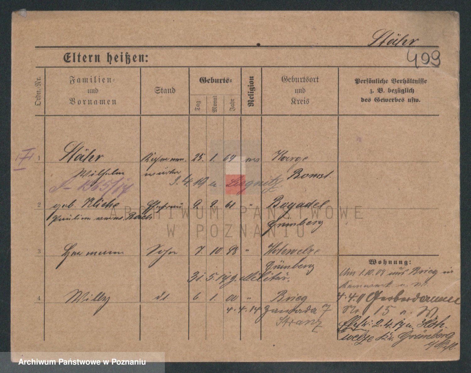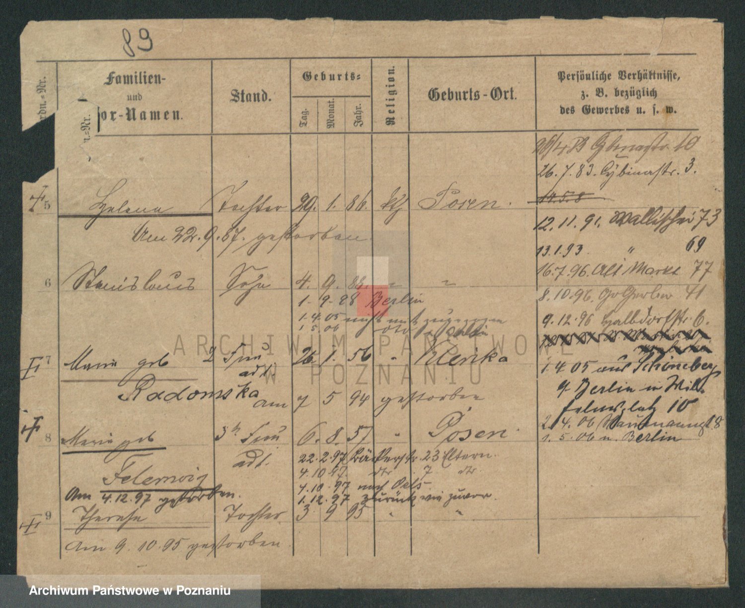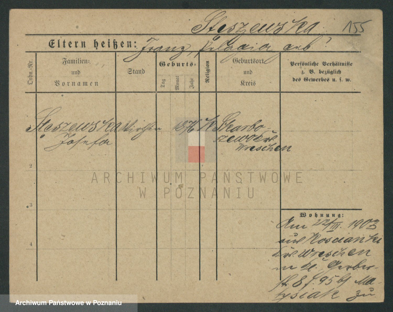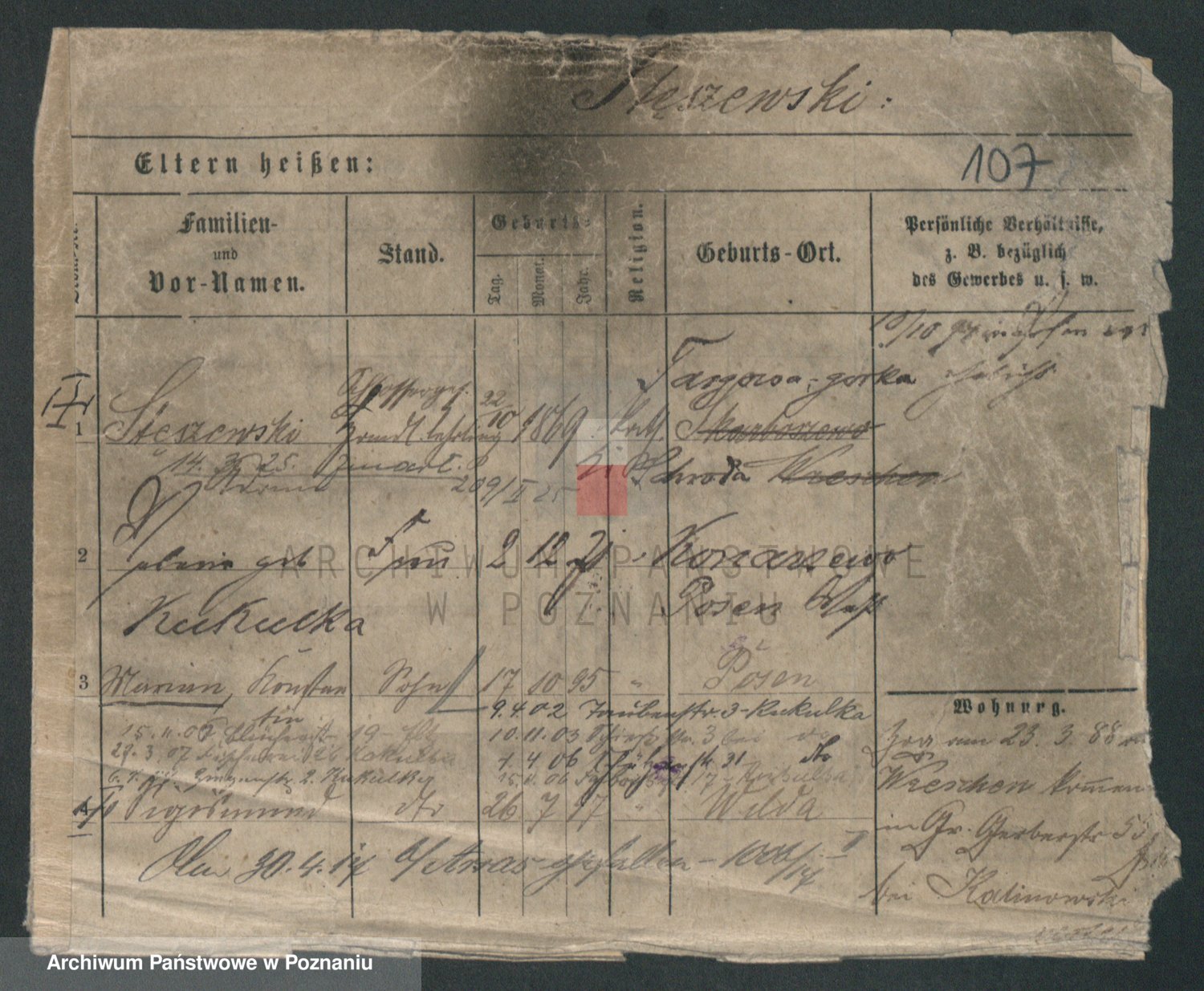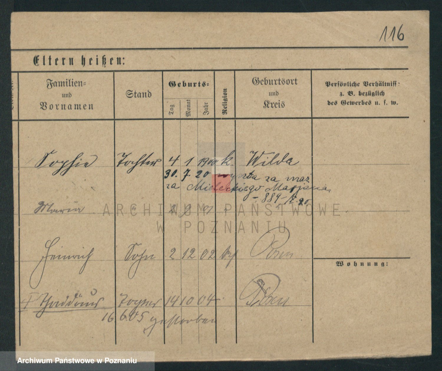 Podgląd karty osobowej dostępny jest po kliknięciu na nazwisko lub ikonkę karty. Można dokonywać powiększenia (ikony na górze) lub przechodzić między kolejnymi skanami (strzałki po bokach).