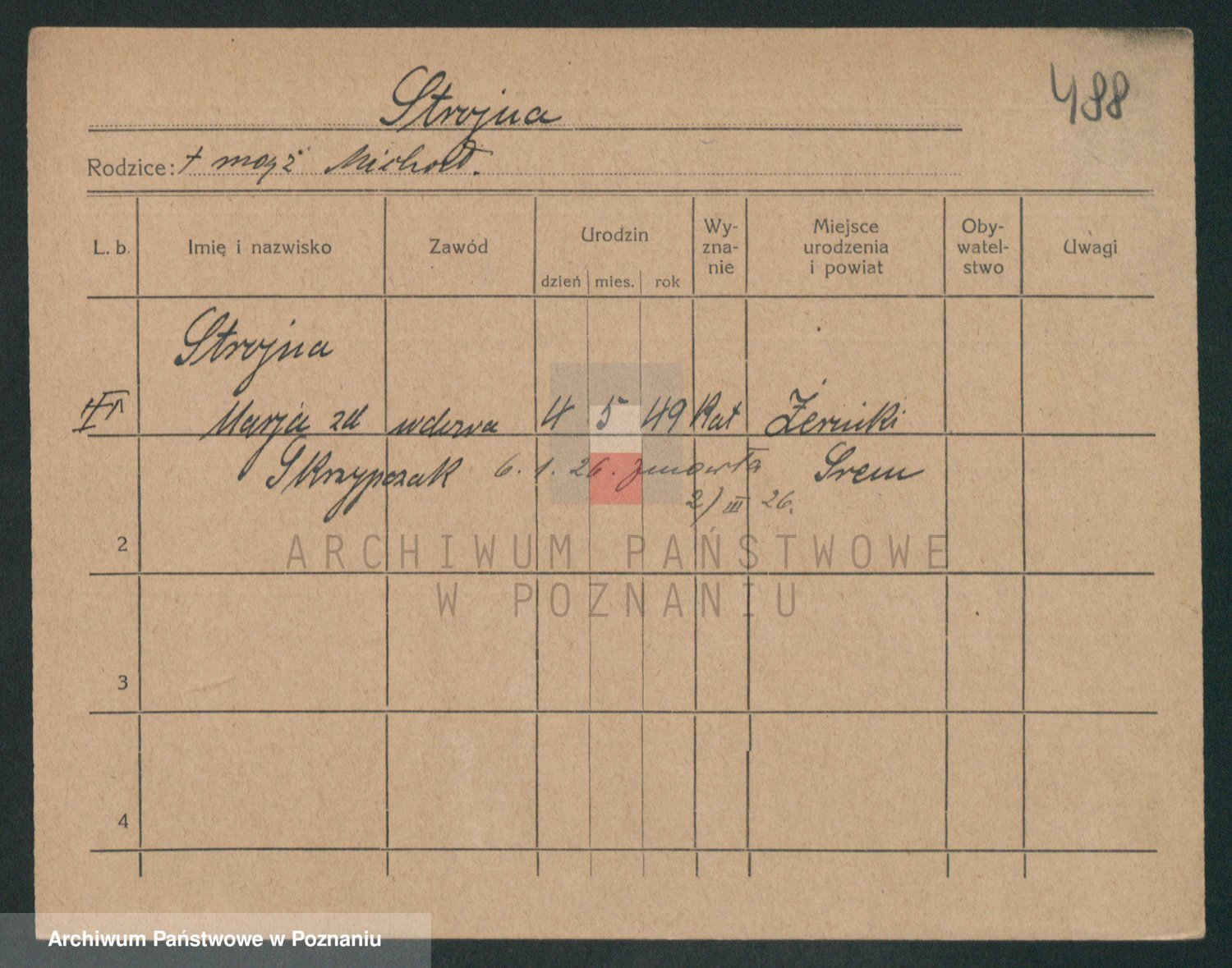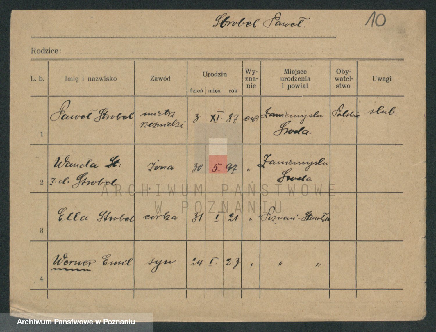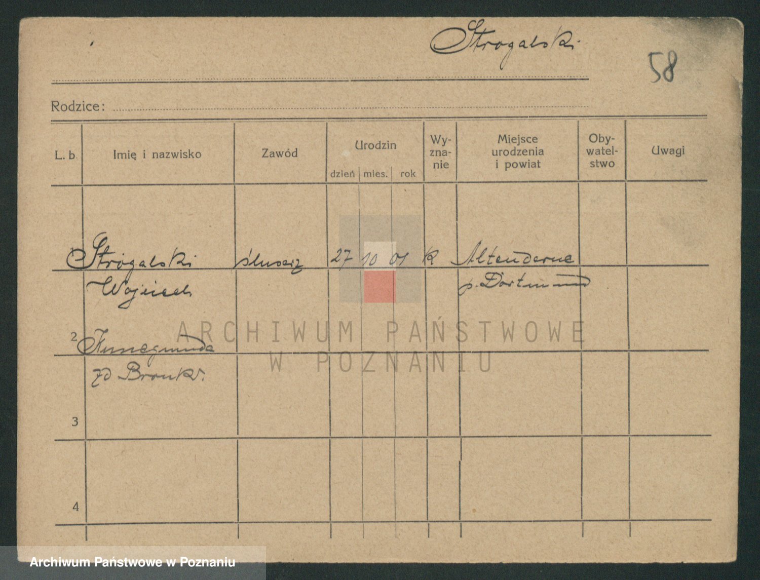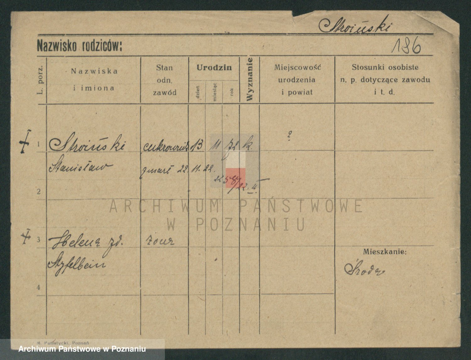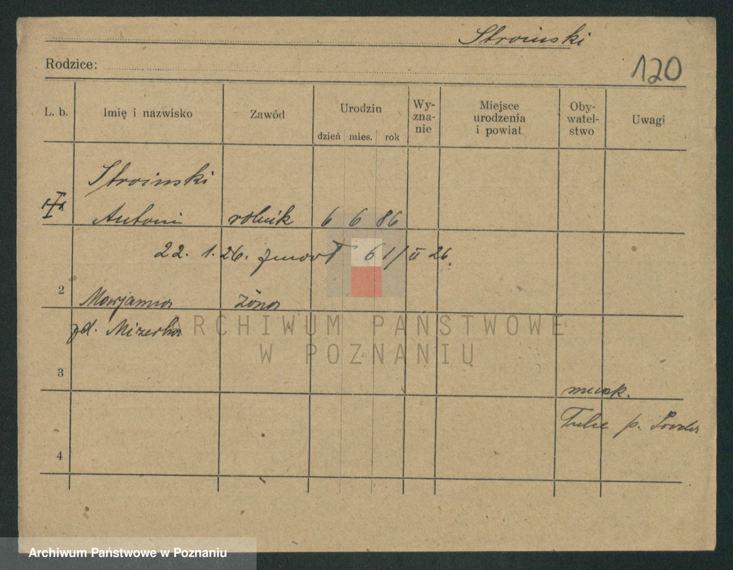 Podgląd karty osobowej dostępny jest po kliknięciu na nazwisko lub ikonkę karty. Można dokonywać powiększenia (ikony na górze) lub przechodzić między kolejnymi skanami (strzałki po bokach).