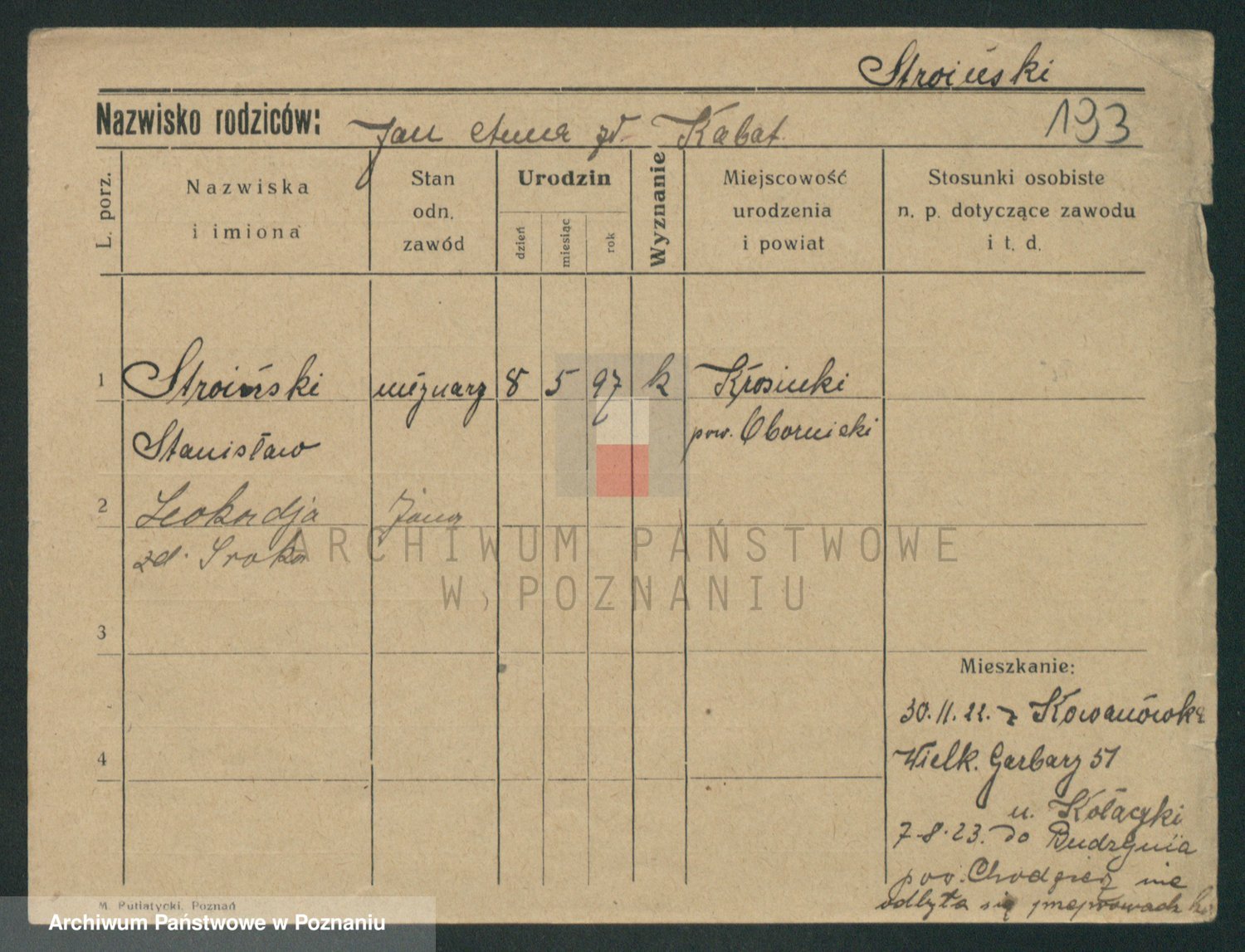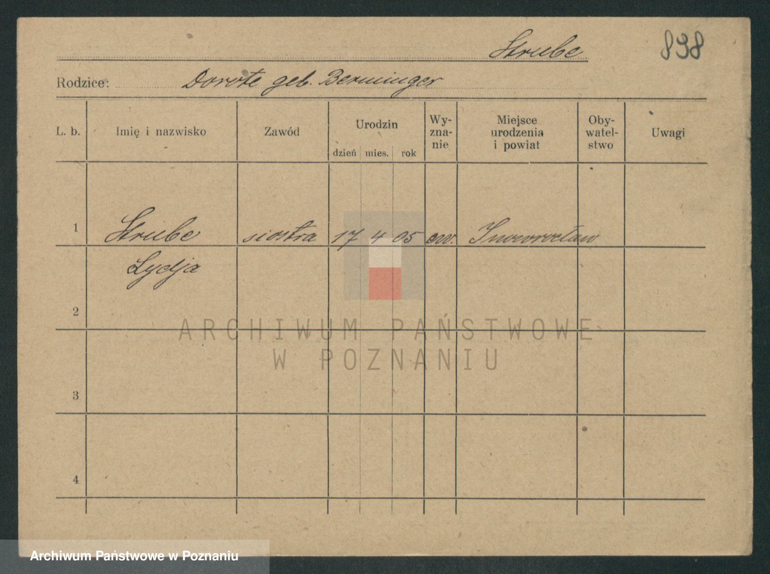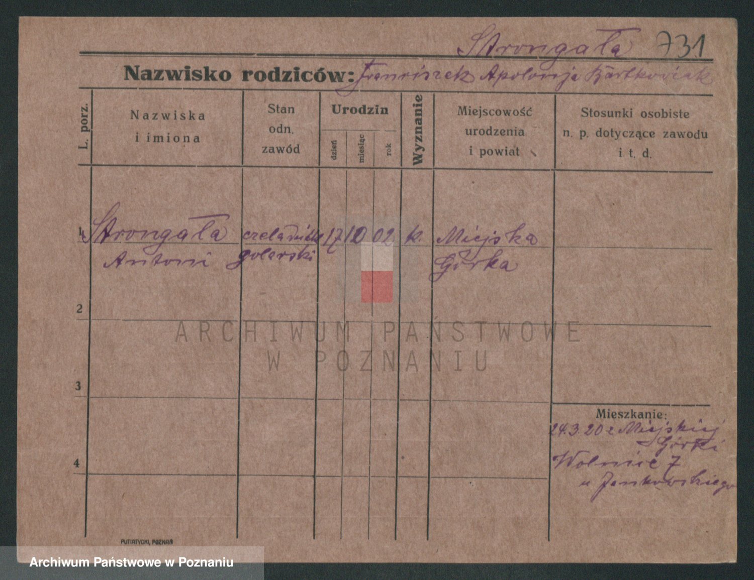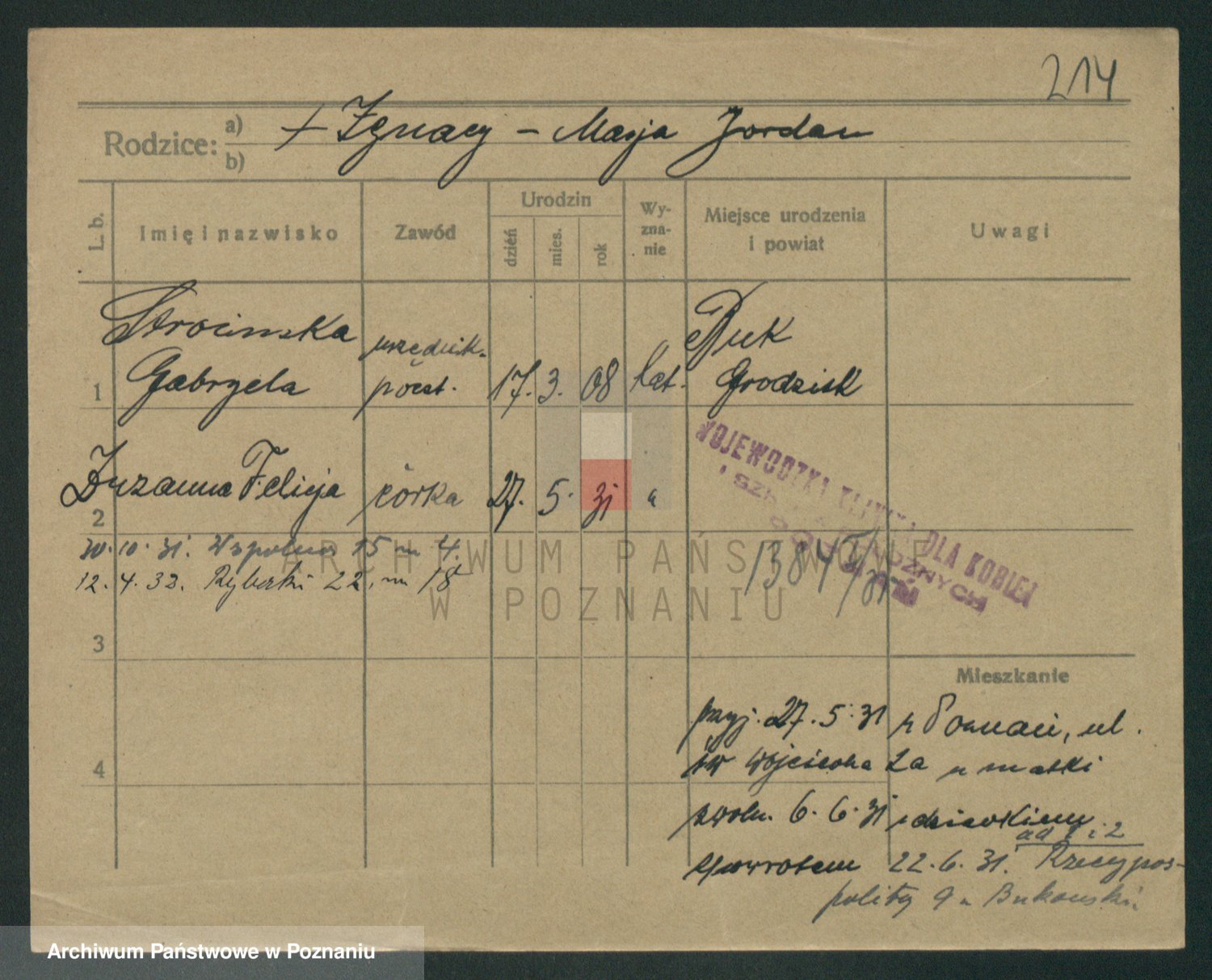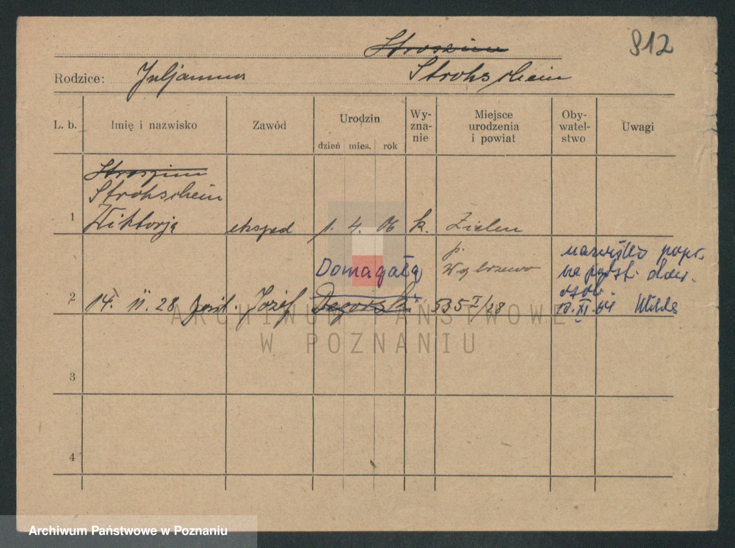 Podgląd karty osobowej dostępny jest po kliknięciu na nazwisko lub ikonkę karty. Można dokonywać powiększenia (ikony na górze) lub przechodzić między kolejnymi skanami (strzałki po bokach).