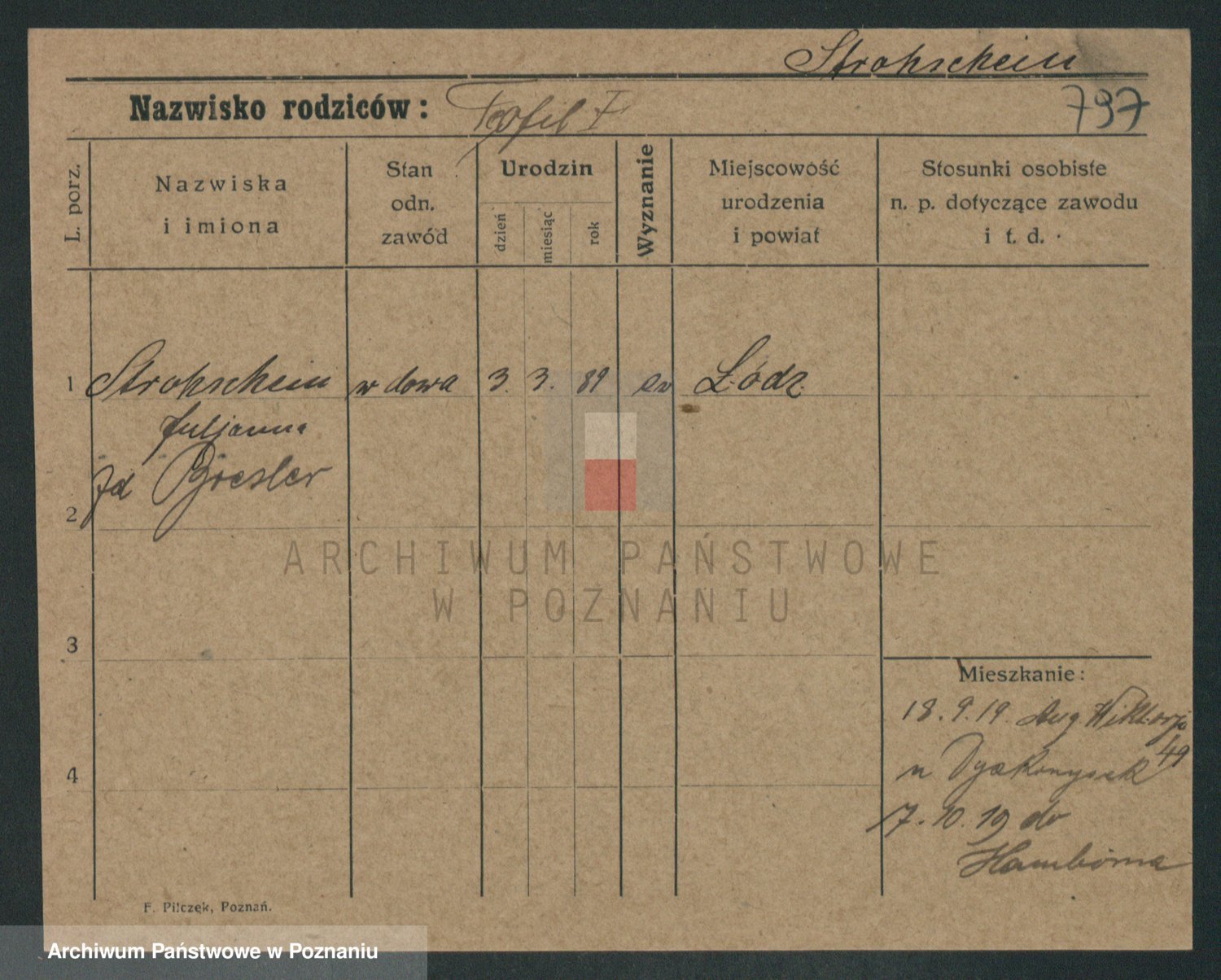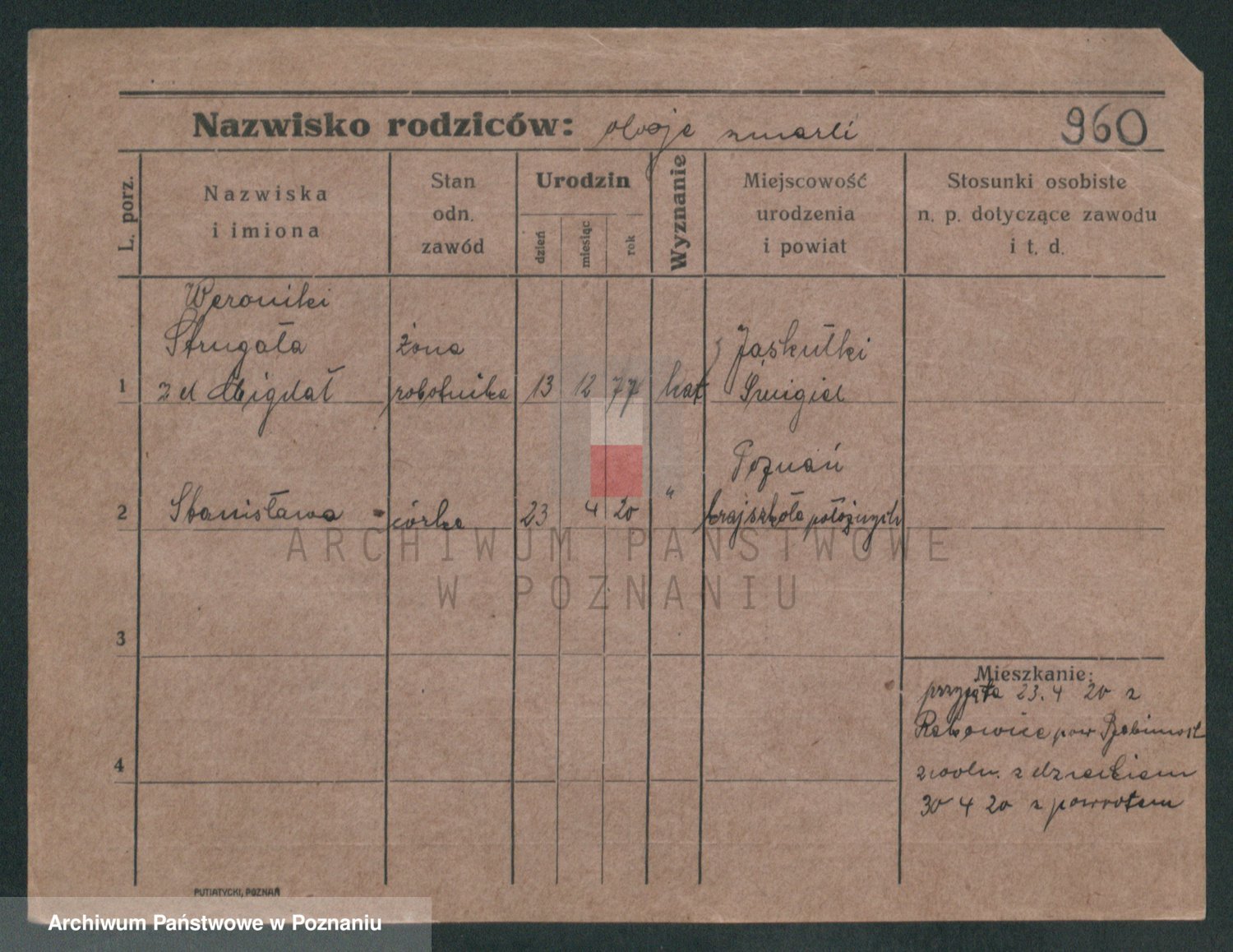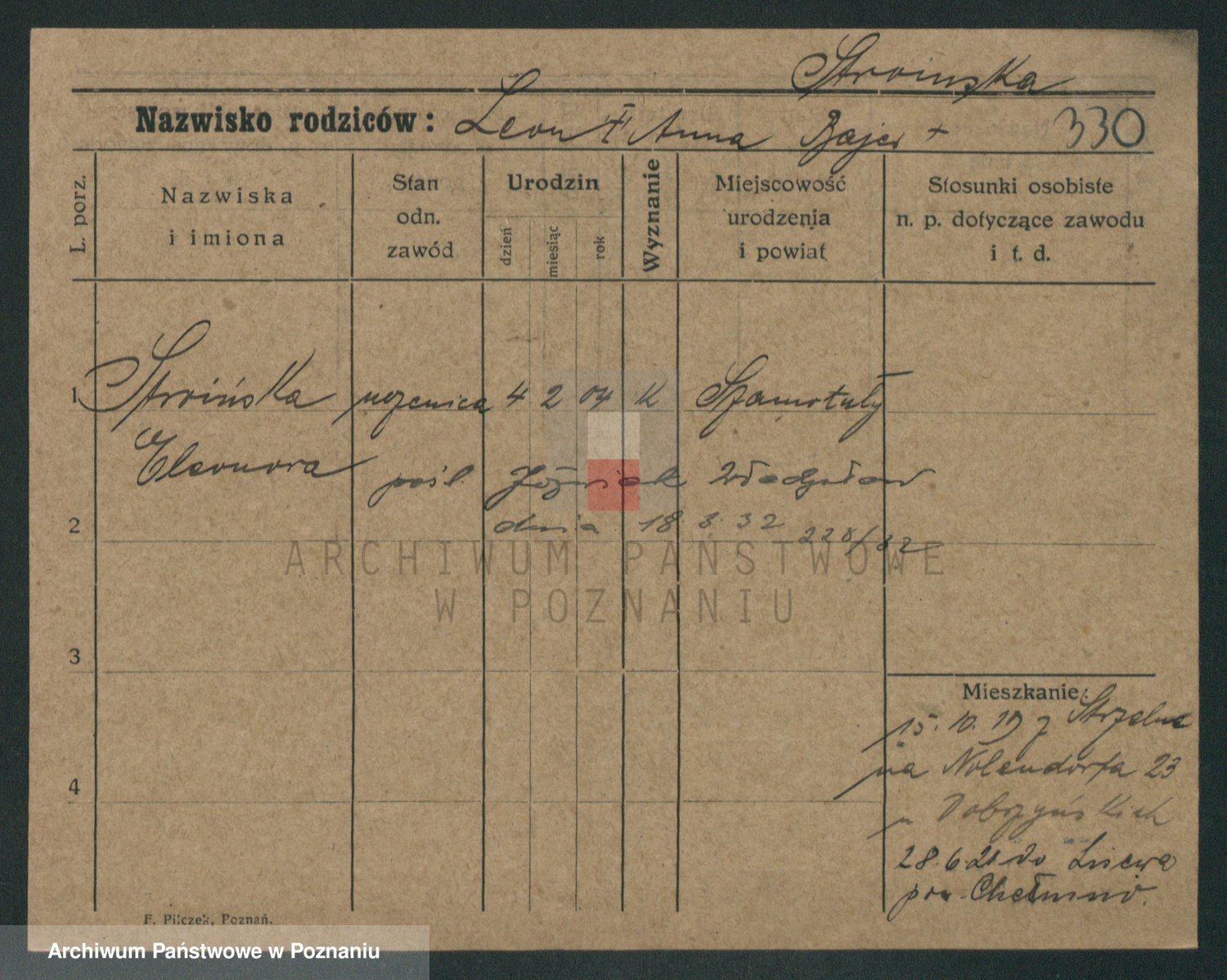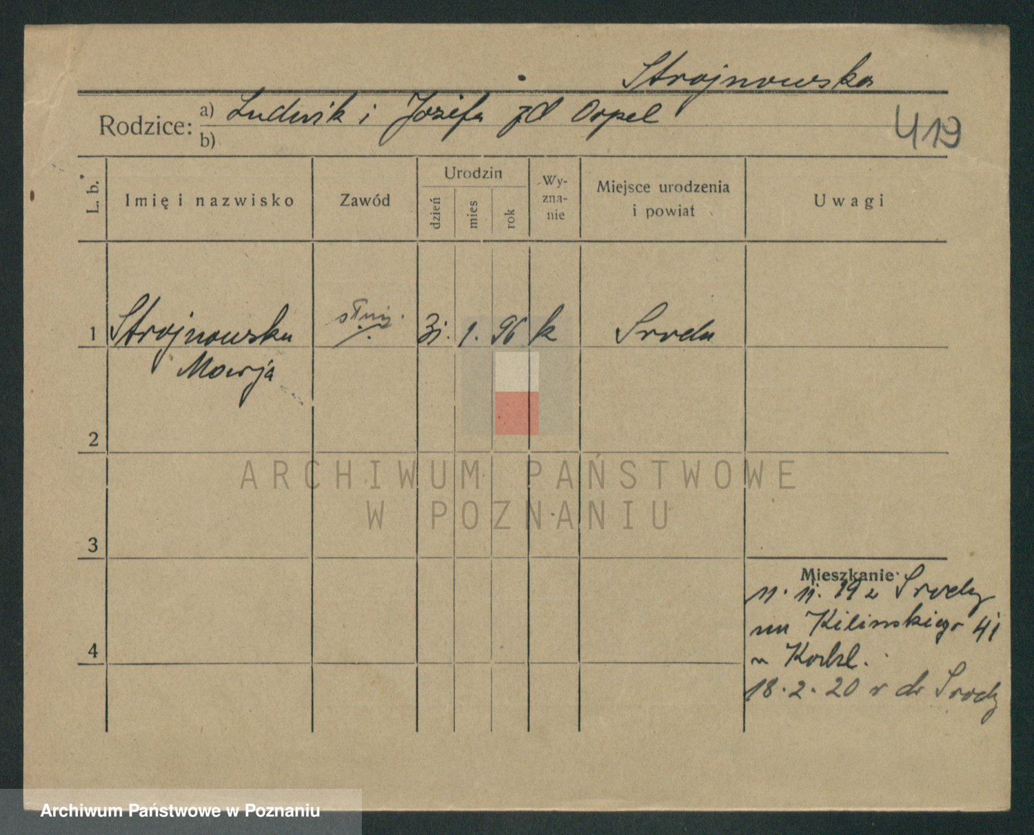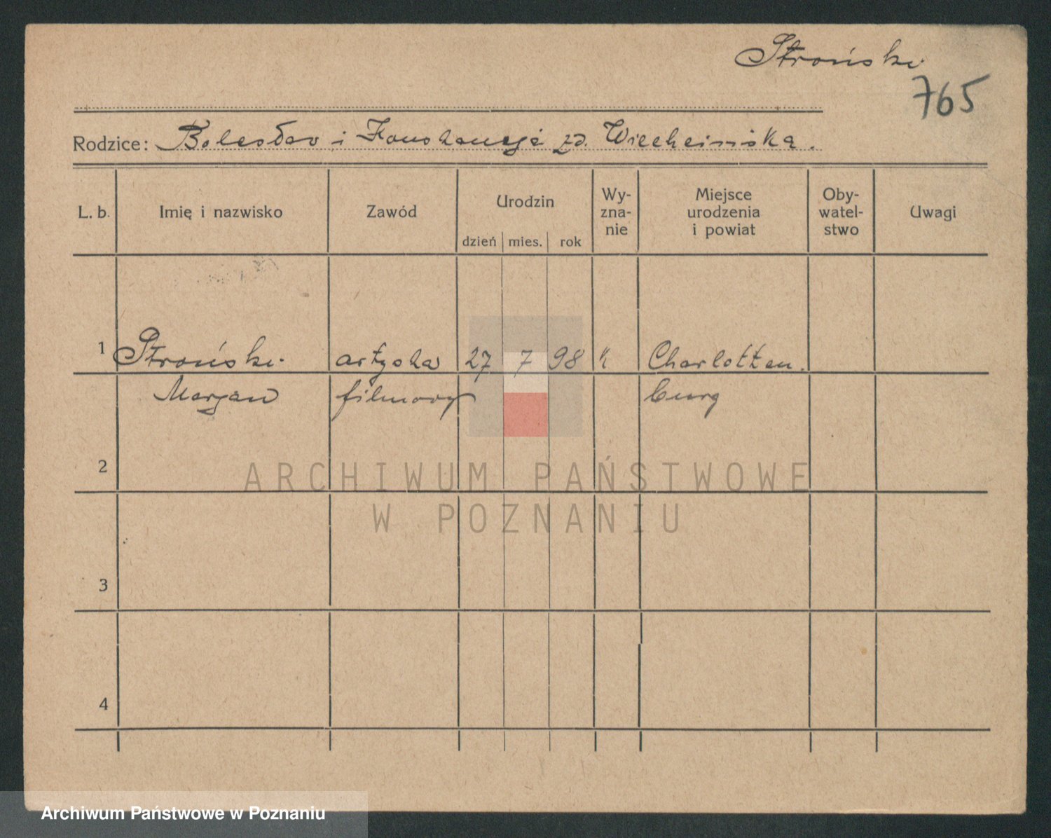 Podgląd karty osobowej dostępny jest po kliknięciu na nazwisko lub ikonkę karty. Można dokonywać powiększenia (ikony na górze) lub przechodzić między kolejnymi skanami (strzałki po bokach).