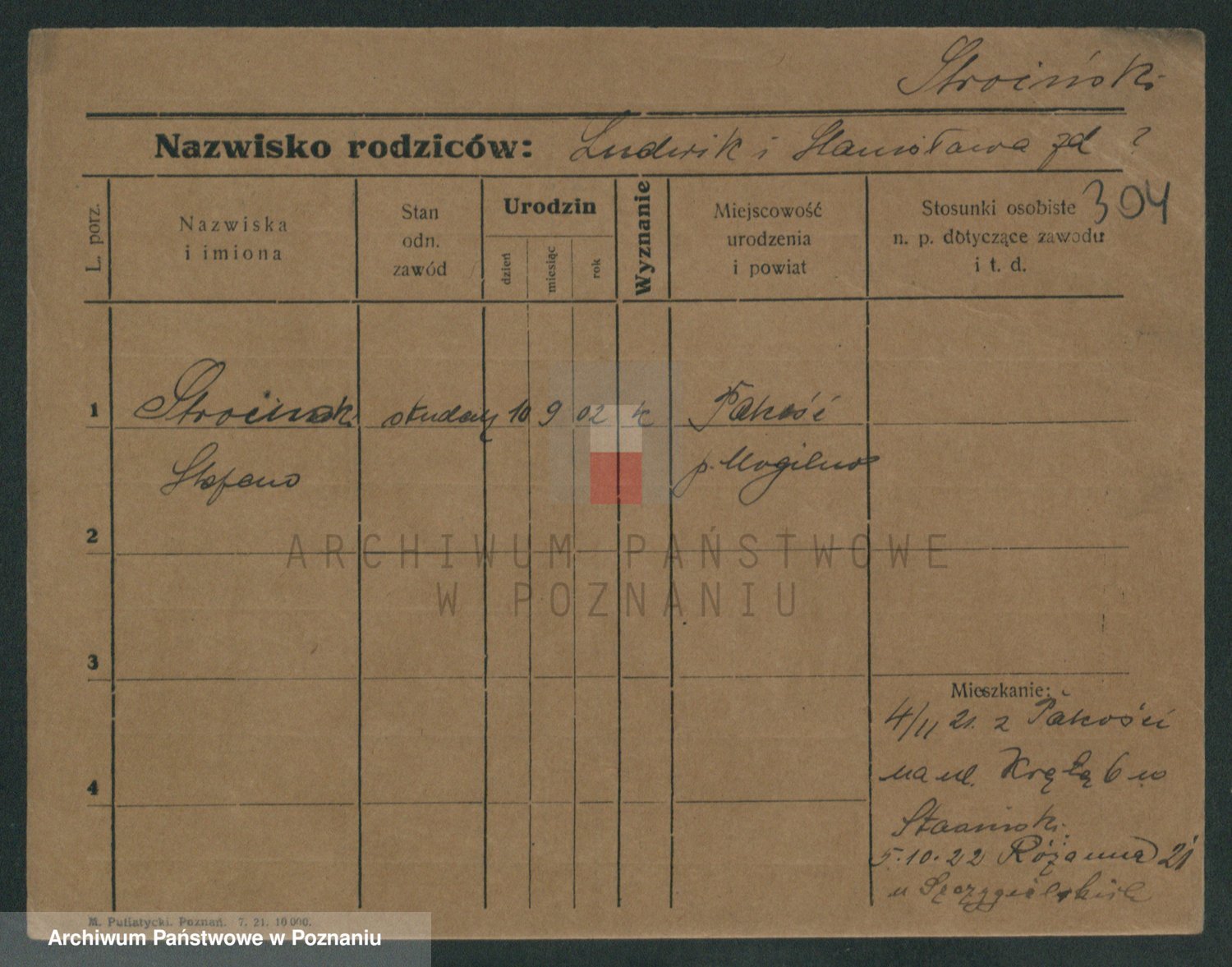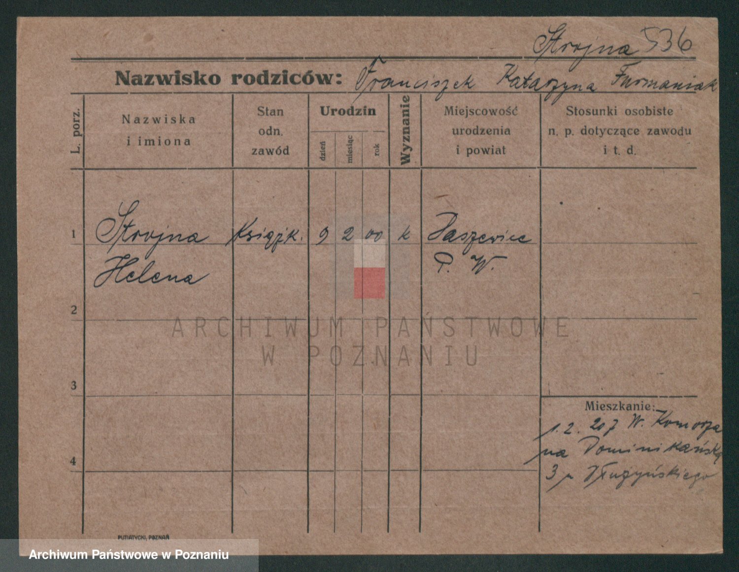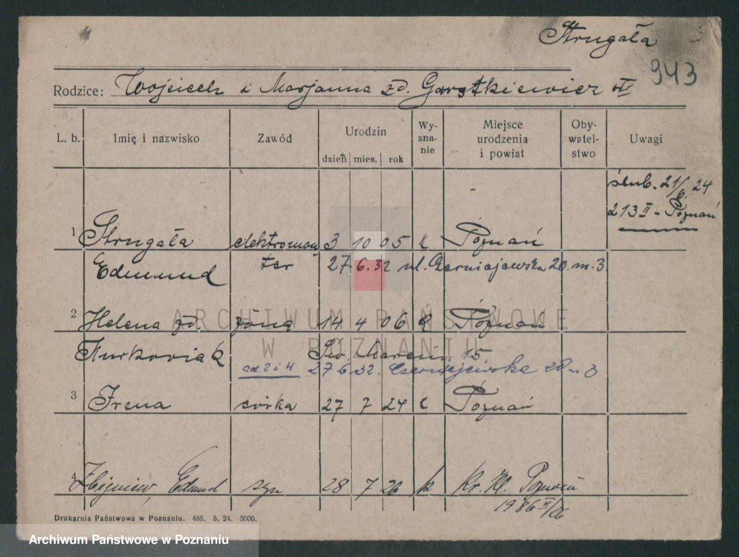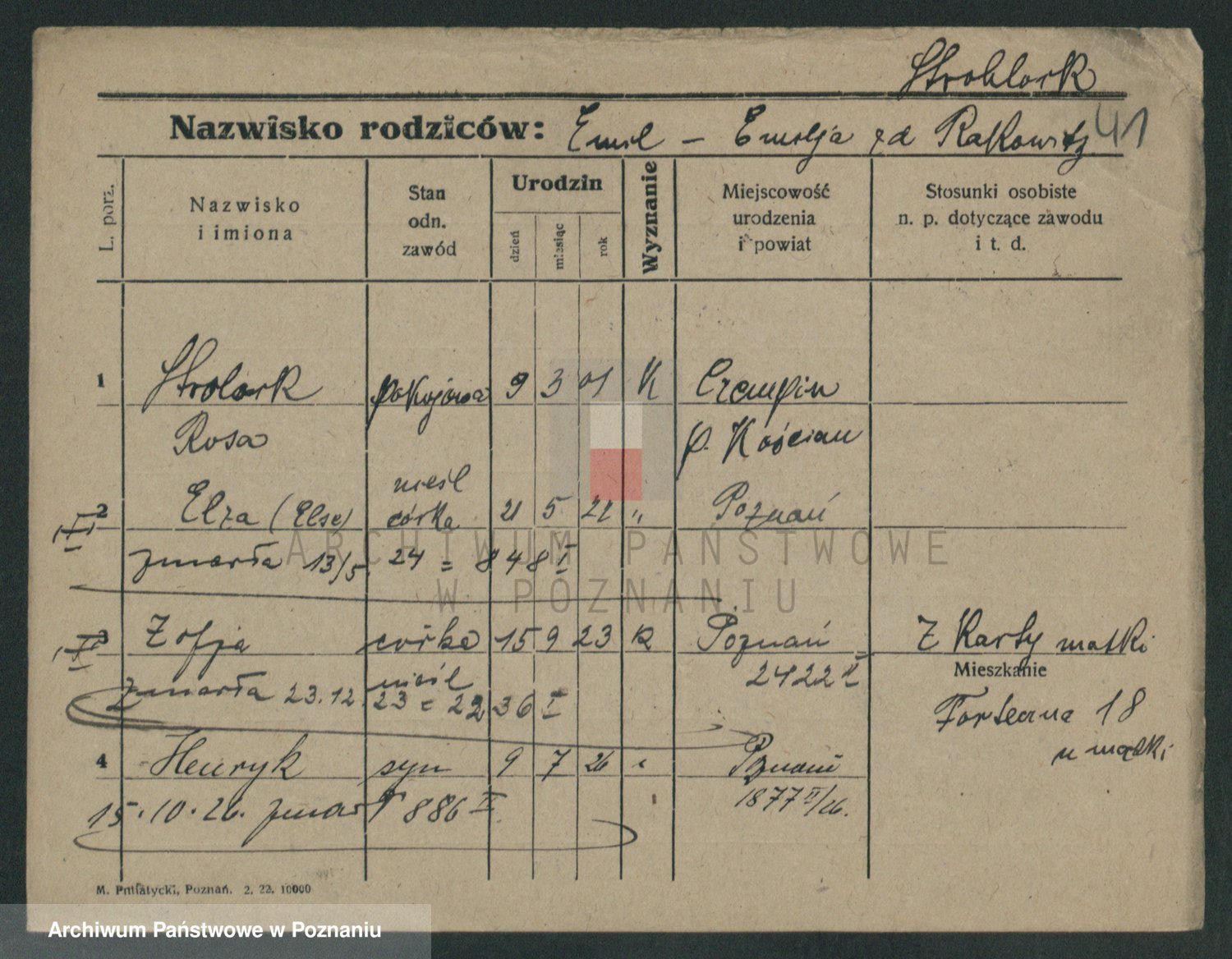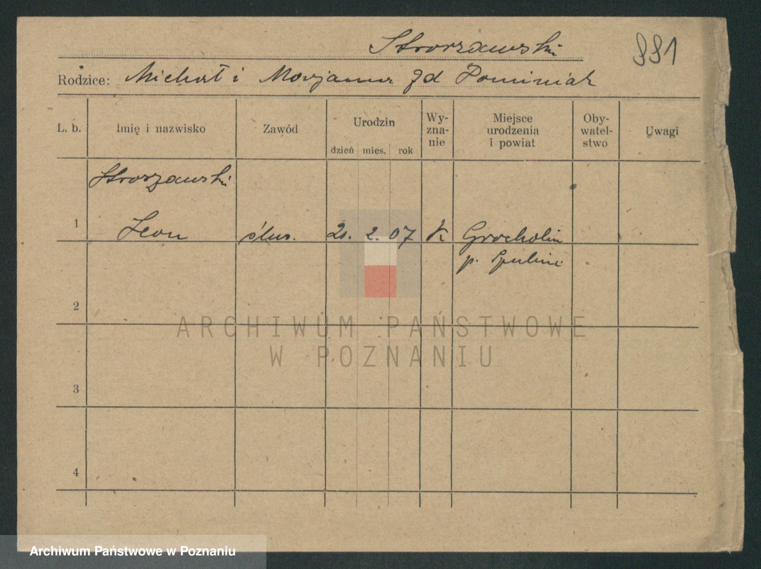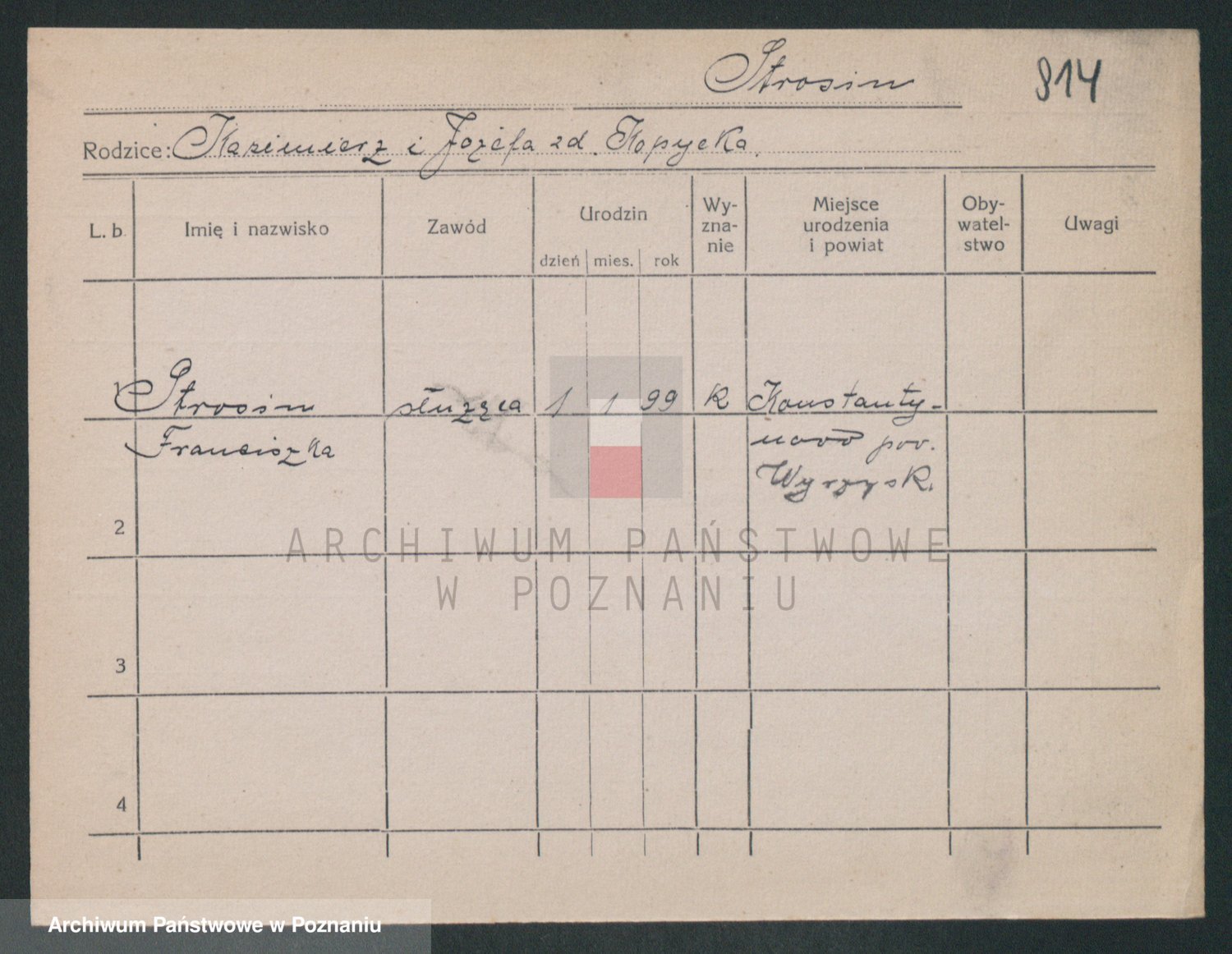 Podgląd karty osobowej dostępny jest po kliknięciu na nazwisko lub ikonkę karty. Można dokonywać powiększenia (ikony na górze) lub przechodzić między kolejnymi skanami (strzałki po bokach).