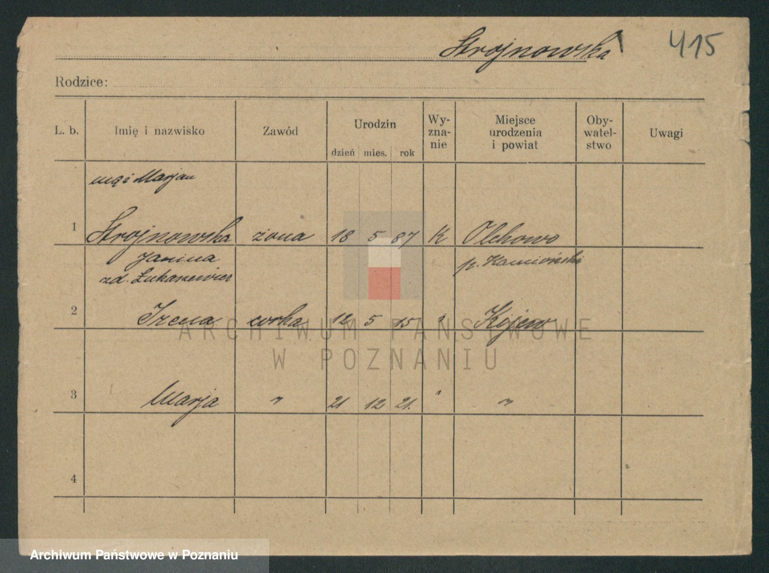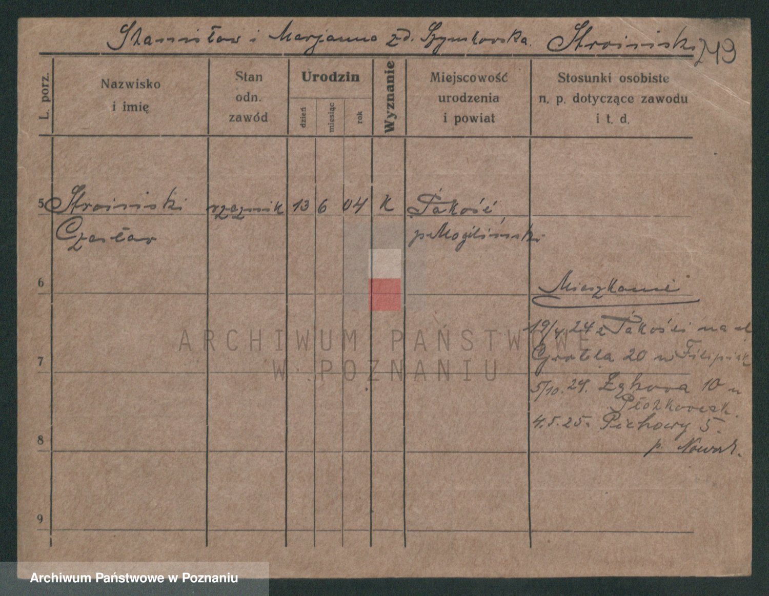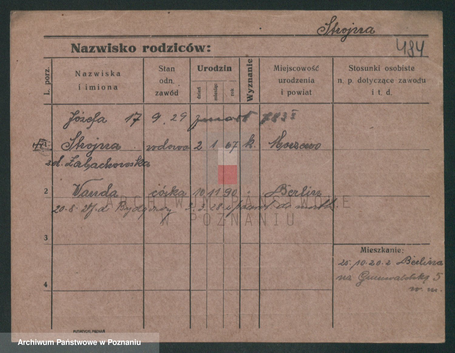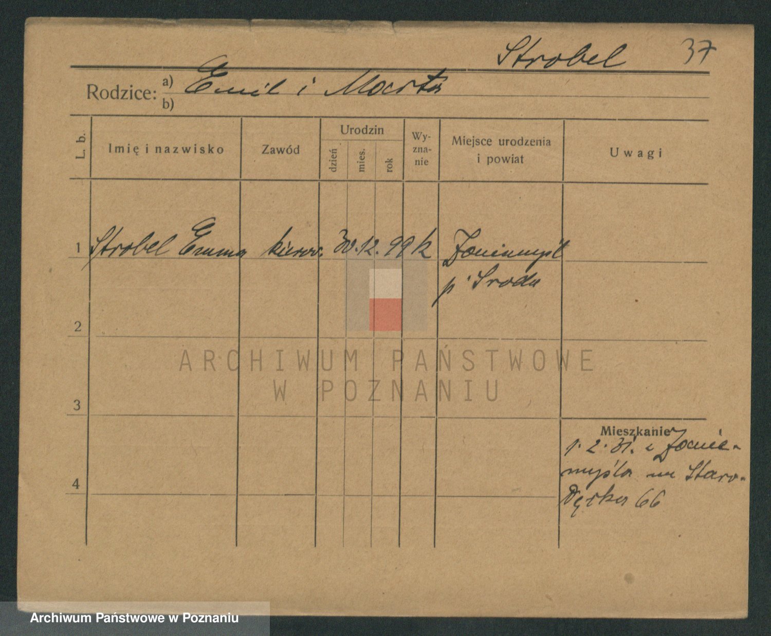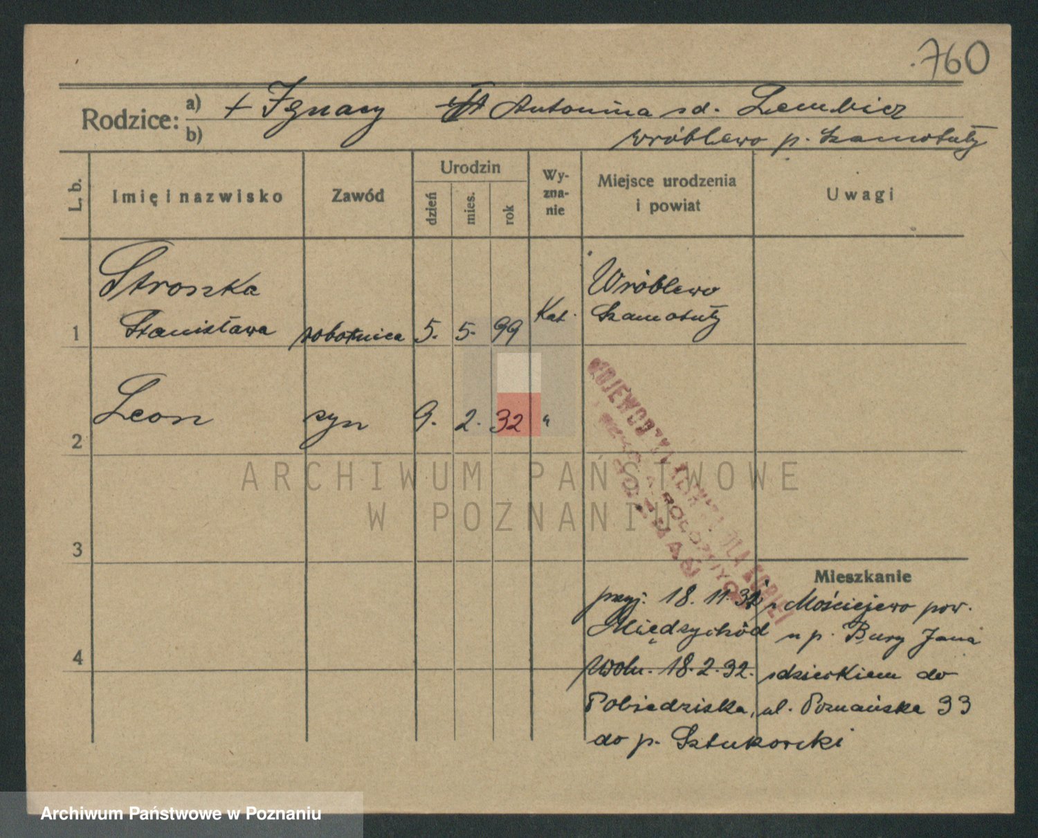 Podgląd karty osobowej dostępny jest po kliknięciu na nazwisko lub ikonkę karty. Można dokonywać powiększenia (ikony na górze) lub przechodzić między kolejnymi skanami (strzałki po bokach).