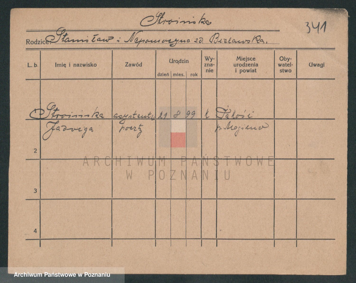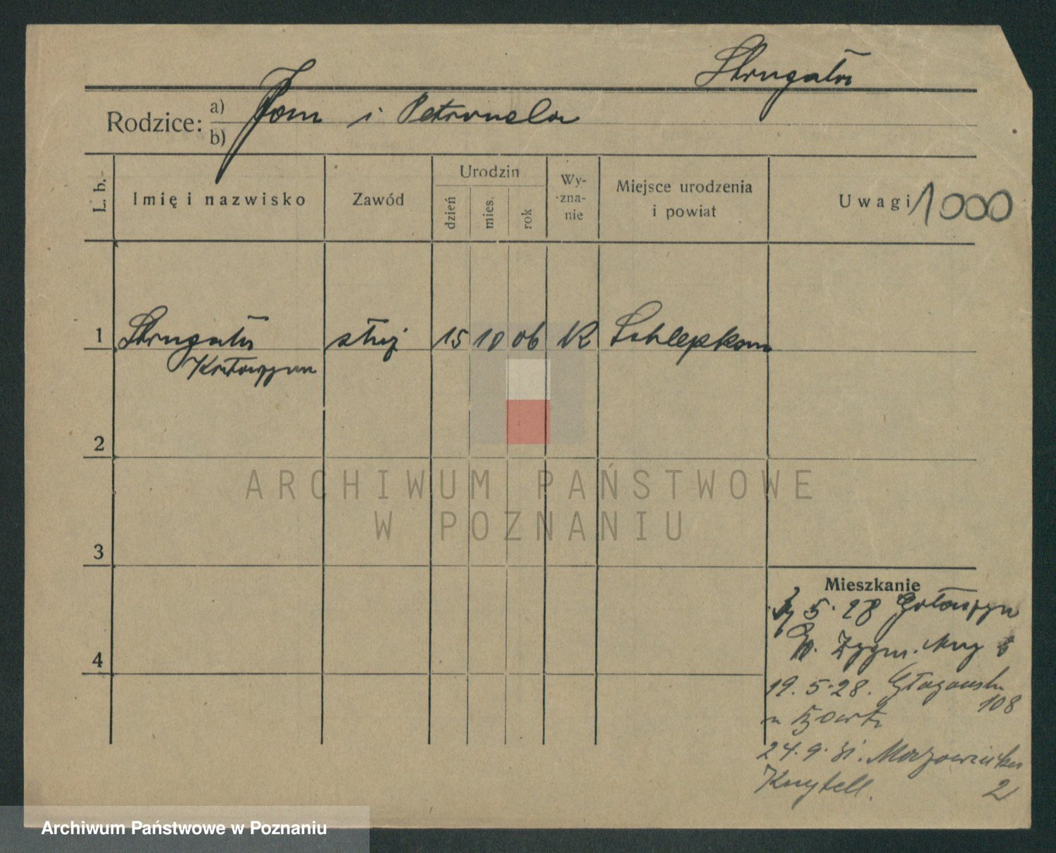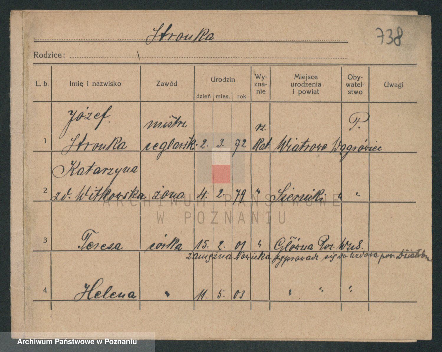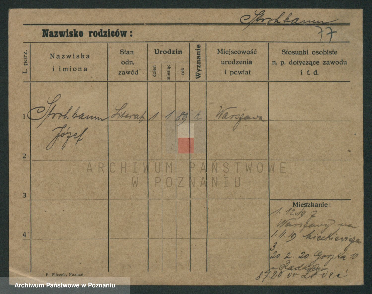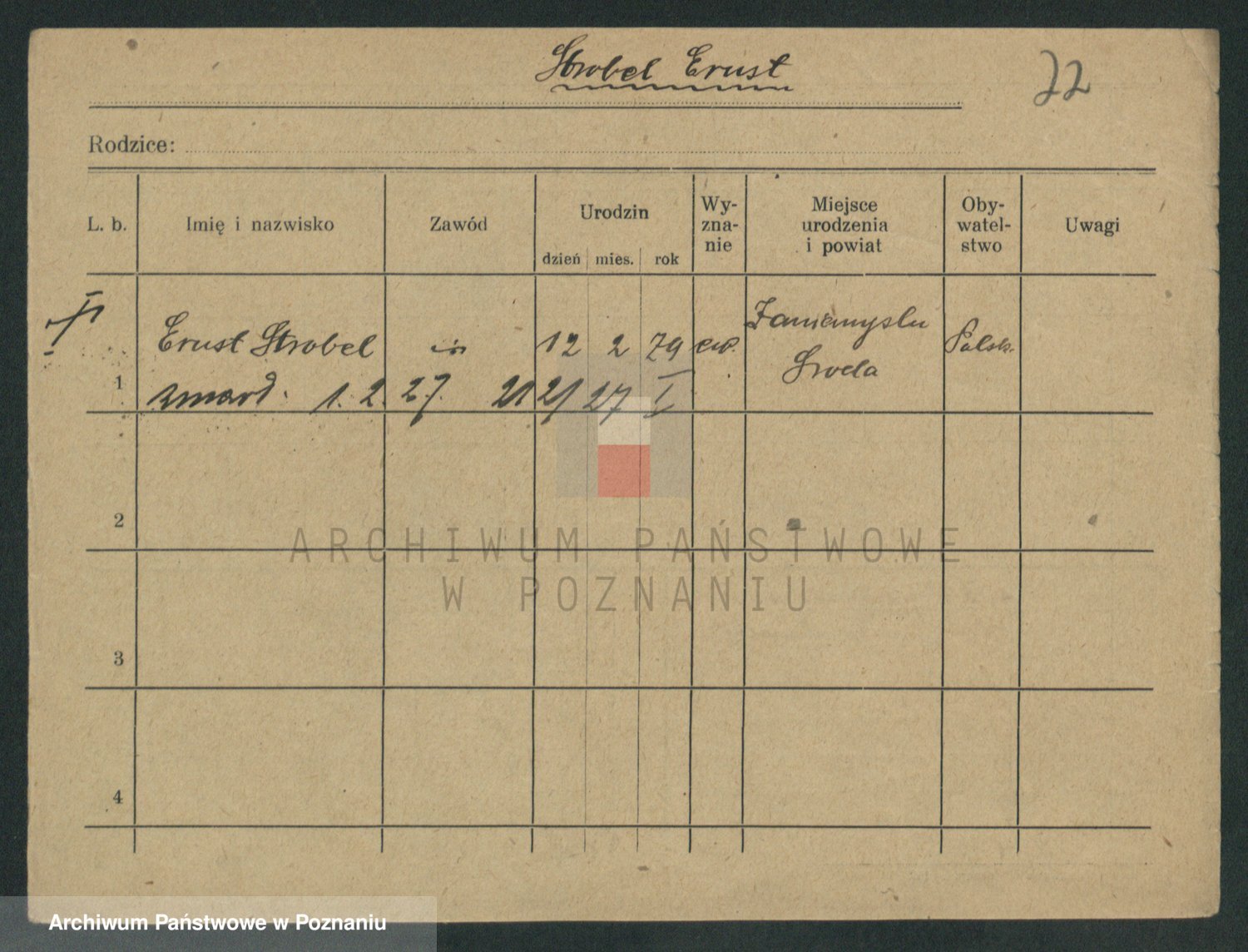 Podgląd karty osobowej dostępny jest po kliknięciu na nazwisko lub ikonkę karty. Można dokonywać powiększenia (ikony na górze) lub przechodzić między kolejnymi skanami (strzałki po bokach).