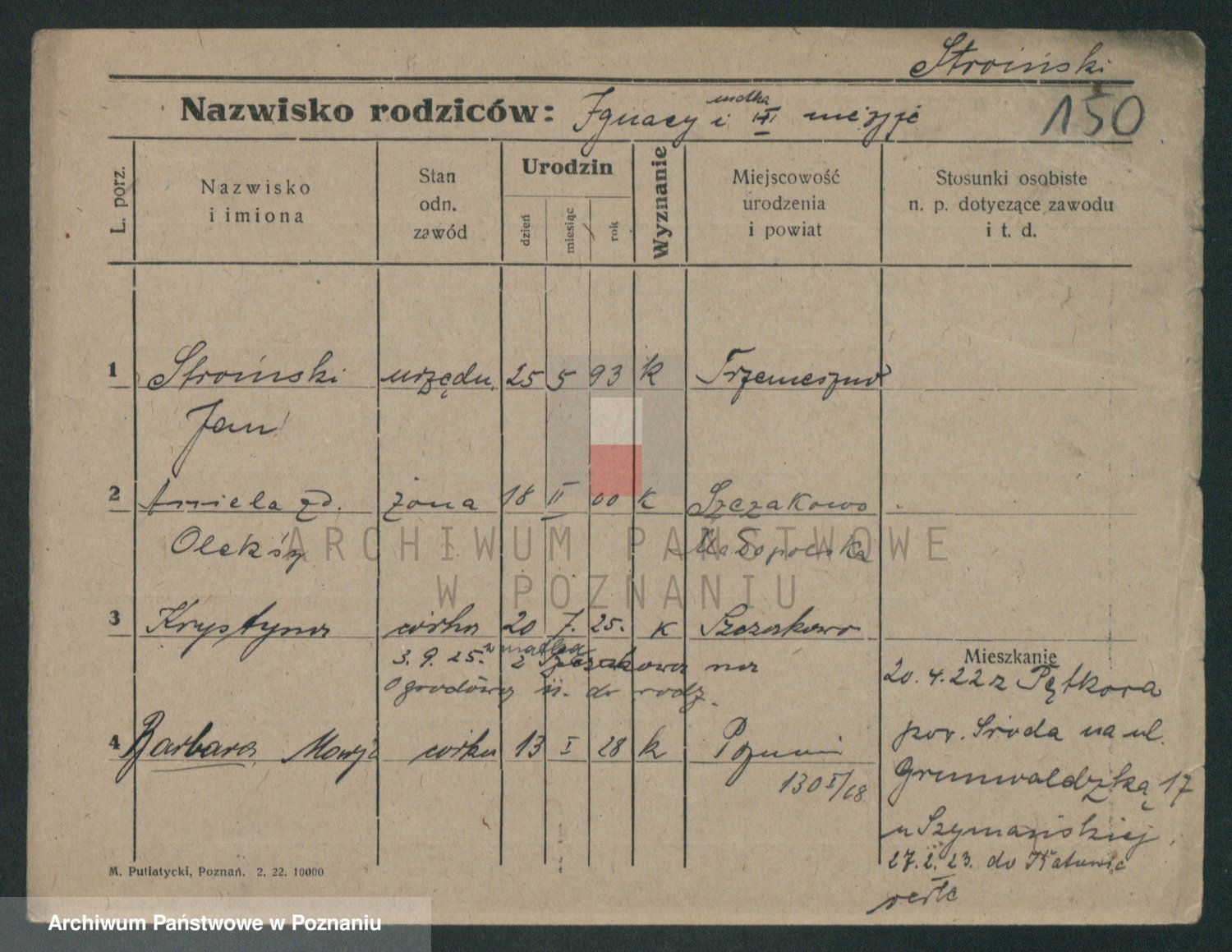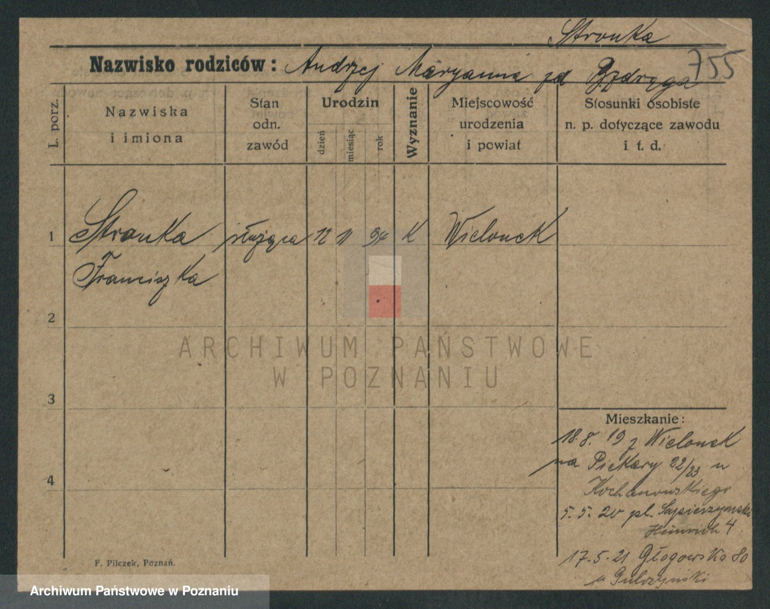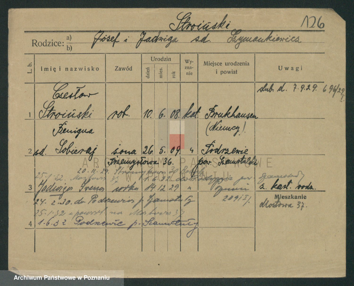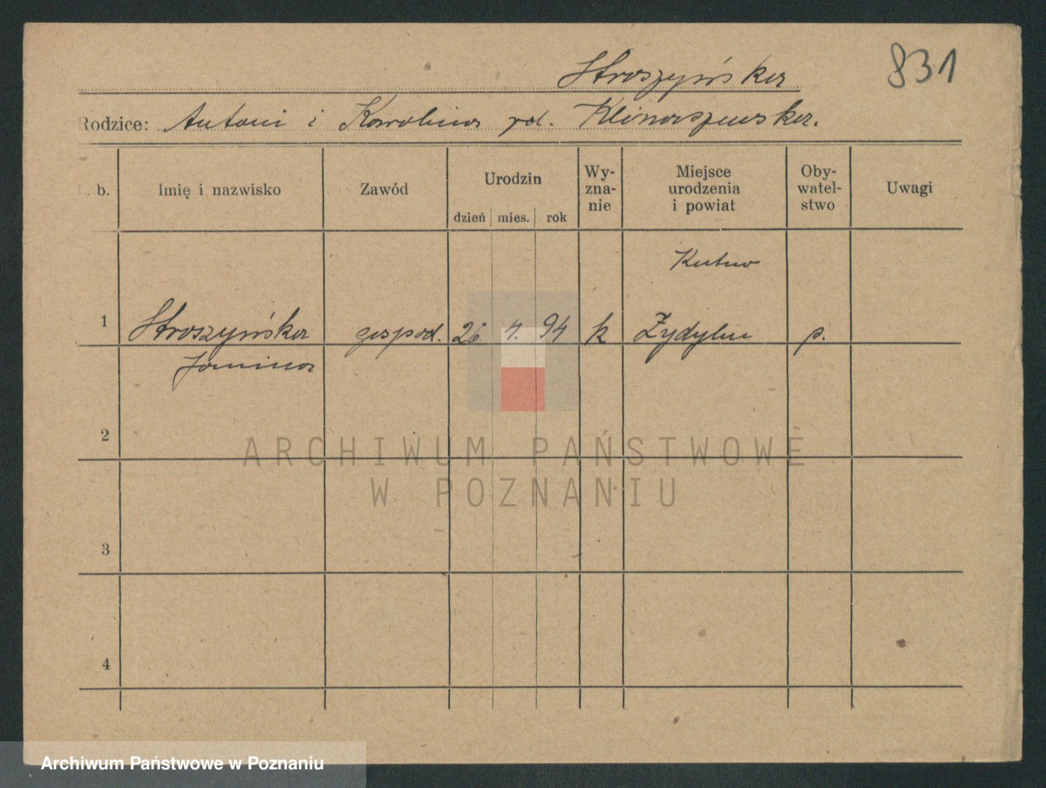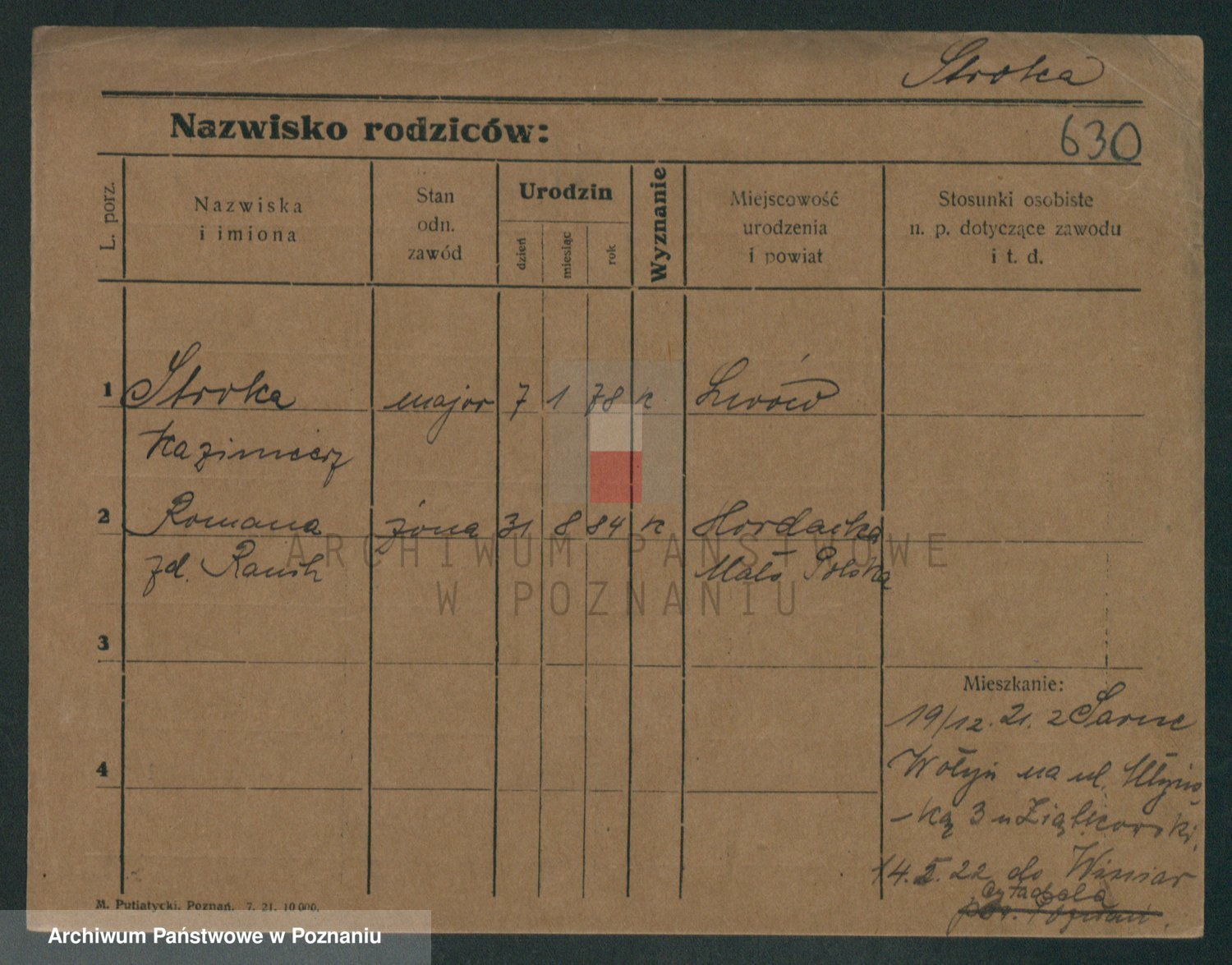 Podgląd karty osobowej dostępny jest po kliknięciu na nazwisko lub ikonkę karty. Można dokonywać powiększenia (ikony na górze) lub przechodzić między kolejnymi skanami (strzałki po bokach).