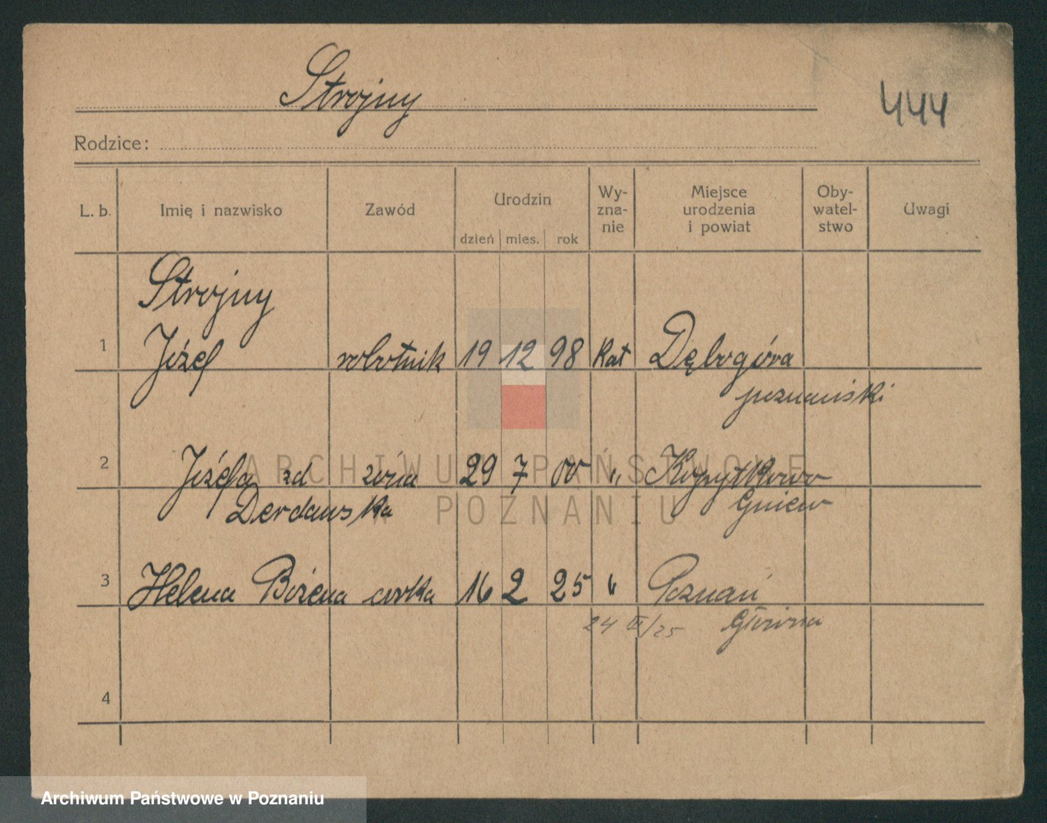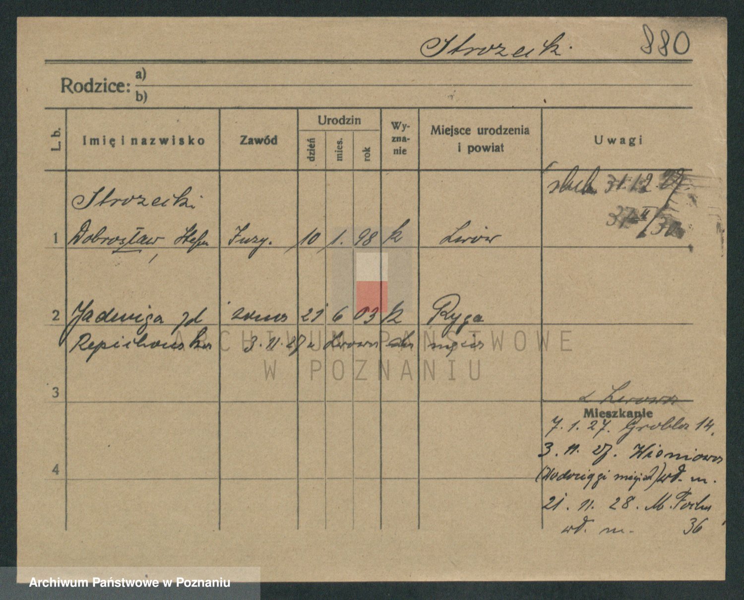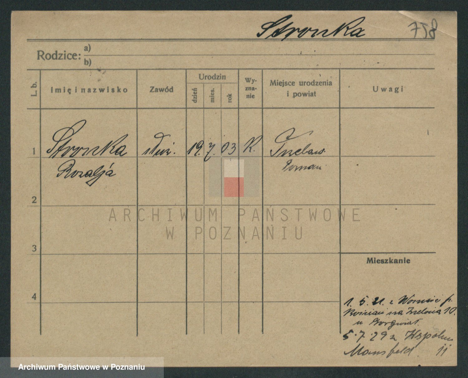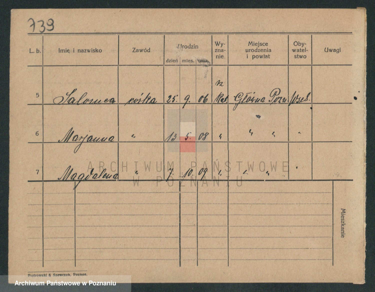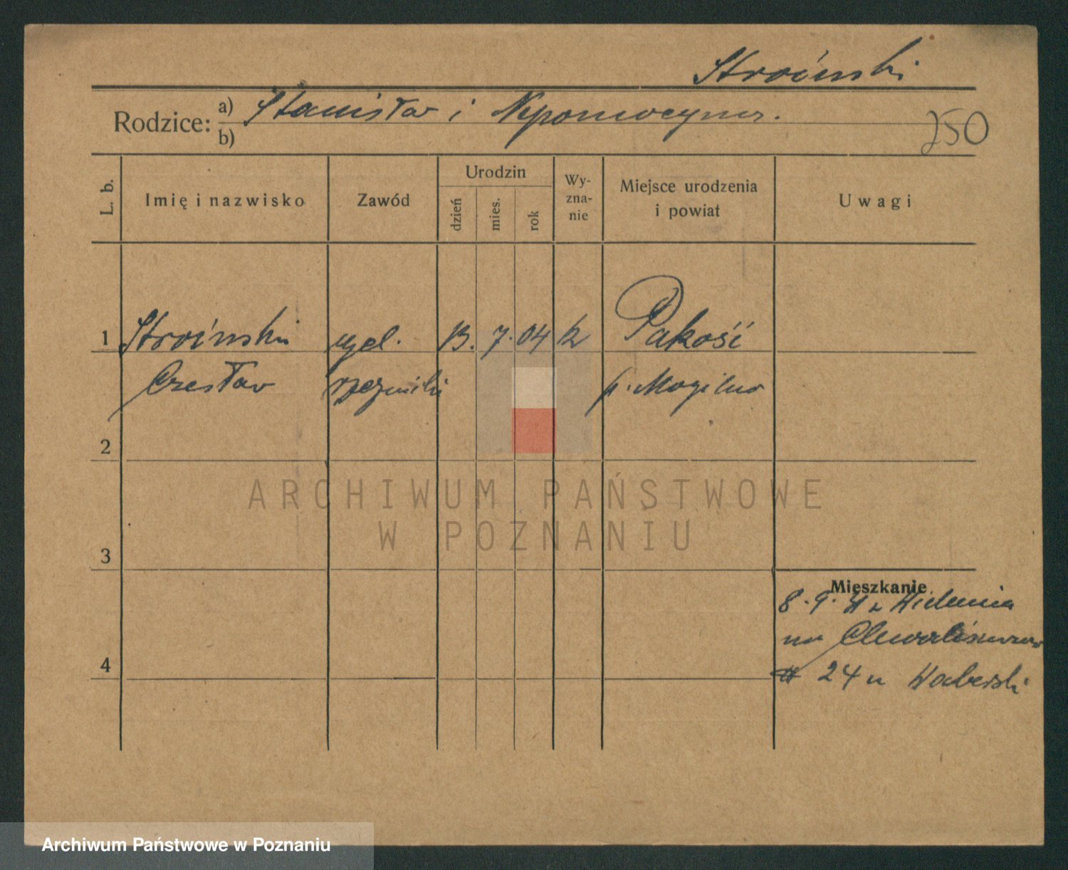 Podgląd karty osobowej dostępny jest po kliknięciu na nazwisko lub ikonkę karty. Można dokonywać powiększenia (ikony na górze) lub przechodzić między kolejnymi skanami (strzałki po bokach).