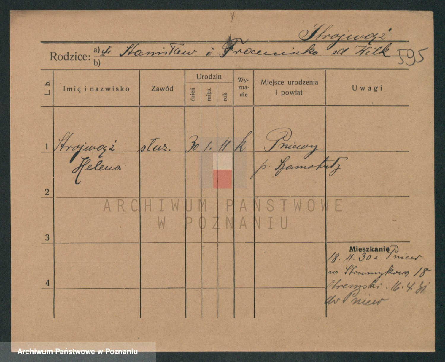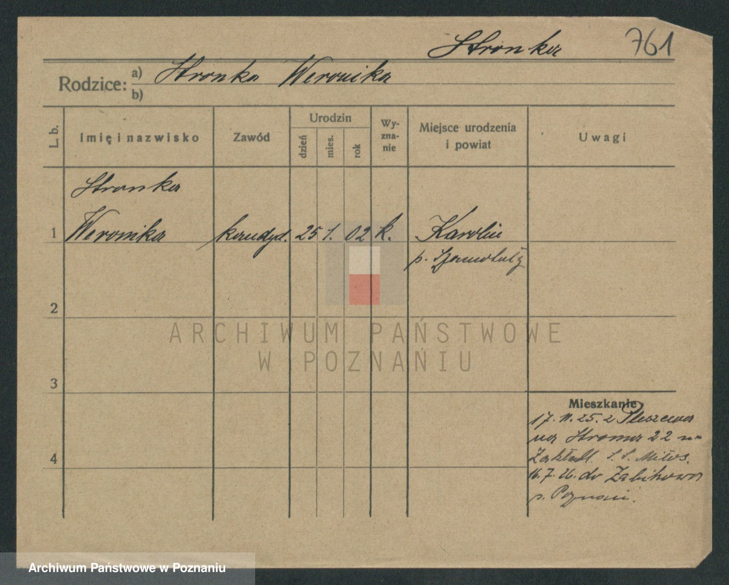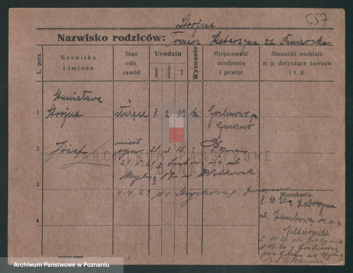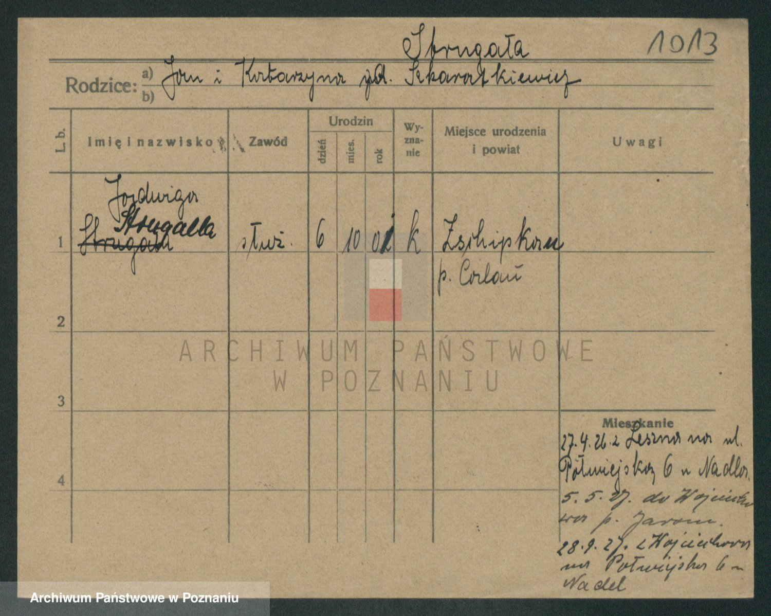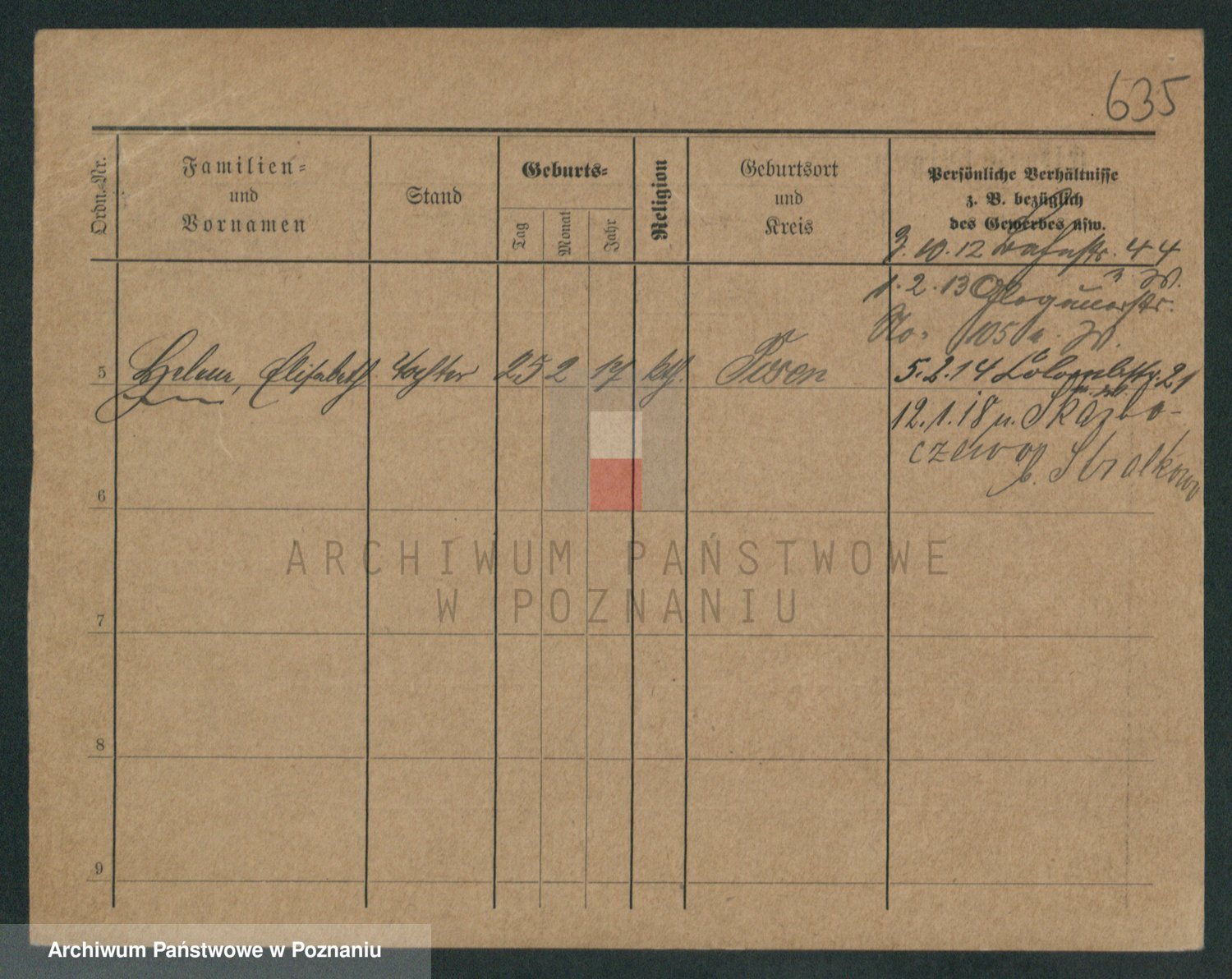 Podgląd karty osobowej dostępny jest po kliknięciu na nazwisko lub ikonkę karty. Można dokonywać powiększenia (ikony na górze) lub przechodzić między kolejnymi skanami (strzałki po bokach).