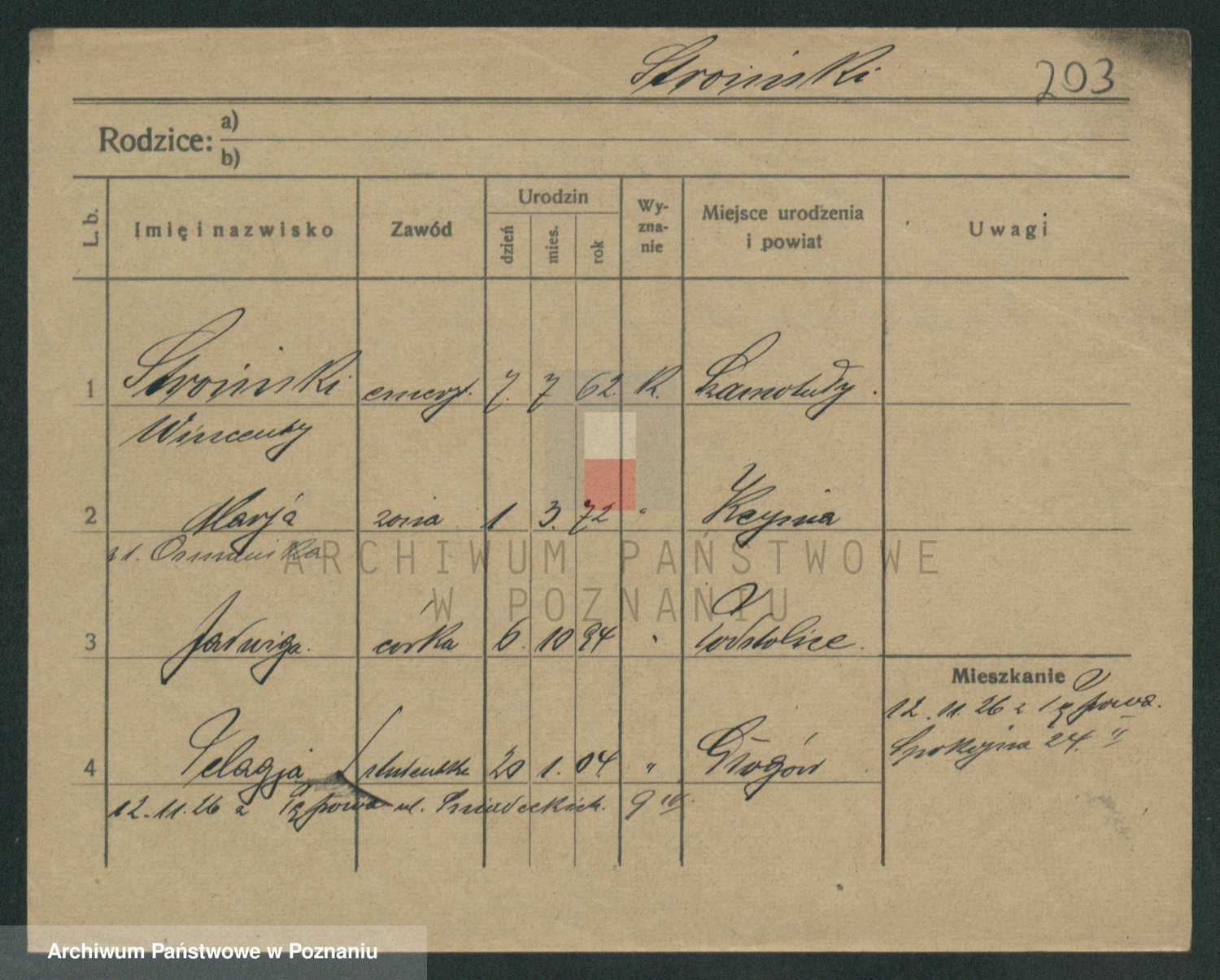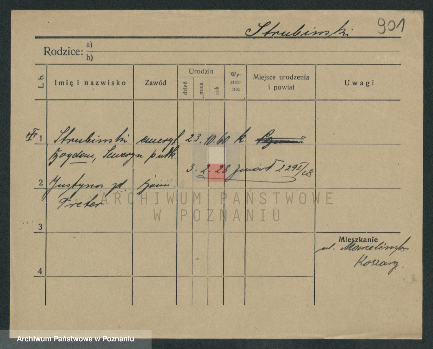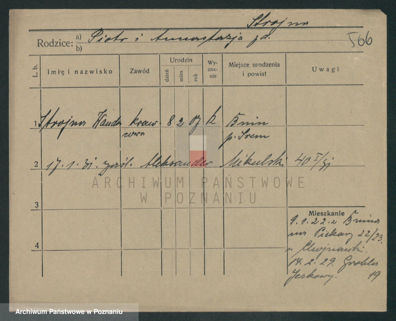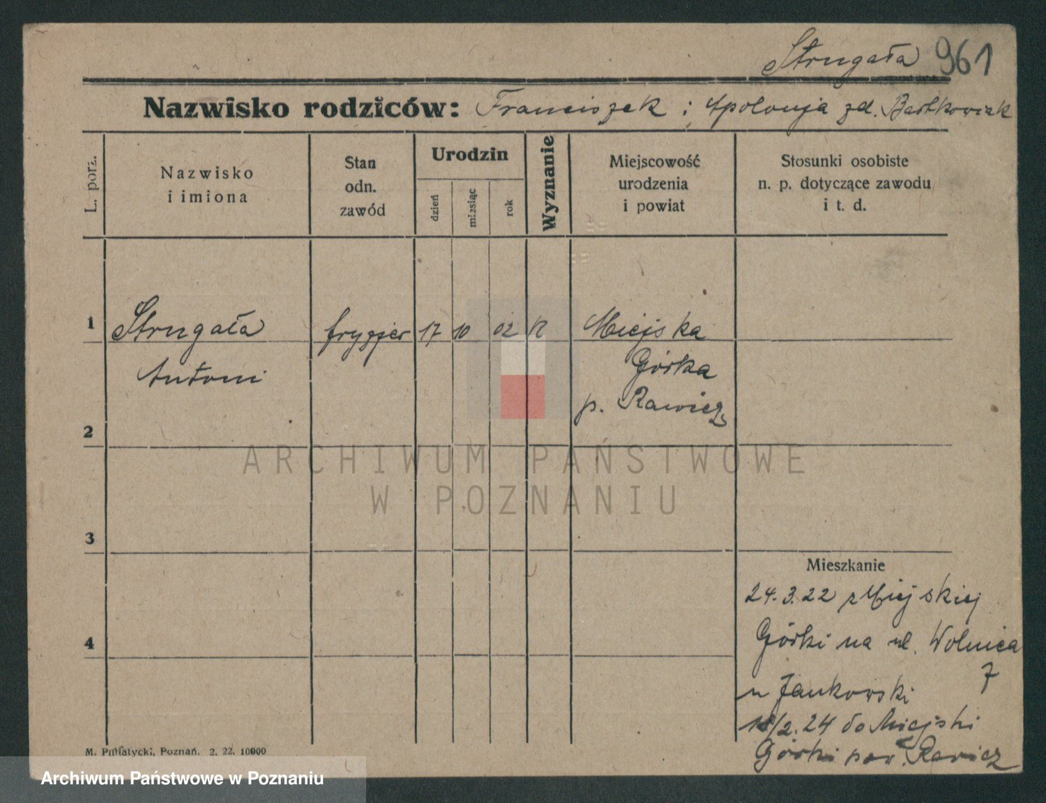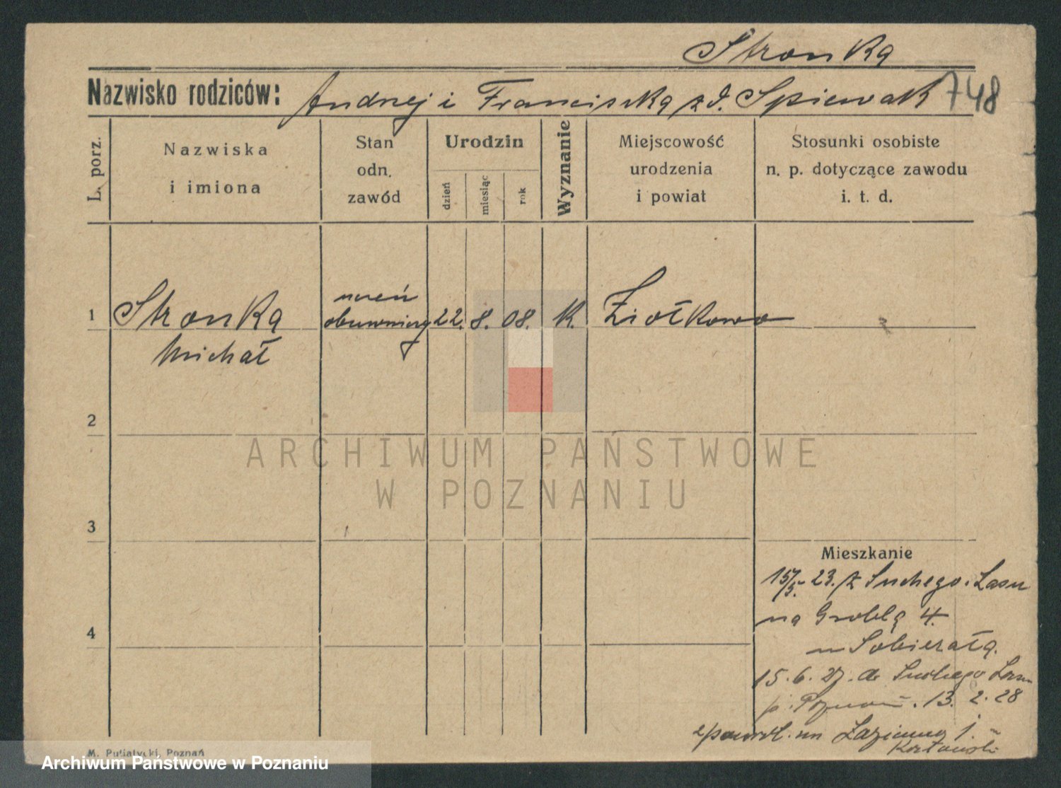 Podgląd karty osobowej dostępny jest po kliknięciu na nazwisko lub ikonkę karty. Można dokonywać powiększenia (ikony na górze) lub przechodzić między kolejnymi skanami (strzałki po bokach).