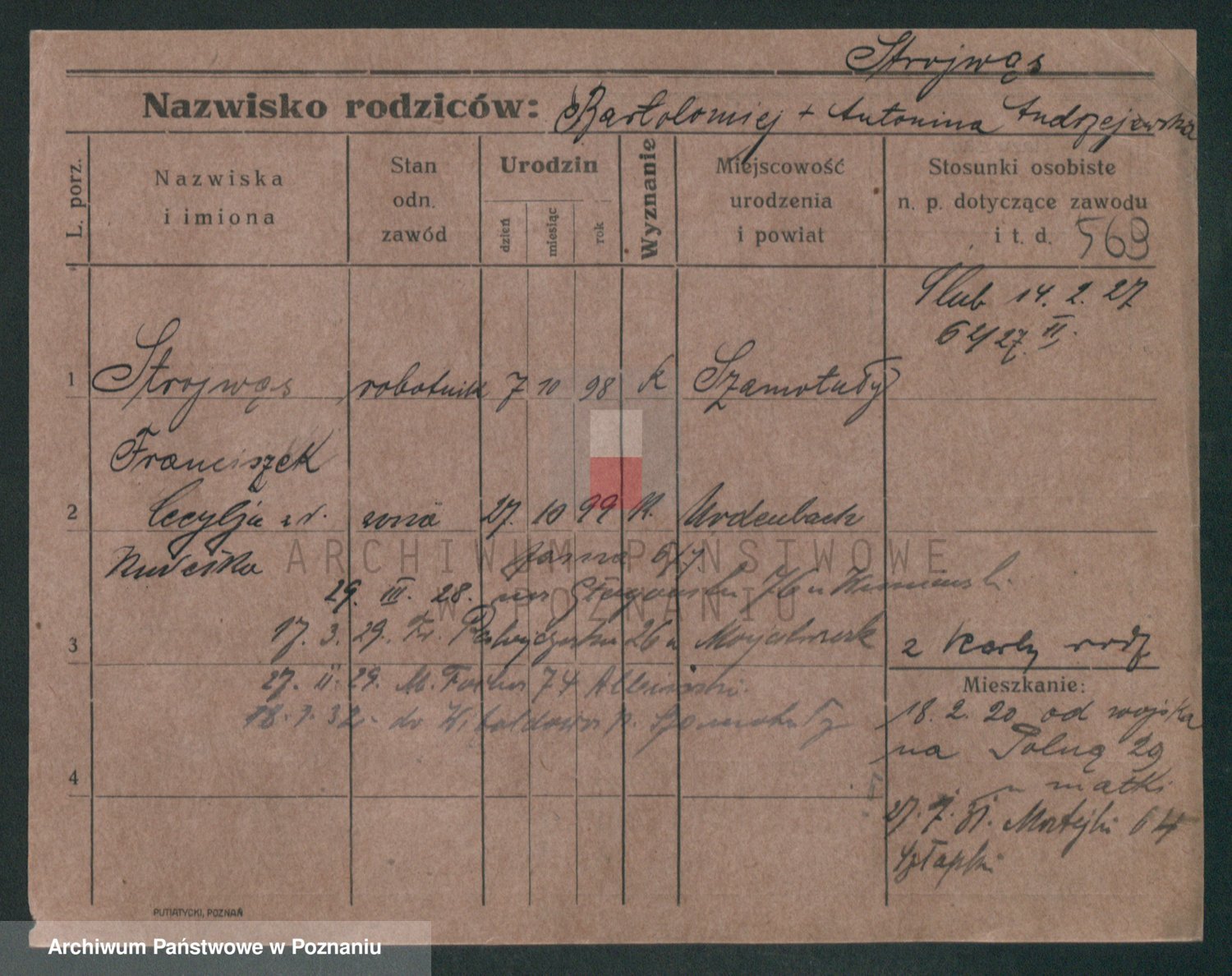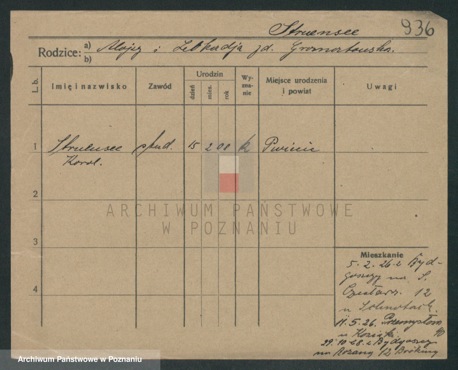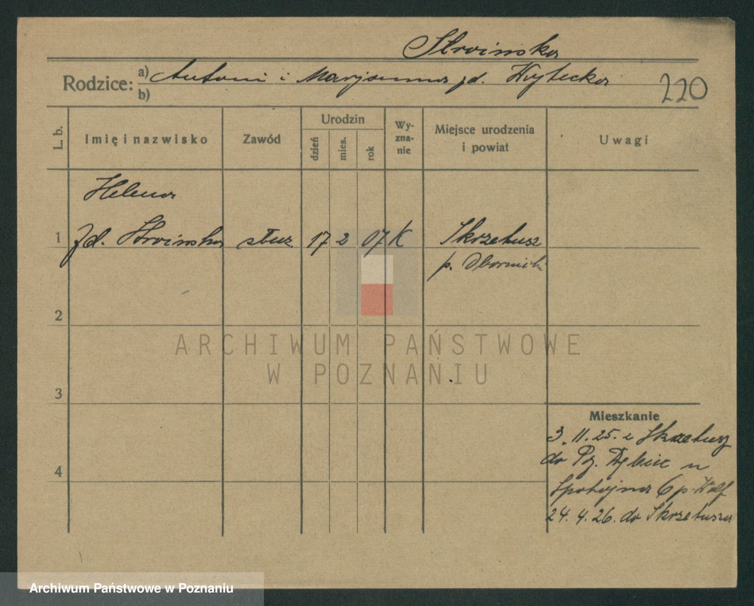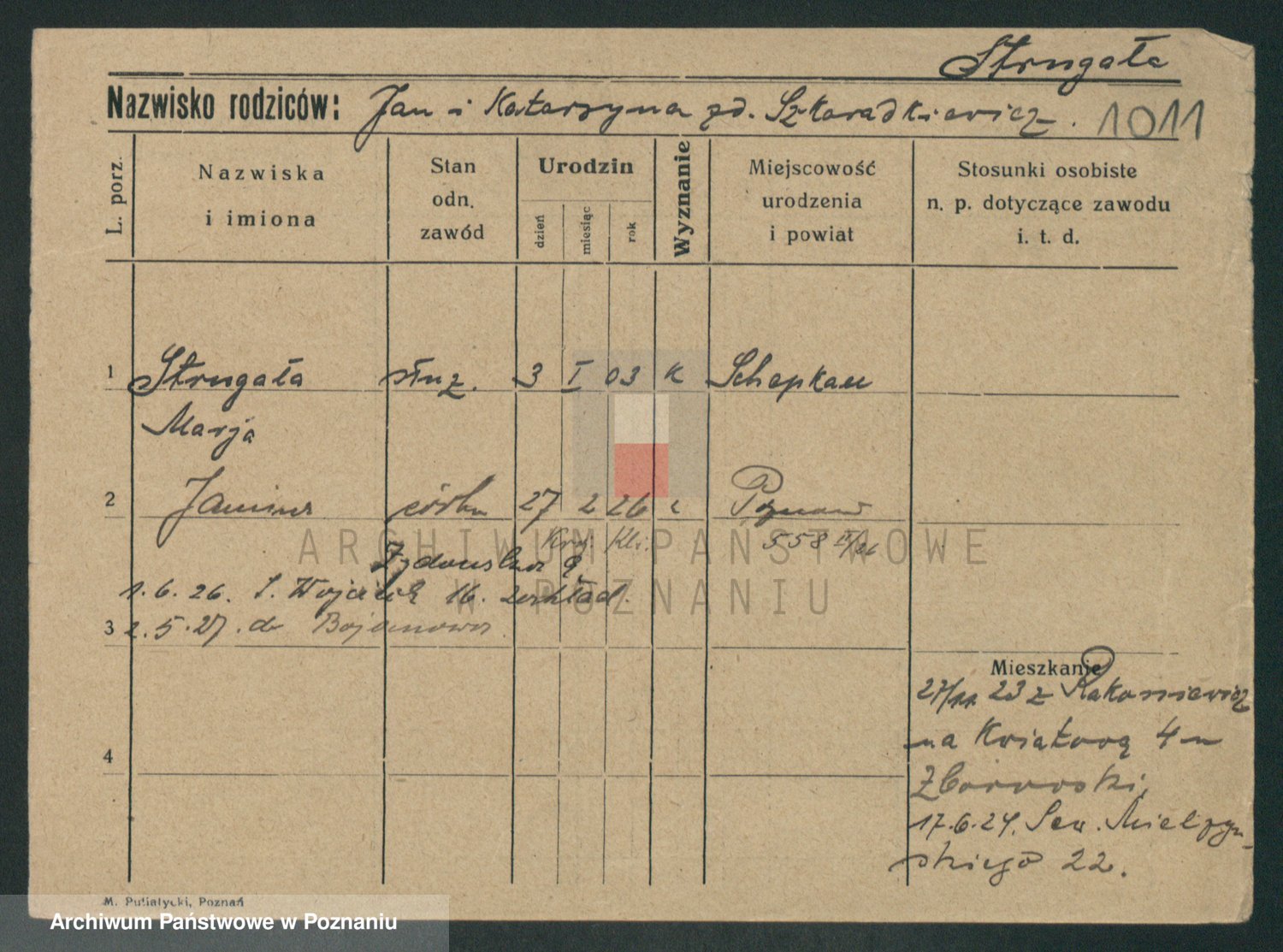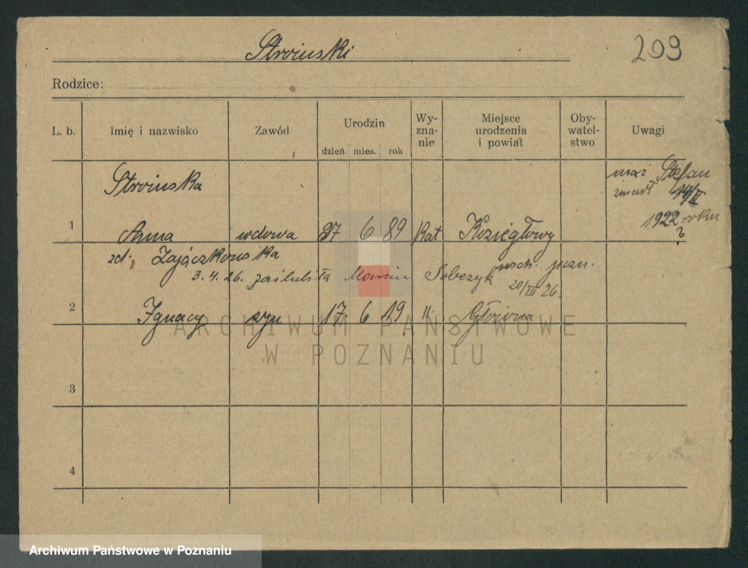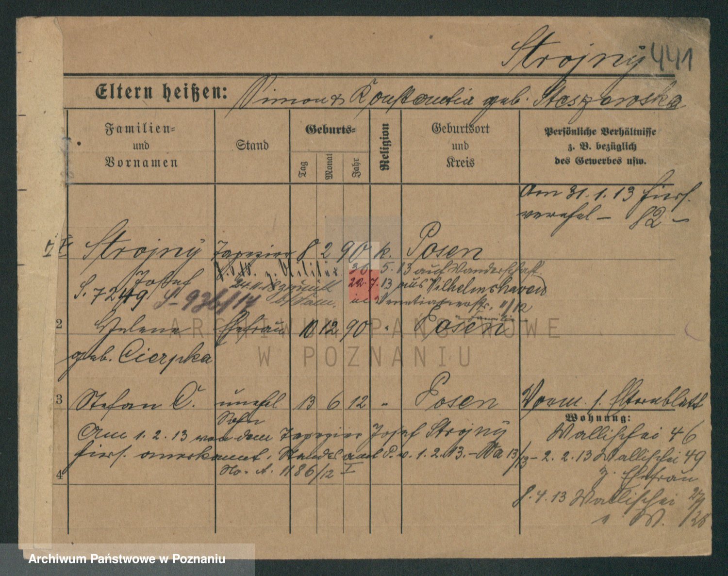 Podgląd karty osobowej dostępny jest po kliknięciu na nazwisko lub ikonkę karty. Można dokonywać powiększenia (ikony na górze) lub przechodzić między kolejnymi skanami (strzałki po bokach).